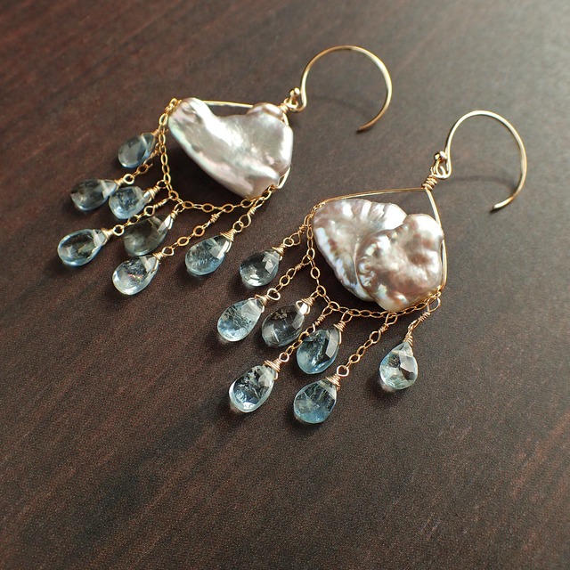 # 雲と雨のピアス(アクアマリン&ホワイトサファイア) このピアスは、しずく型のアクアマリンとブリオレットカットのホワイトサファイア、そしてツインパールを使用した、幻想的なデザインが特長です。 しずく型のアクアマリンは、その艶やかで透明感のある美しい水色が、まるで雲間から差し込む雨の光のように、耳元で揺れ動きます。 ホワイトサファイアはアクアマリンとはまた違った煌めきを放ち、その煌めきは朝露のようにも見えます。 また、ツインパールはその柔らかな光沢が優雅さを演出し、特別なシーンから日常使いまで、幅広くお楽しみいただけます。 大人の遊び心が感じられる楽しいデザインと、美しい素材の組み合わせのピアスは、様々なスタイルに合せていただきたいオススメのアイテムです。 Rain drops necklaceとのセット着けも素敵です! (Rain drops necklaceはただいま完売となっておりますが、11月初旬に再販の予定でございます) ■ サイズ ピアスパーツも含めた全長:約4.7㎝ ■ 素材 アクアマリン・淡水パール(ツイン、横幅約1.4㎝)・ホワイトサファイア・K14GF ■全て手作りの1点ものです。写真に写っているそのものを販売しております。 画像には写っておりませんが、K14GF製のキャッチをお付けいたします。 ご不明な点がございましたらお気軽にお問い合わせ下さい。できる限り早い対応をさせていただきますので、よろしくお願いします。 ■ お手入れ/取り扱い注意事項 お手入れは柔らかい布でやさしく拭いてください。水や汗が付着した場合は、すぐに拭き取ることをおすすめします。また、高温多湿の場所を避けて保管してください。 ■ 発送・注文に関する情報や注意事項 ご注文後、通常3~5営業日以内に発送いたします。正式な受注後のキャンセルや返品はお受けできませんので、ご了承ください。 ■ その他の情報や注意事項 購入前に十分にご検討ください。サイズやデザインの確認をお願いいたします。商品に合わない場合の返品は承れませんので、ご注意ください。 ショップのお問い合わせからお気軽にご質問ください。あなたのお越しを心よりお待ちしております。
