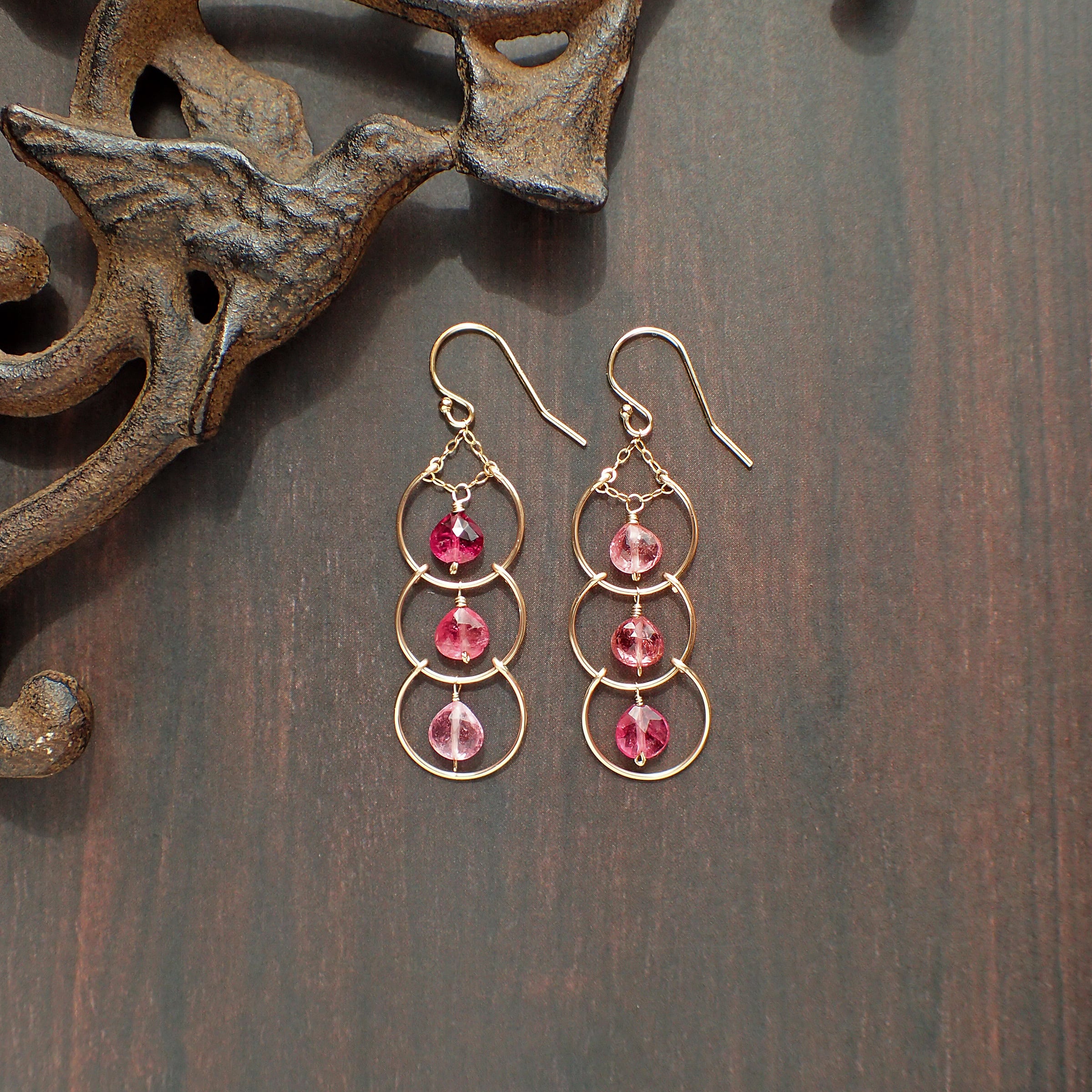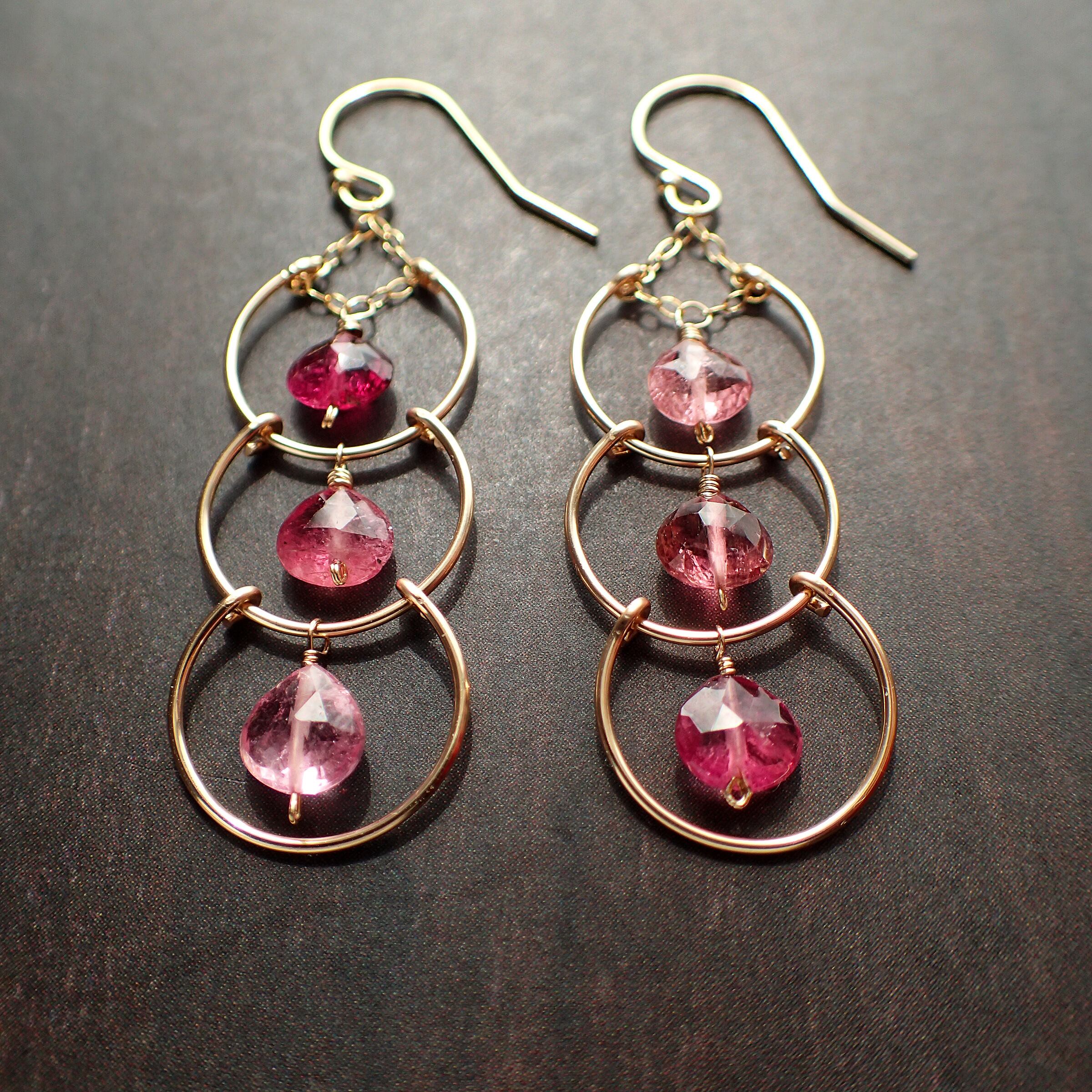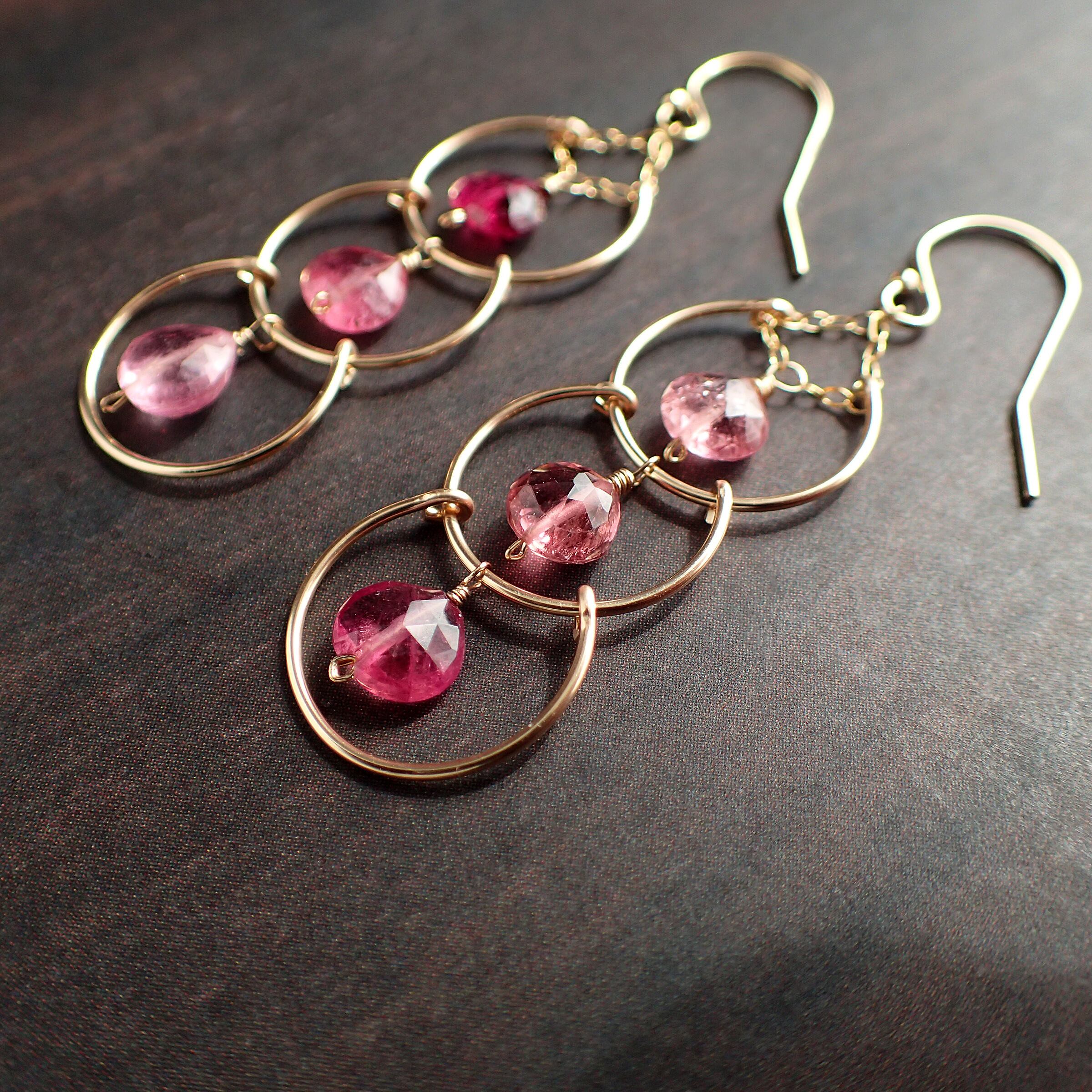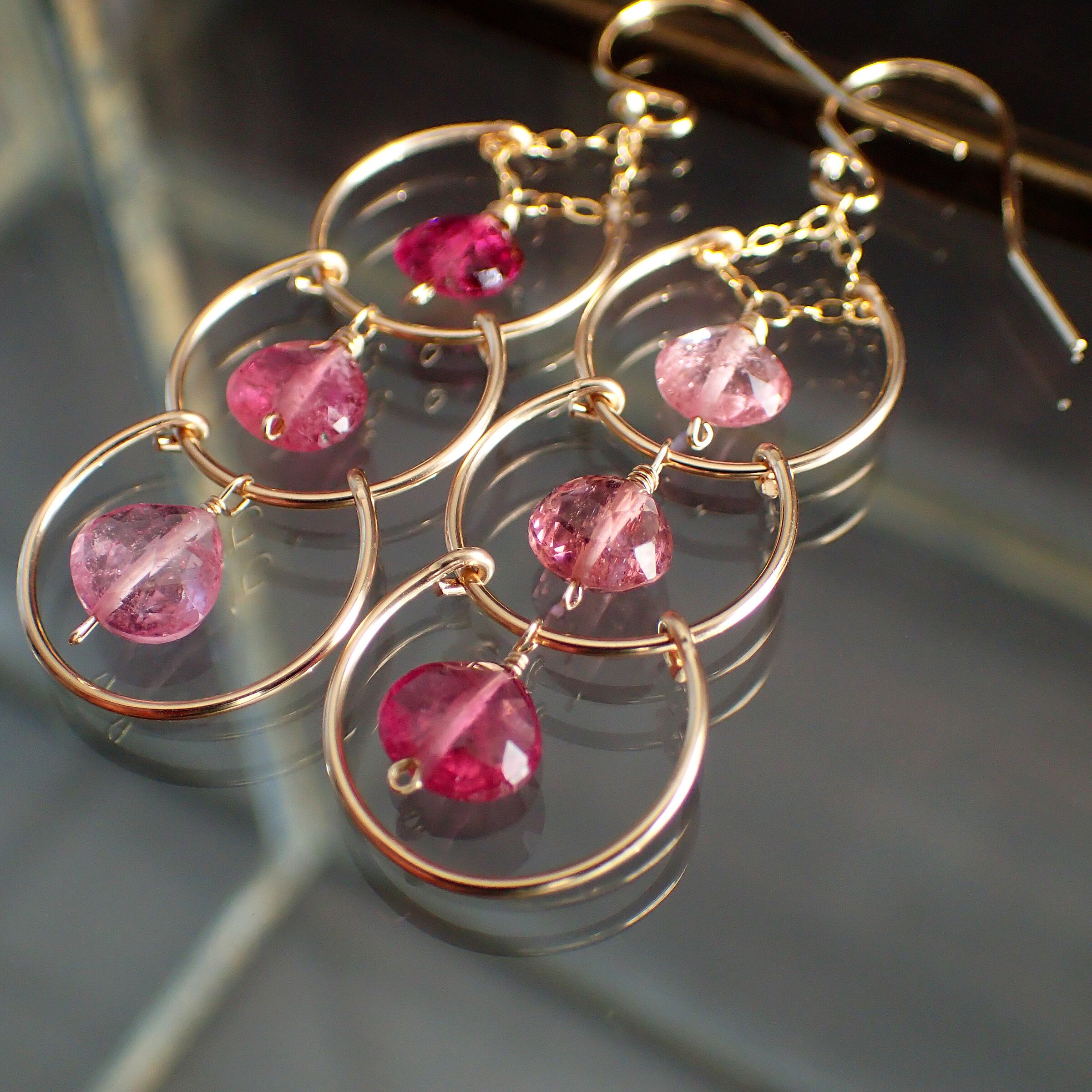 この魅力的なロングシャンデリアピアスは、満開のアザレアの花のようなピンクトルマリンを使用した、エレガントなデザインが特長です。