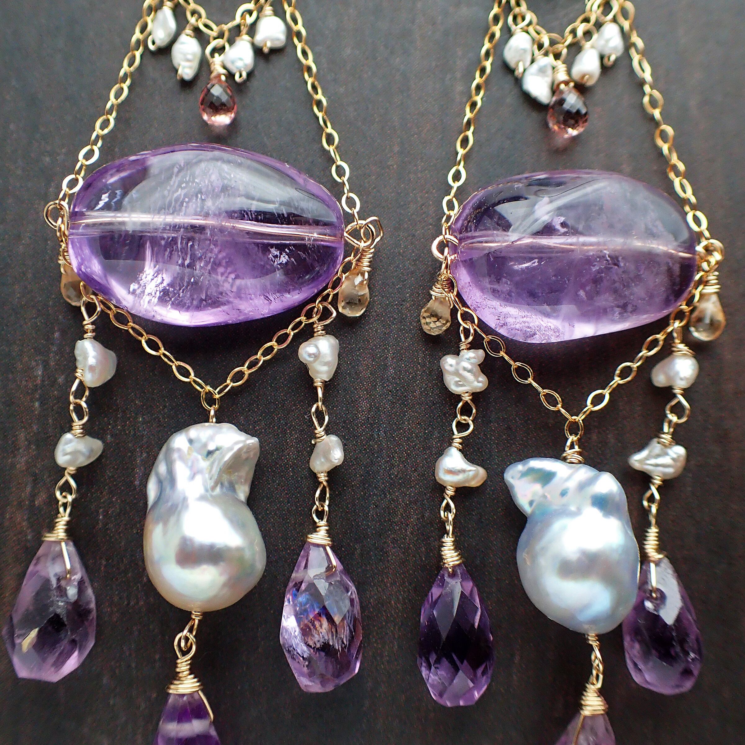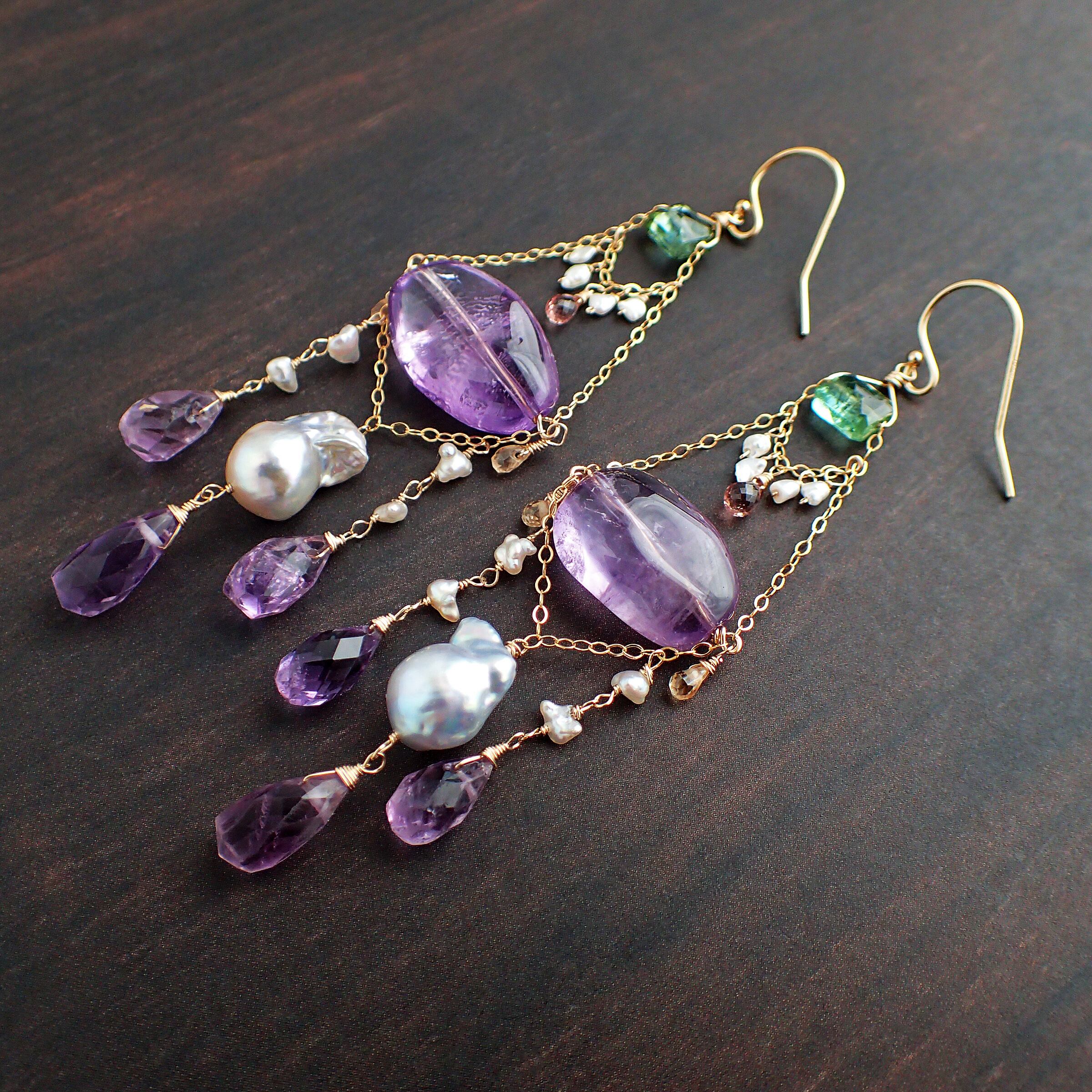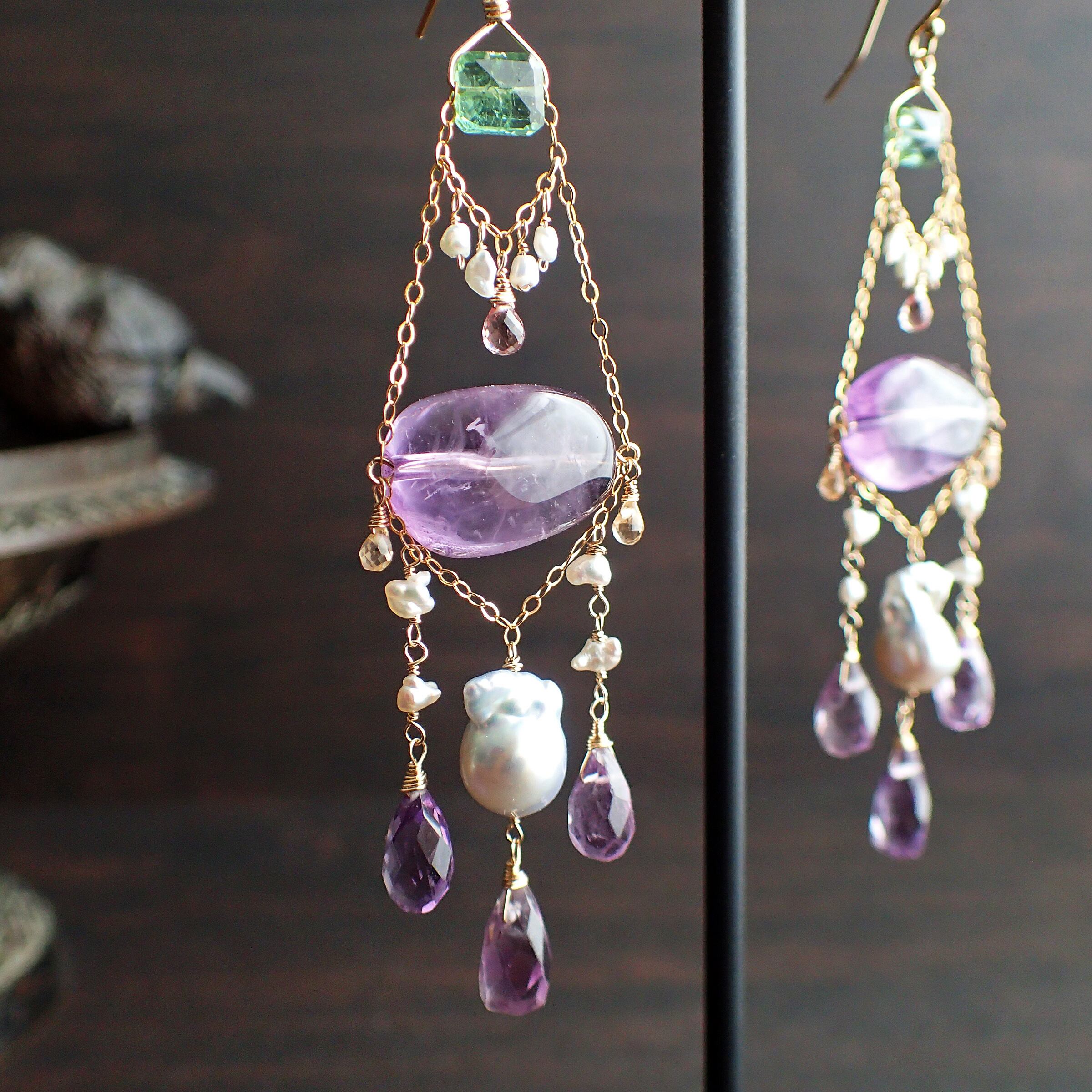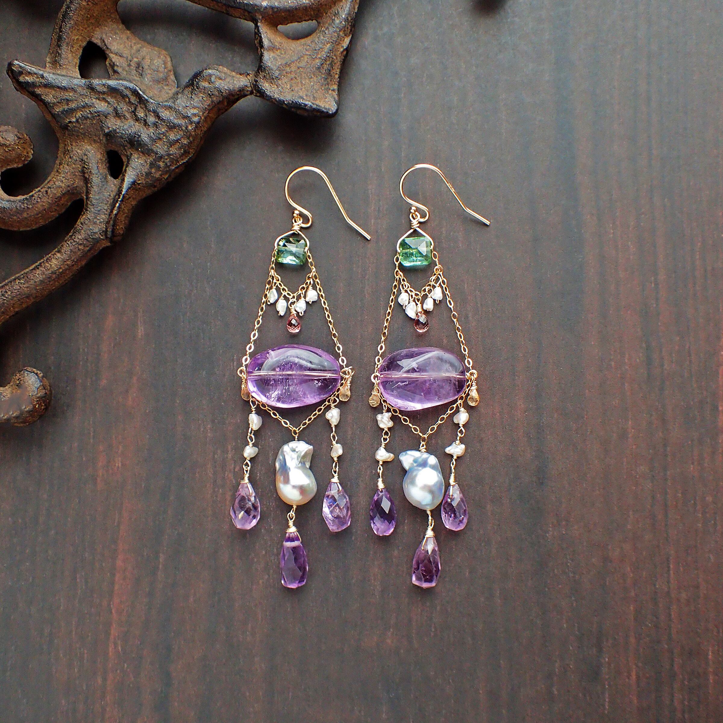 このすみれの花のシャンデリアピアスは、魅力的な大粒のアメジストと、優雅なあこやパール(砂ケシ・ケシ・バロック)、上質なピンクサファイア、そして美しいグリーントルマリンを使用した、華やかで洗練されたデザインが特長です。耳元で軽やかに揺れる様子は、あなたの魅力を一層引き立てます。