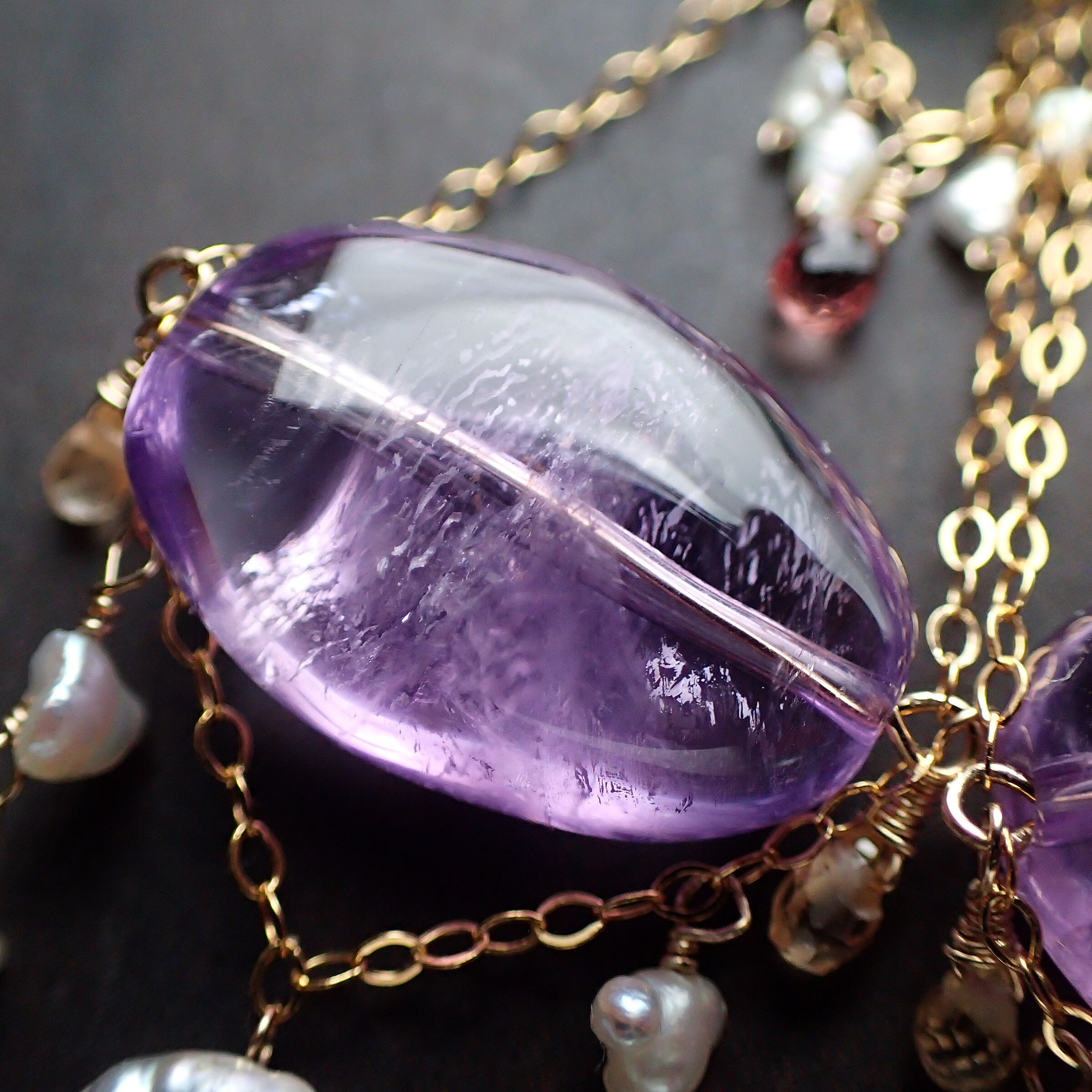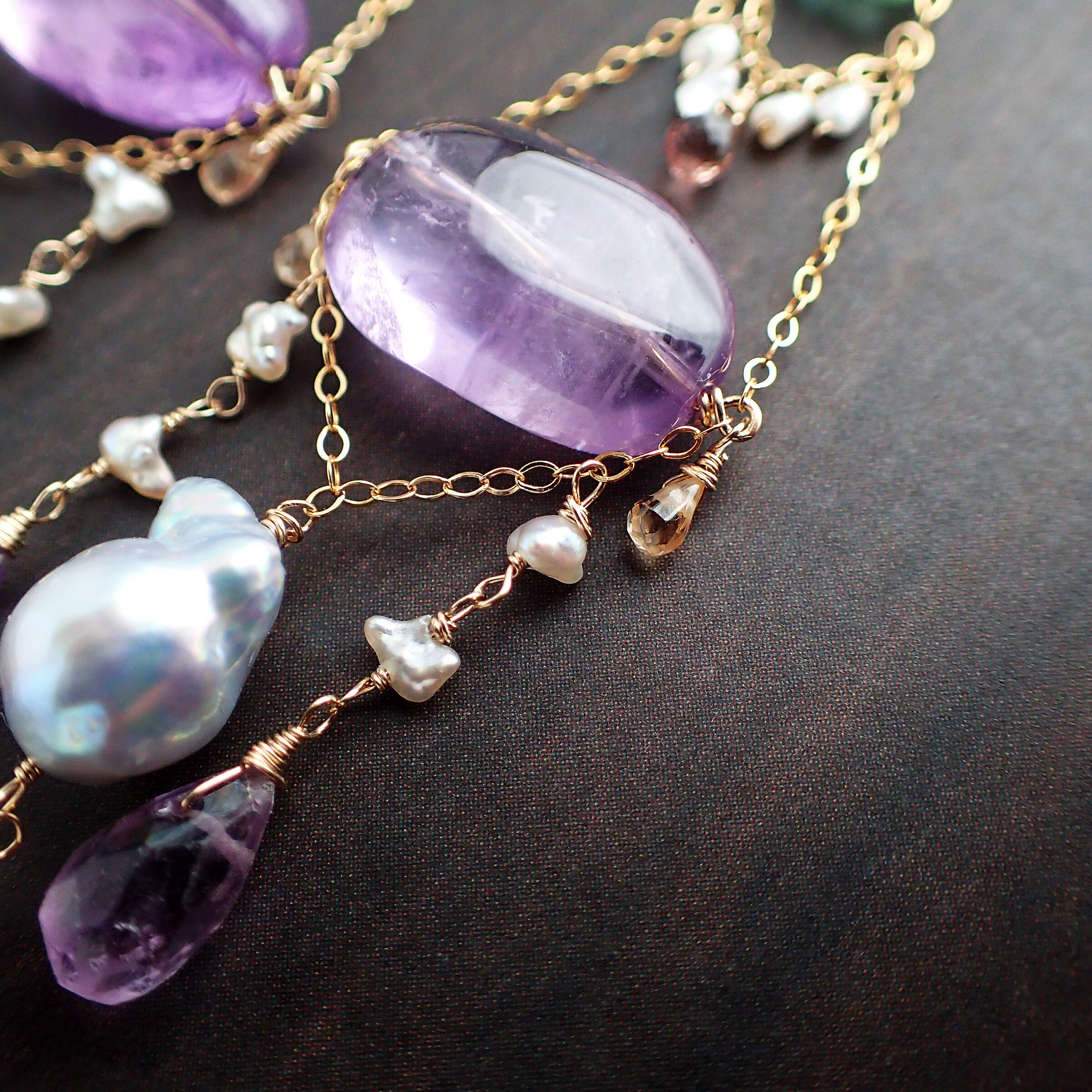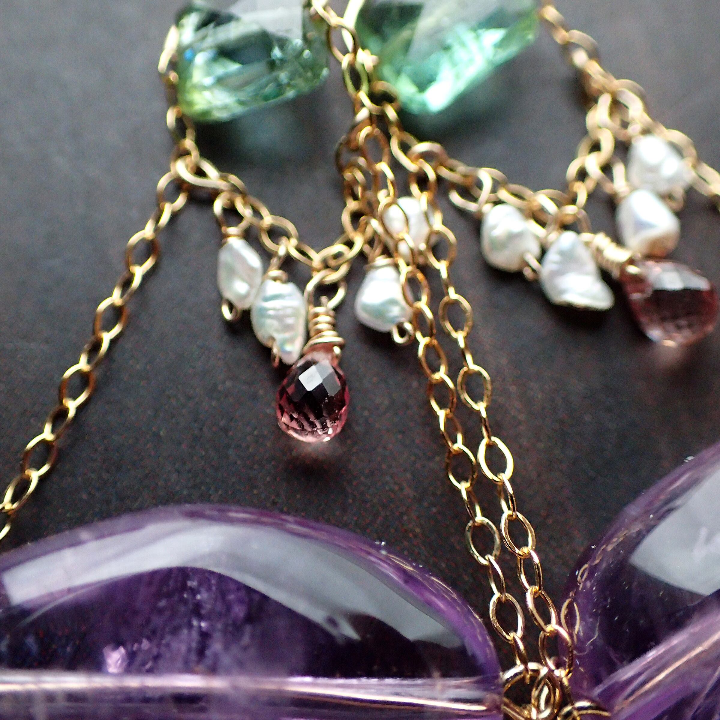 アメジスト(オーバル…縦1.18×横1.72×厚さ0.7㎝)、あこやパール(砂ケシ・ケシ・バロック)、ピンクサファイア、グリーントルマリン、K14GF