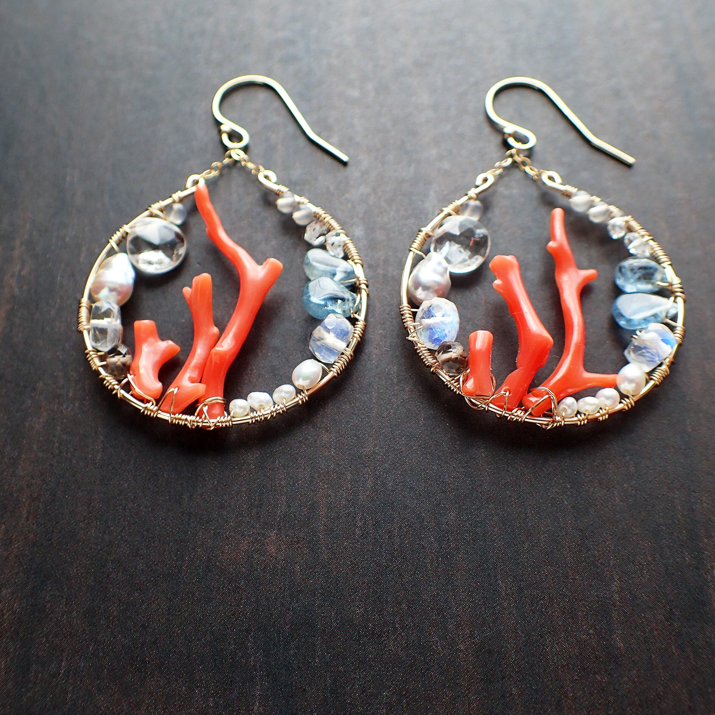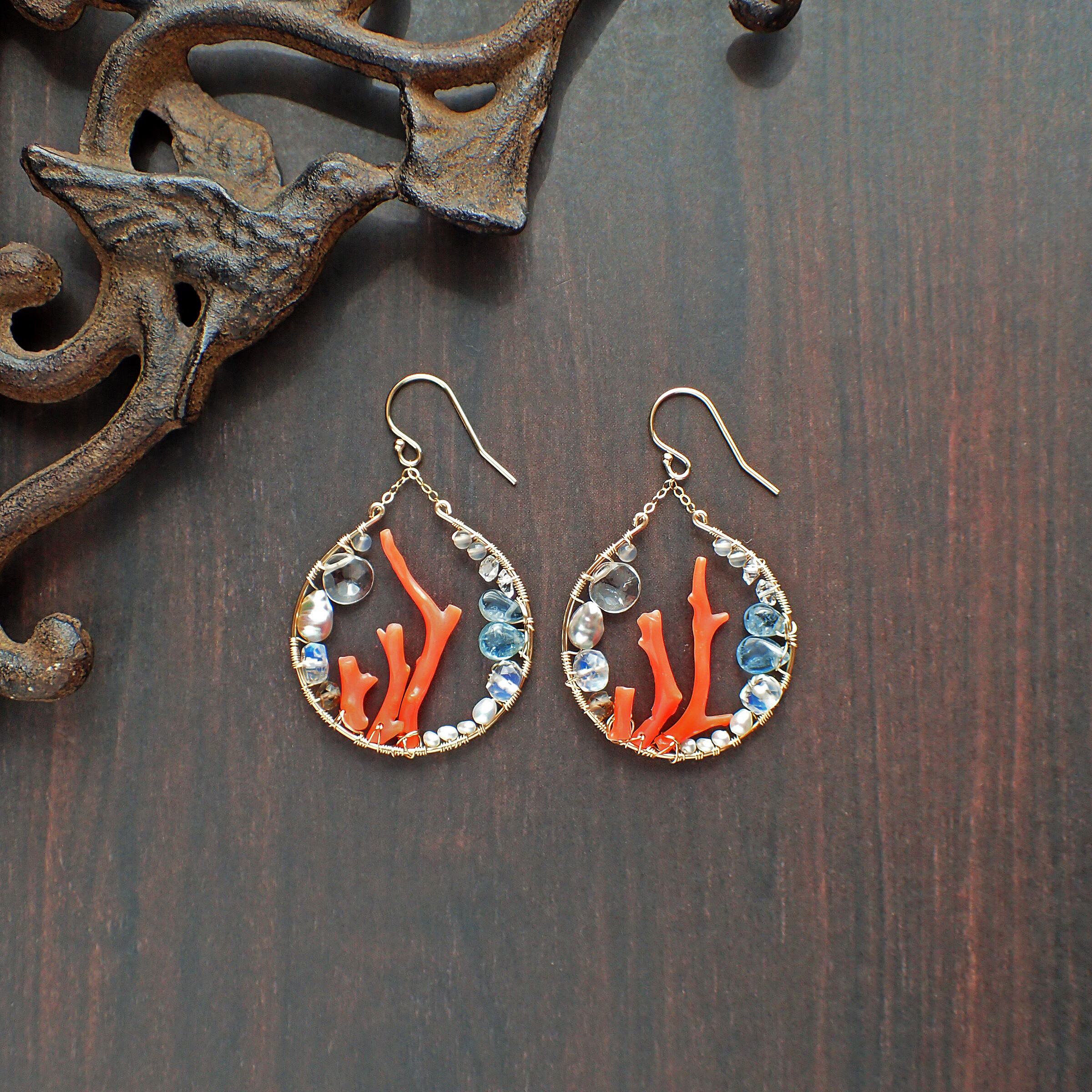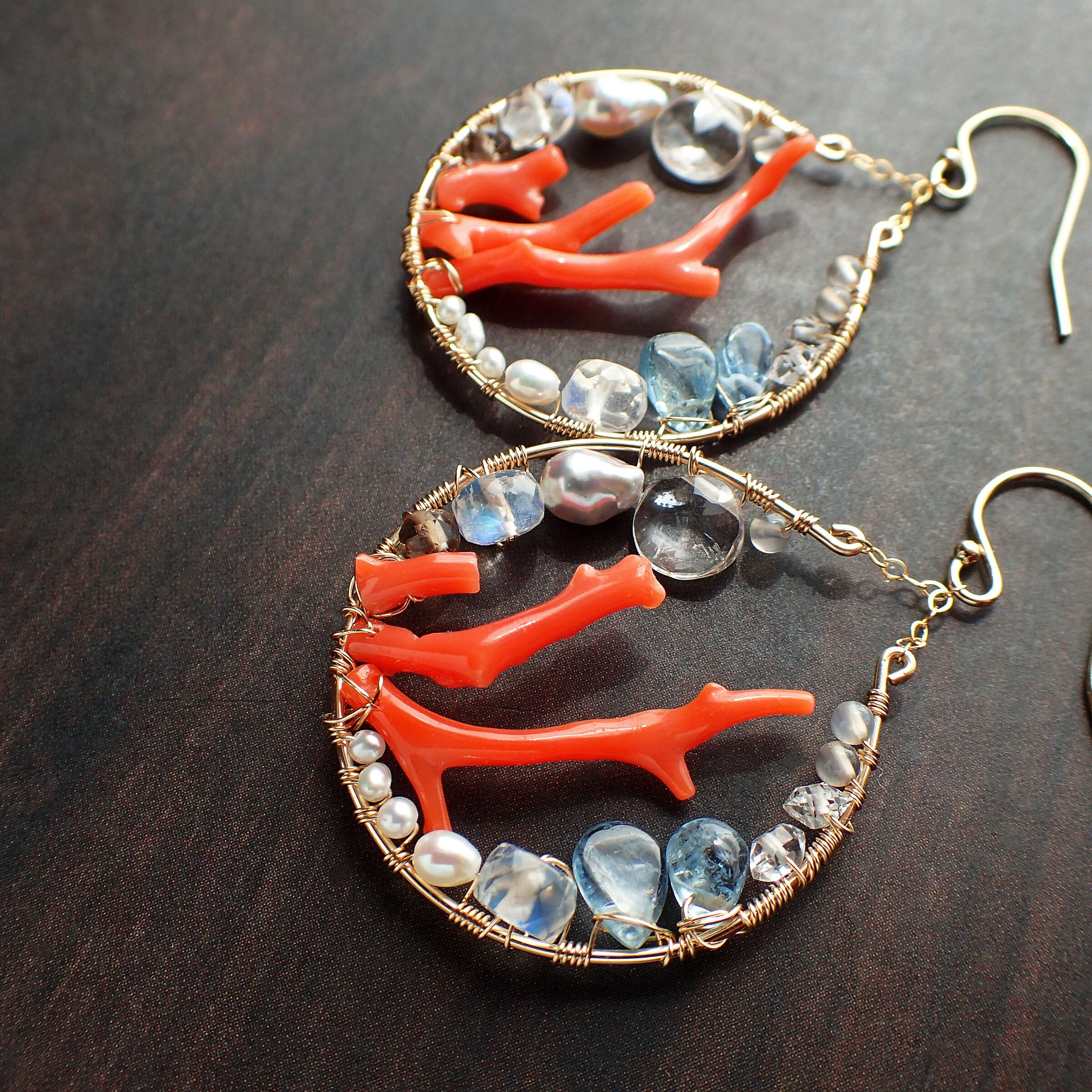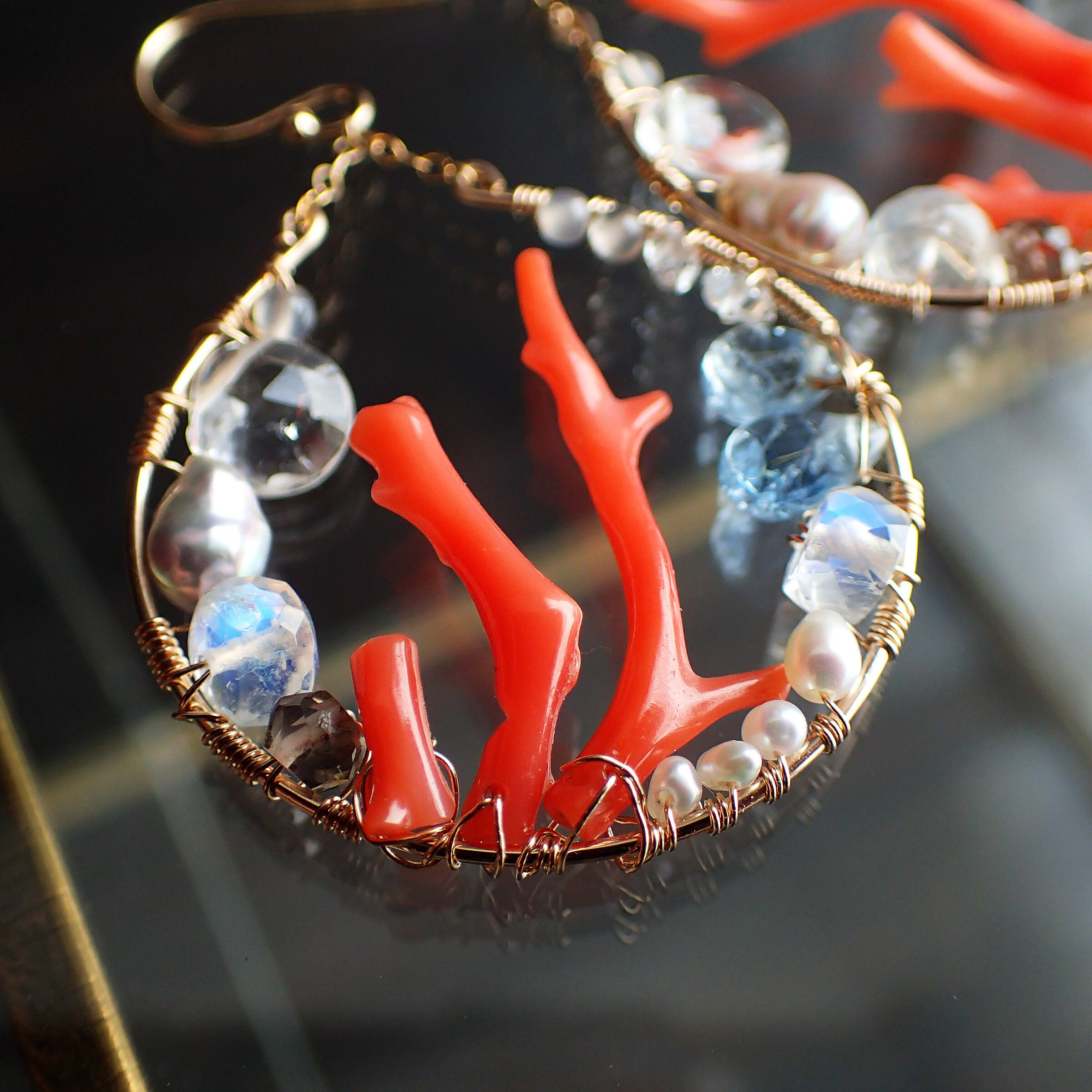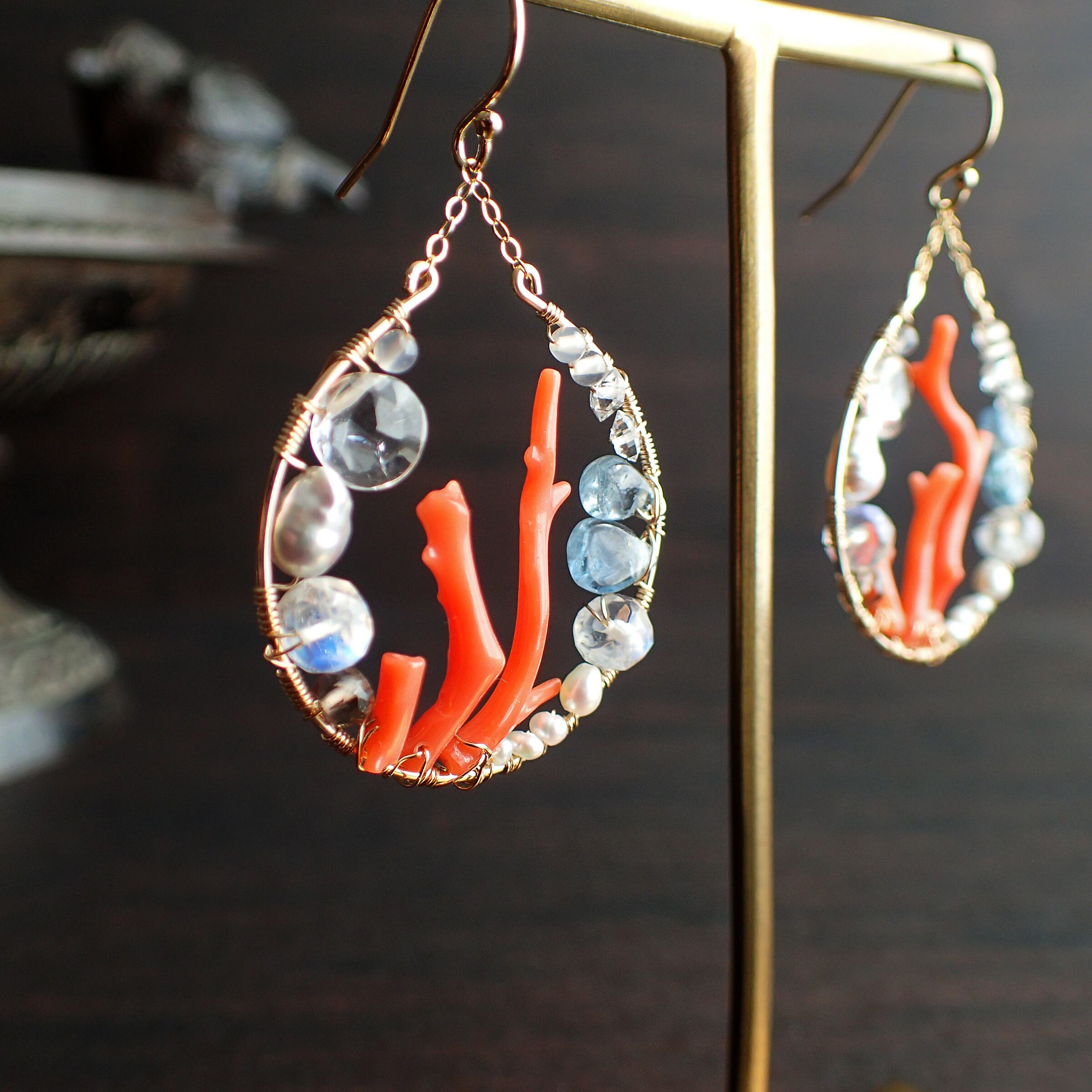 このワイングラスピアスは、優雅なピンクカラーの枝珊瑚と透き通るようなアクアマリン、さらに豊かな表情を持つブルームーンストーンや淡水パール、あこやパールを使用した、海中の美しい世界観を表現した特長があります。