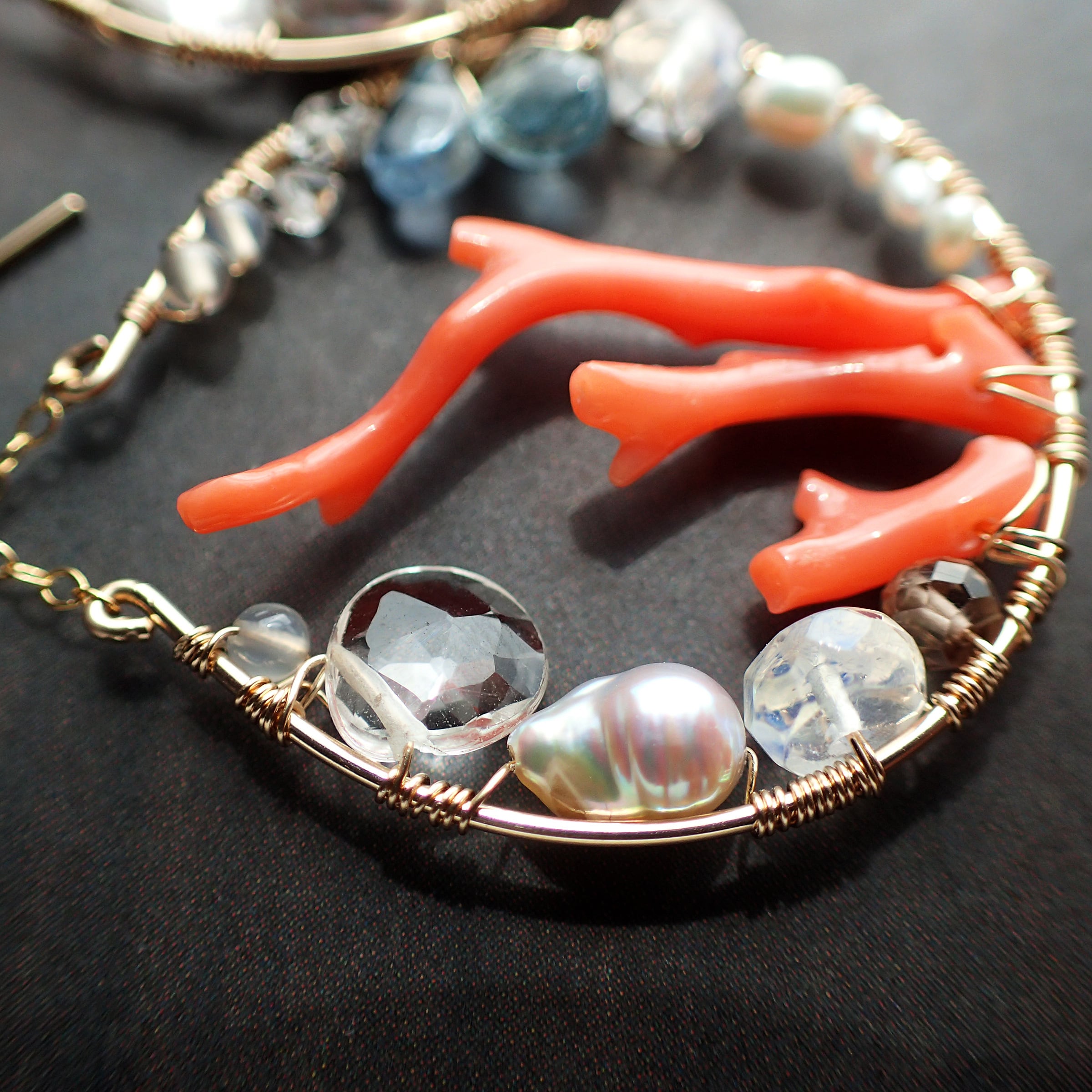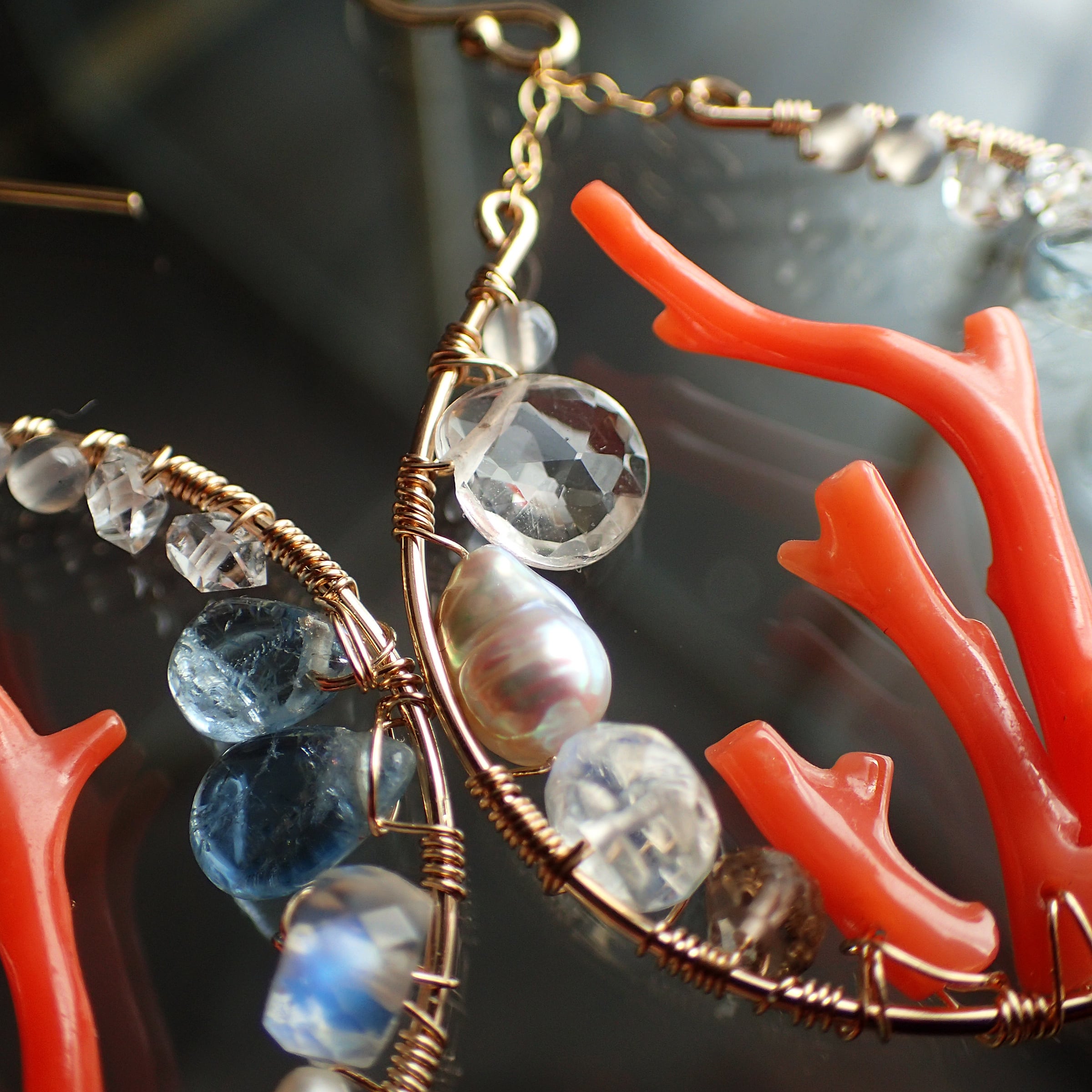 珊瑚、アクアマリン、ブルームーンストーン、淡水パール、あこやパール、グレークウォーツ、ブラウントパーズ、ハーキマーダイヤモンド、K14GF
