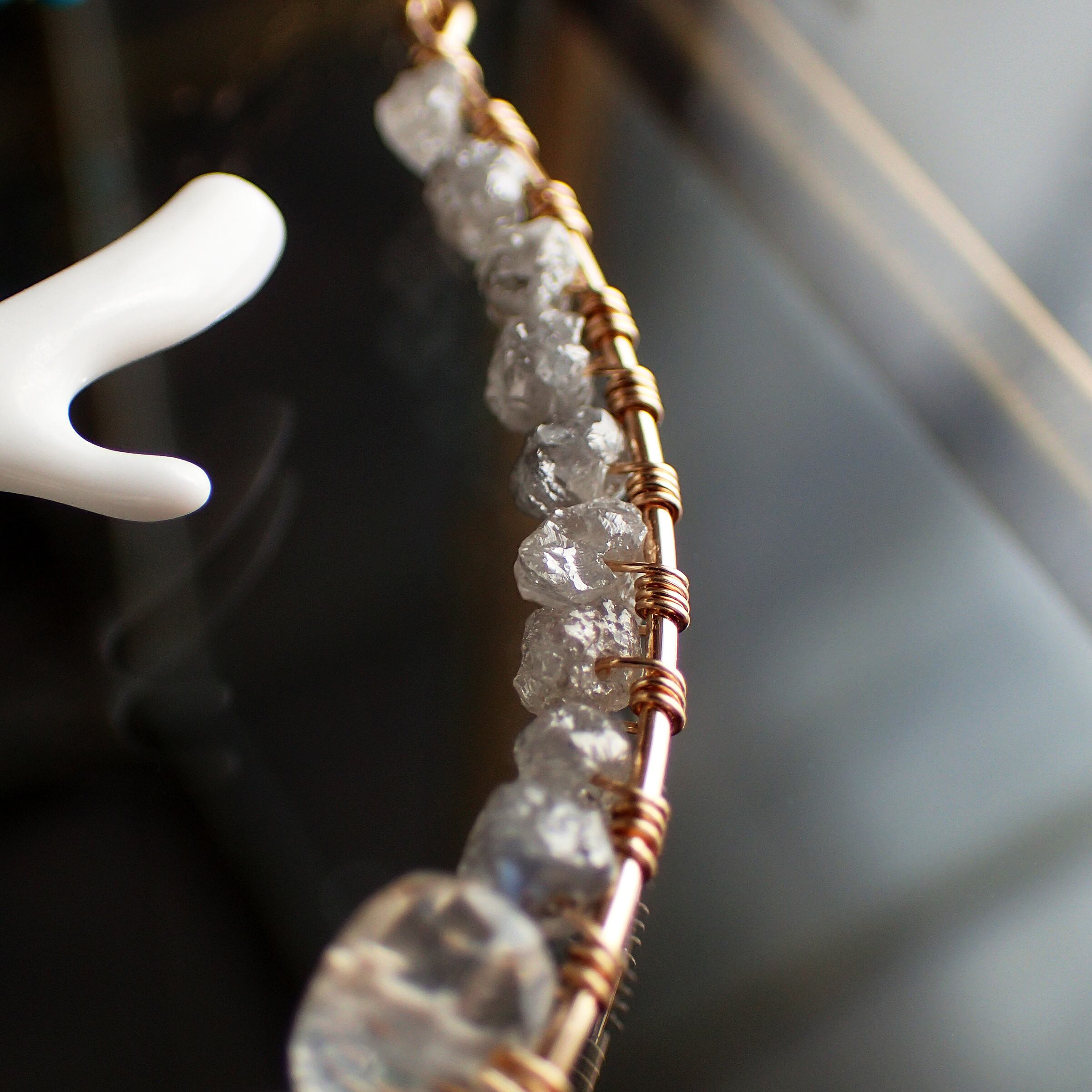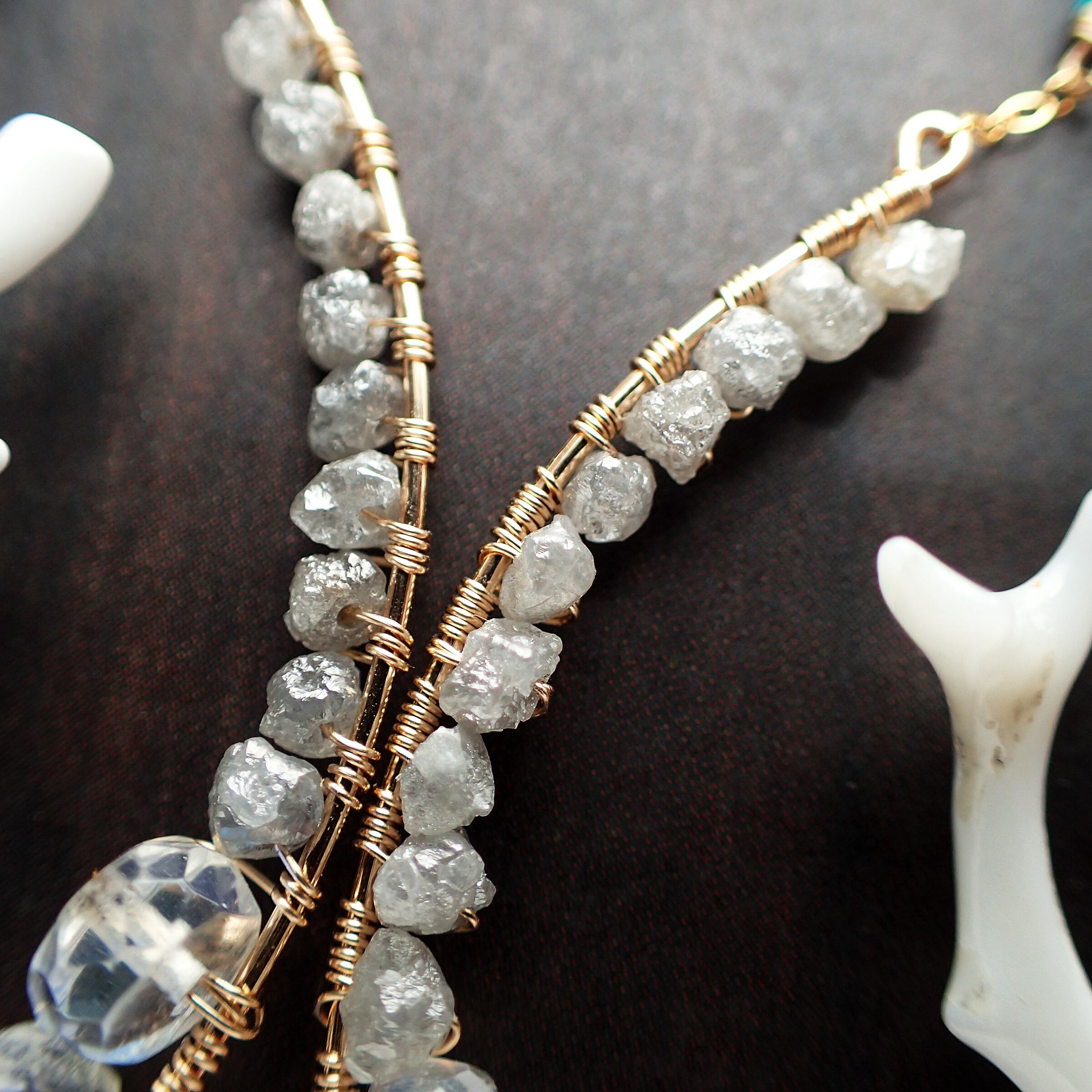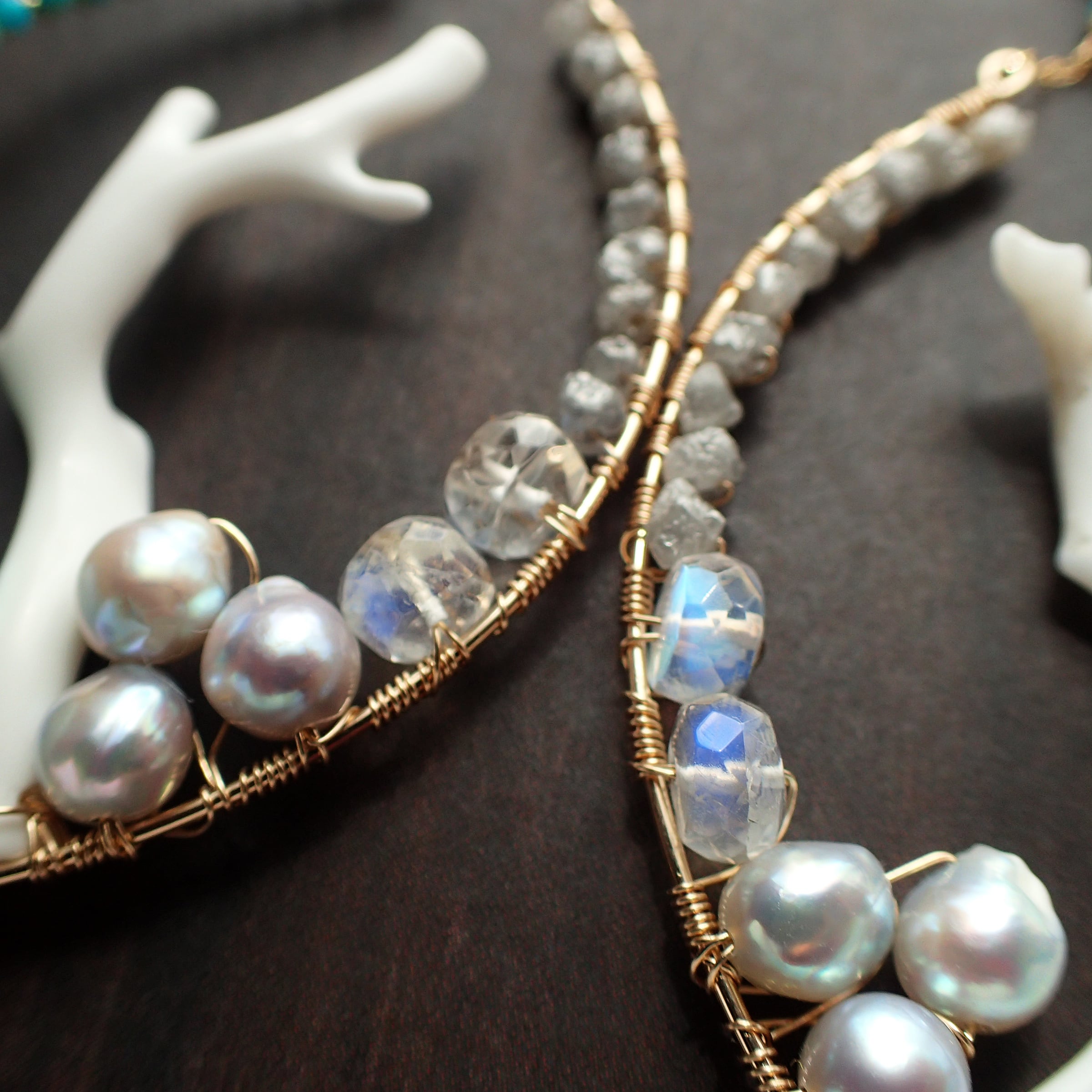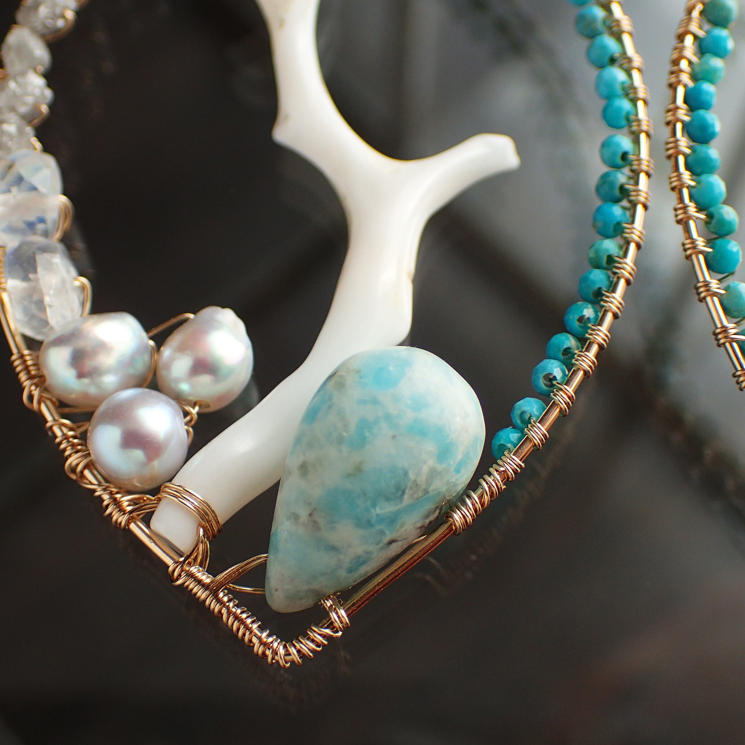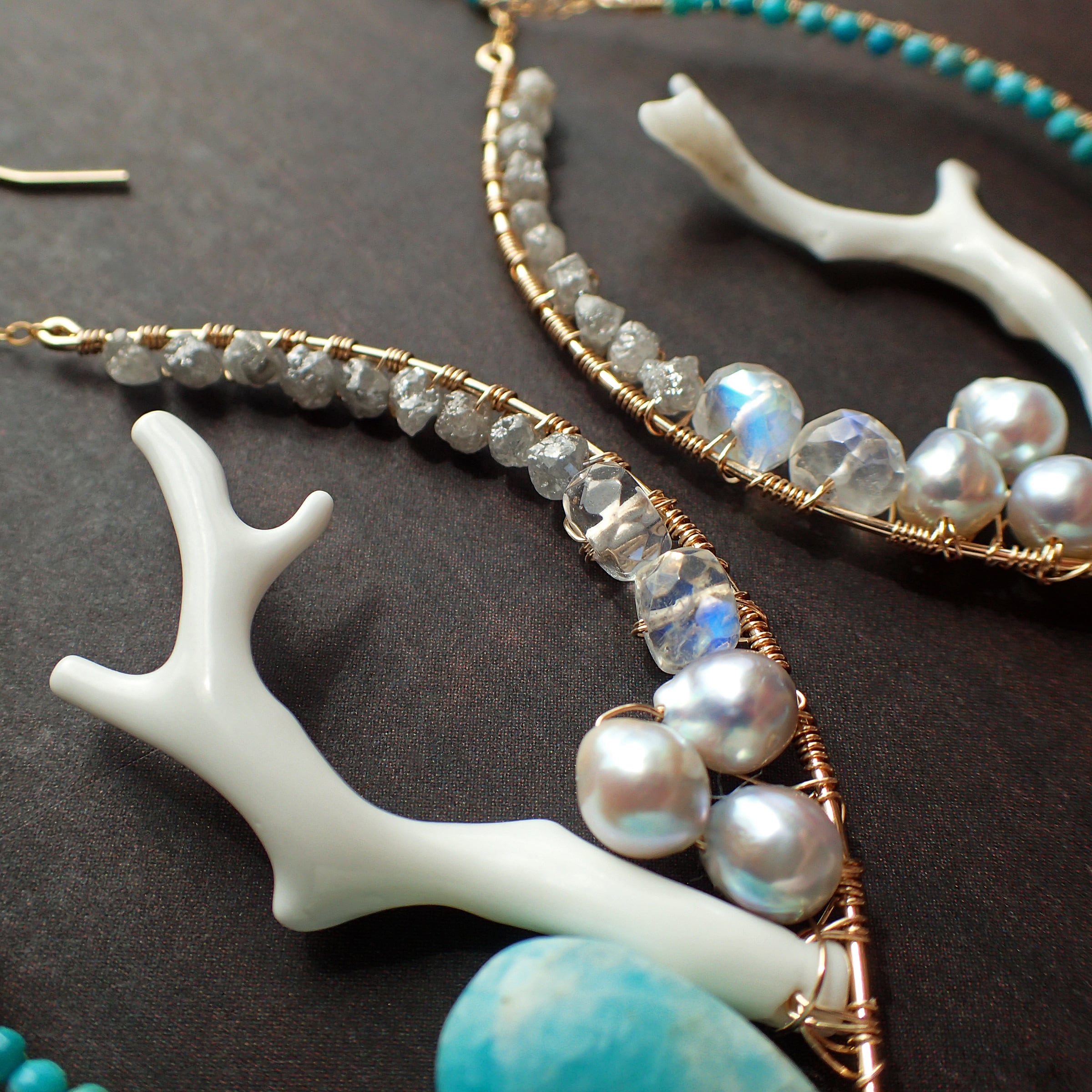 白枝珊瑚、トルコ石、ラフダイヤモンド、ブルームーンストーン、あこやパール、アマゾナイト、K14GF