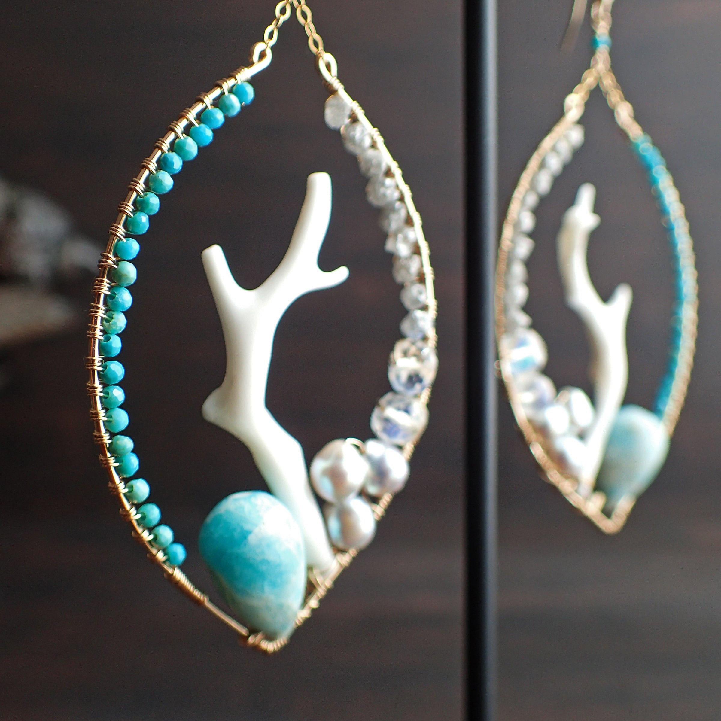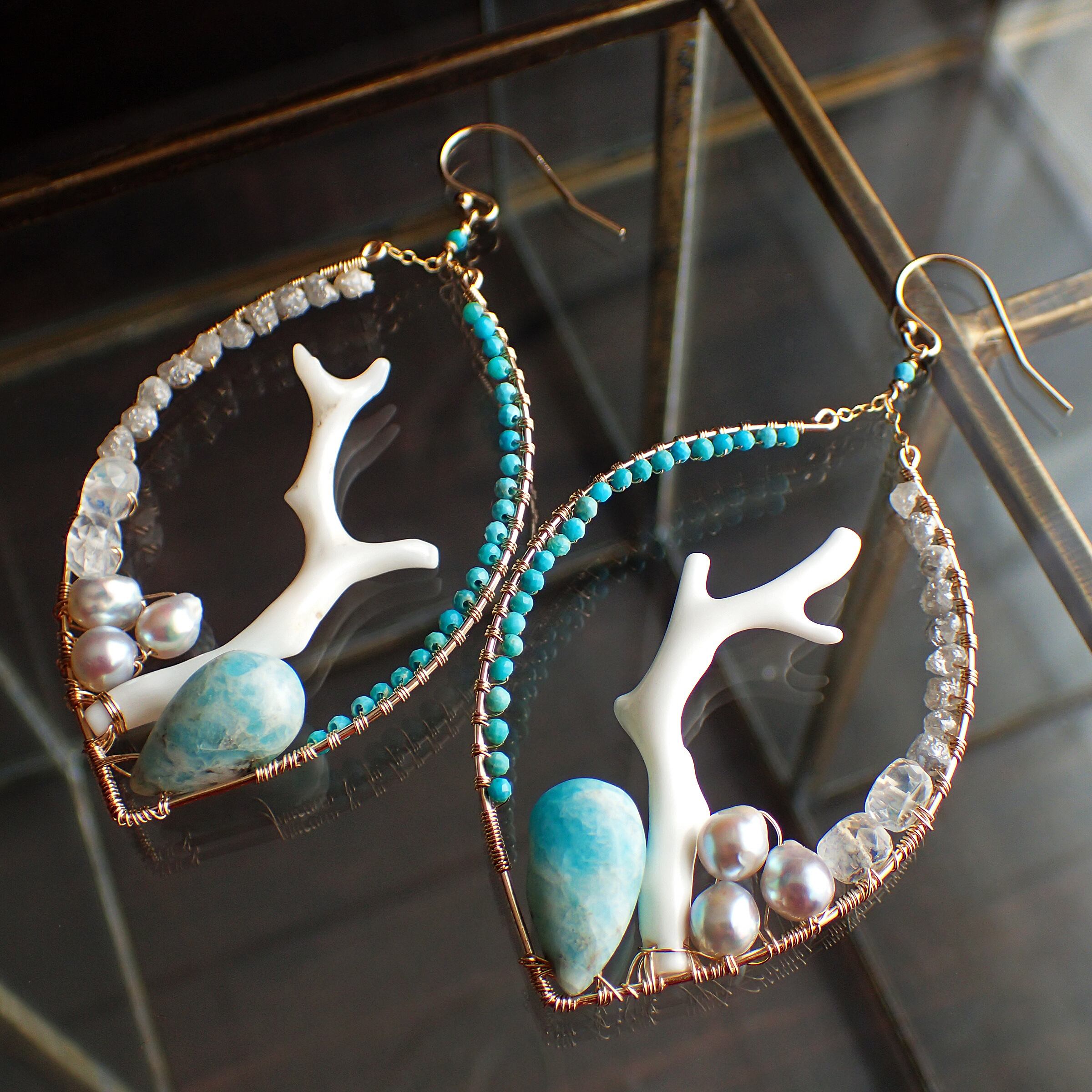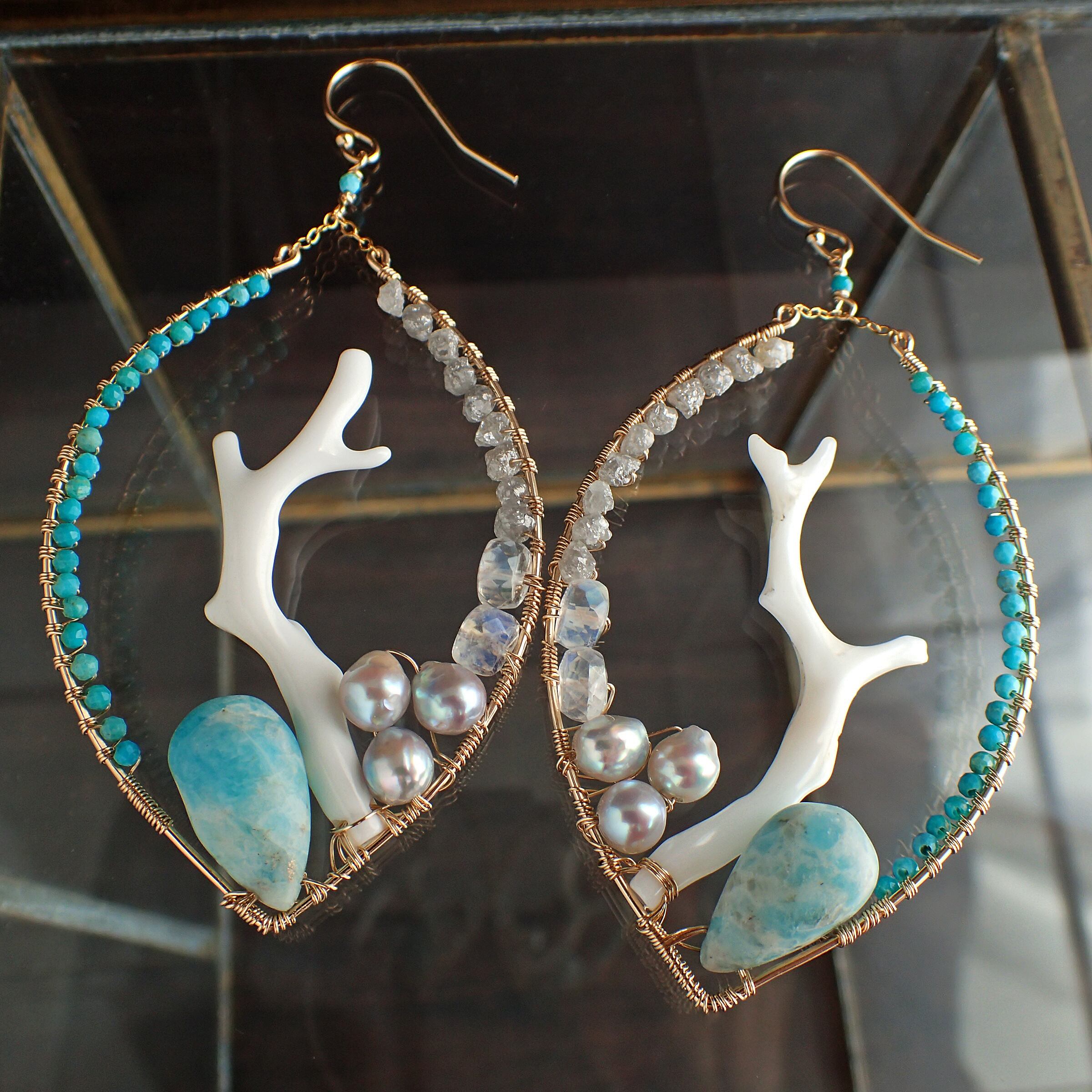 このピアスは、優雅な白枝珊瑚と鮮やかなトルコ石、さらに天然のラフダイヤモンドや神秘的なブルームーンストーンを使用し、まるで海の中の幻想的な景色を切り取ったかのような美しいデザインが特長です。