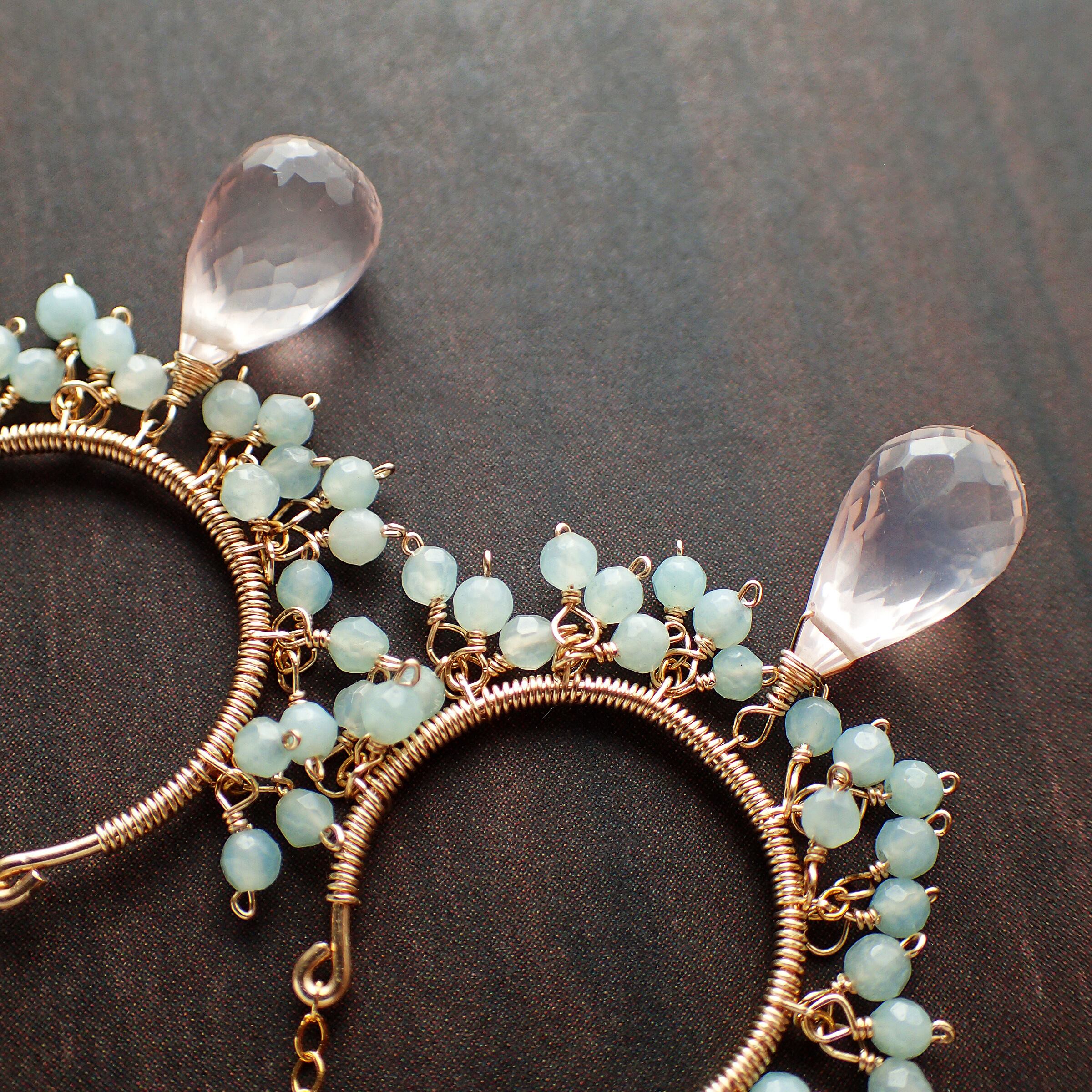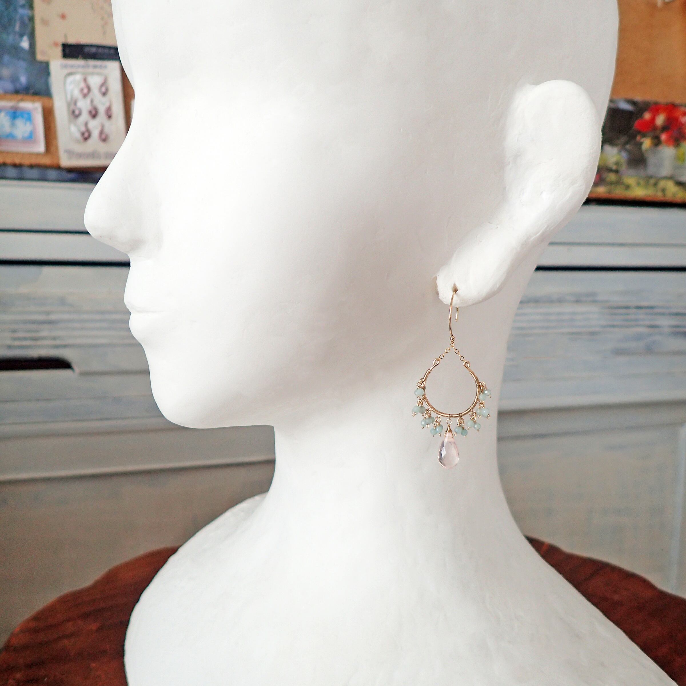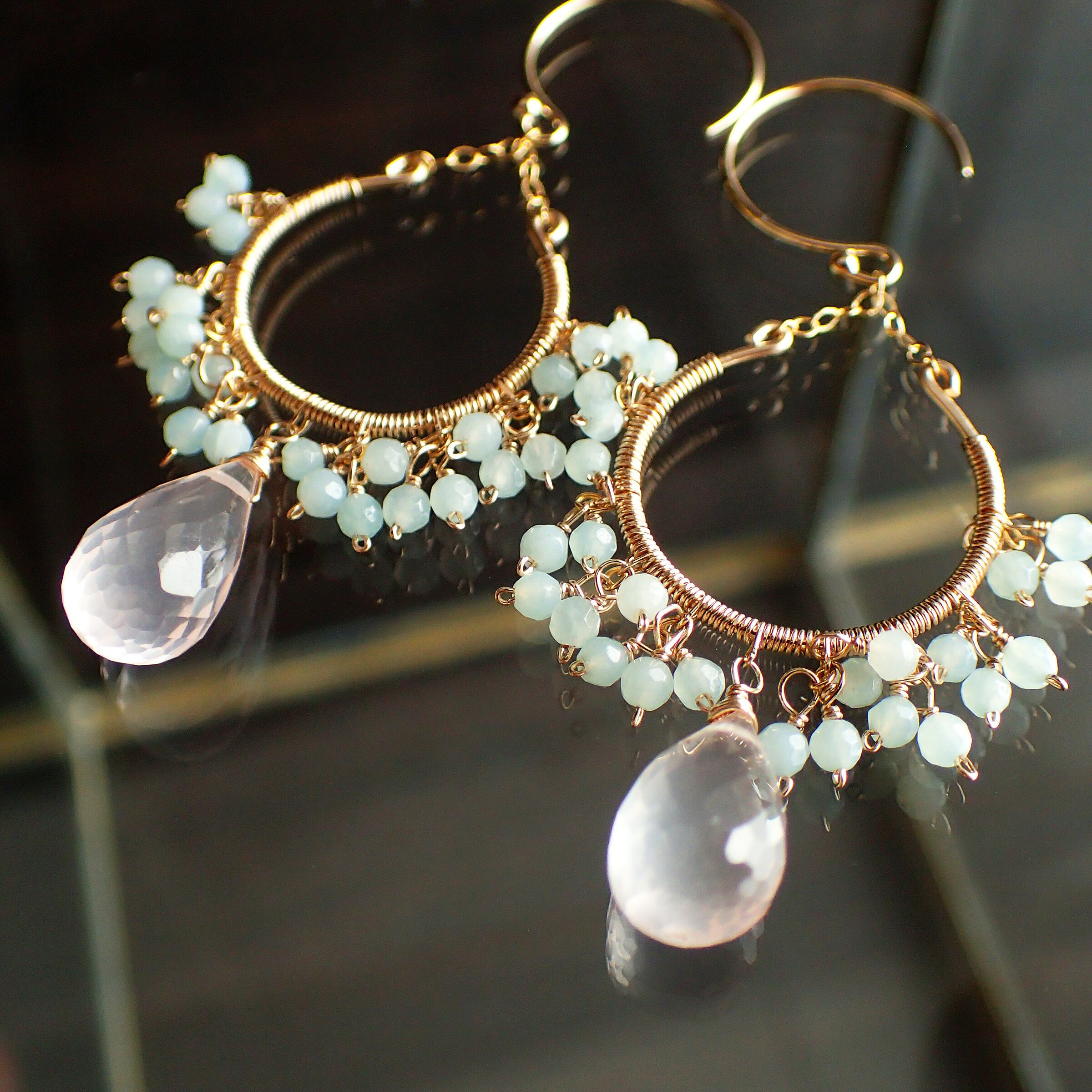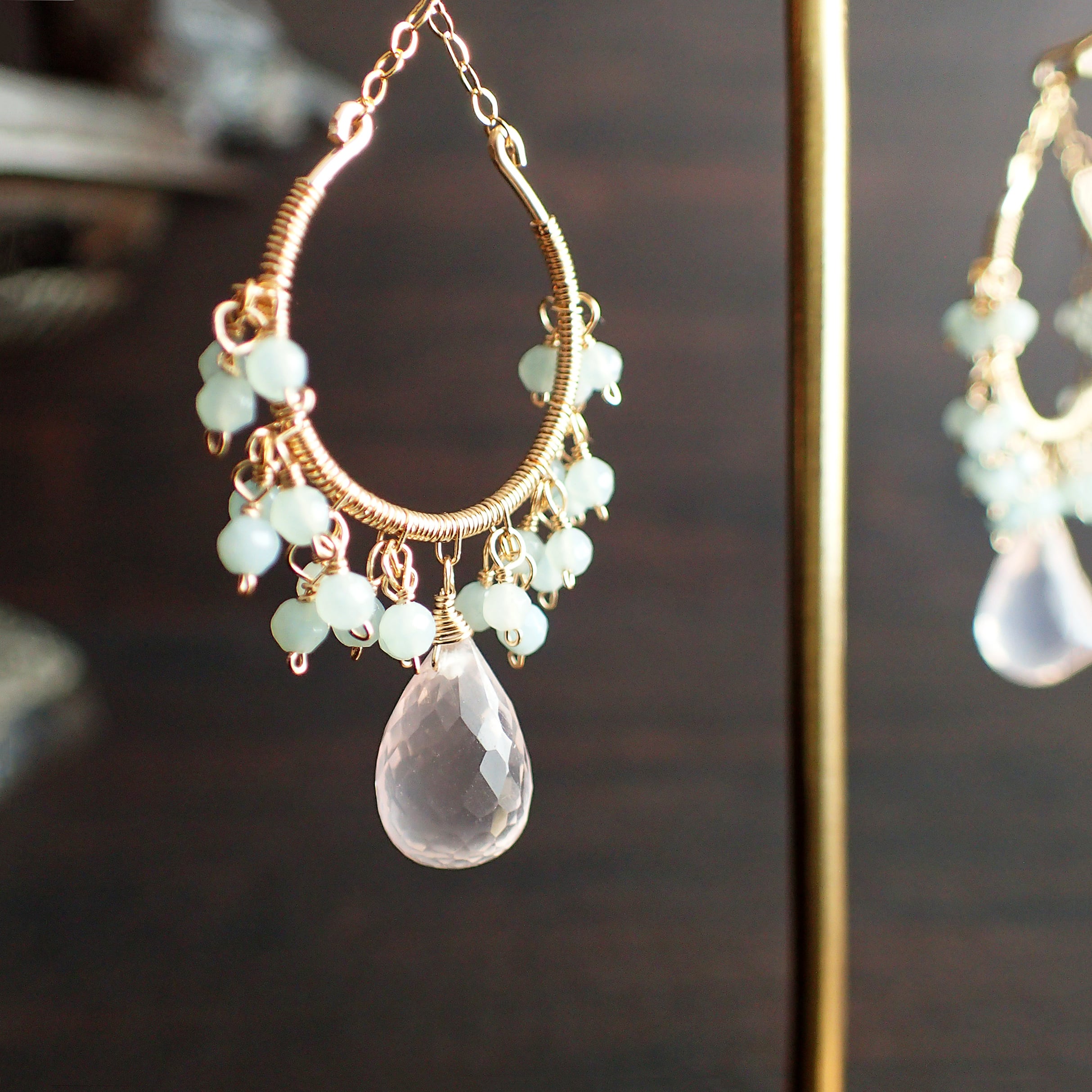 このピアスは、柔らかなカラーのローズクウォーツとアマゾナイトを使用し、まるで春の穏やかな風を感じさせる美しいデザインが特長です。