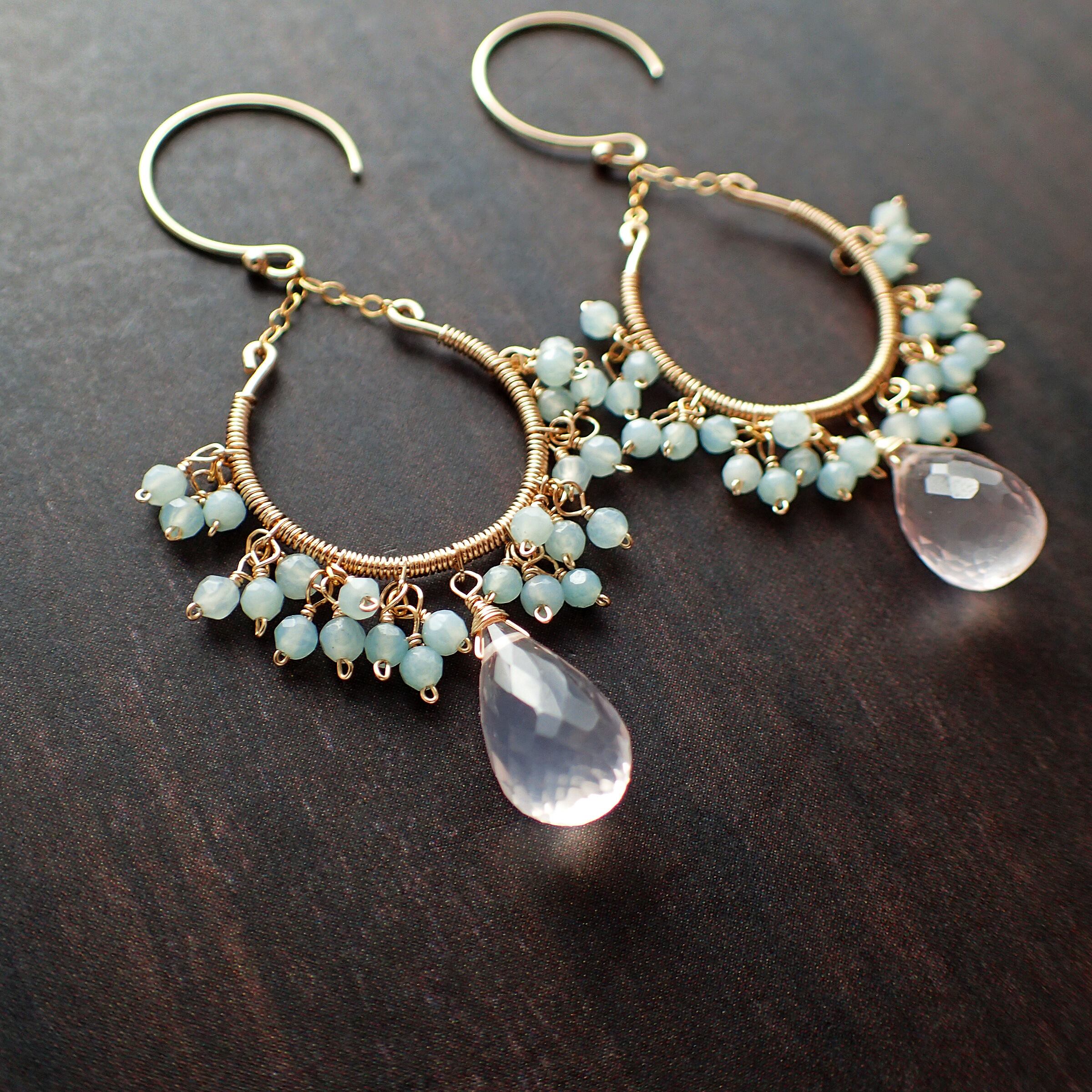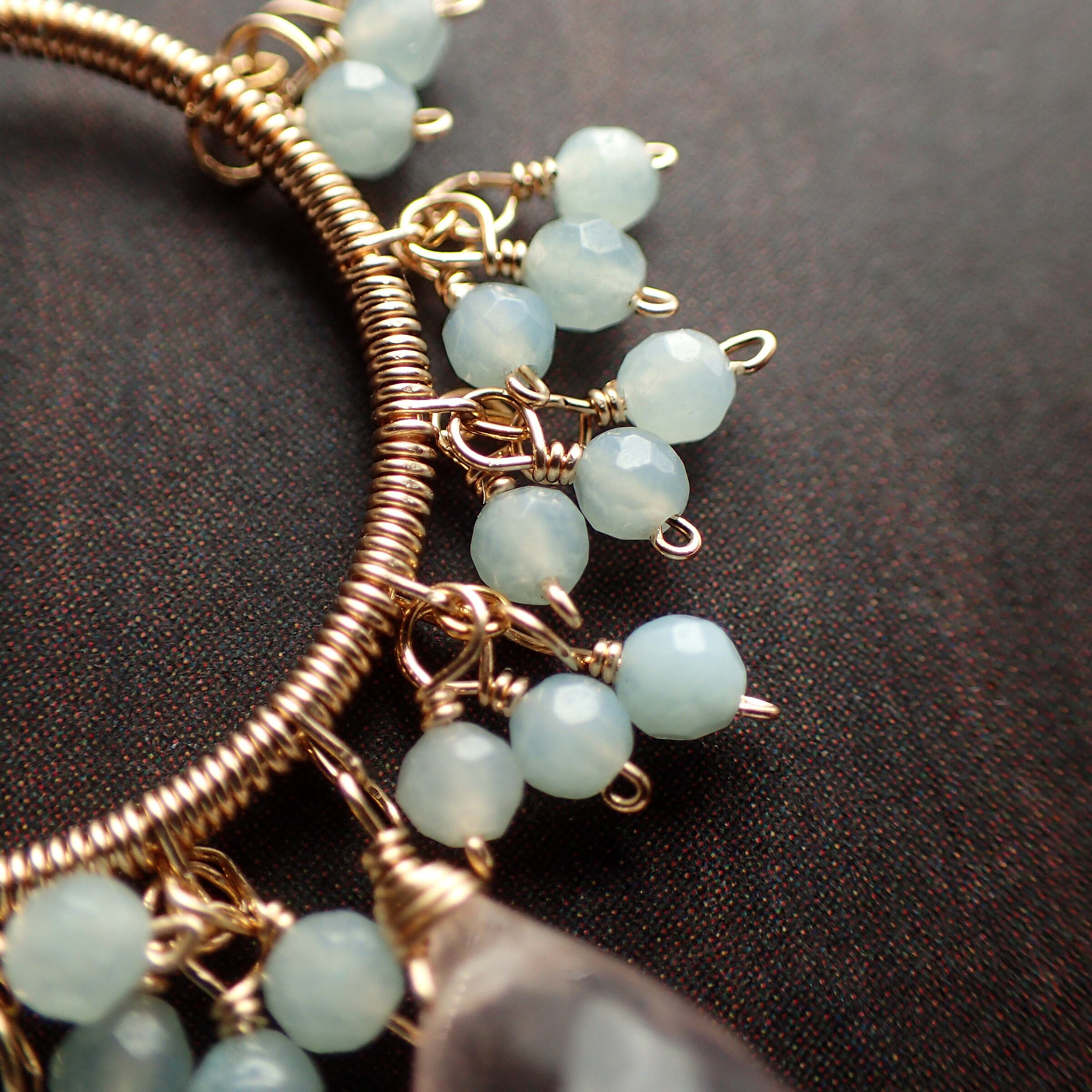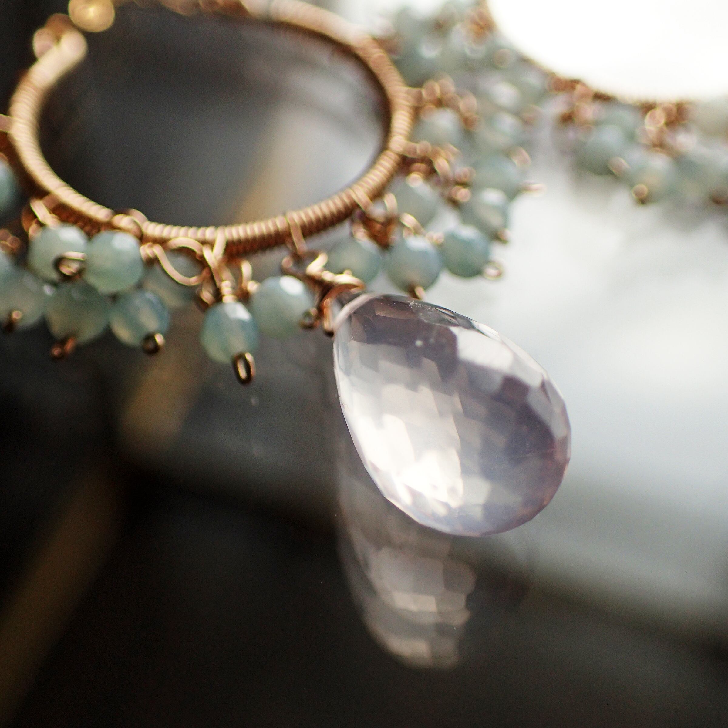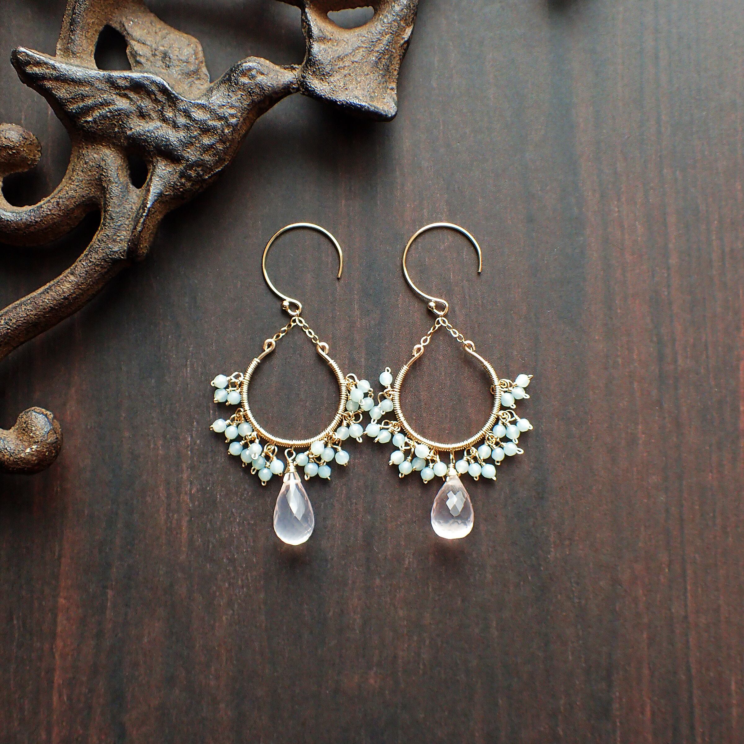 このピアスは、柔らかなカラーのローズクウォーツとアマゾナイトを使用し、まるで春の穏やかな風を感じさせる美しいデザインが特長です。