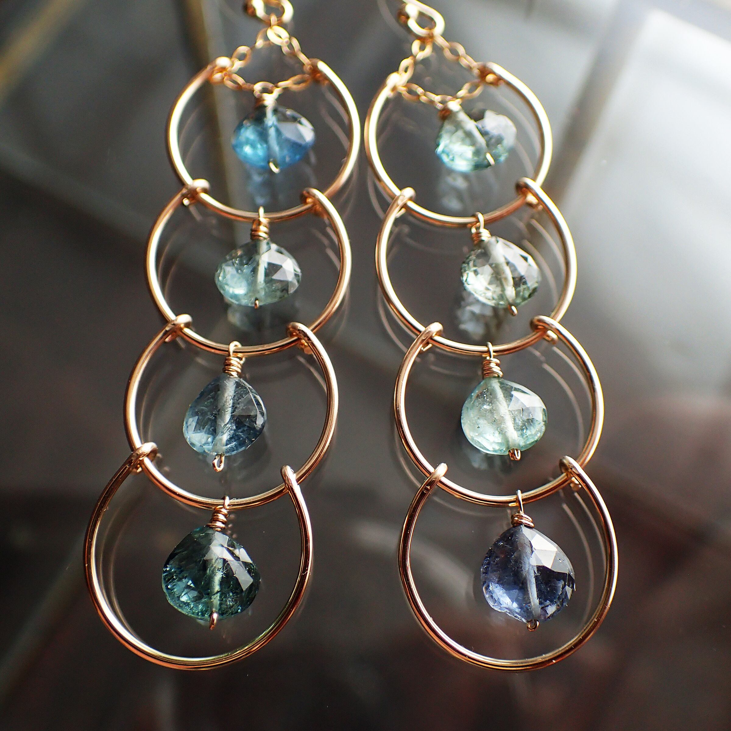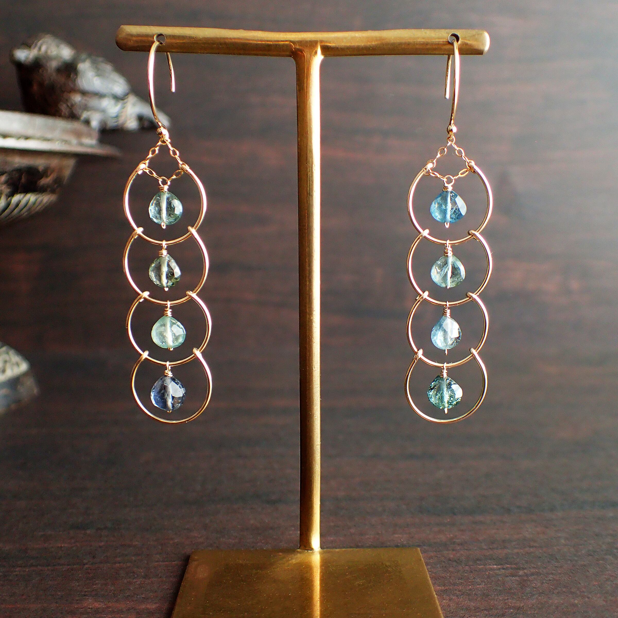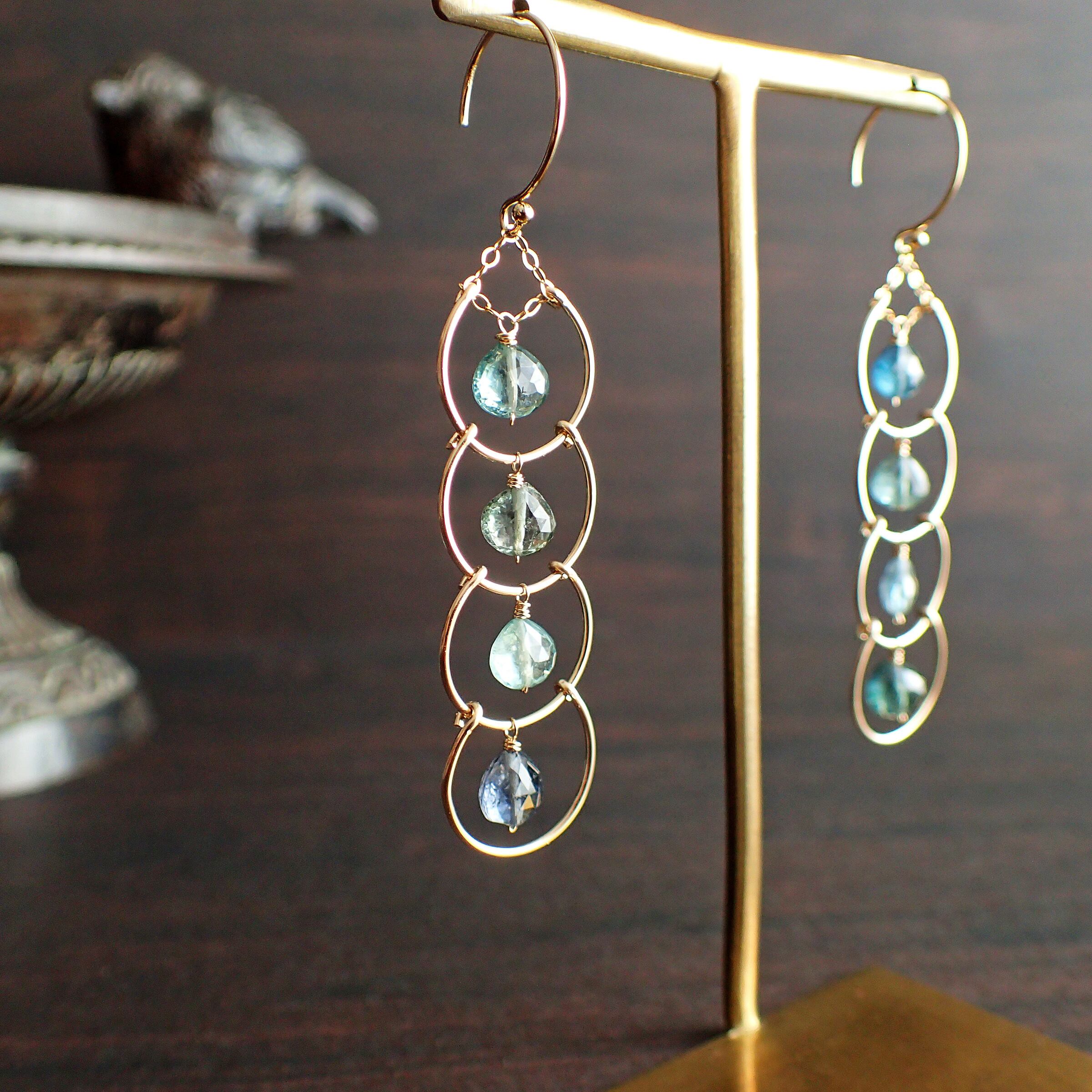 このピアスは、様々なトーンのグリーントルマリンを使用し、まるで涼やかな森林の中を散歩するかのような美しいデザインが特長です。