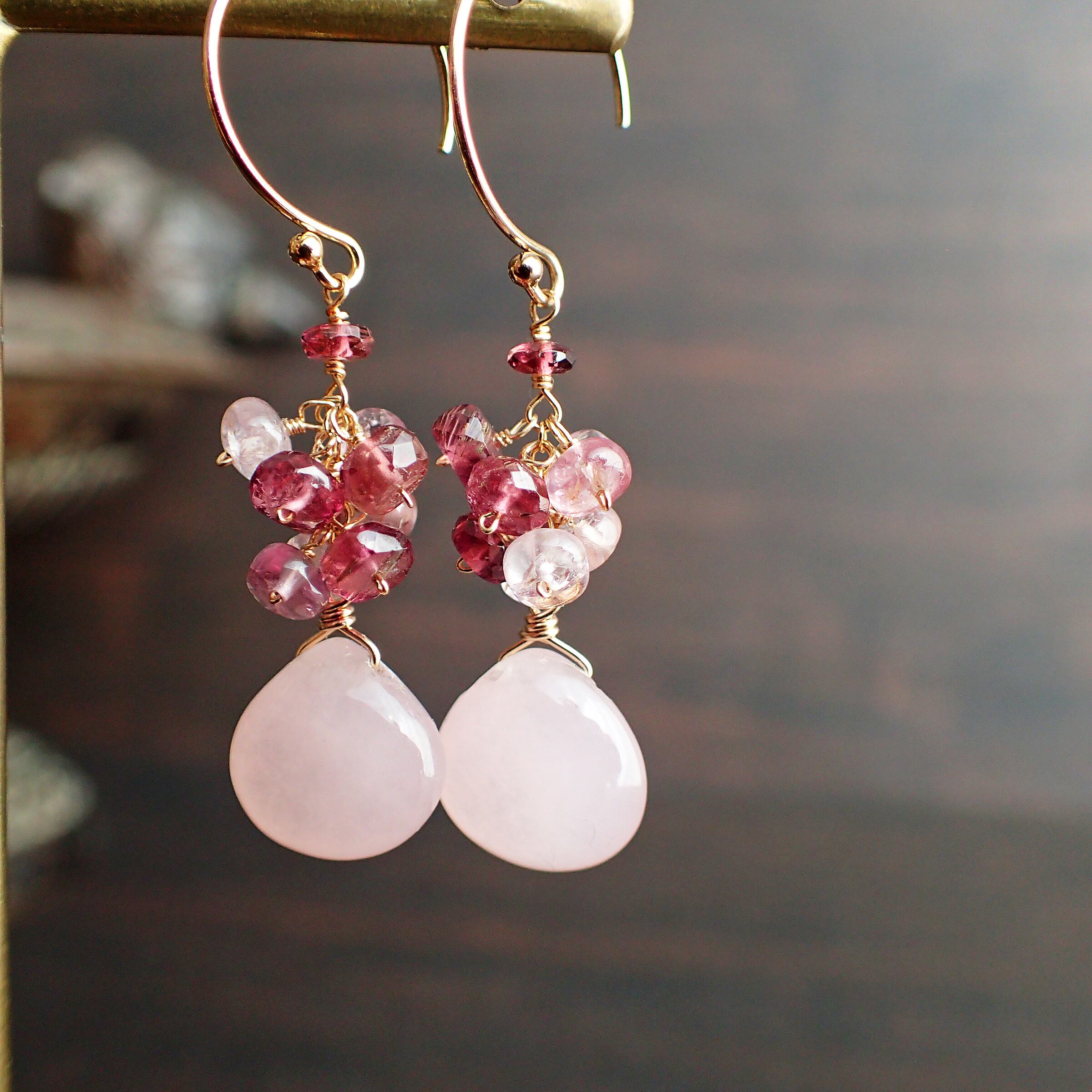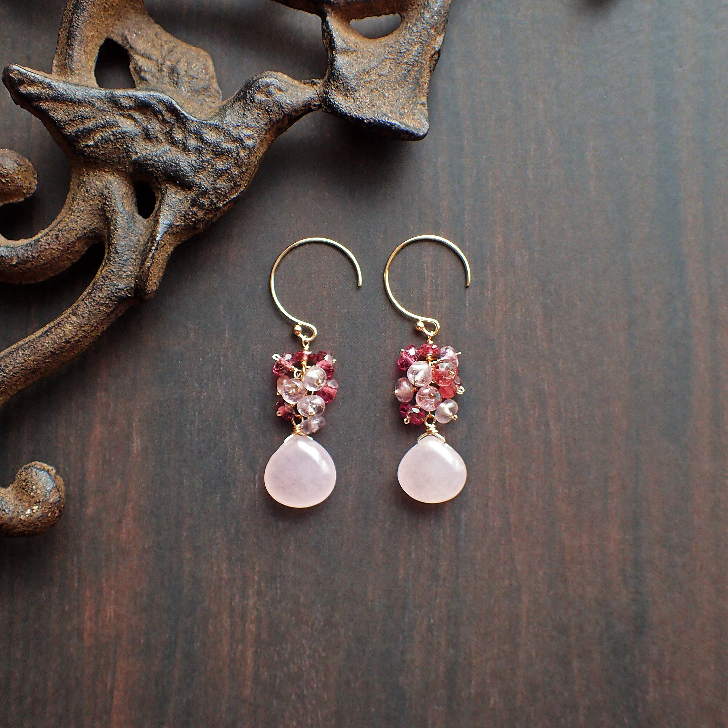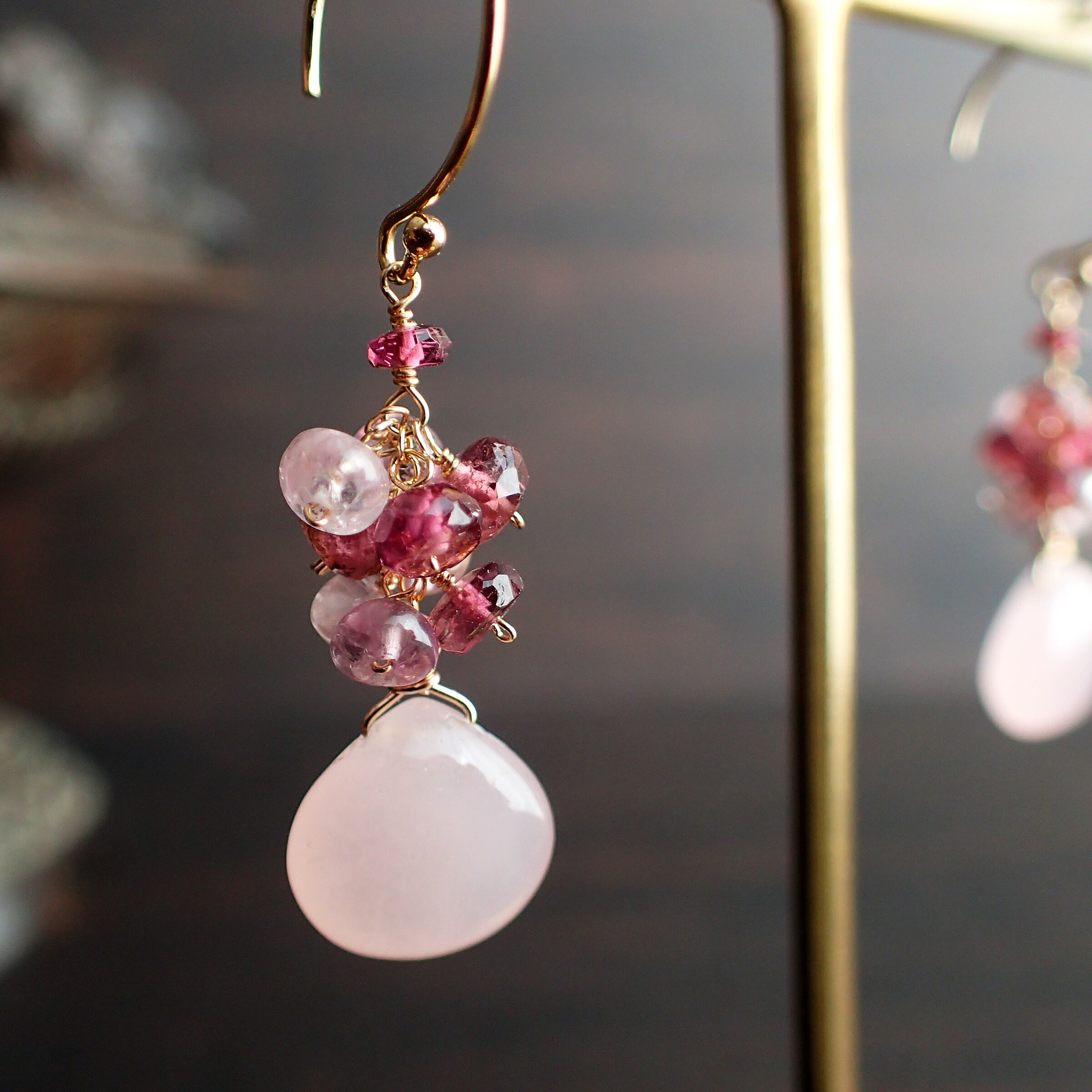 このピアスは、可愛らしいピンクジェード、柔らかなピンクトルマリン、鮮やかなピンクスピネルを使用し、まるで春の花束のような愛らしさが特長です。約4㎝のコンパクトなデザインは、耳元で軽やかに揺れ、あなたの魅力を引き立てます。