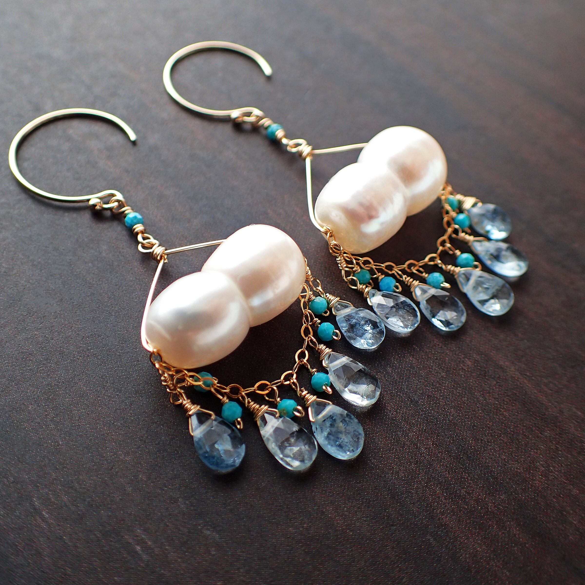 Cloud & Rain drops earrings (Twin Pearl , Aquamarine & Arizona Turquoise)