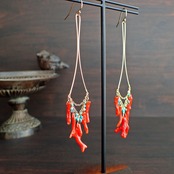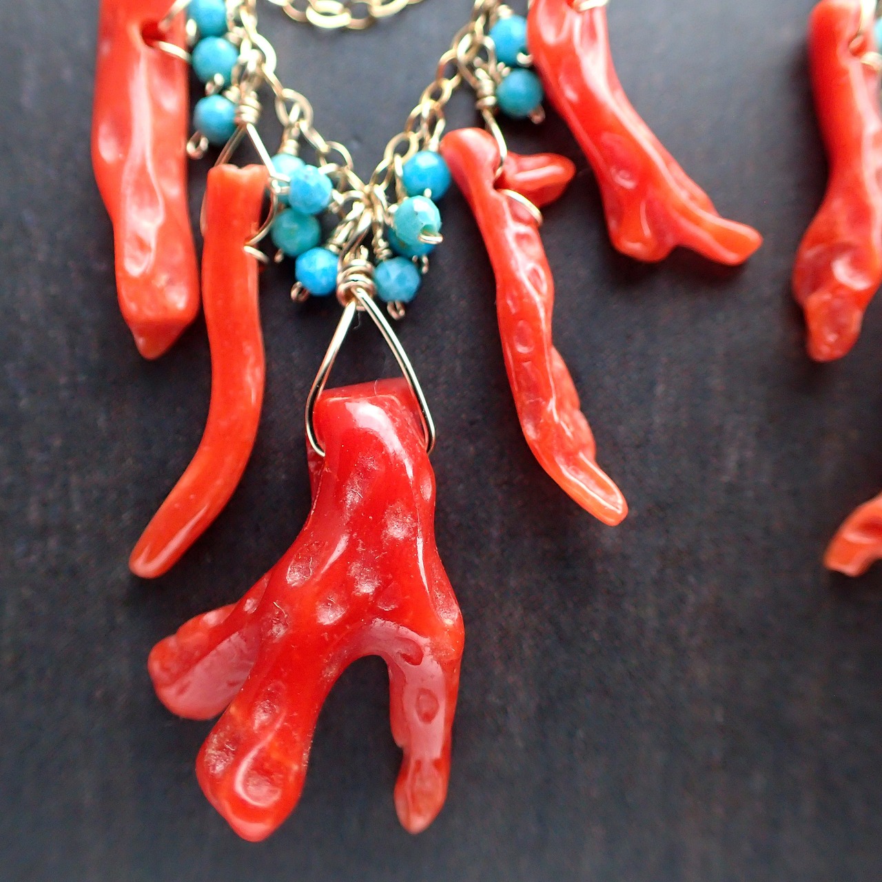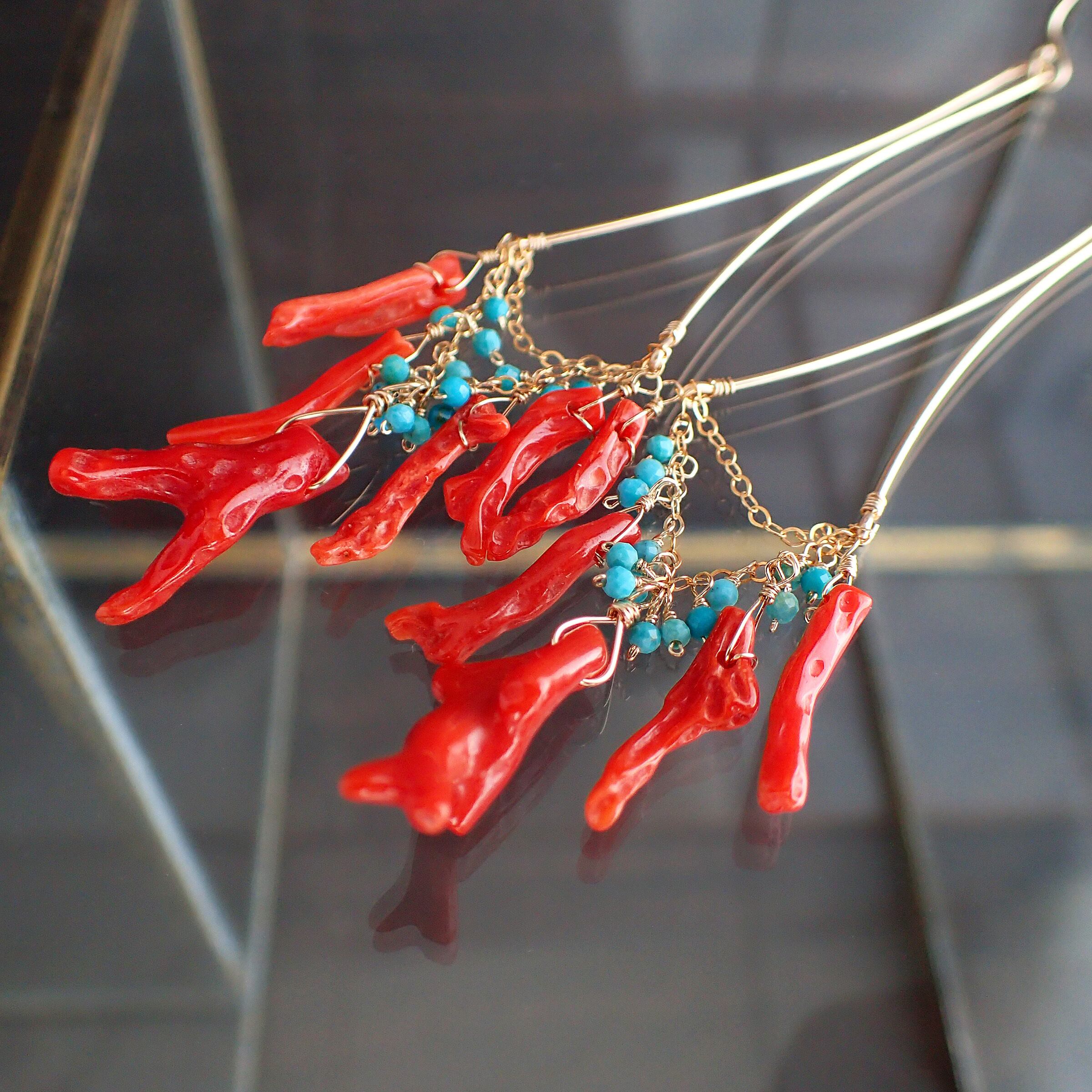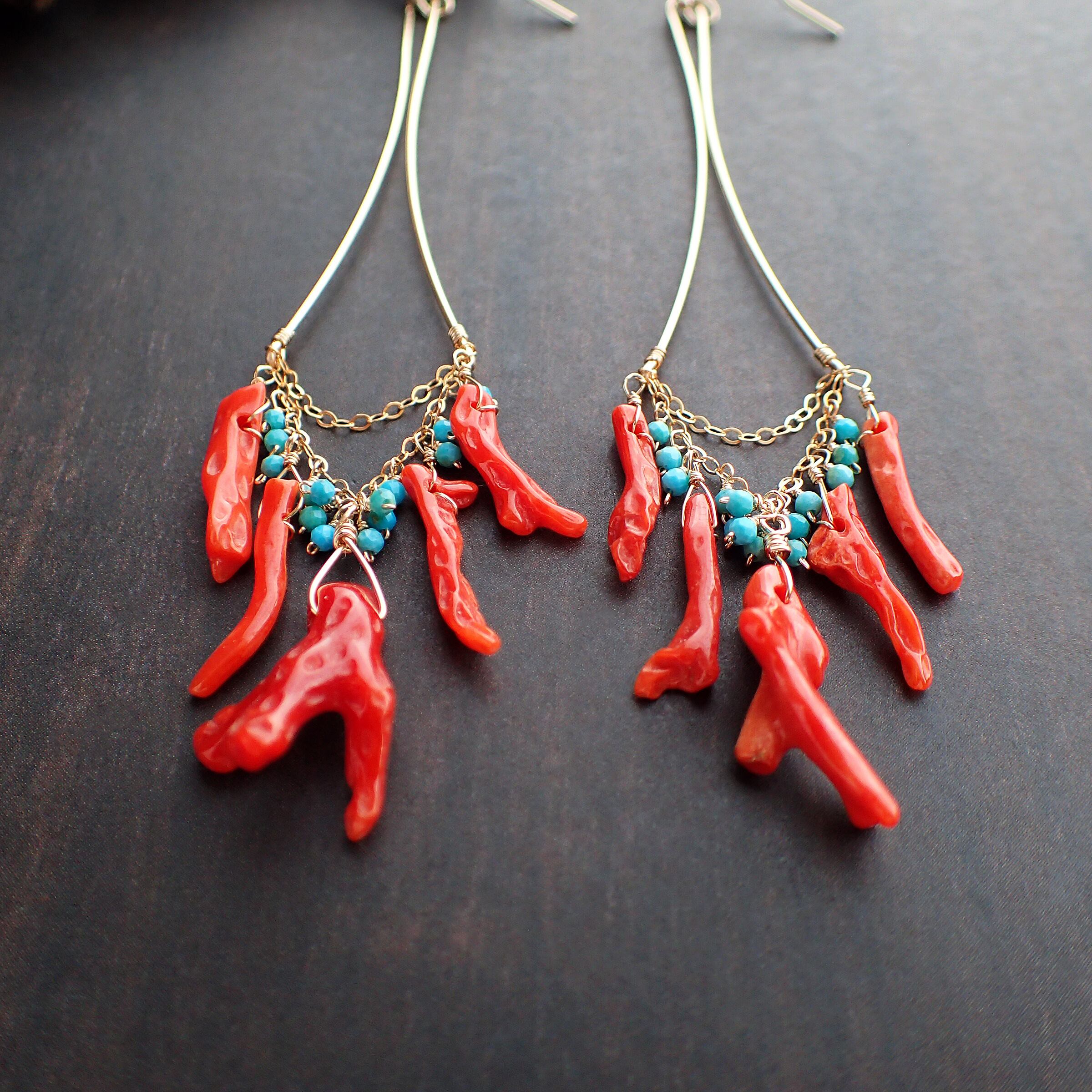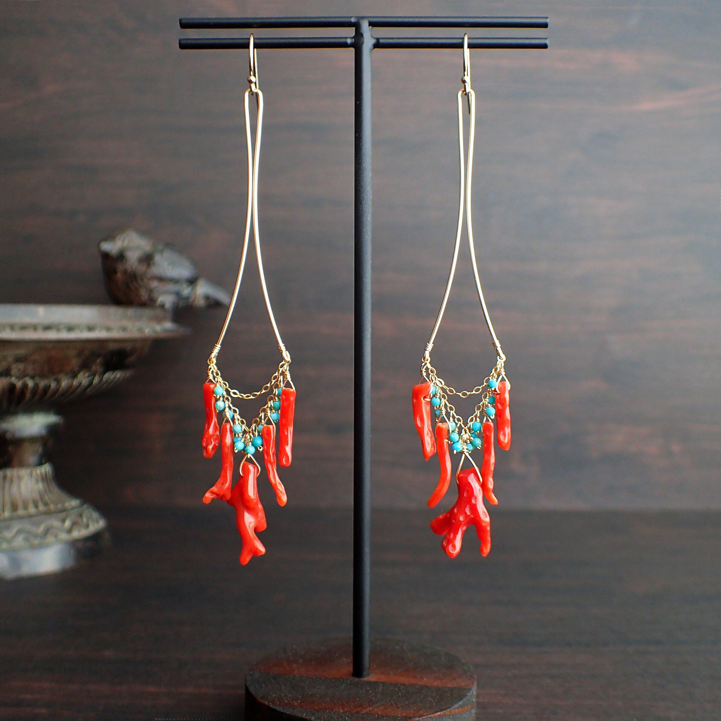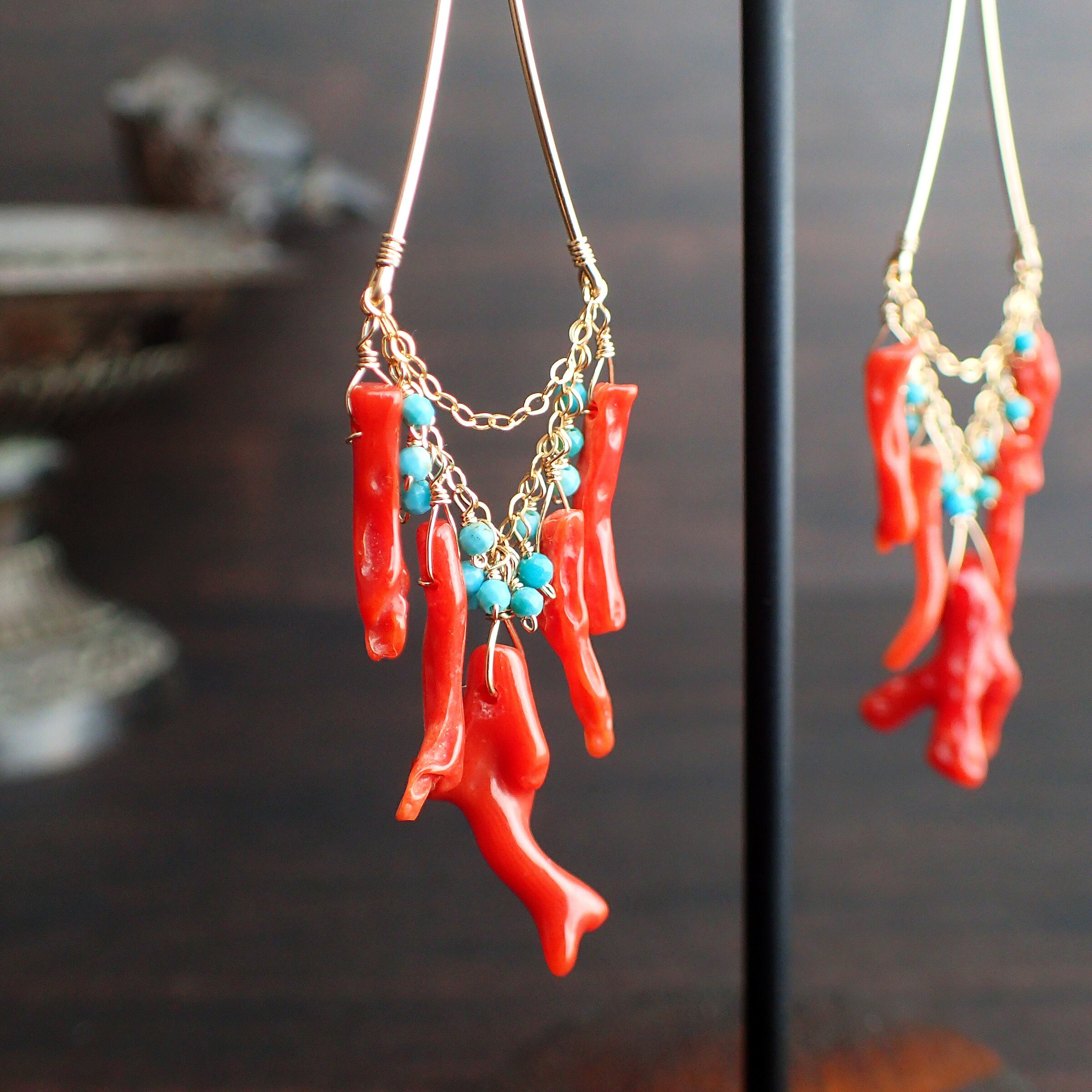 このシャンデリアピアスは、鮮やかな血色枝珊瑚と極小粒でカットの入ったトルコ石を使用した繊細で洗練されたデザインが魅力です。