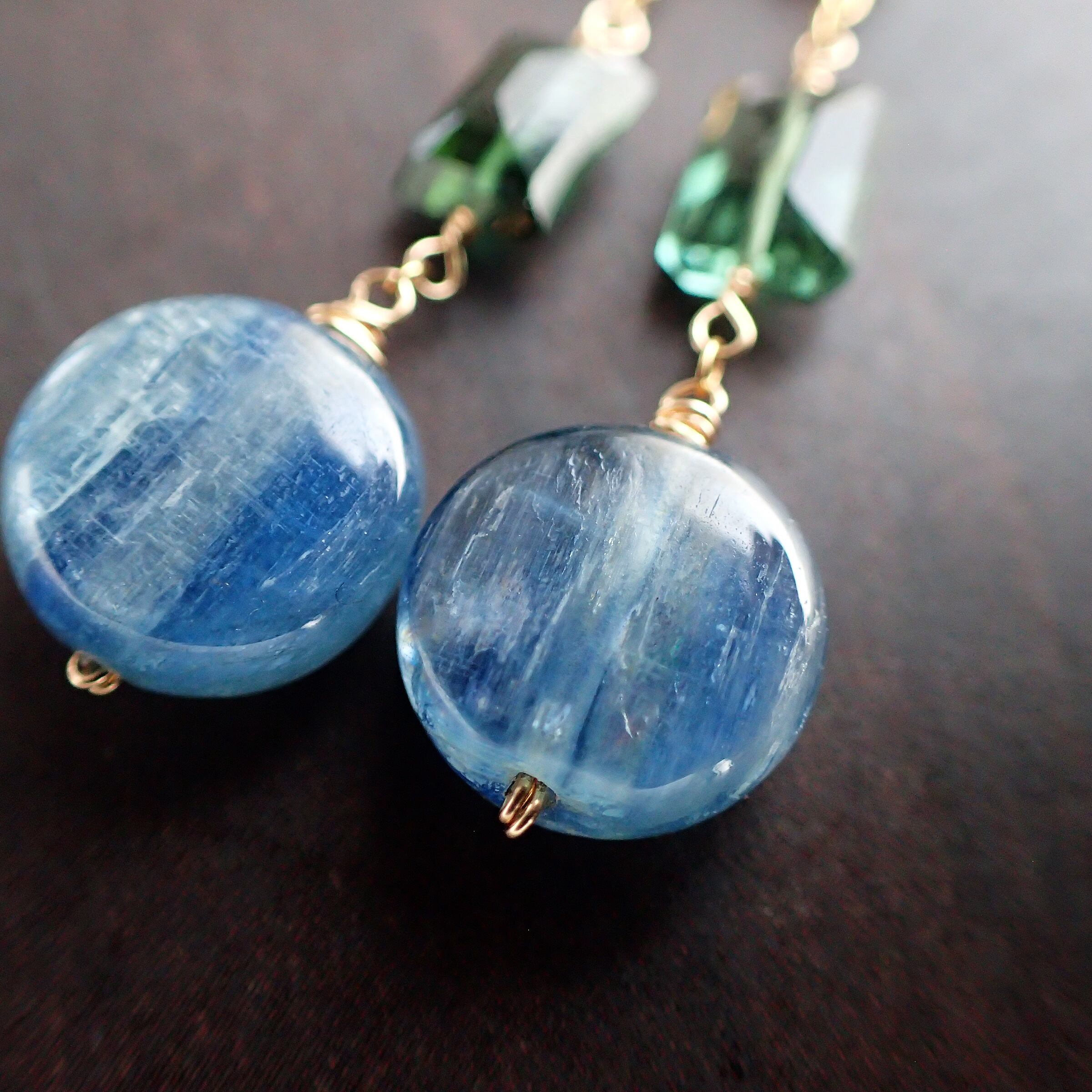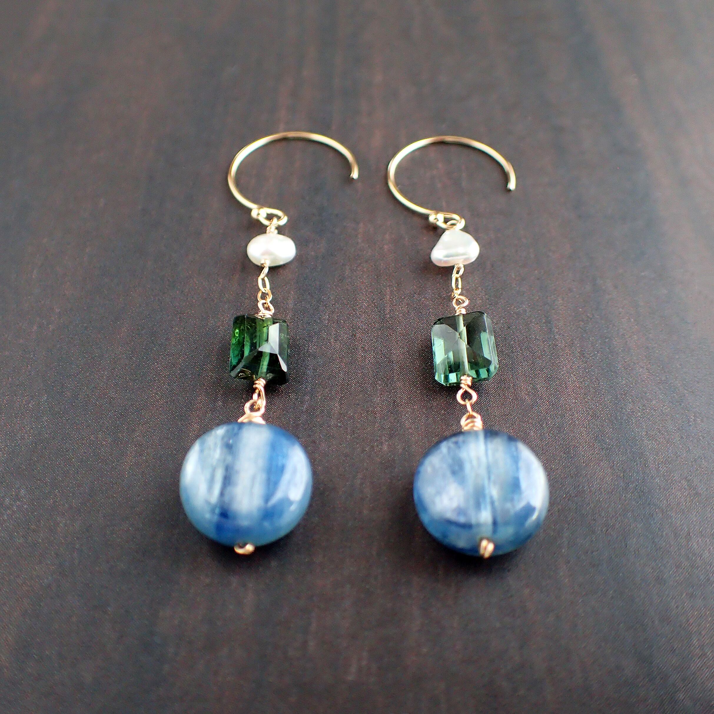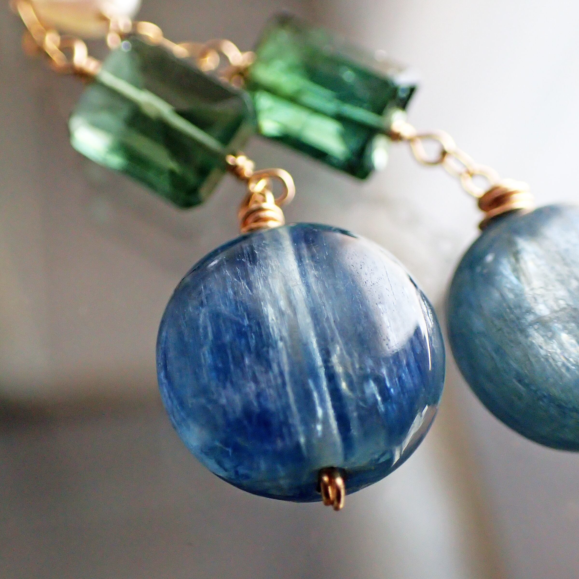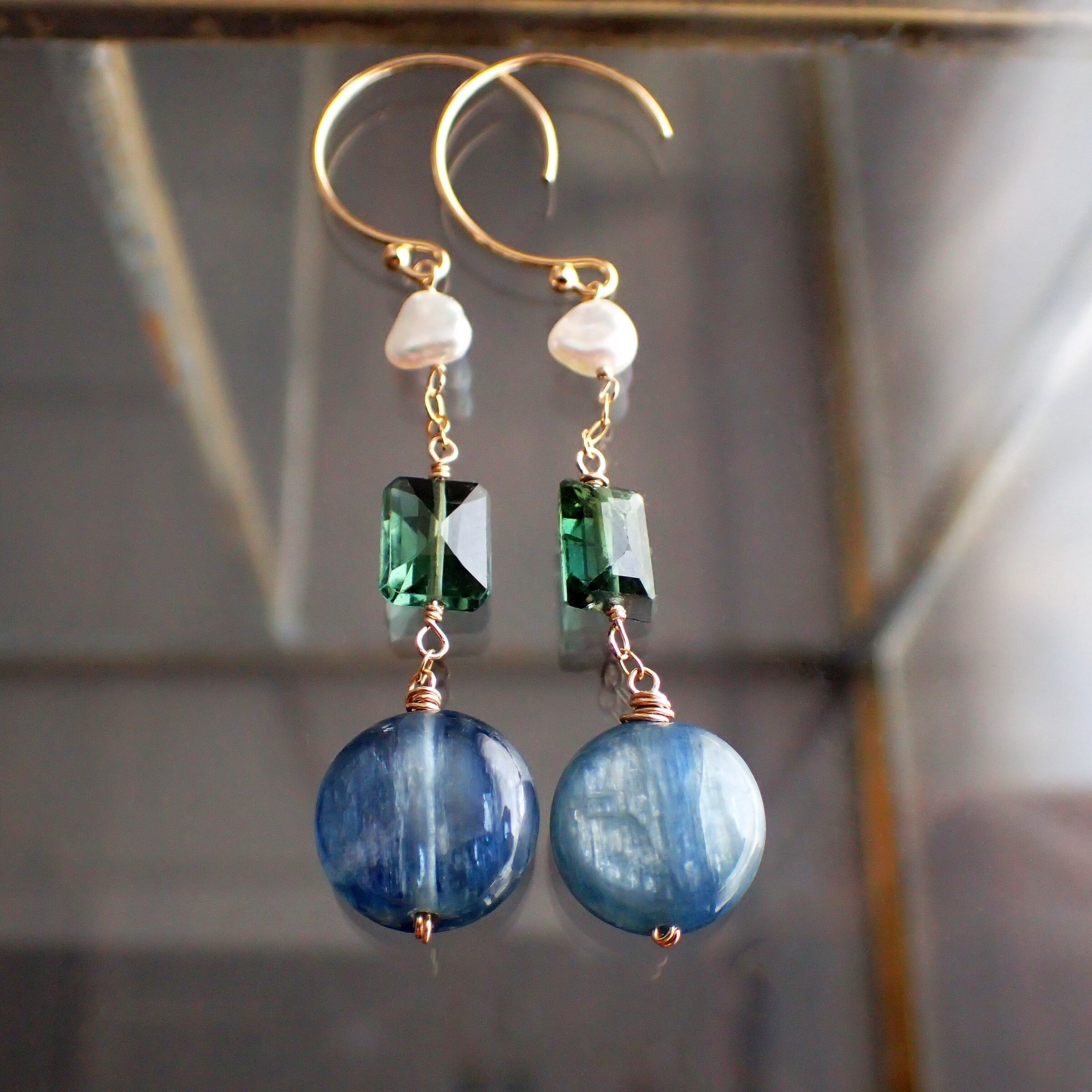 このロングピアスは、深いグリーンの美しさが際立つ上質なグリーントルマリンと、独特な艶と照りがある青色のカヤナイトを贅沢に使用したデザインが特長です。