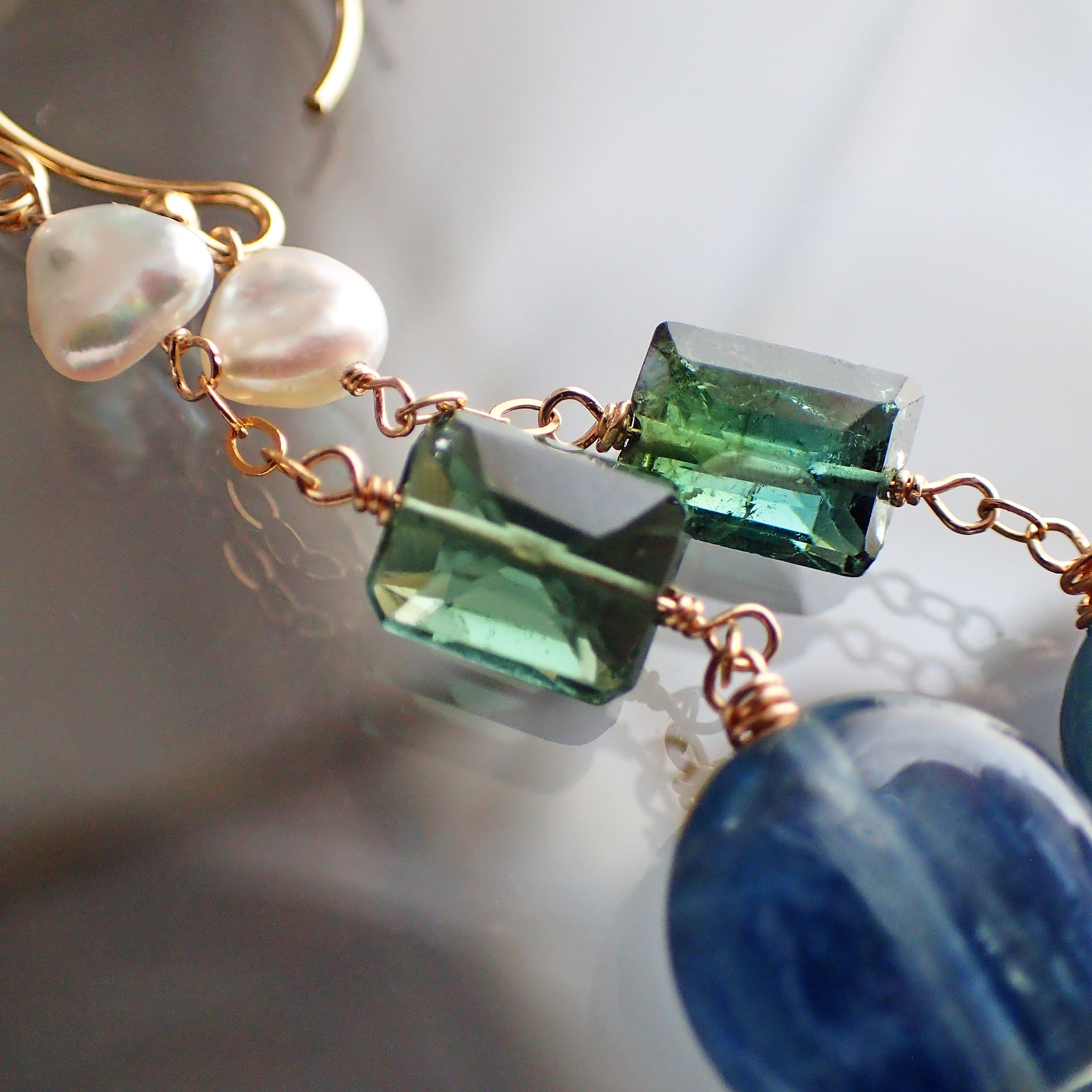 グリーントルマリンの輝きに、カヤナイトの飴細工のような艶のある青色が絶妙に調和し、さらにあこやケシパールがお顔周りに優雅なアクセントを添えます。