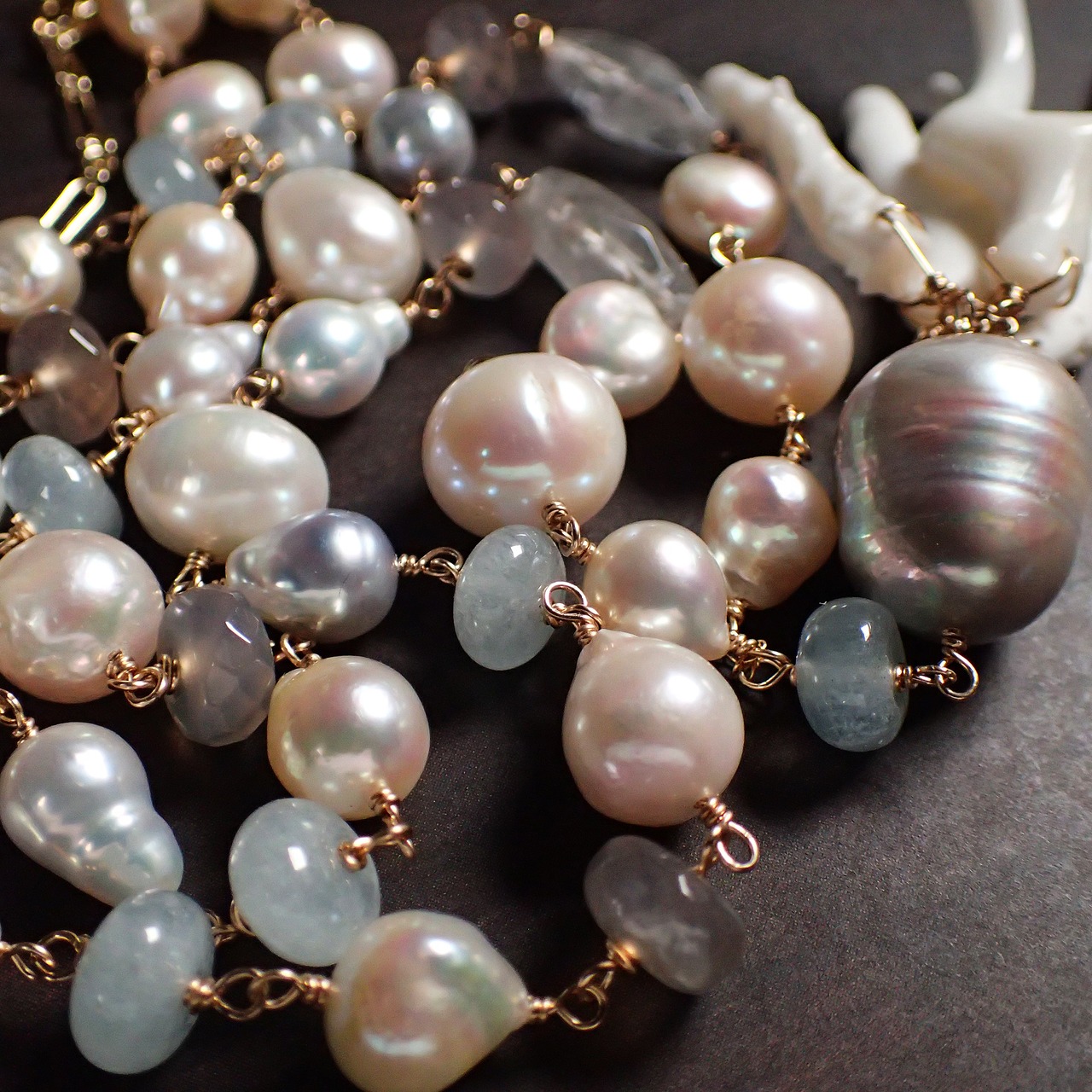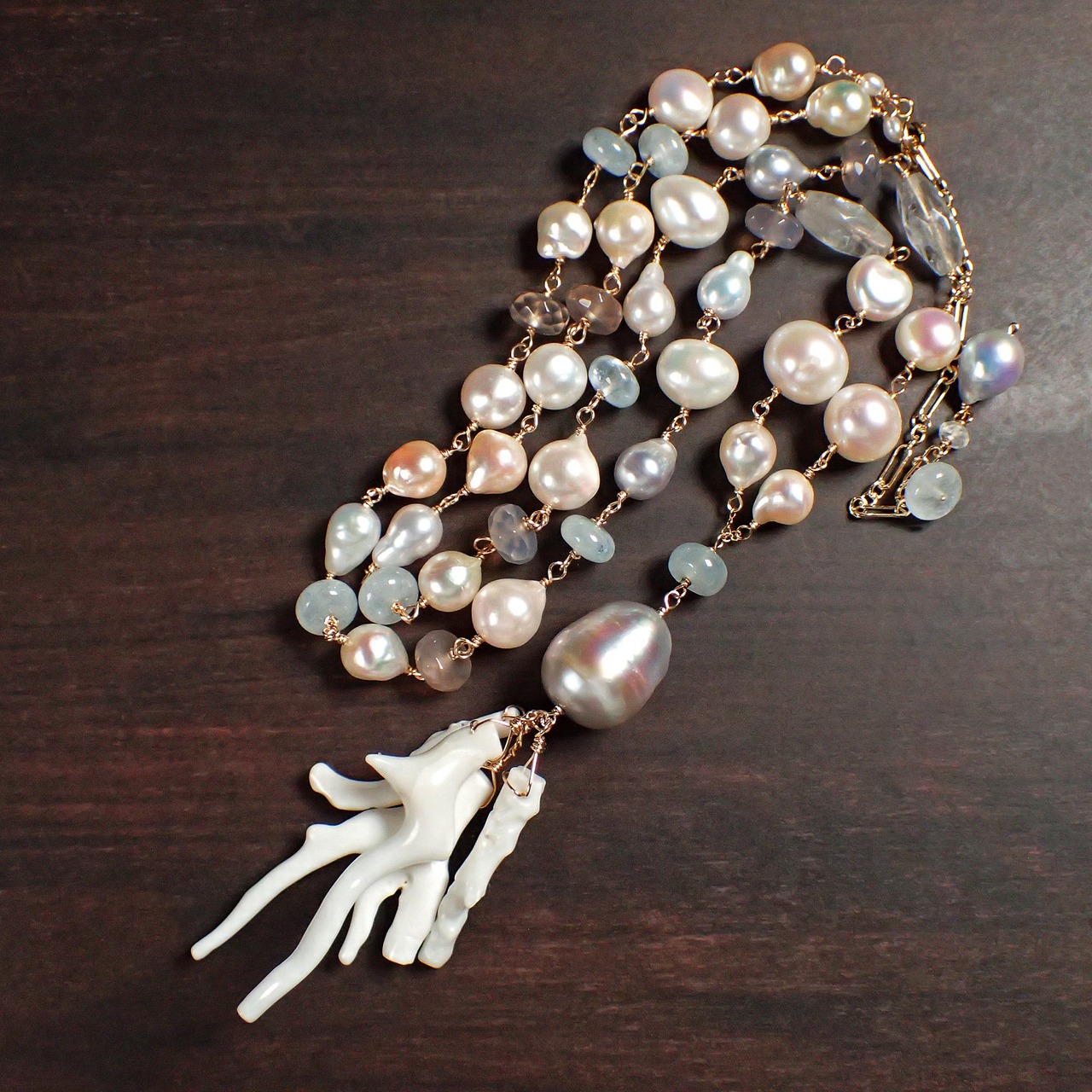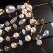 白枝珊瑚、あこやバロックパール、アクアマリン、グレーオニキス、グレークウォーツ、ムーンストーン、K14GF(チェーン・ワイヤー・パーツ全て)