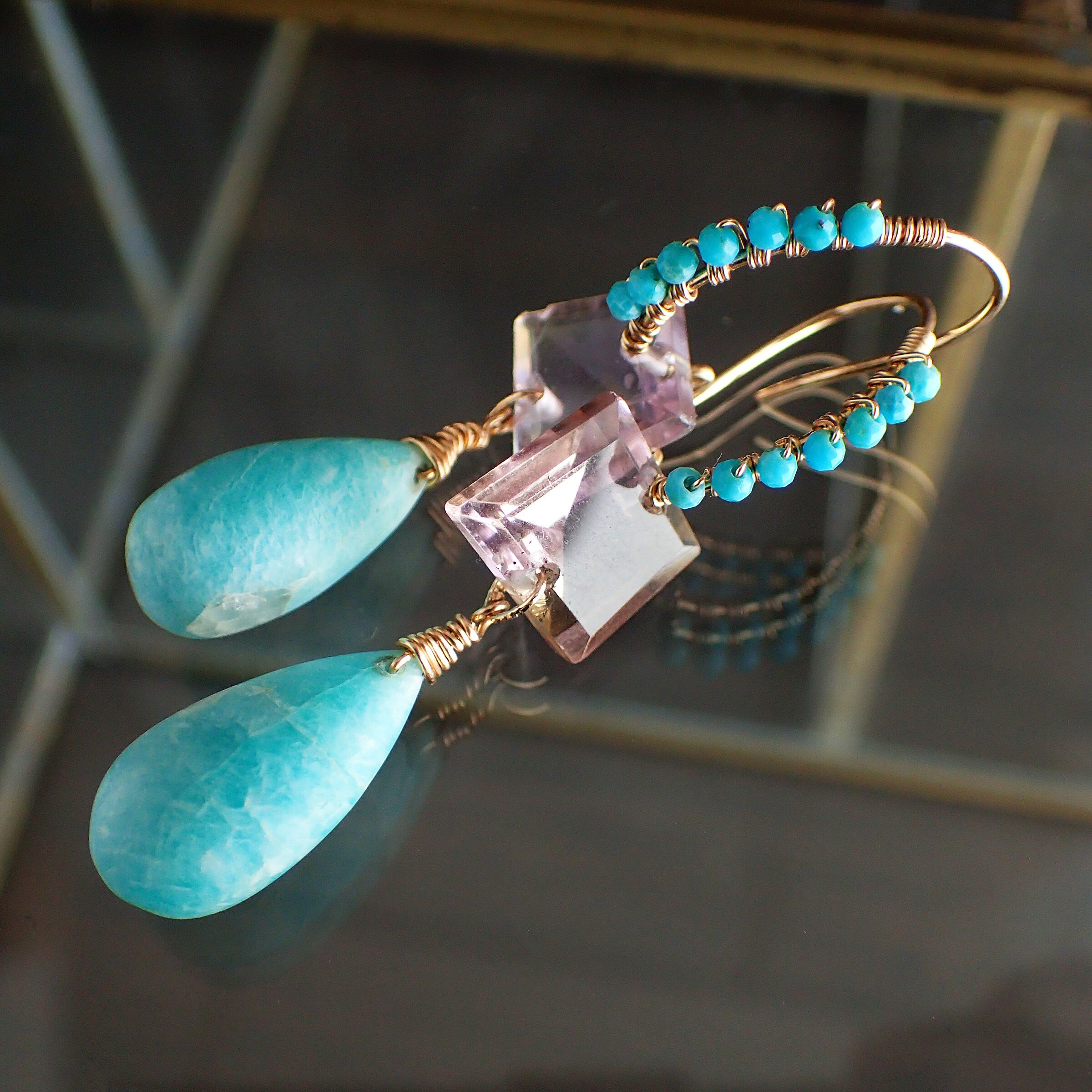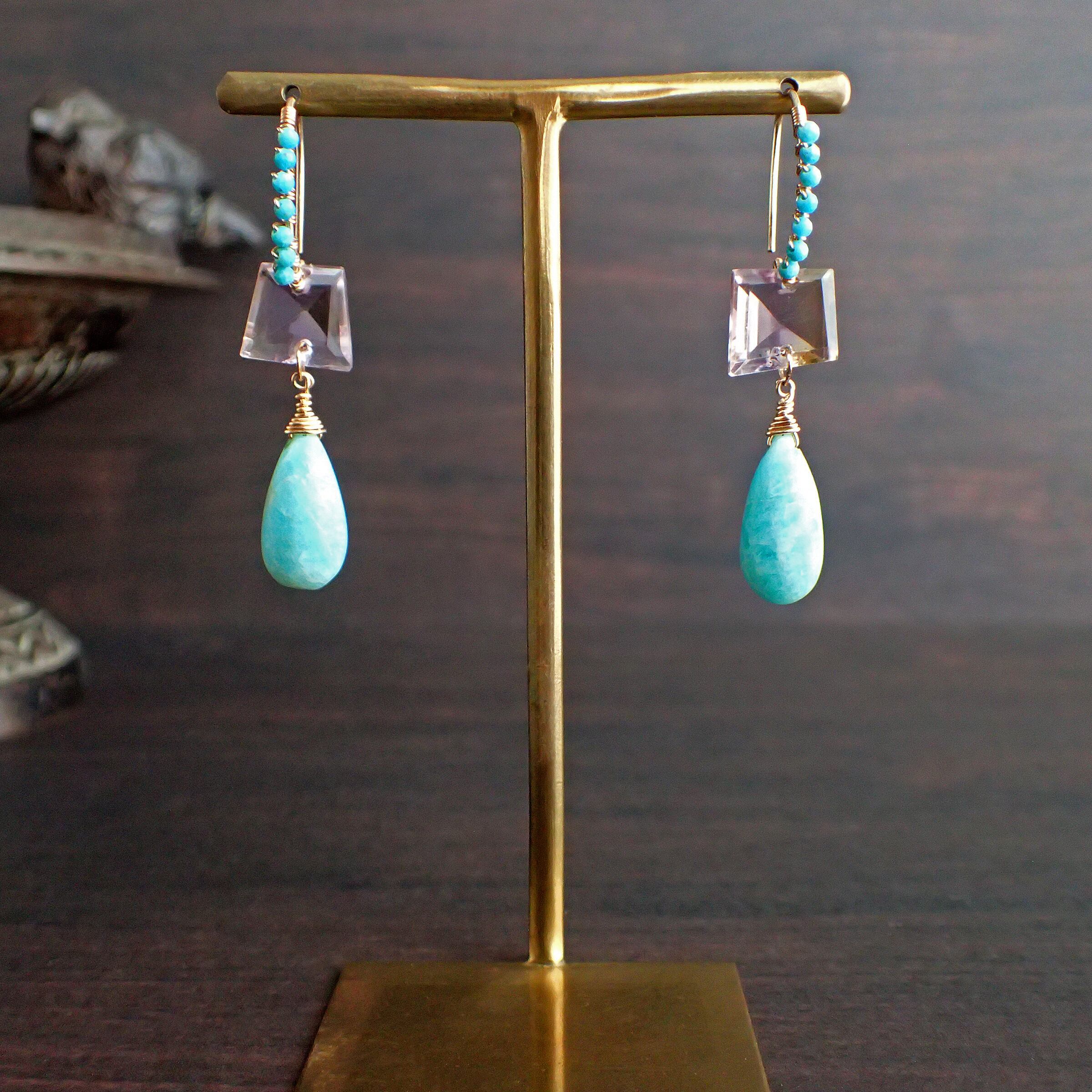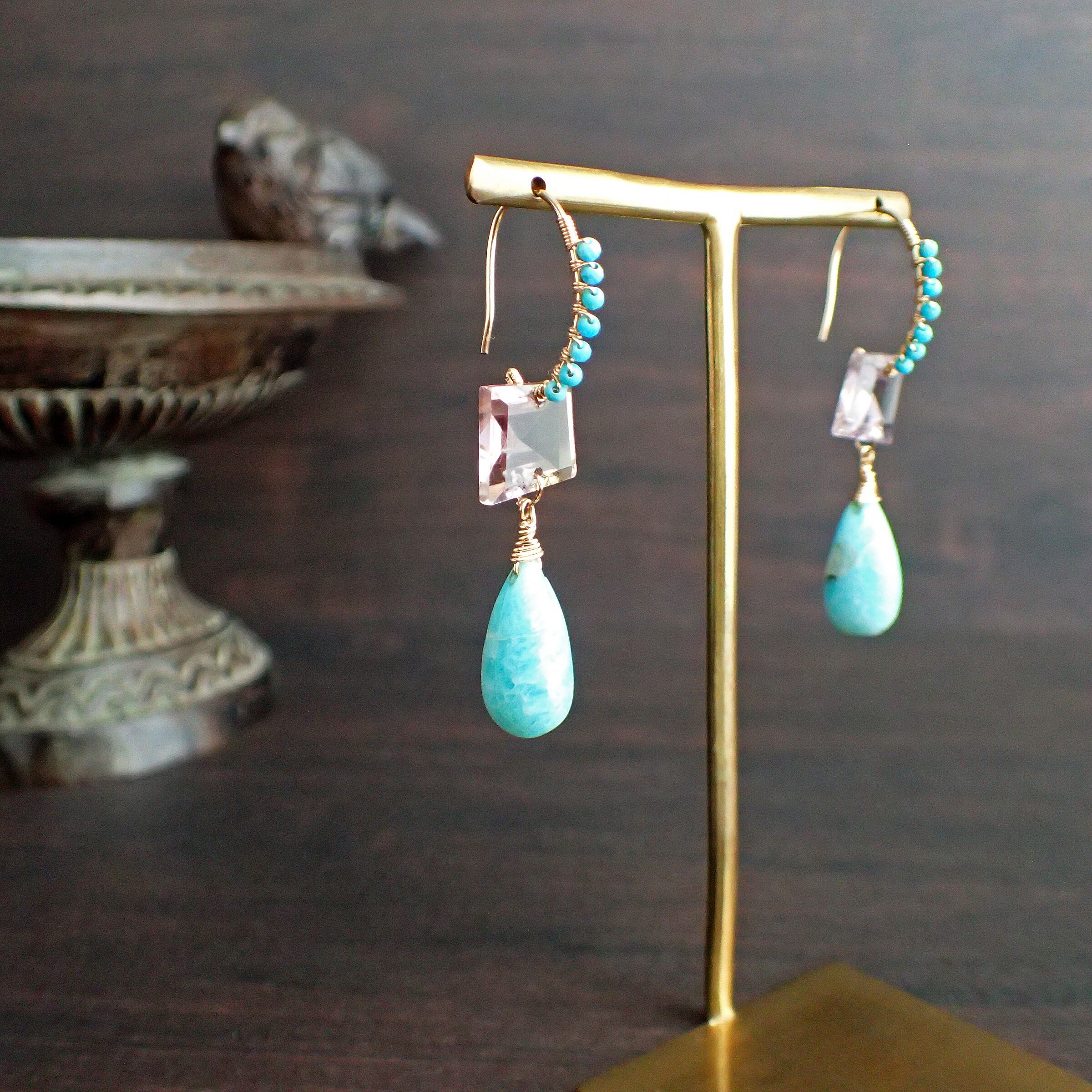 このブルーピアスは、空と海のブルーをギュッと集めたような美しいカラーのアマゾナイトとトルコ石、アメトリンを贅沢に使用した、魅力溢れるデザインが特長です。