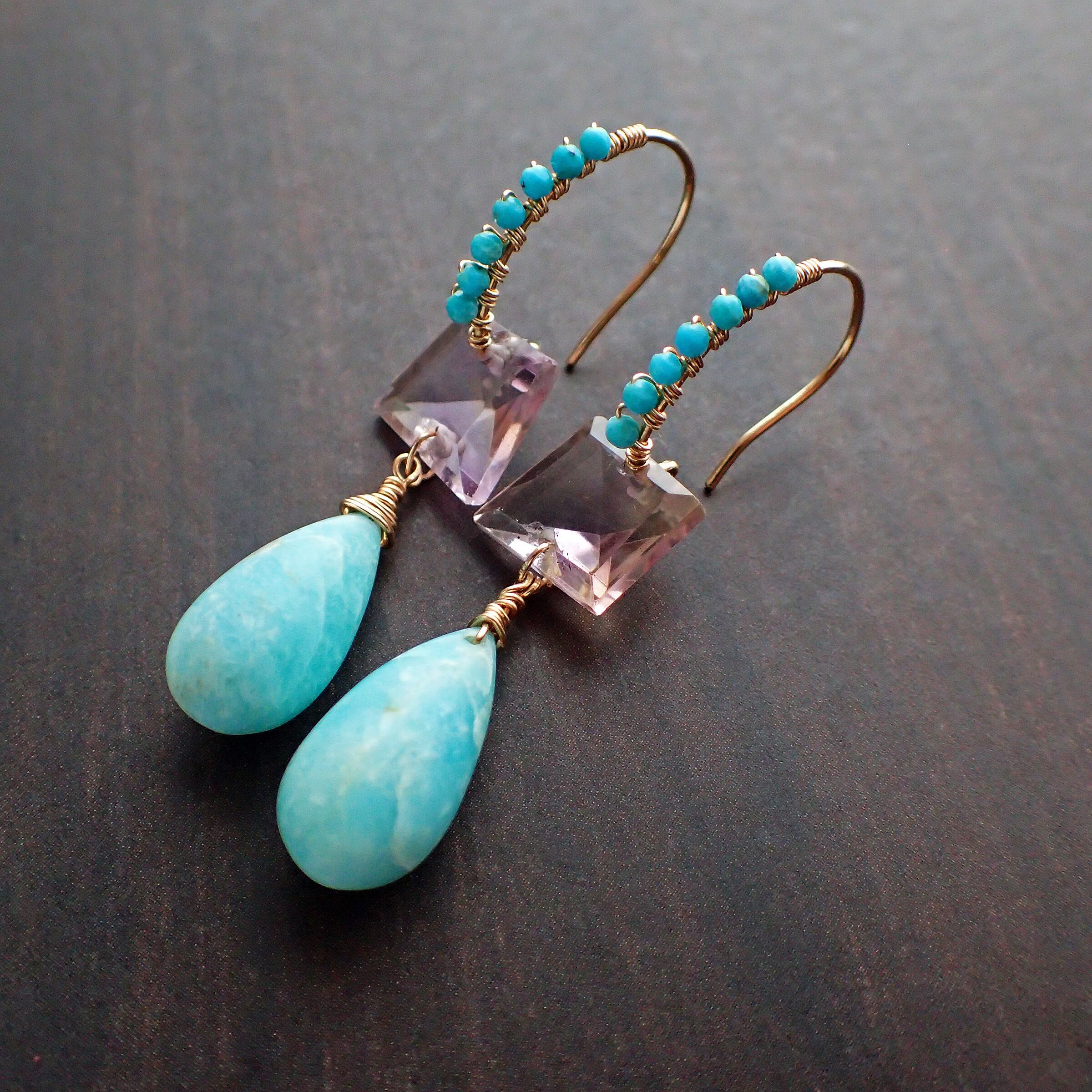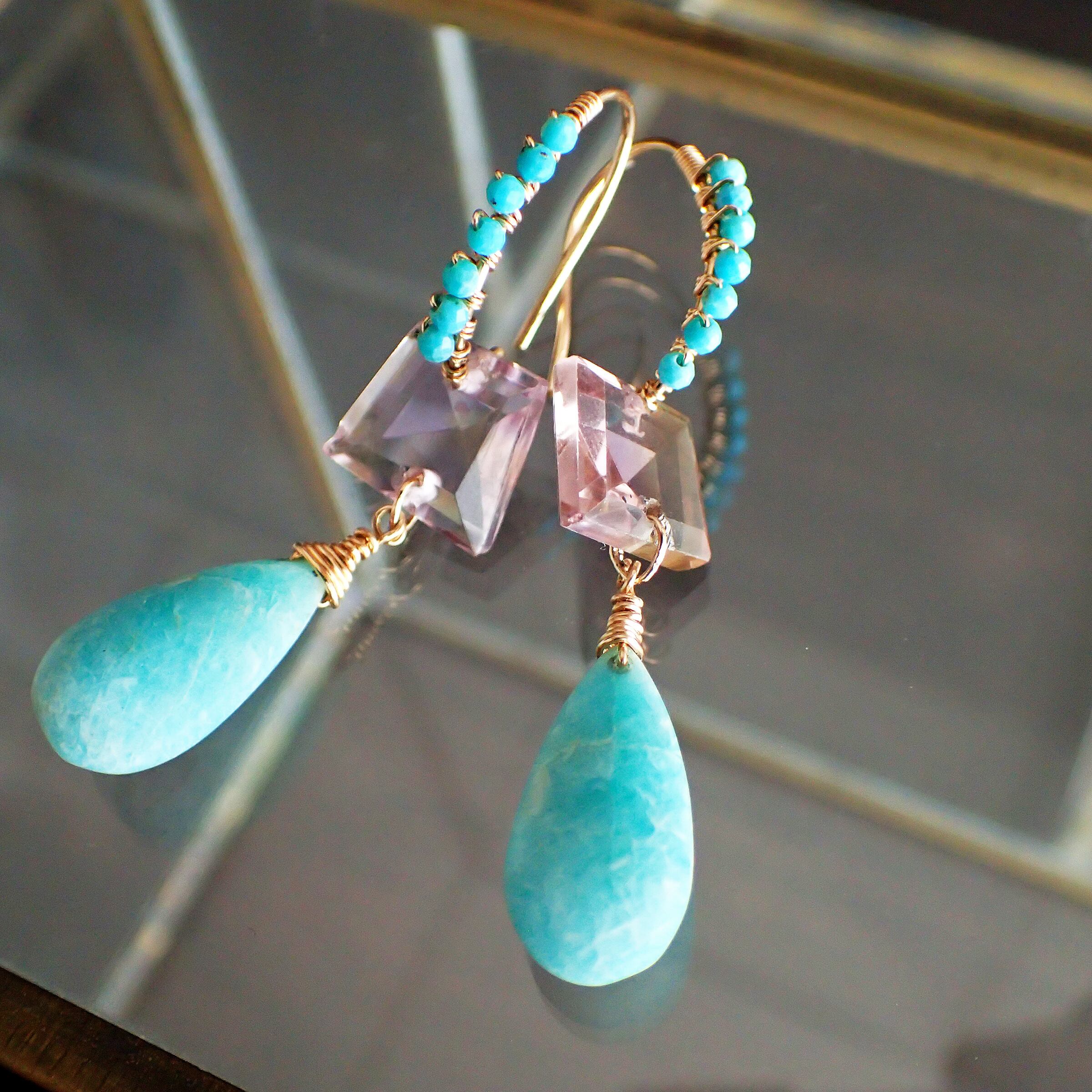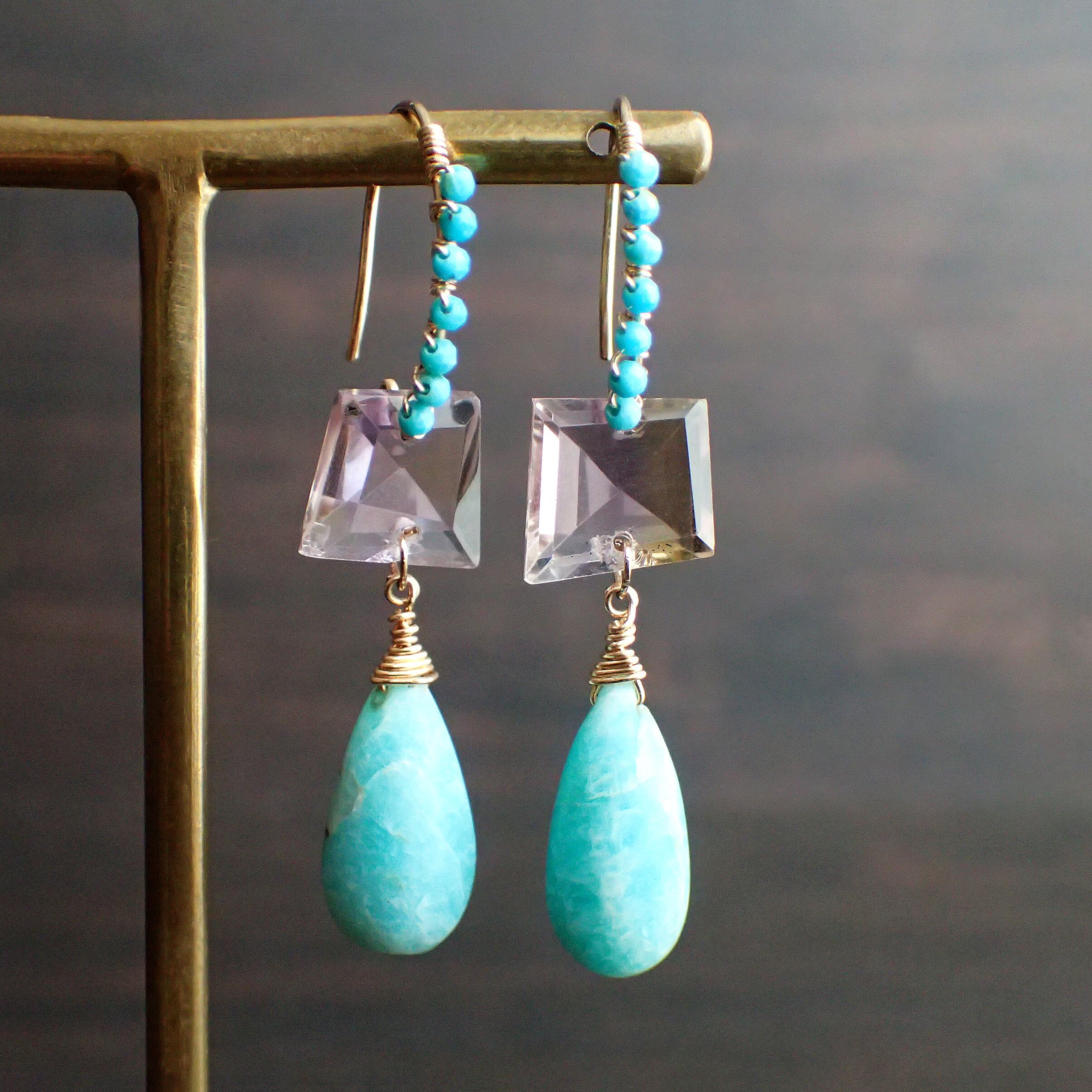 このブルーピアスは、空と海のブルーをギュッと集めたような美しいカラーのアマゾナイトとトルコ石、アメトリンを贅沢に使用した、魅力溢れるデザインが特長です。