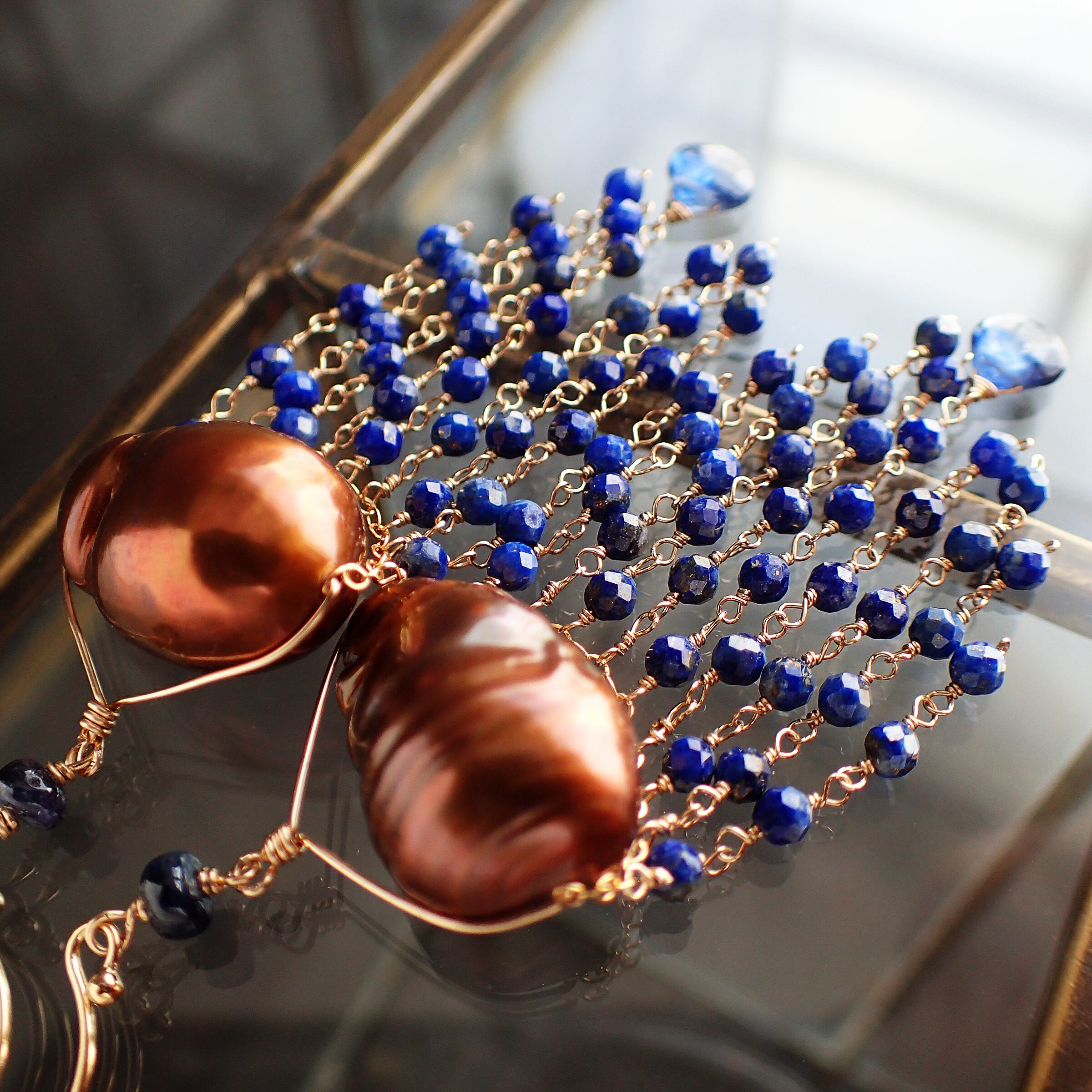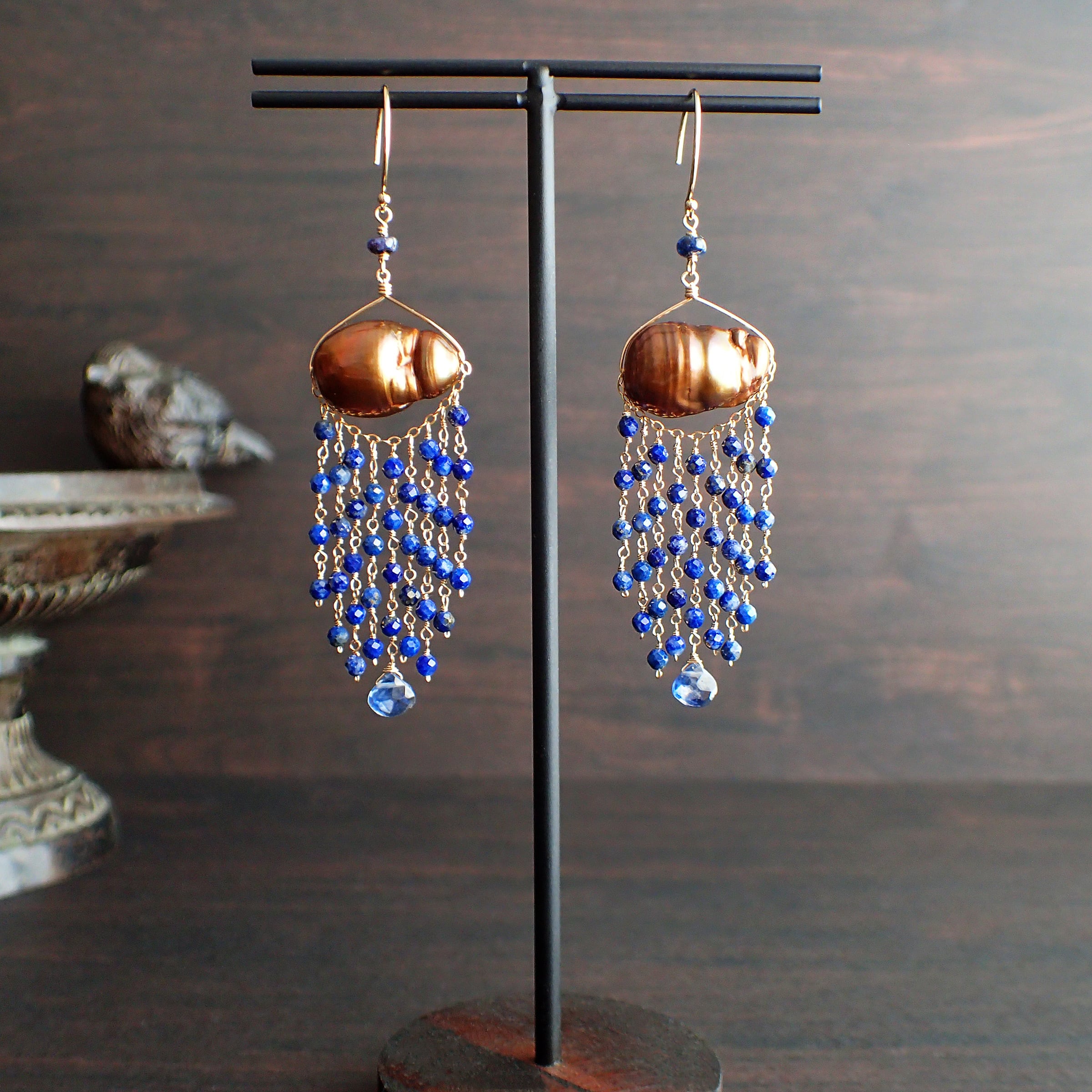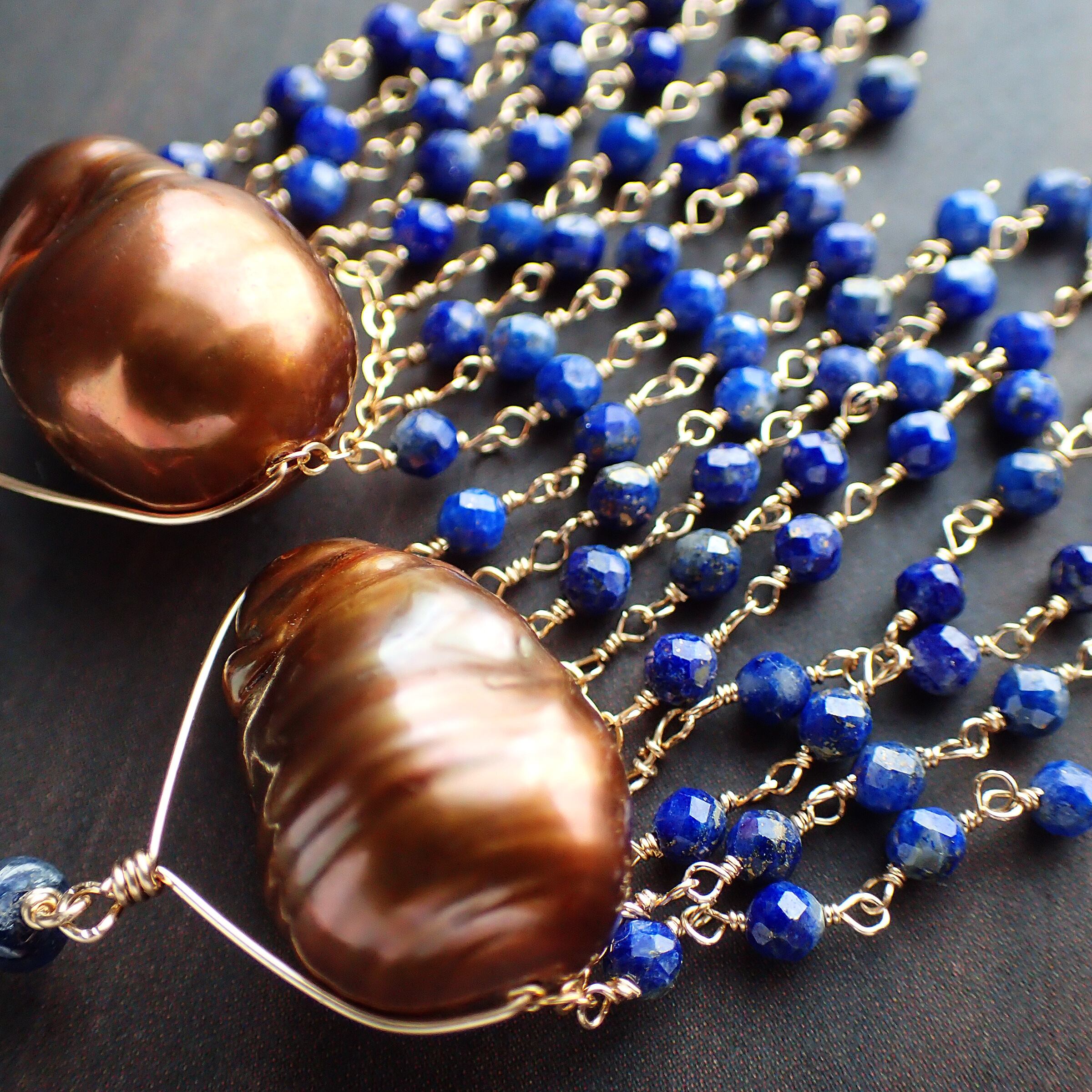 このシャンデリアピアスは、ブラウンカラーのバロックパールとラピスラズリの美しいコントラストが特長で、異国情緒あふれるデザインが魅力です。