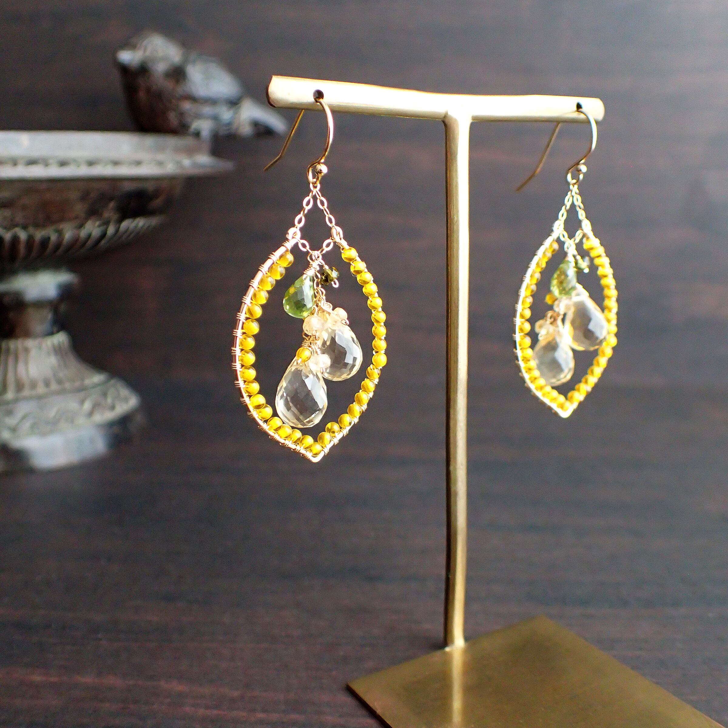 このレモンをイメージしたピアスは、シトリンとペリドット、インペリアルトパーズ、グリーントルマリンの鮮やかな色合いが際立つ、エネルギッシュで魅力的なデザインが特長です。