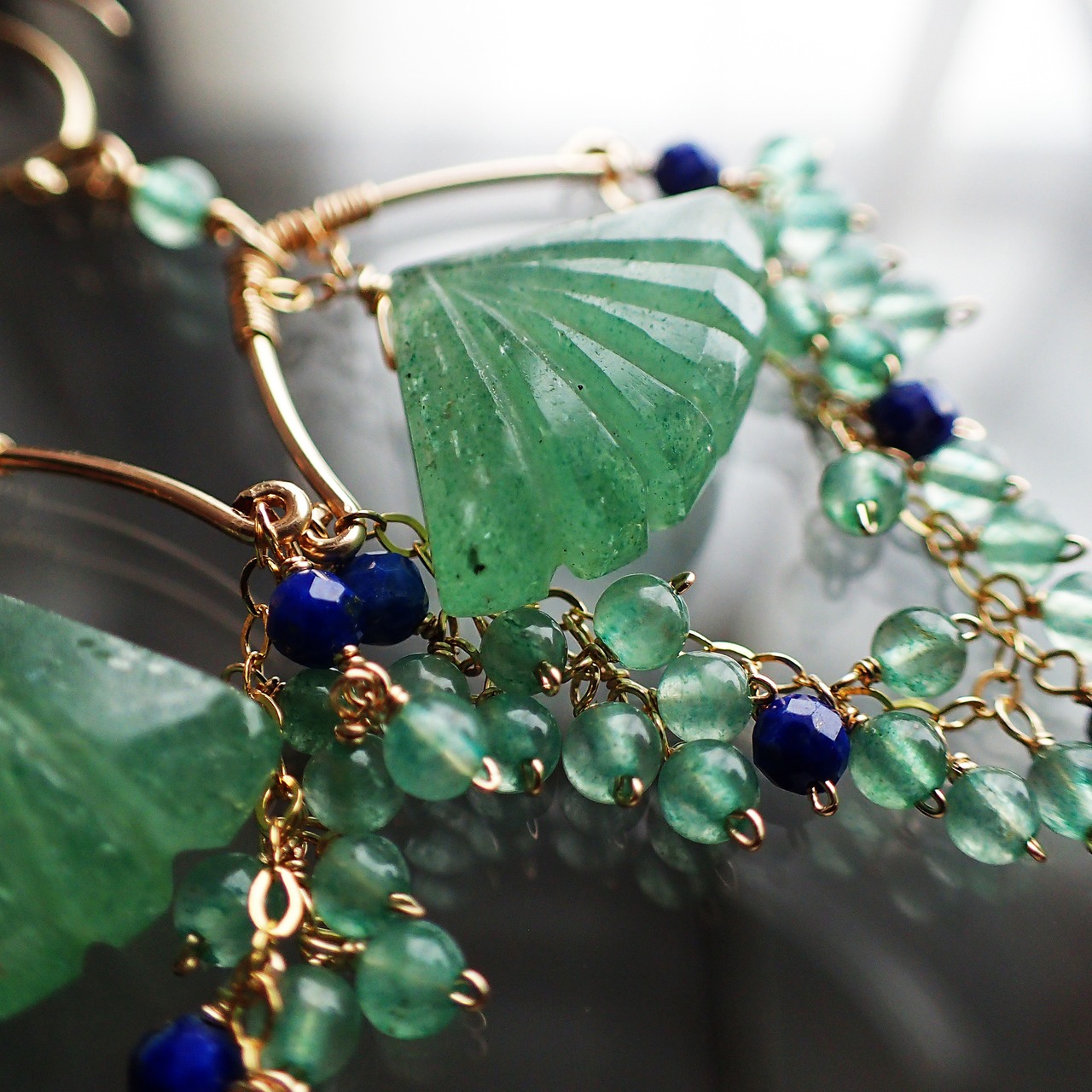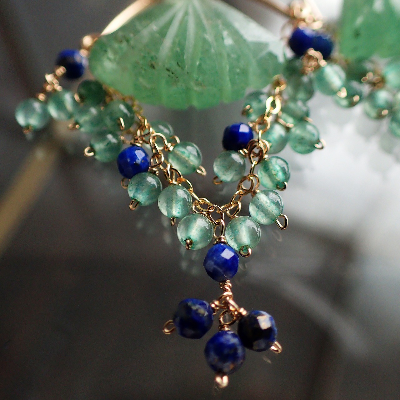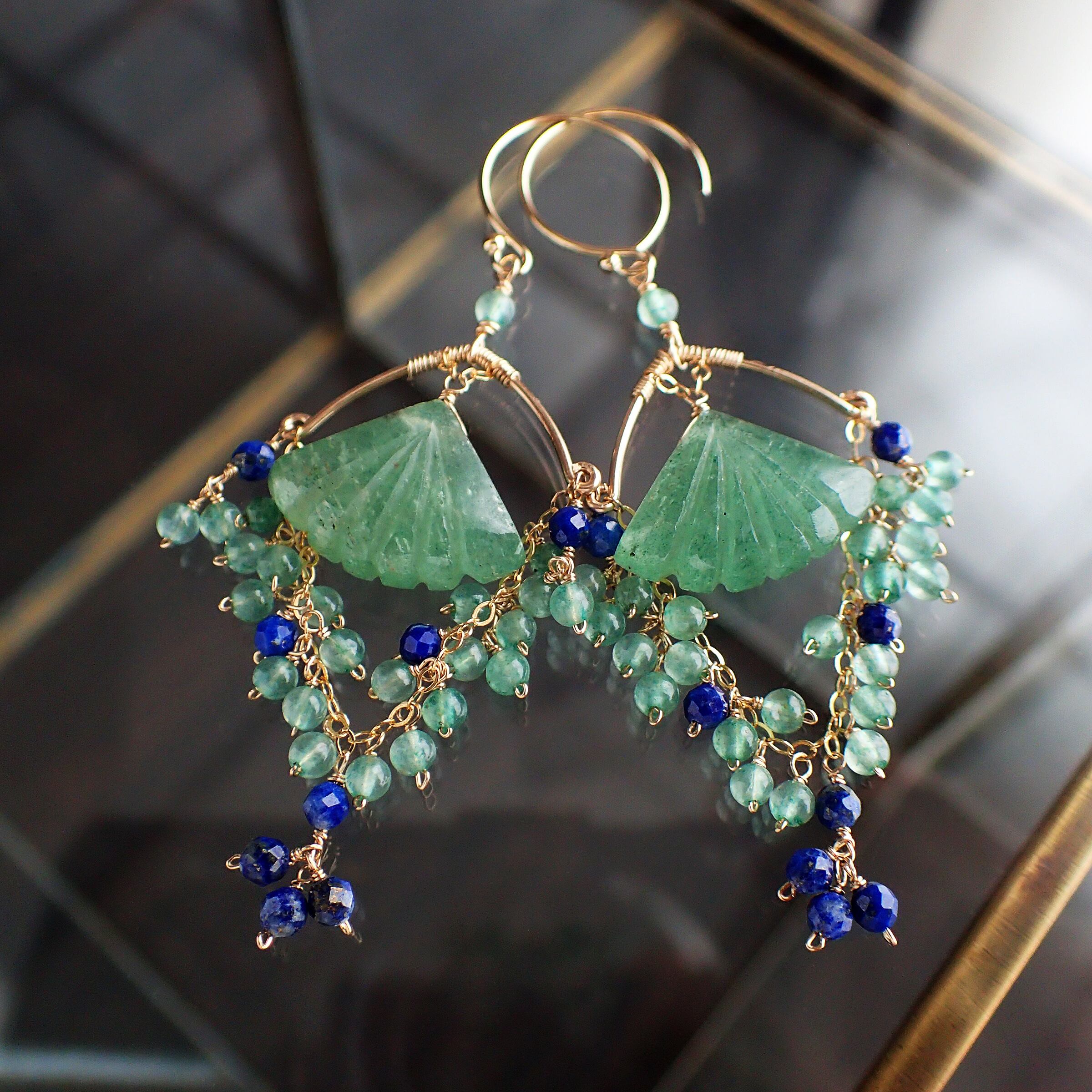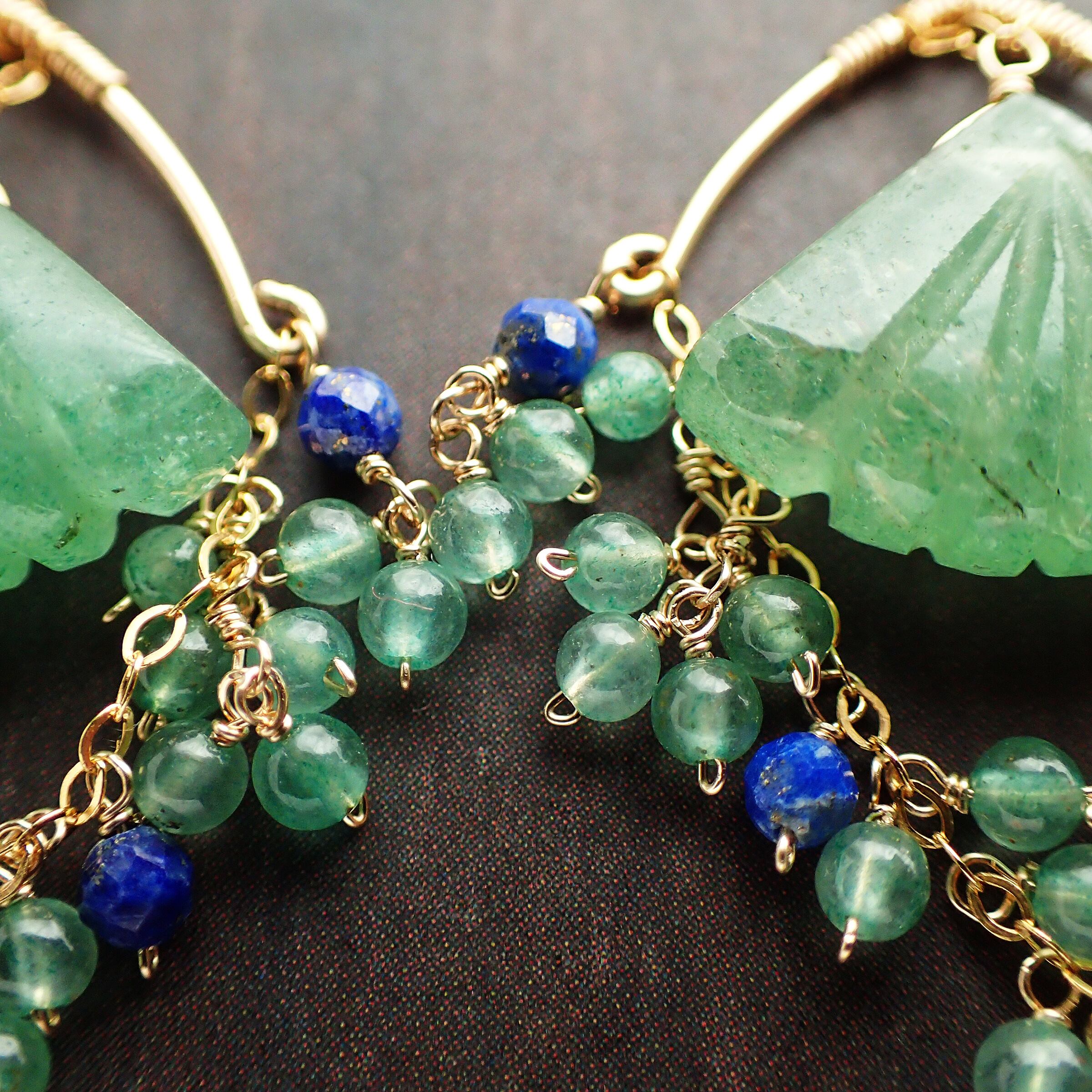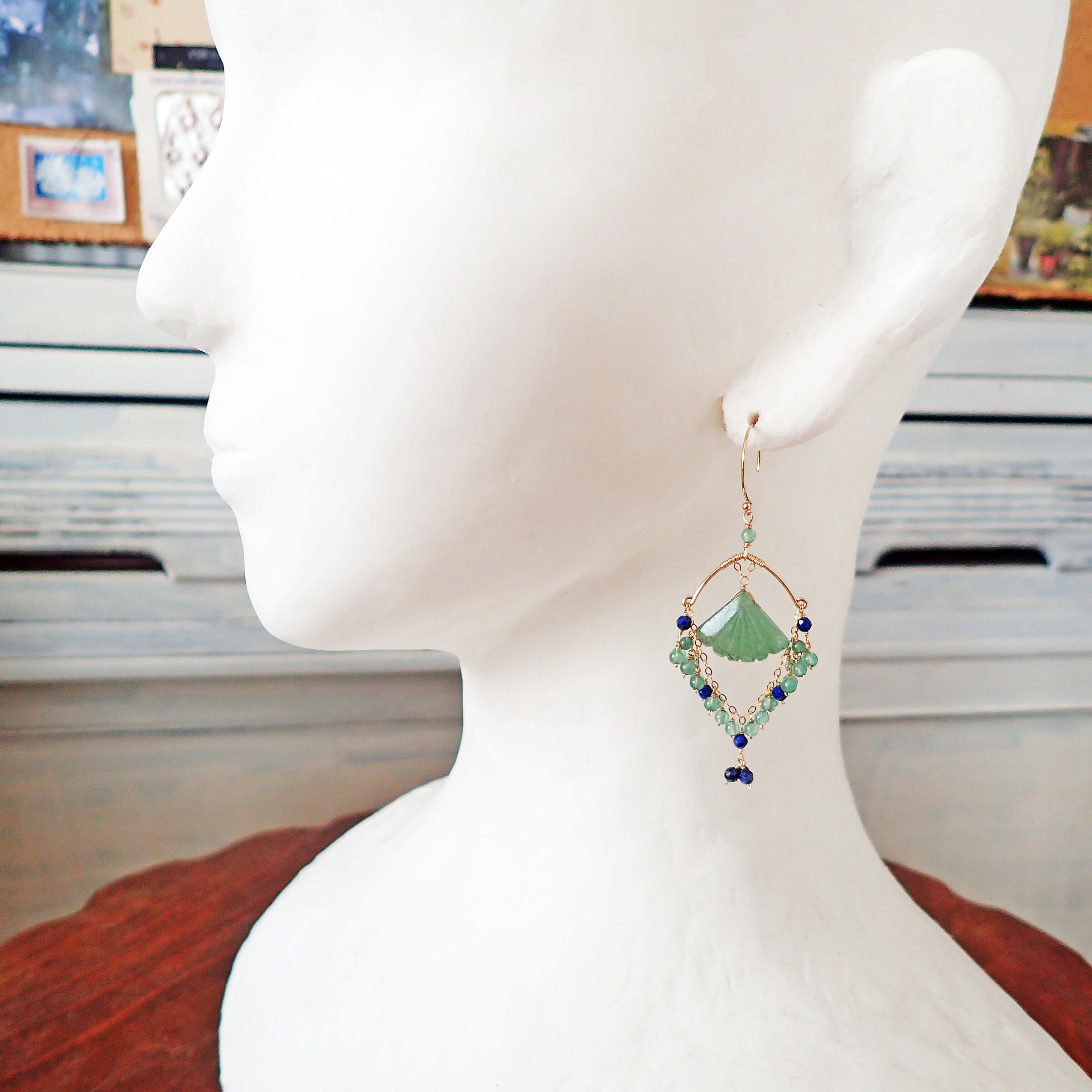 この異国の地に想いをはせるシャンデリアピアスは、グリーンアベチュリンとラピスラズリが織りなす美しい色合いが特長で、エレガントさと神秘的な印象を与えるデザインが魅力です。