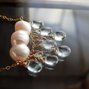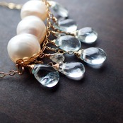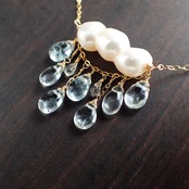 このネックレスは、しずく型のアクアマリンと三つ子パールを使用した、幻想的なデザインが特長です。