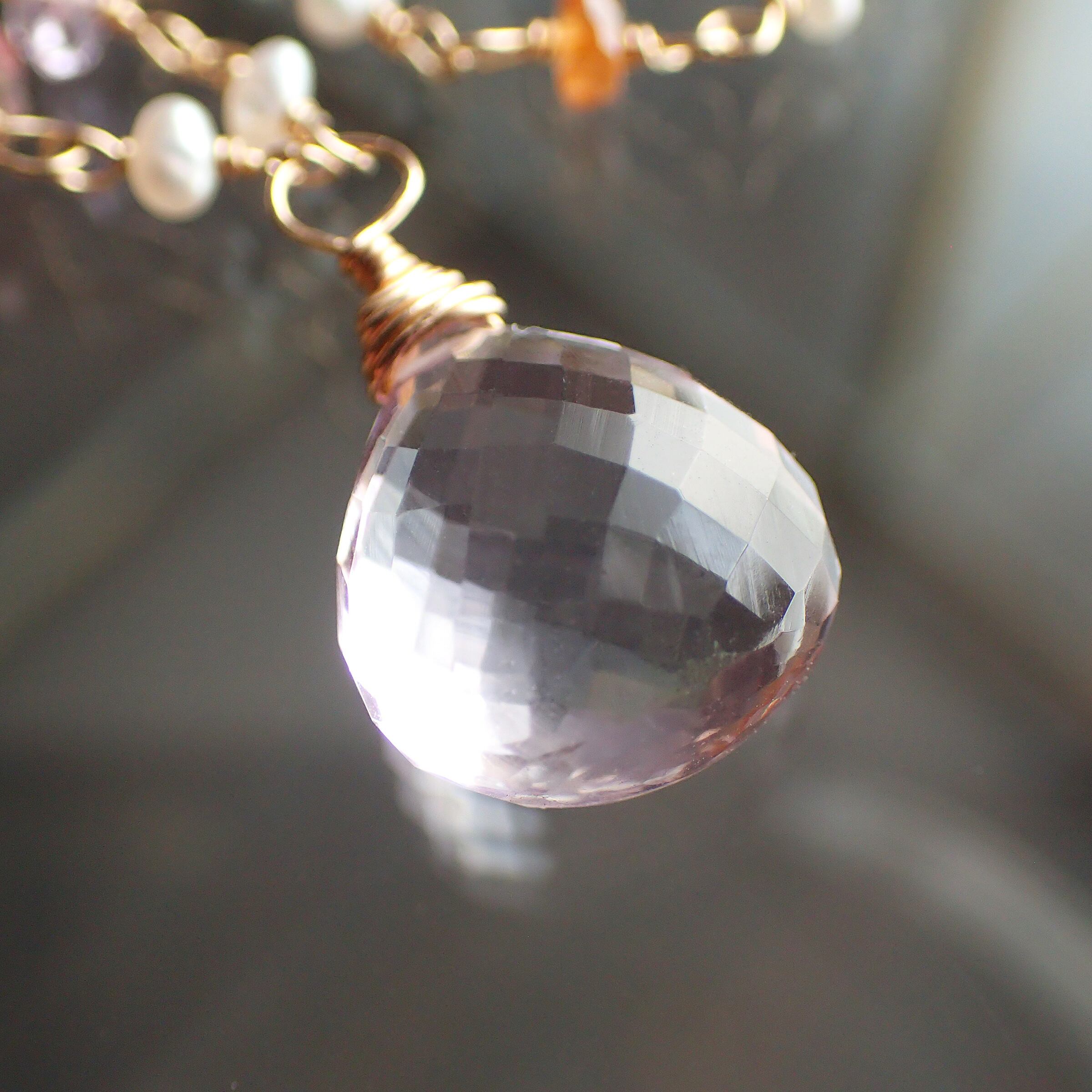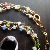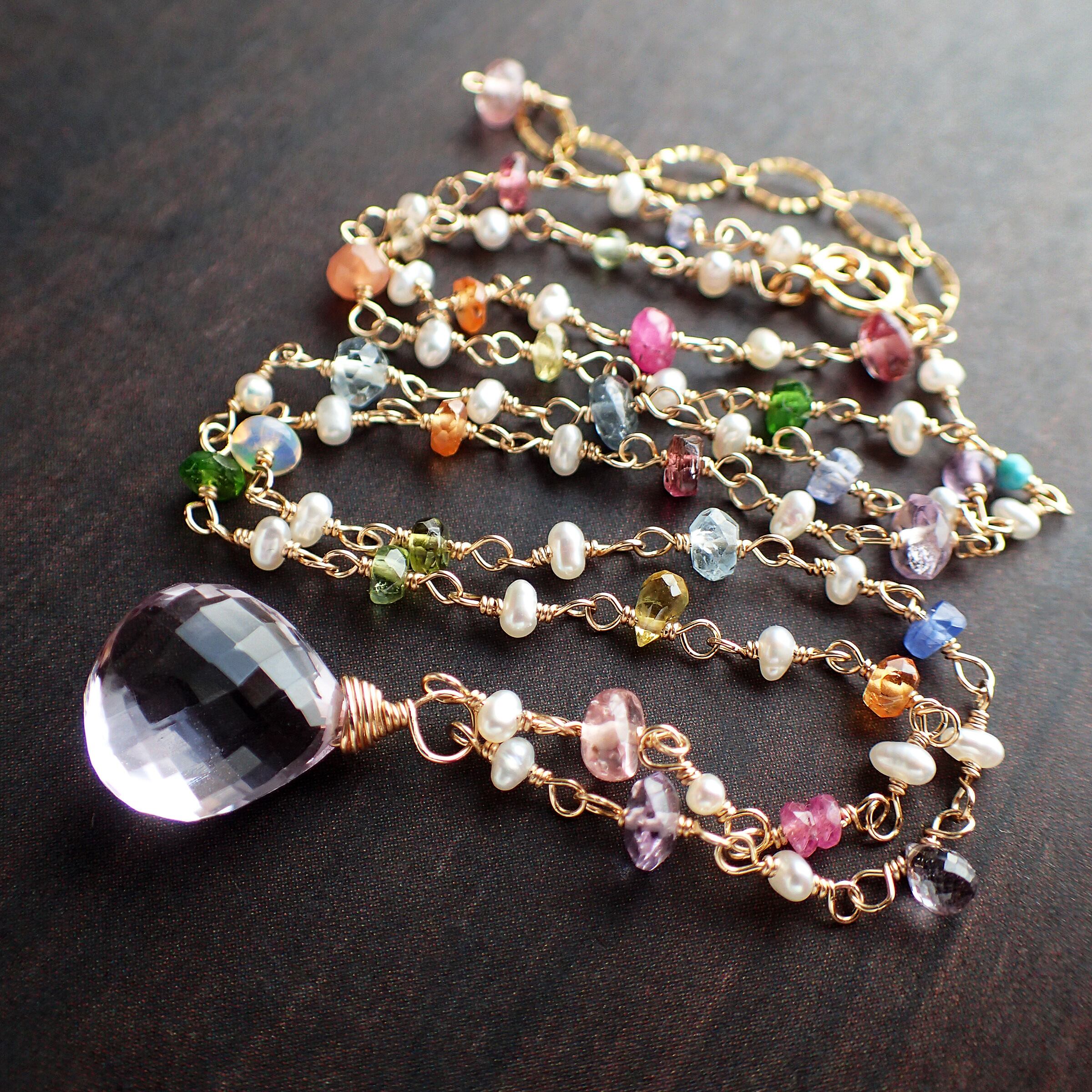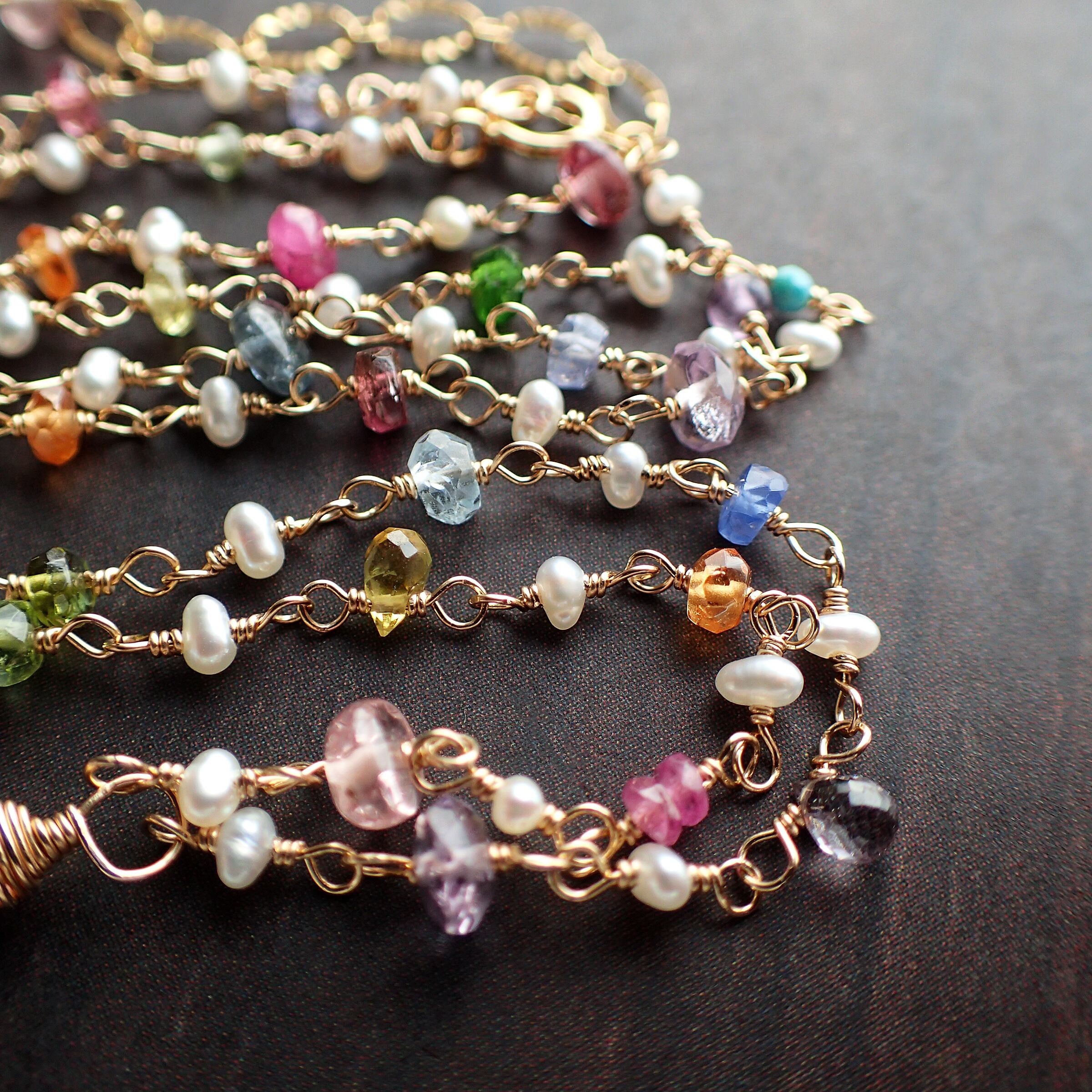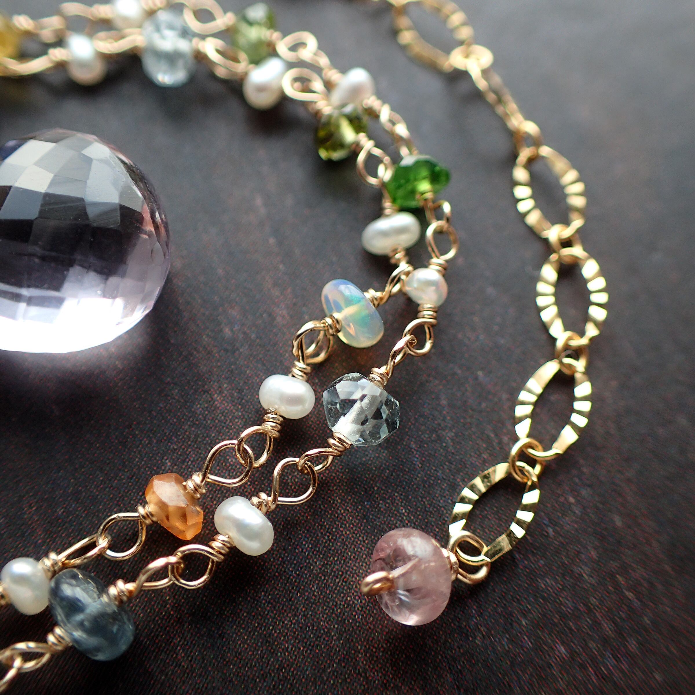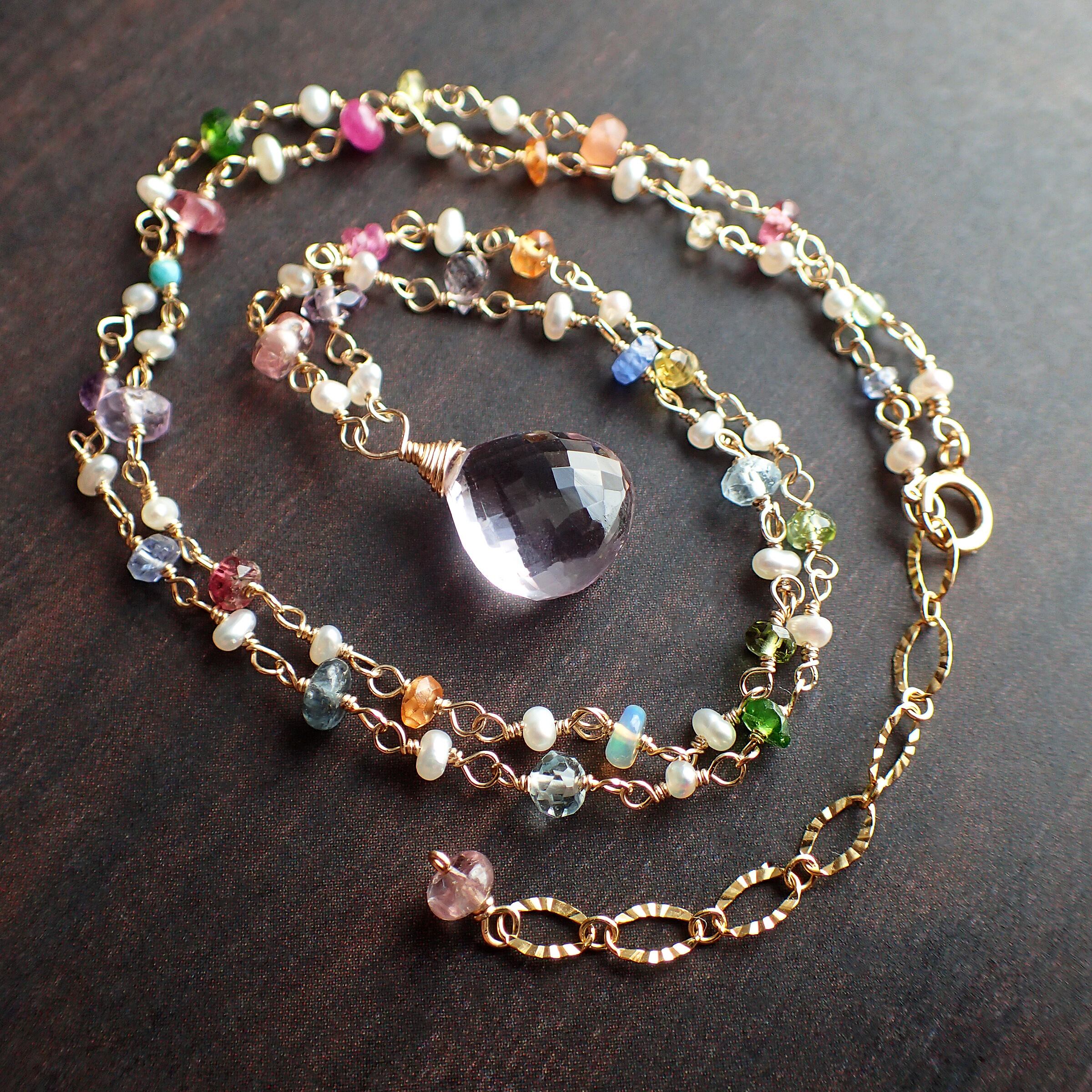ピンクアメジスト(大きさ約 縦1.2×横幅1×厚み0.6㎝)・淡水パール・アメジスト・ルビー・タンザナイト・イエローサファイア・アクアマリン・グリーントルマリン・オパール・スペサタイトガーネット・ピンクサファイア・ブルーサファイア・トルコ石・イエロートルマリン・オレンジムーンストーン・ピンクスピネル・インディゴブルースピネル・ピンクトルマリン・クロムダイプサイト・ペリドット・パープルサファイア・インペリアルトパーズ・K14GF(チェーン、ワイヤー、パーツ全て)