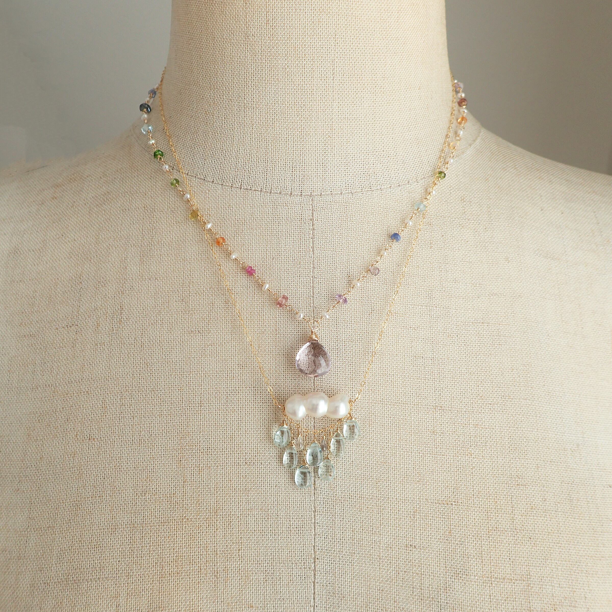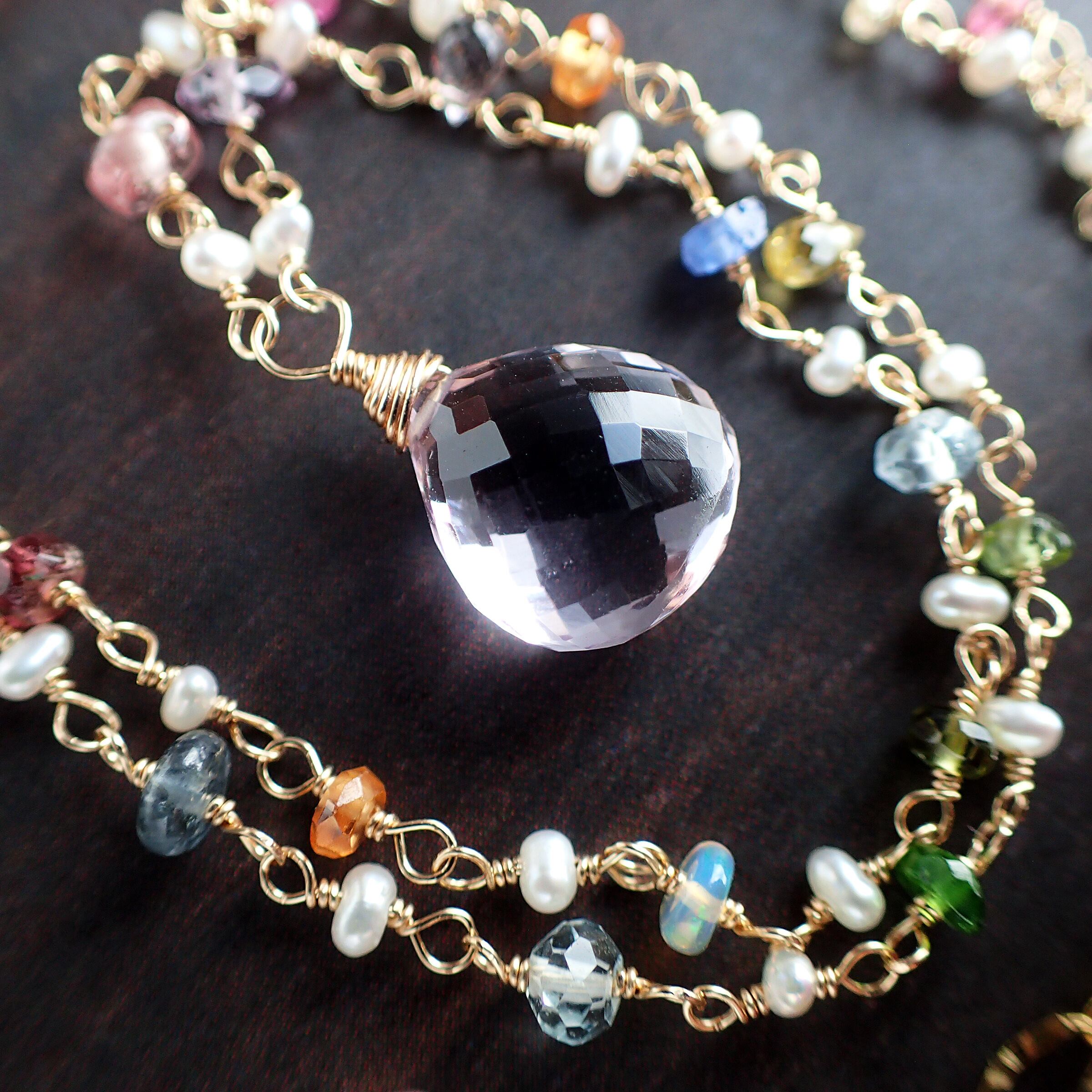 トップのピンクアメジストの柔らかなピンクは、心を温めるような優しさを感じさせ、ネックレス部分のジェムストーンが織りなす鮮やかな色合いは、幻想的で夢のような世界を表現しています。