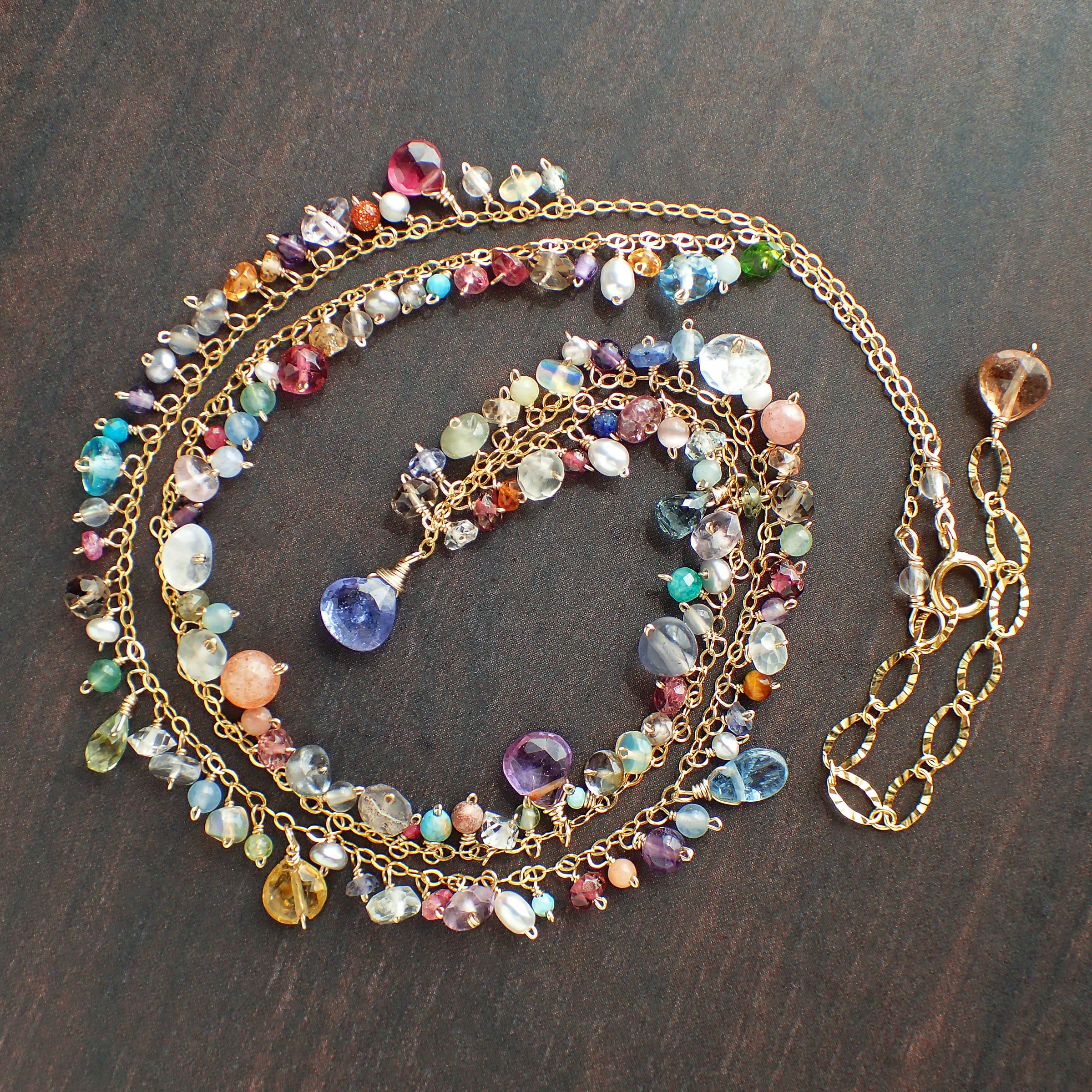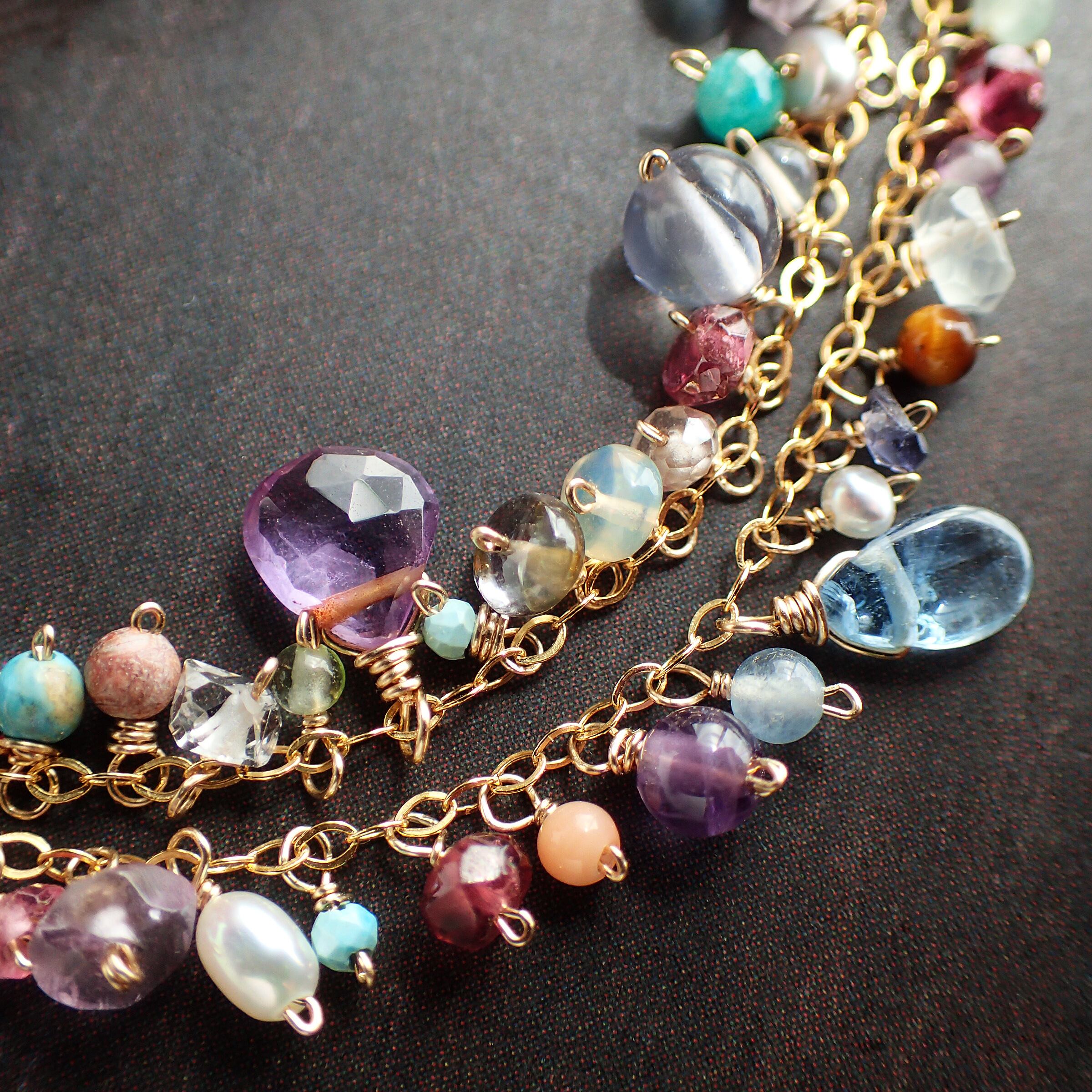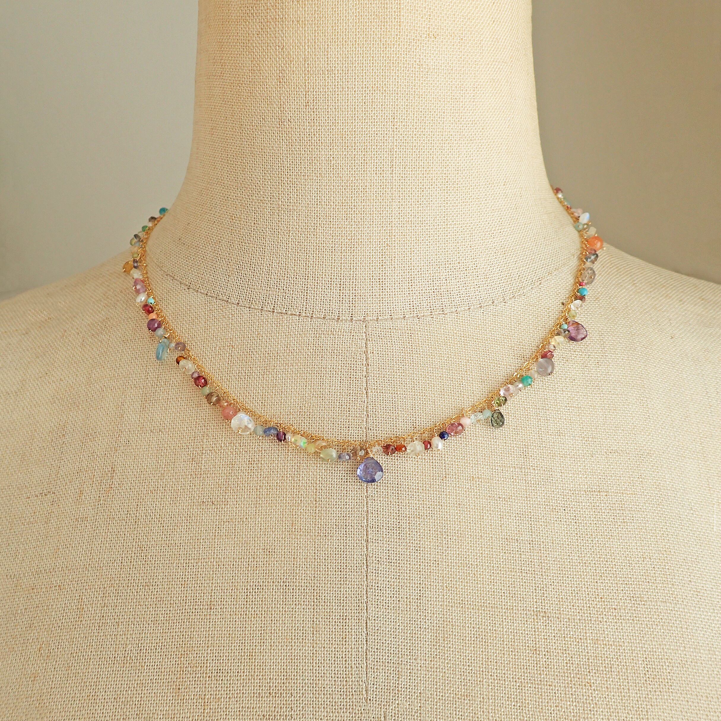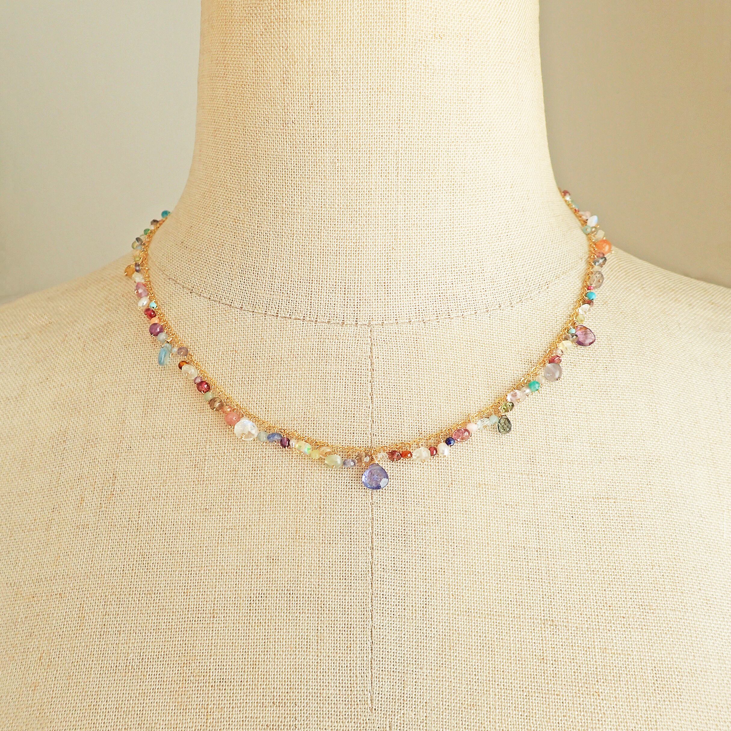 このジェムストーンのネックレスは、センターにタンザナイトを配置し、イエロートルマリンやグリーンサファイア、アクアマリンやオパール、ピンクトルマリンといった色とりどりの美しい天然石が贅沢に組み合わされた華やかなデザインが特長です。