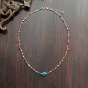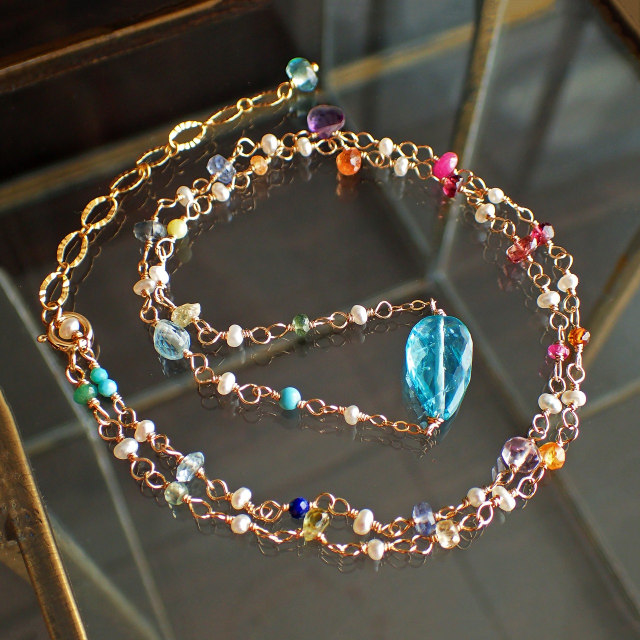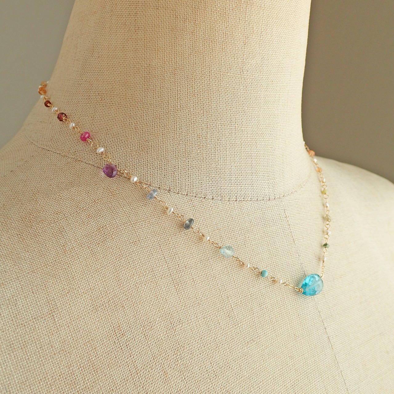 この虹色のネックレスは、アパタイトを中心にイエローサファイア、ラフダイヤモンド、ルビーなど20種類の美しい天然石が鮮やかな虹のように連なるデザインが特長です。