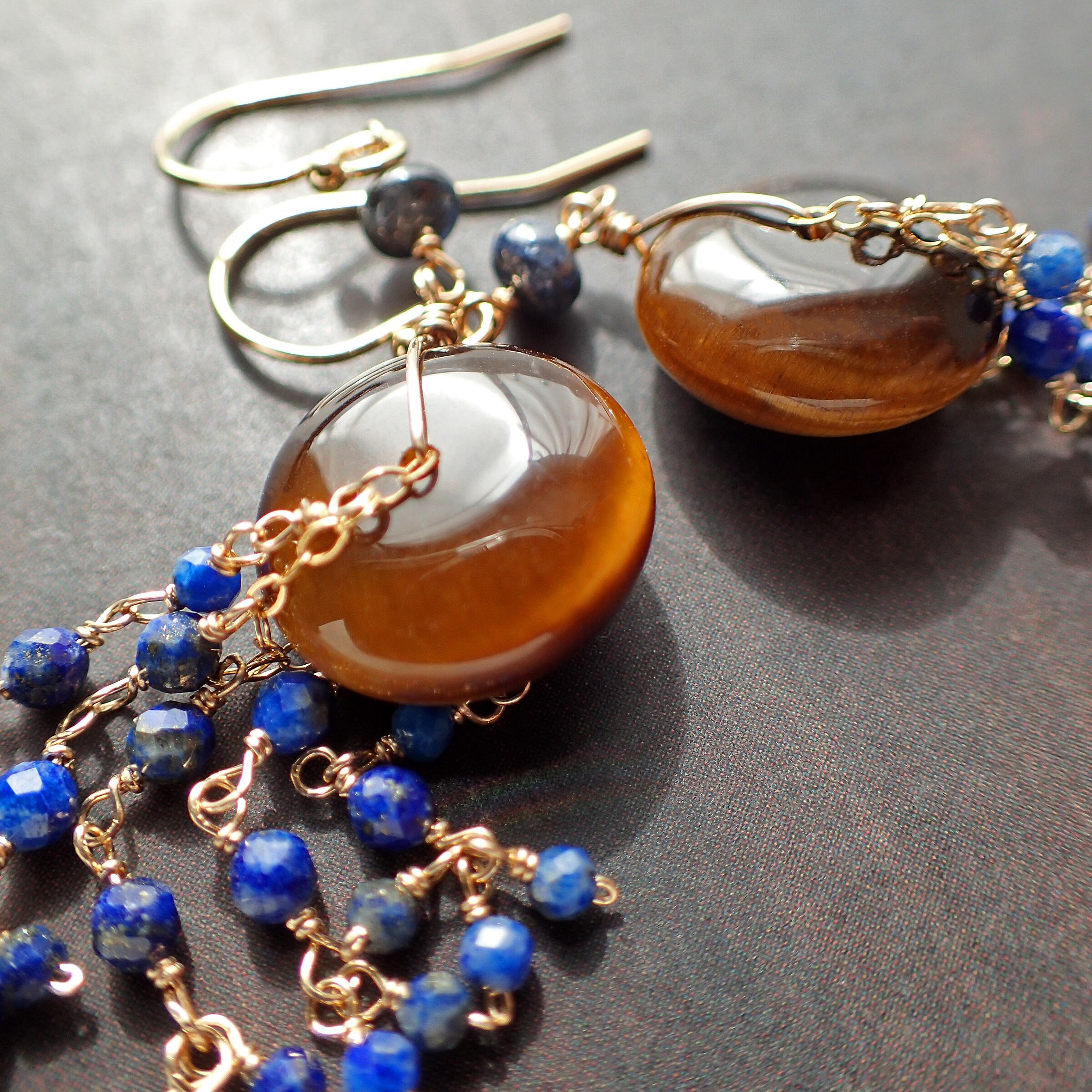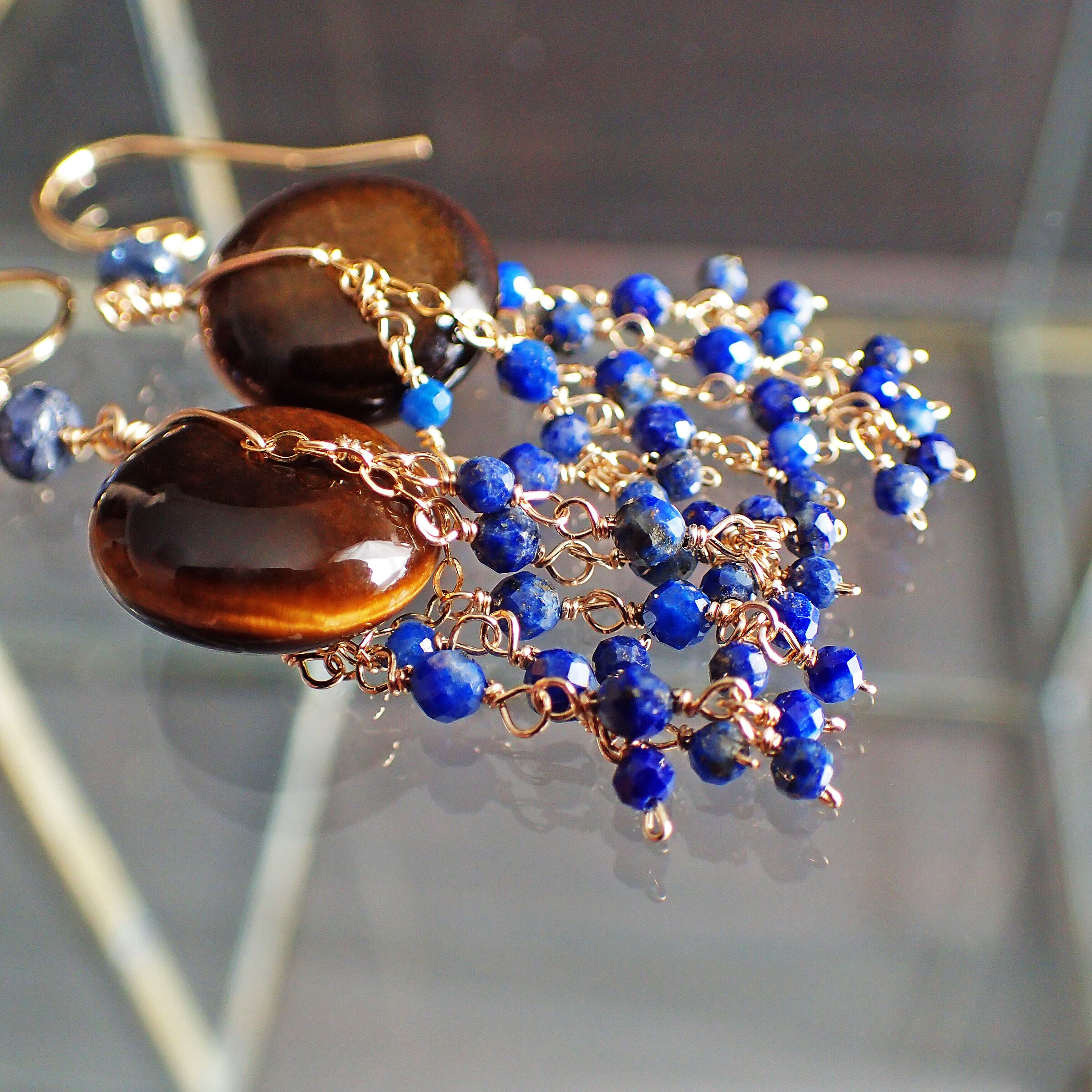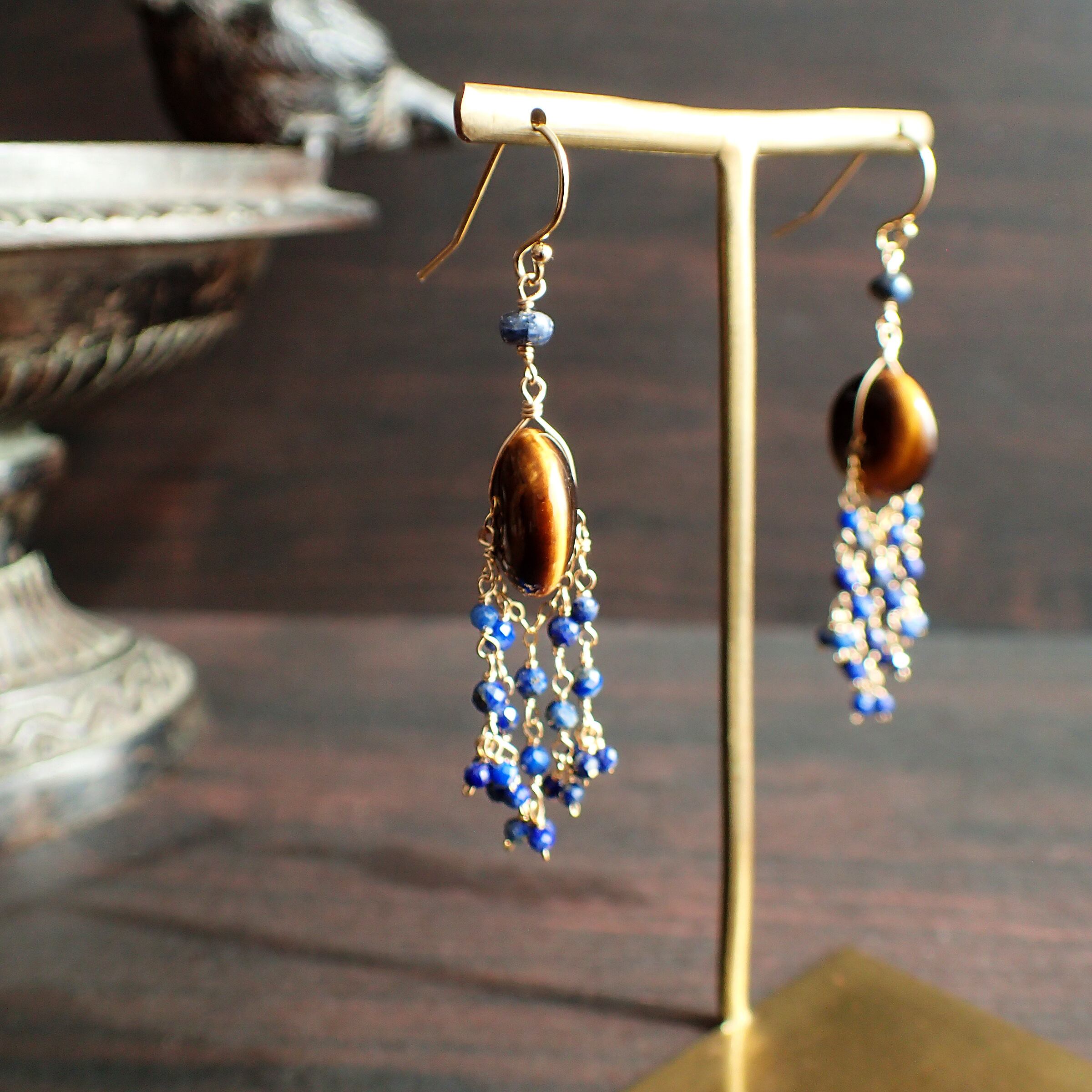 このシャンデリアピアスは、神秘的な輝きを持つタイガーアイと、深いブルーが魅力的なラピスラズリを使用した、エレガントで個性的なデザインが特長です。