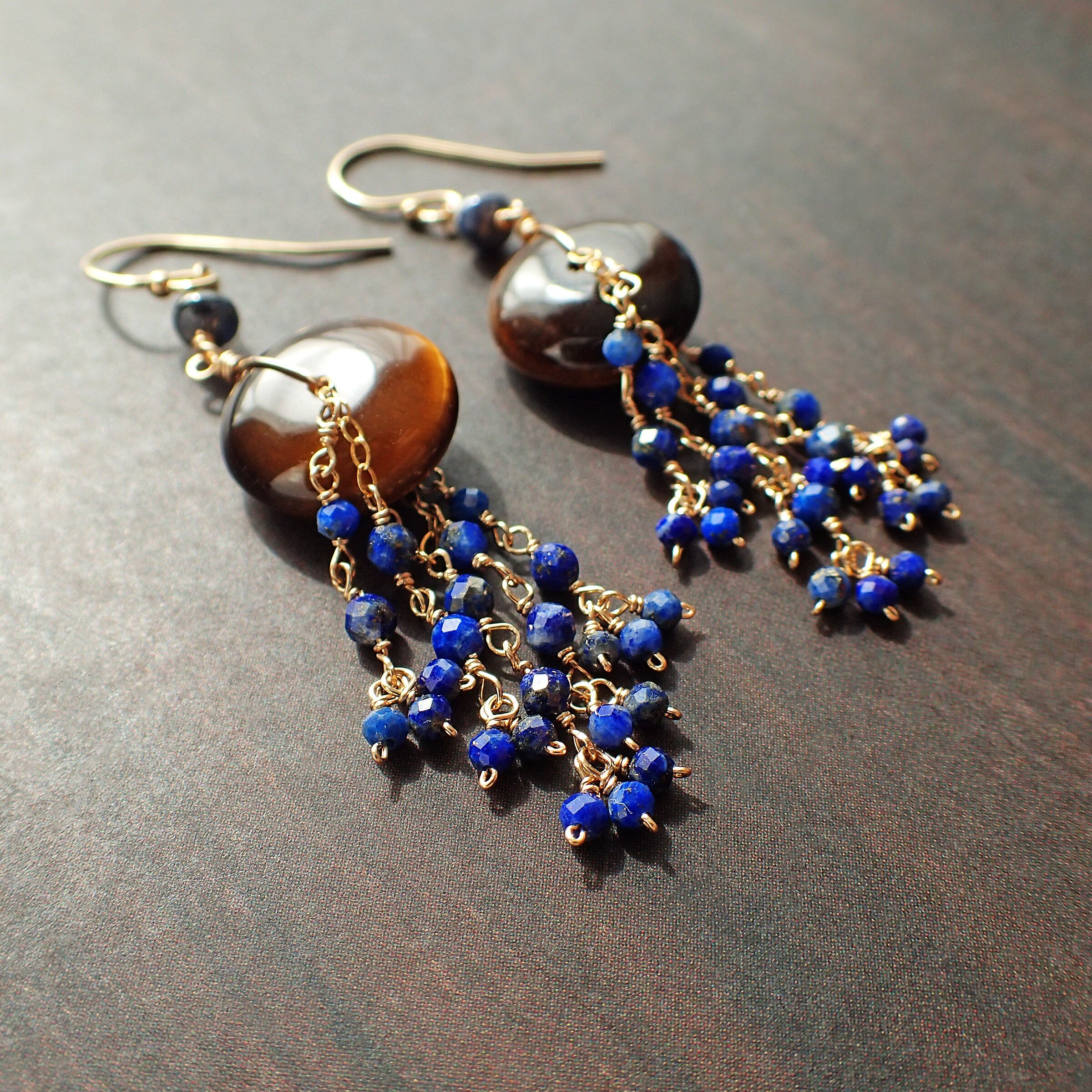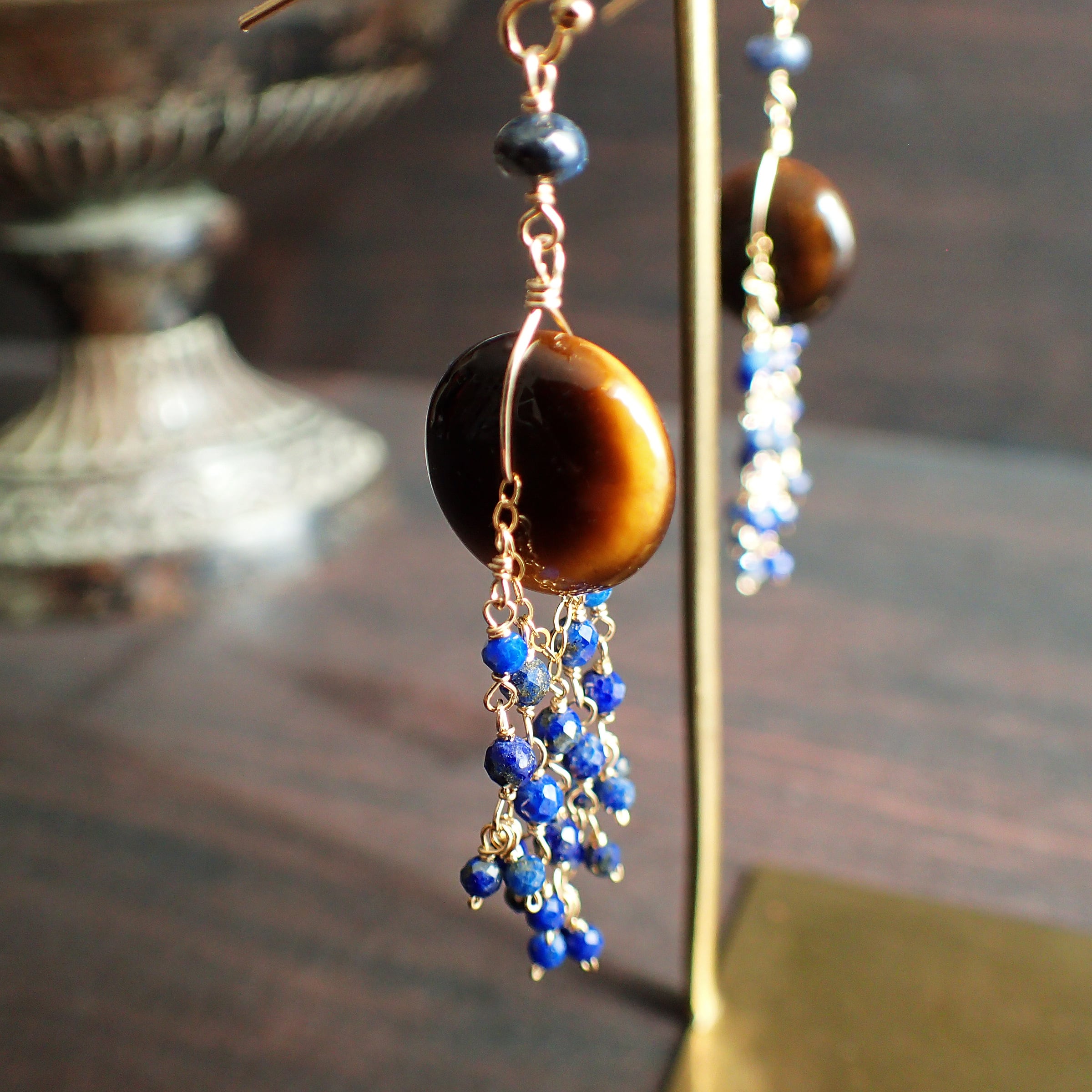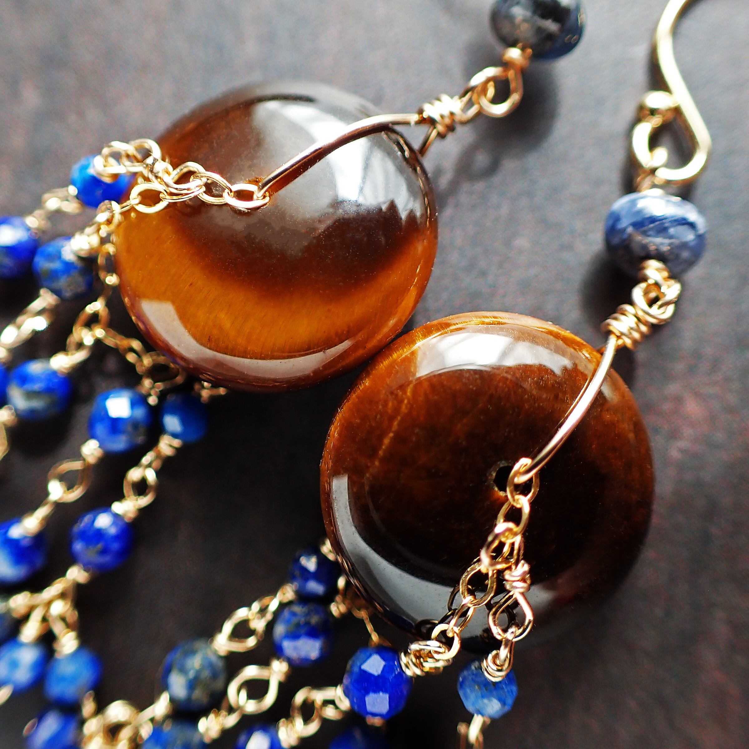 このシャンデリアピアスは、神秘的な輝きを持つタイガーアイと、深いブルーが魅力的なラピスラズリを使用した、エレガントで個性的なデザインが特長です。