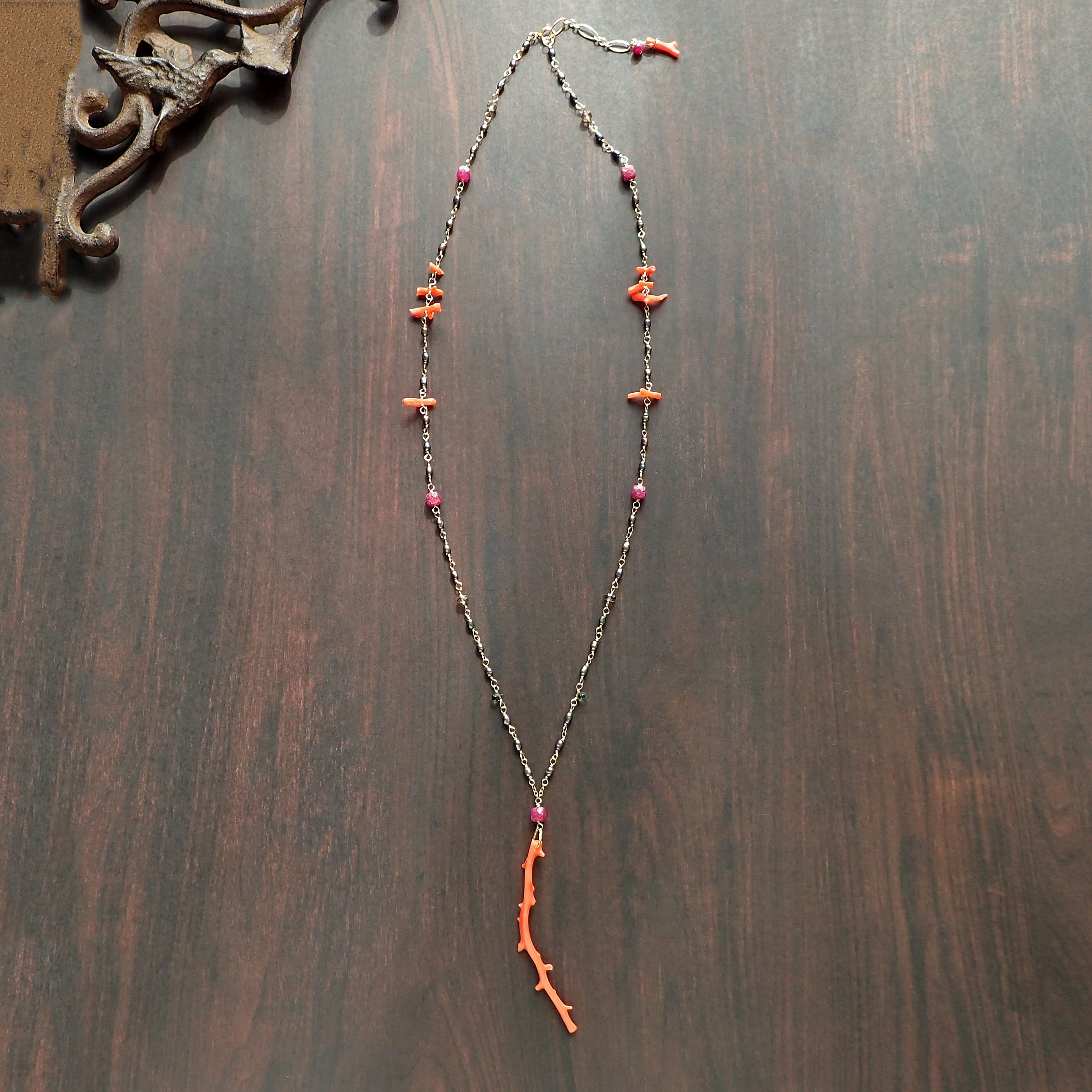このネックレスは、優雅なピンク色の枝珊瑚と深い光沢を持つブラックパールを組み合わせた、華やかで個性的なデザインが特長です。