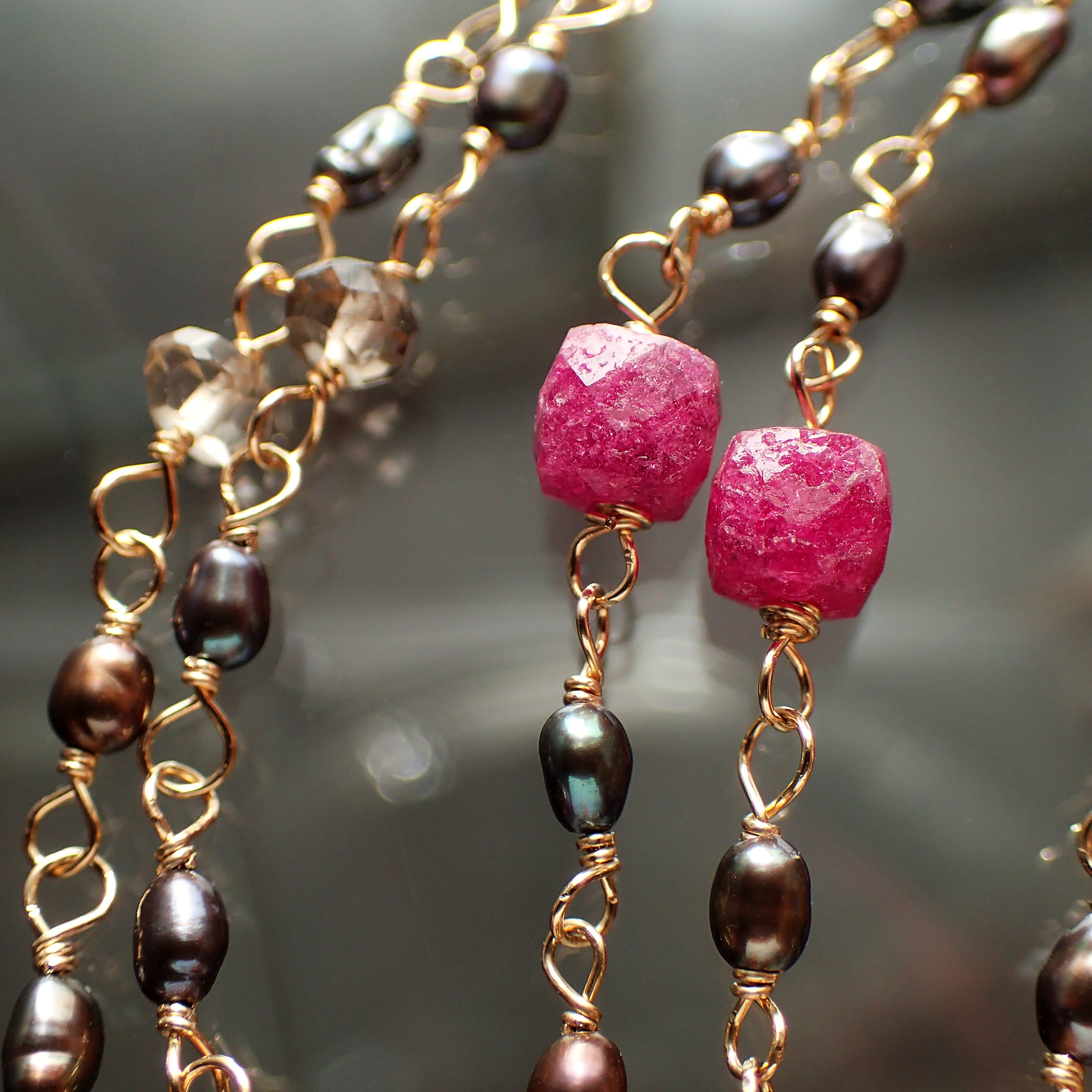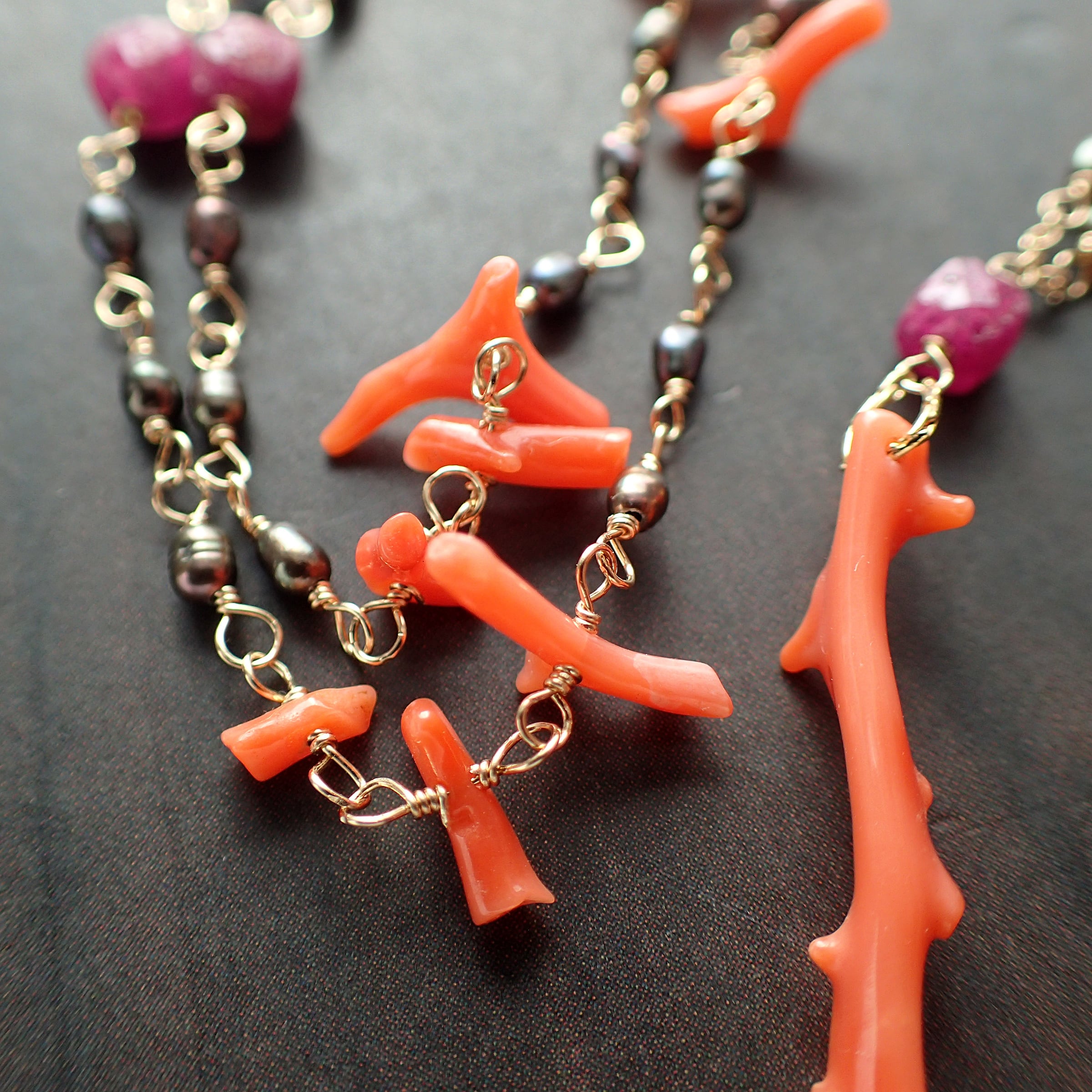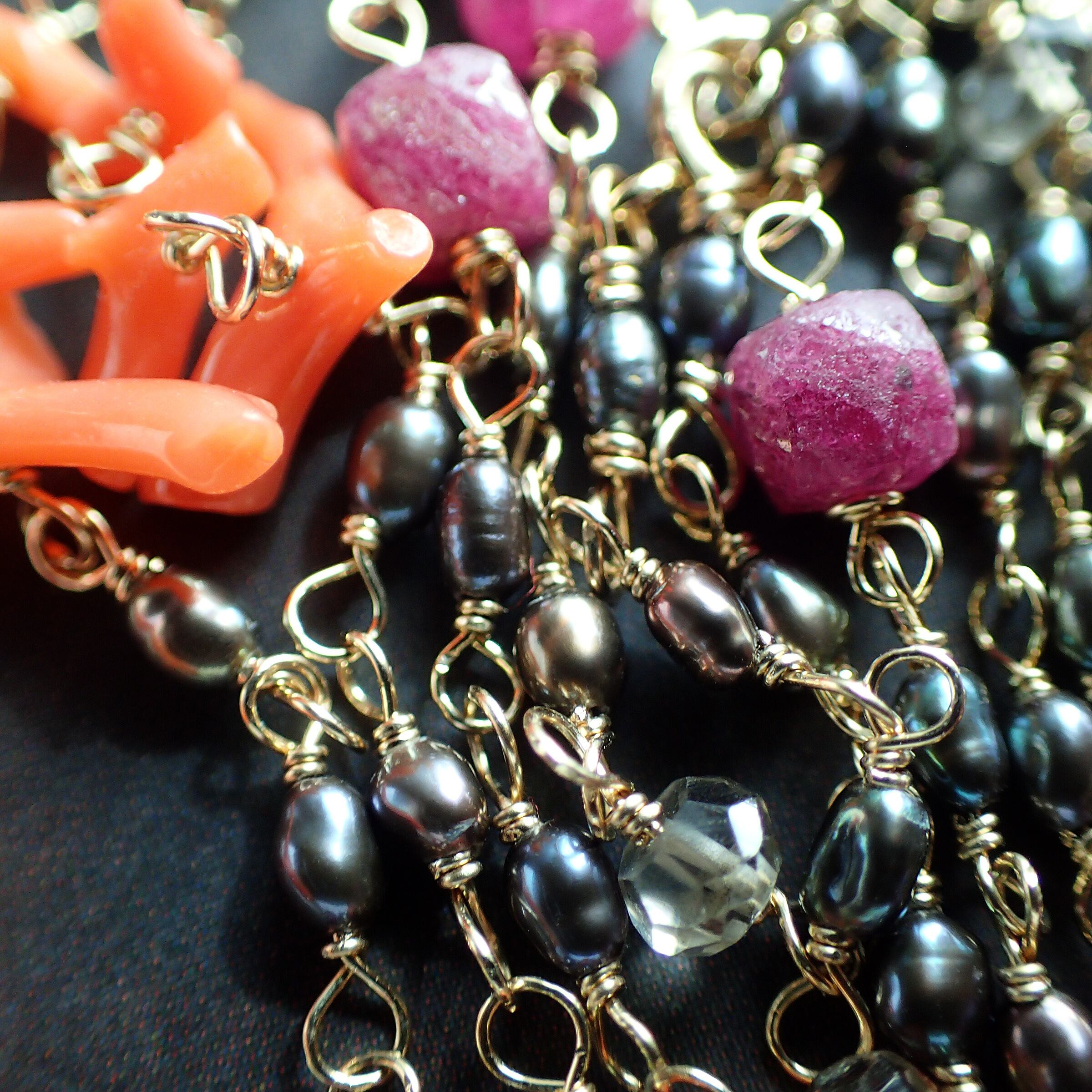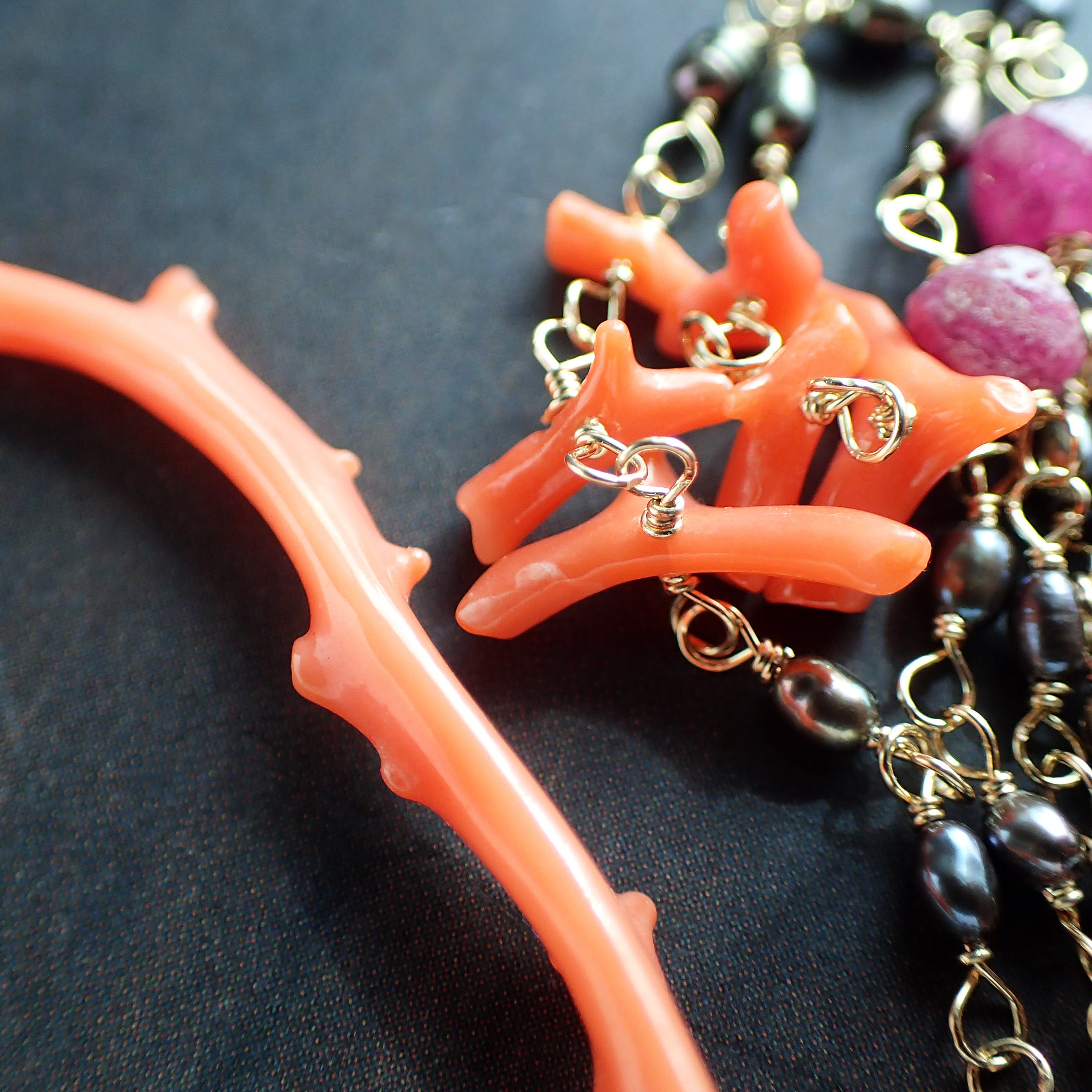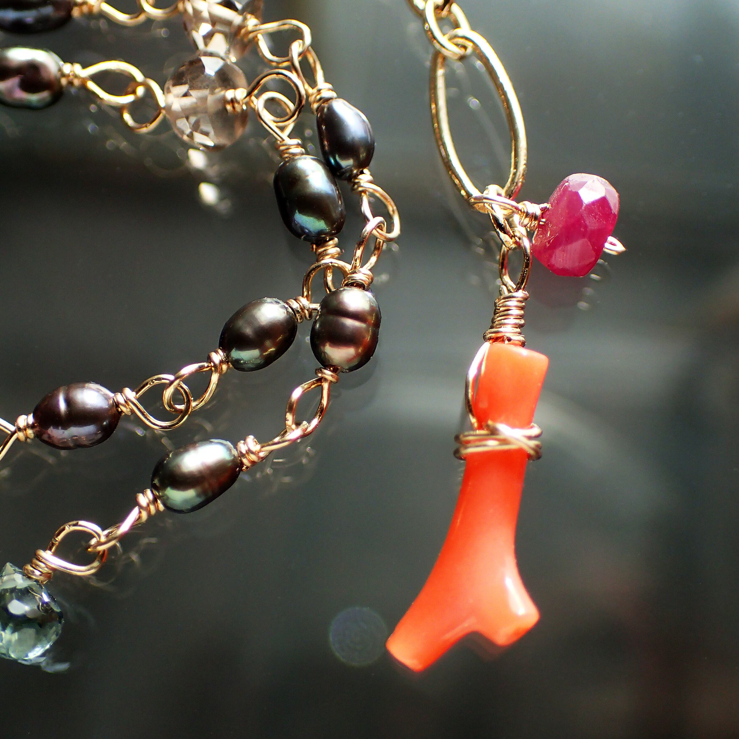 珊瑚・淡水パール・ルビー・グリーンサファイア・スモーキークウォーツ・K14GF(チェーン・ワイヤー・パーツ全て)