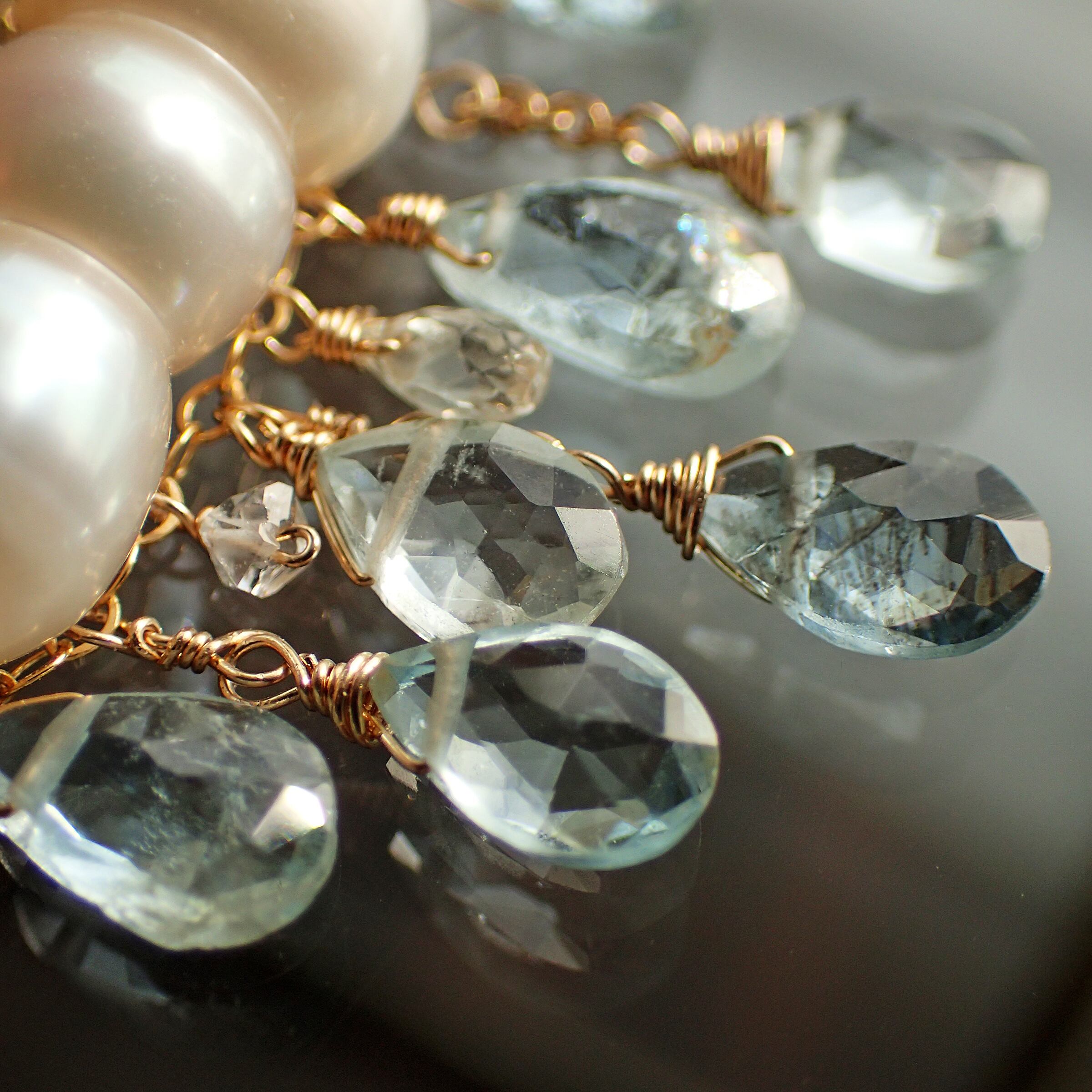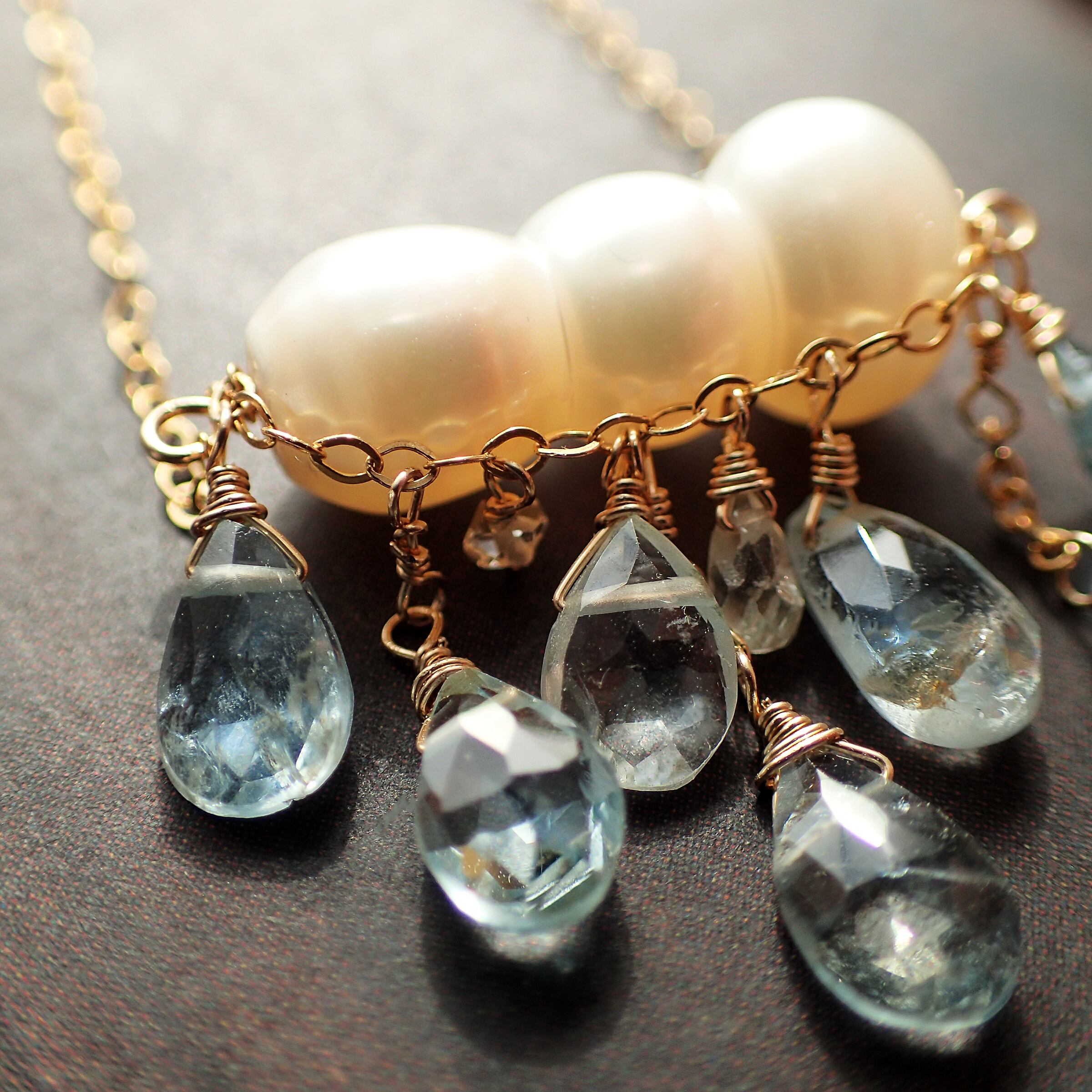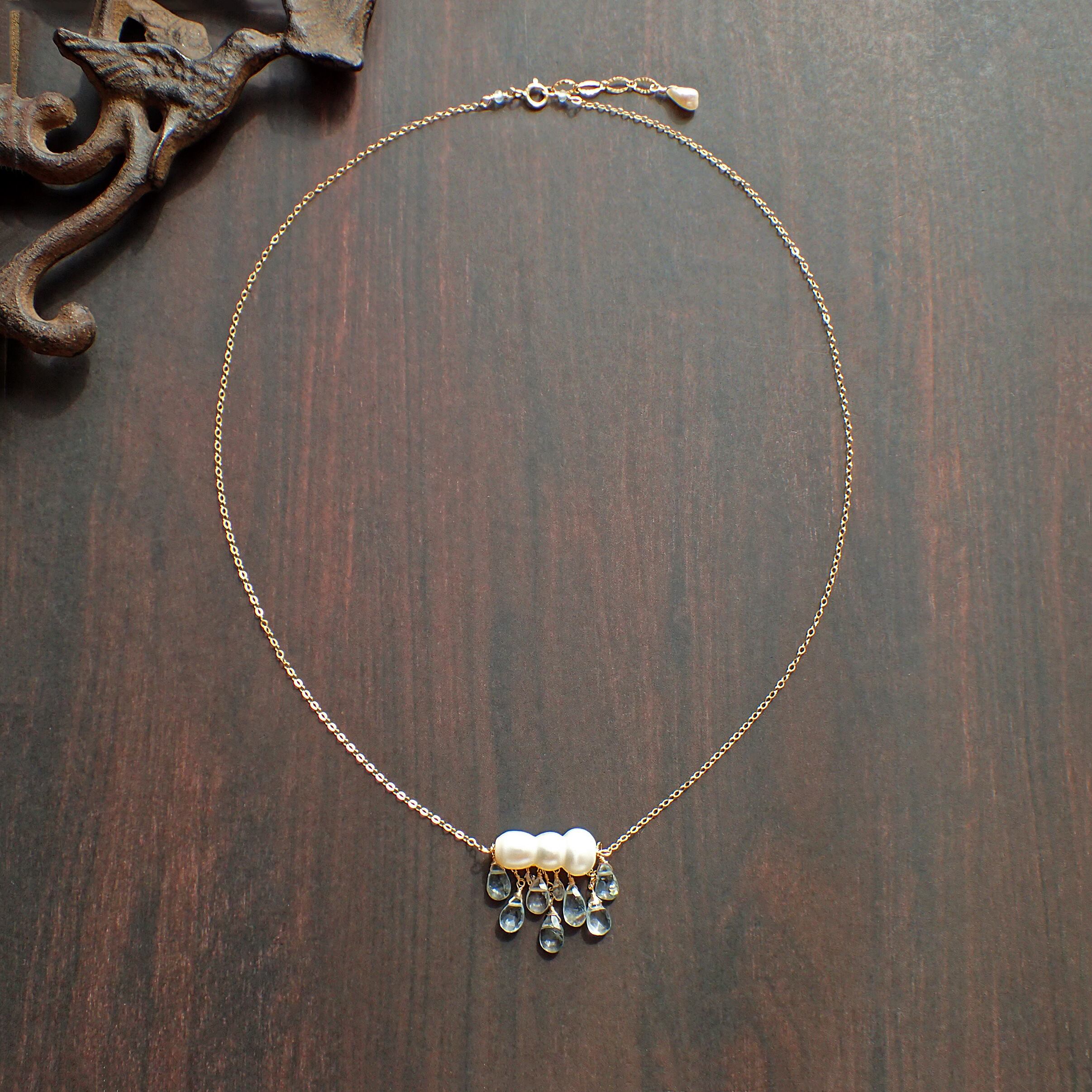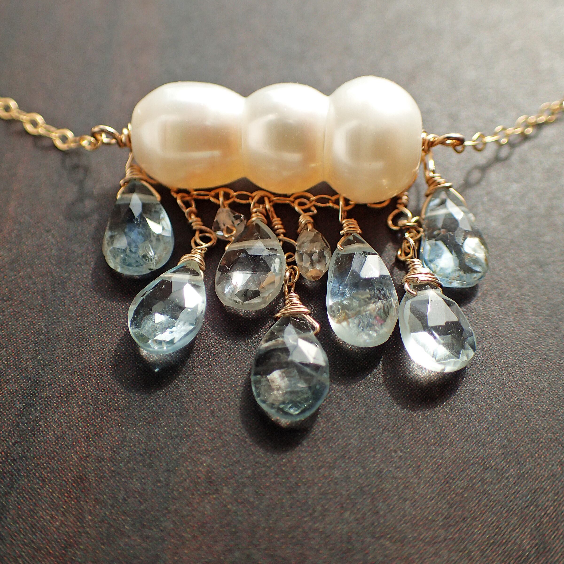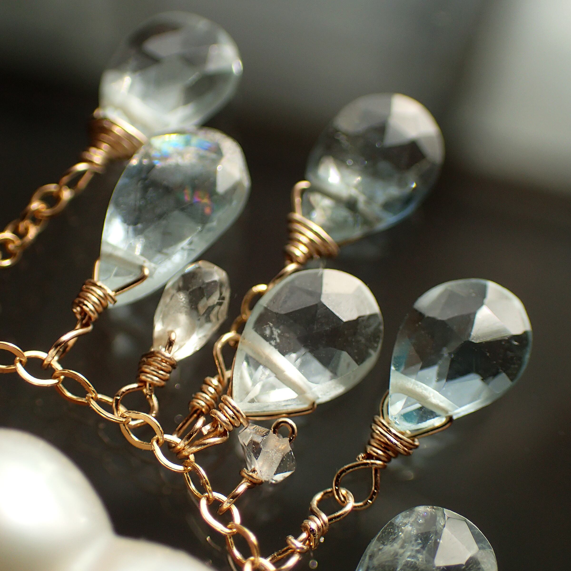 三つ子パール、カットの入ったアクアマリン、極小粒のホワイトサファイアとハーキマーダイヤモンドが織り成す美しいコンビネーションは、まるで空に浮かぶ雲や優しい氷雨のような透明感のある華やかさを感じさせます。
