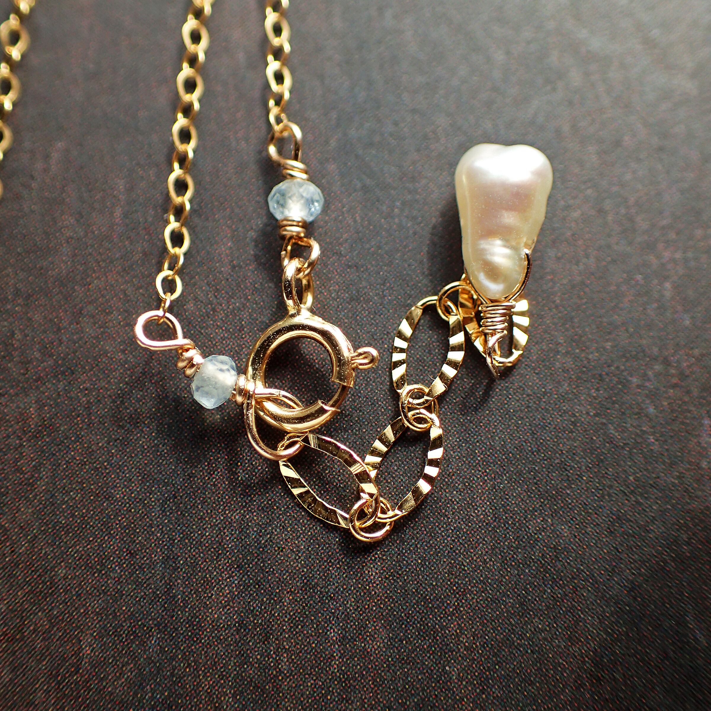 淡水パール(三つ子パール…横幅1.8㎝)・アクアマリン・ハーキマーダイヤモンド・ホワイトサファイア・K14GF(チェーン、ワイヤー、パーツ全て)