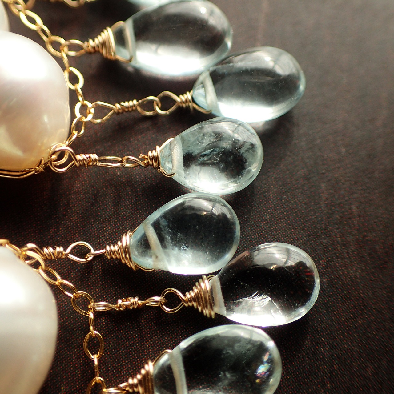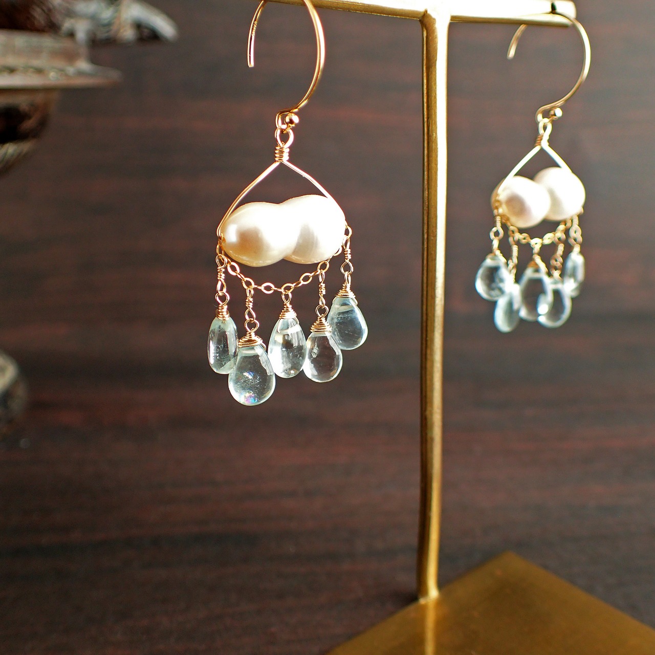 このピアスは、しずく型のアクアマリンとツインパールを使用した、幻想的なデザインが特長です。