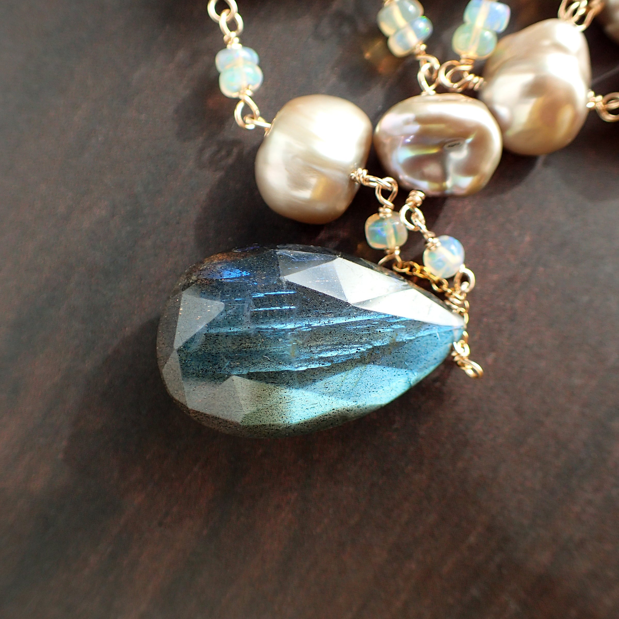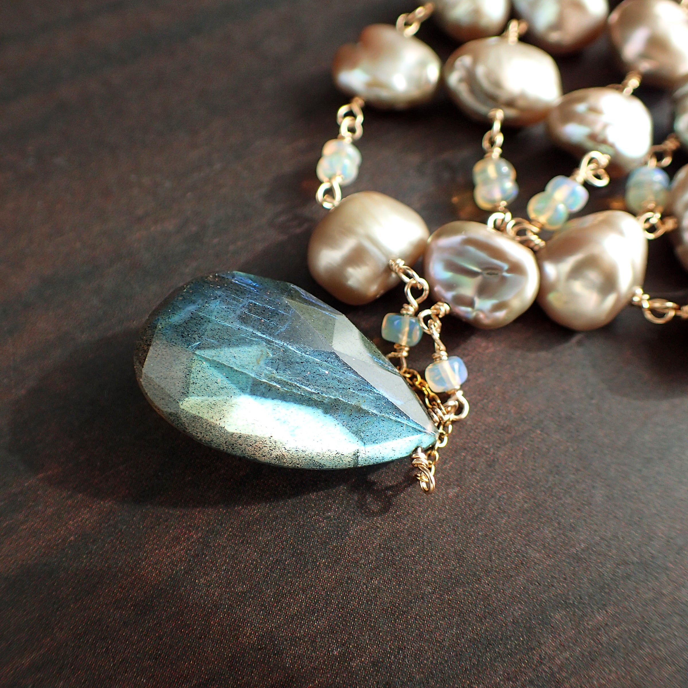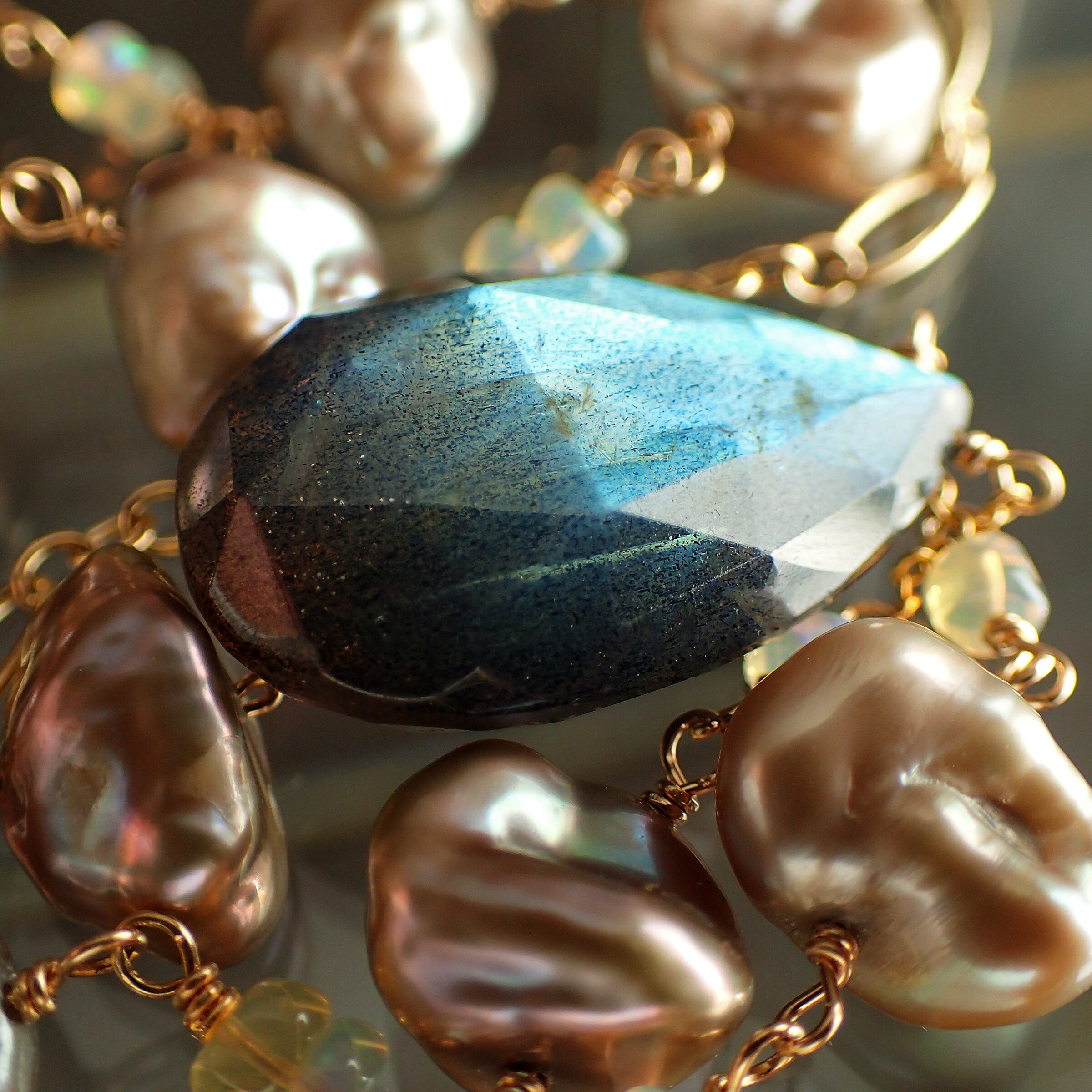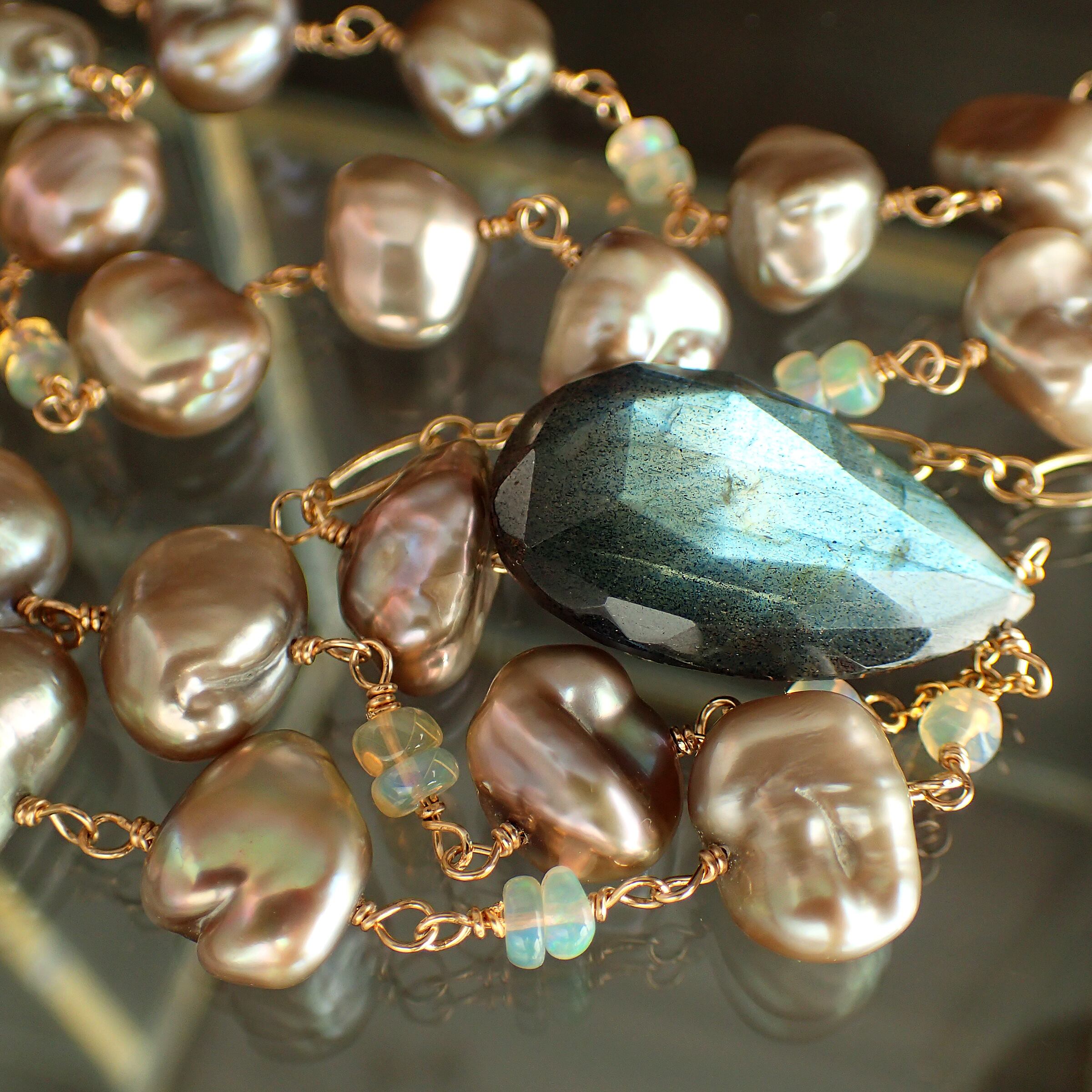 淡水パールの柔らかな輝き、ラブラドライトの幻想的なシラー、オパールの多彩な色合いが絶妙に調和し、あなたの個性を引き立てること間違いなしです。