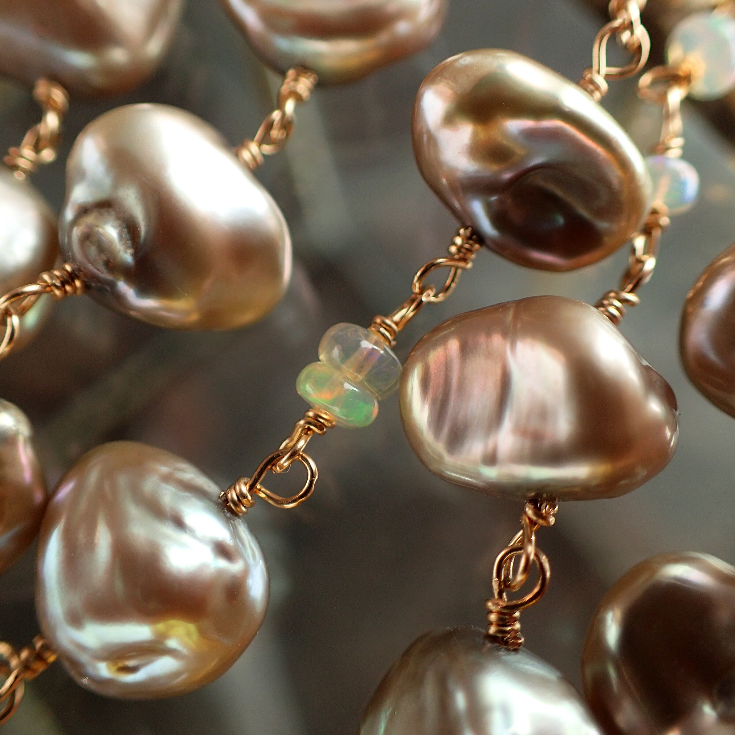 この魅力的なFragment of the Universe necklace(宇宙の欠片ネックレス)は、淡水パールとラブラドライト、オパールを使用した特別なアイテムで、まるで宇宙の奥深い神秘を身にまとっているかのようなデザインが特徴です。