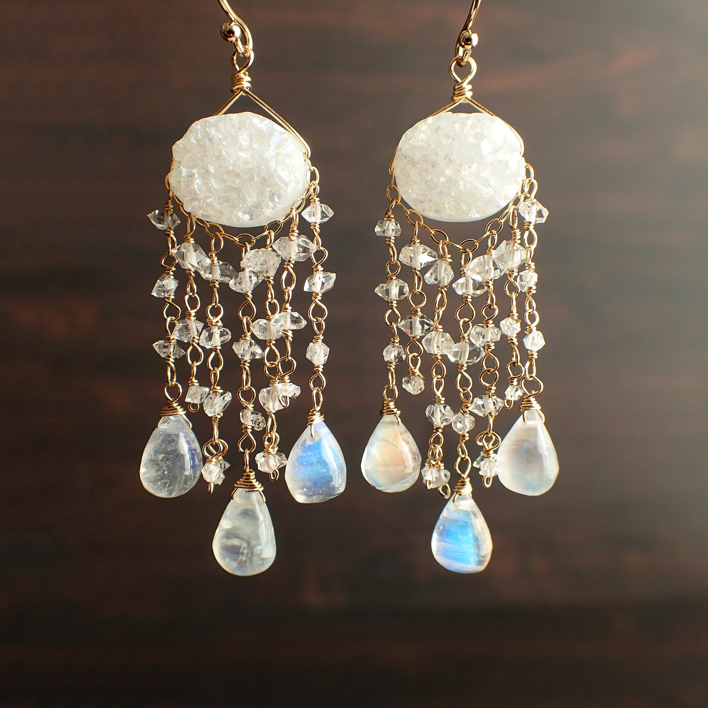 Snowy night chandelier earrings( Druzy quartz , Harkimer Diamond & Rainbow Moonstone) | yukirra shop