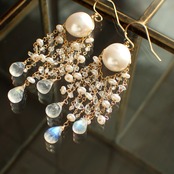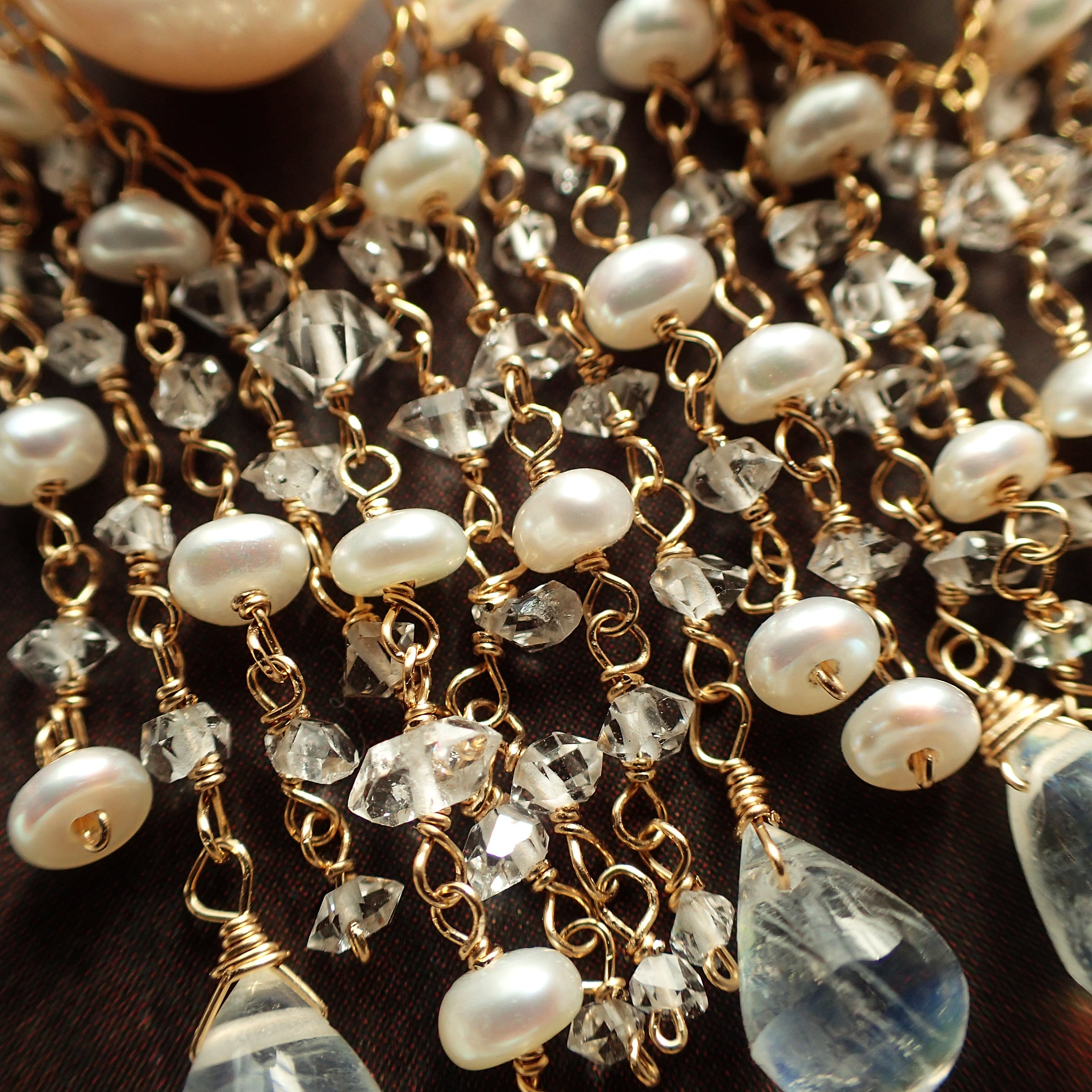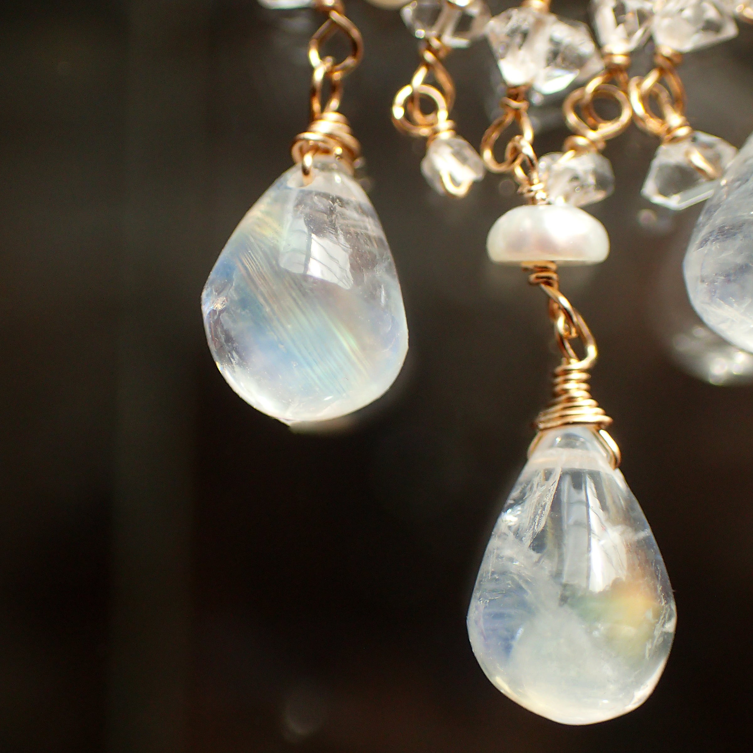 このシャンデリアピアスは、大小の淡水パール、極小のハーキマーダイヤモンド、涙型のレインボームーンストーンを使用した、雪がふる静かな夜のように美しいデザインが特長です。