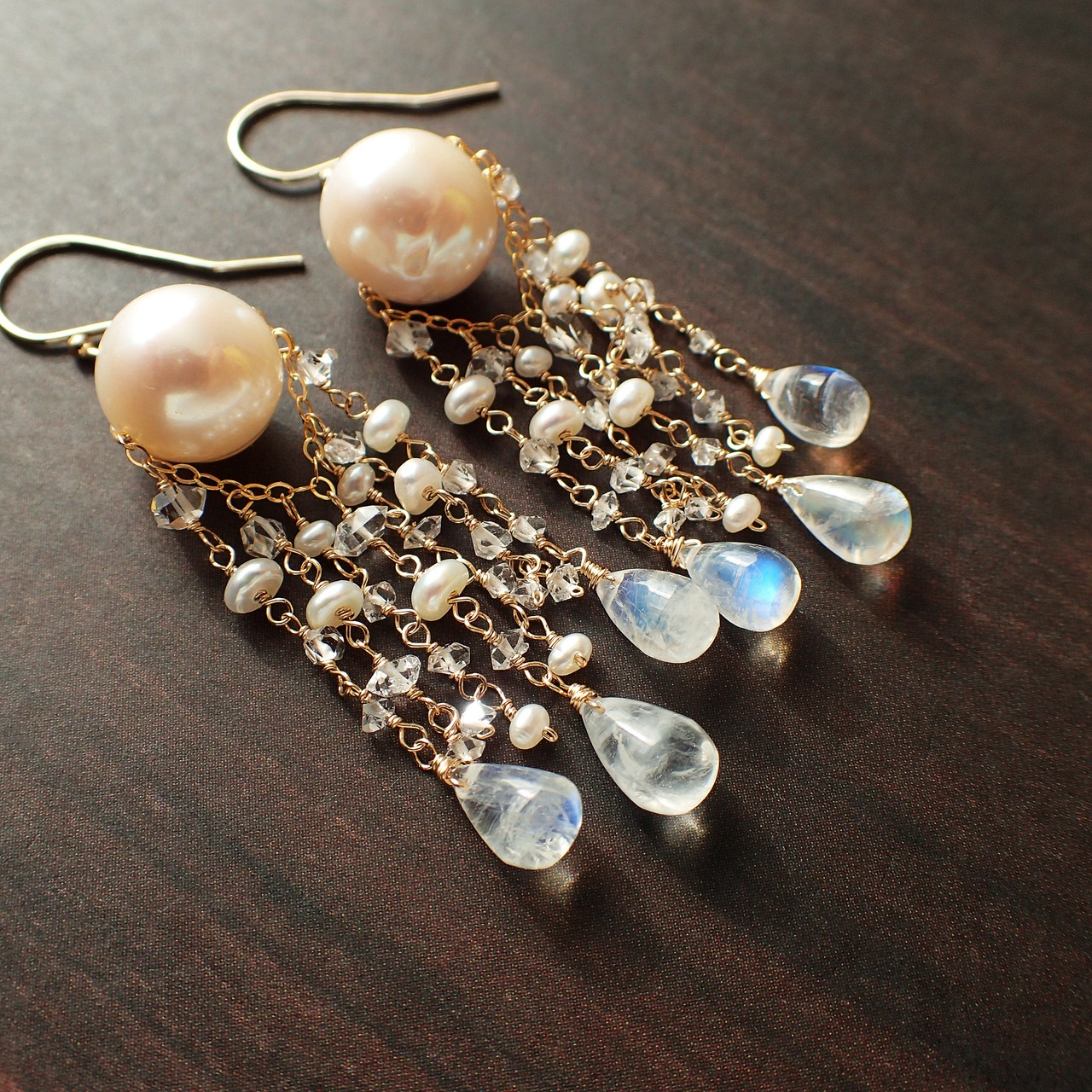 このシャンデリアピアスは、大小の淡水パール、極小のハーキマーダイヤモンド、涙型のレインボームーンストーンを使用した、雪がふる静かな夜のように美しいデザインが特長です。