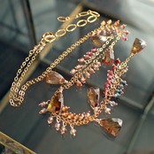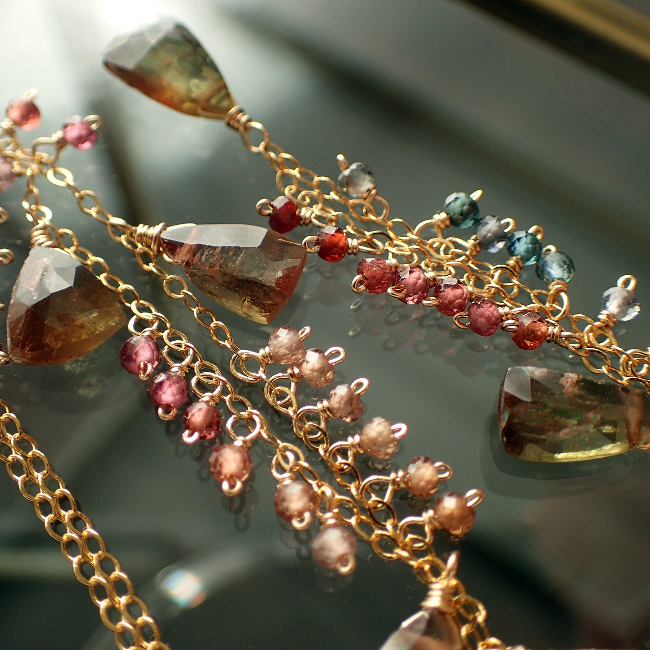ツンドラサファイアの多彩な色合いと、アンダリュサイトの深みのある輝きと角度によって見える色が違う独特な美しさが見事に調和し、胸元で華やかに揺れ動きます。