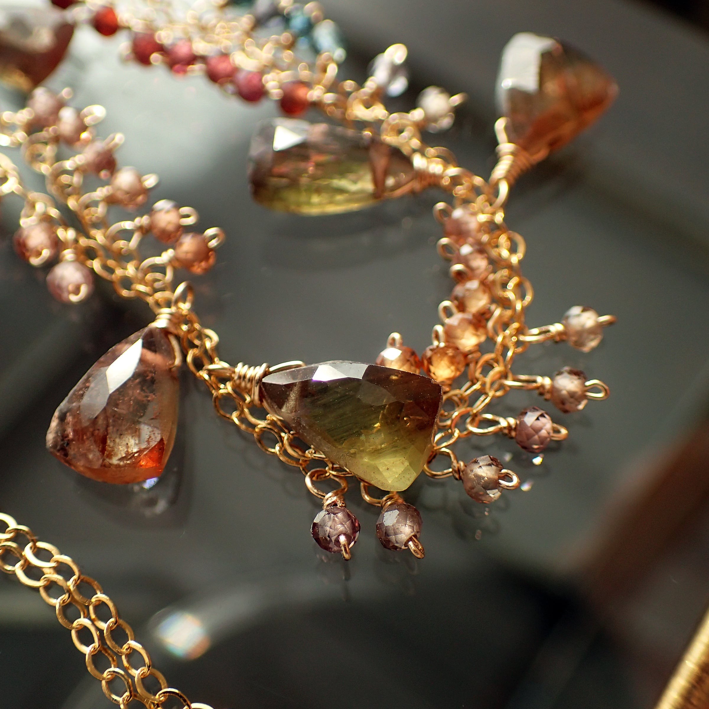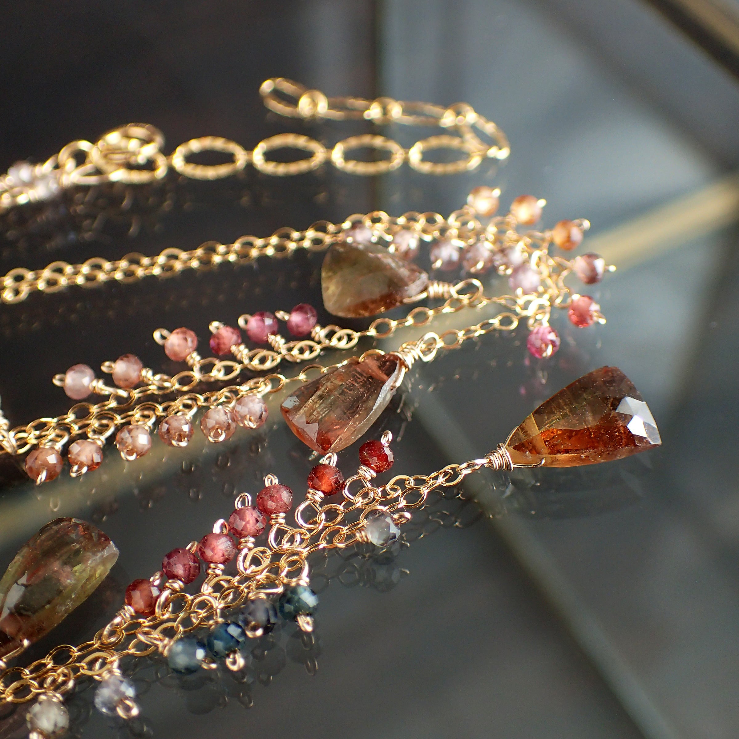 このアンダリュサイト & ツンドラサファイアのシャンデリアネックレスは、アンダリュサイトとツンドラサファイアの美しい融合が魅力的なアクセサリーです。