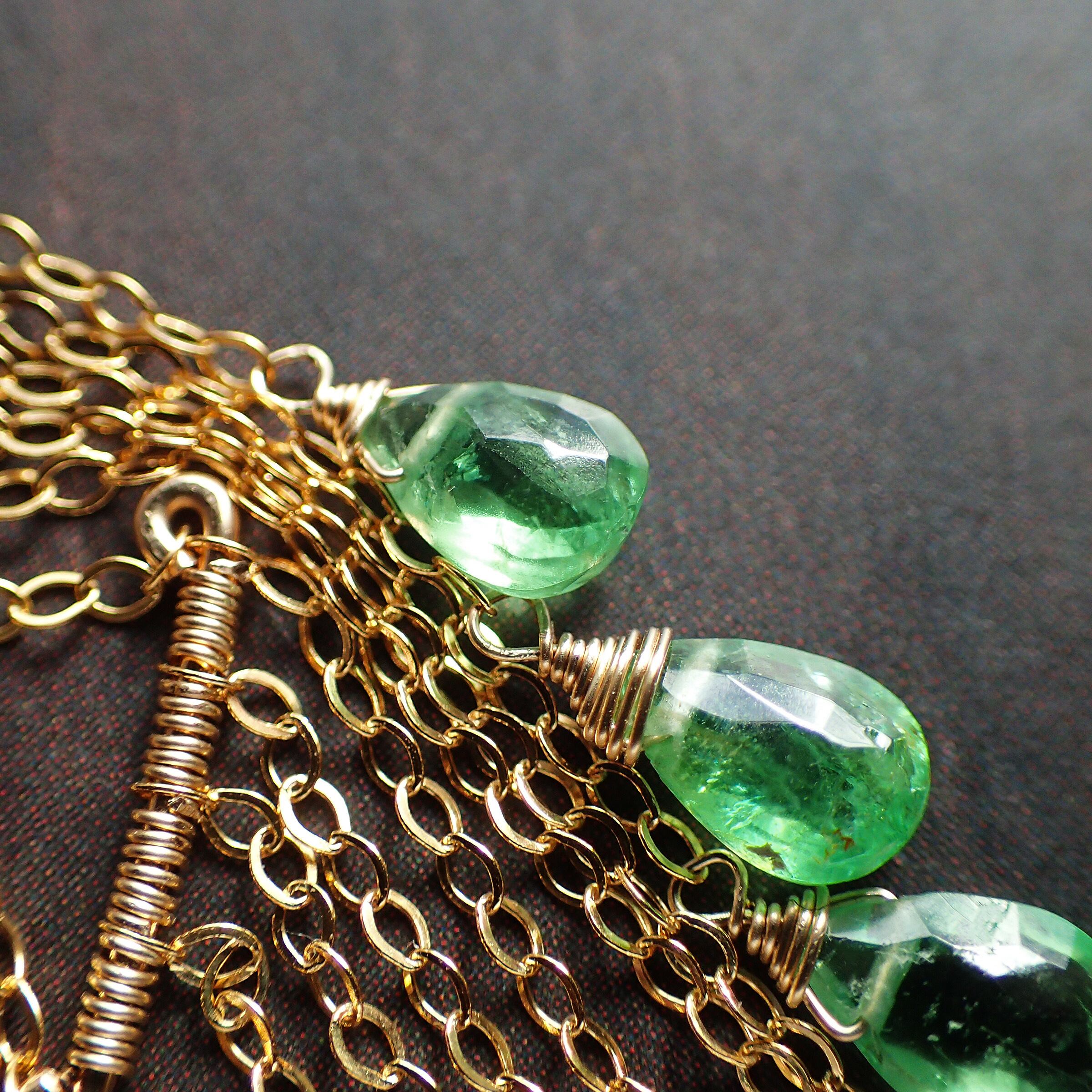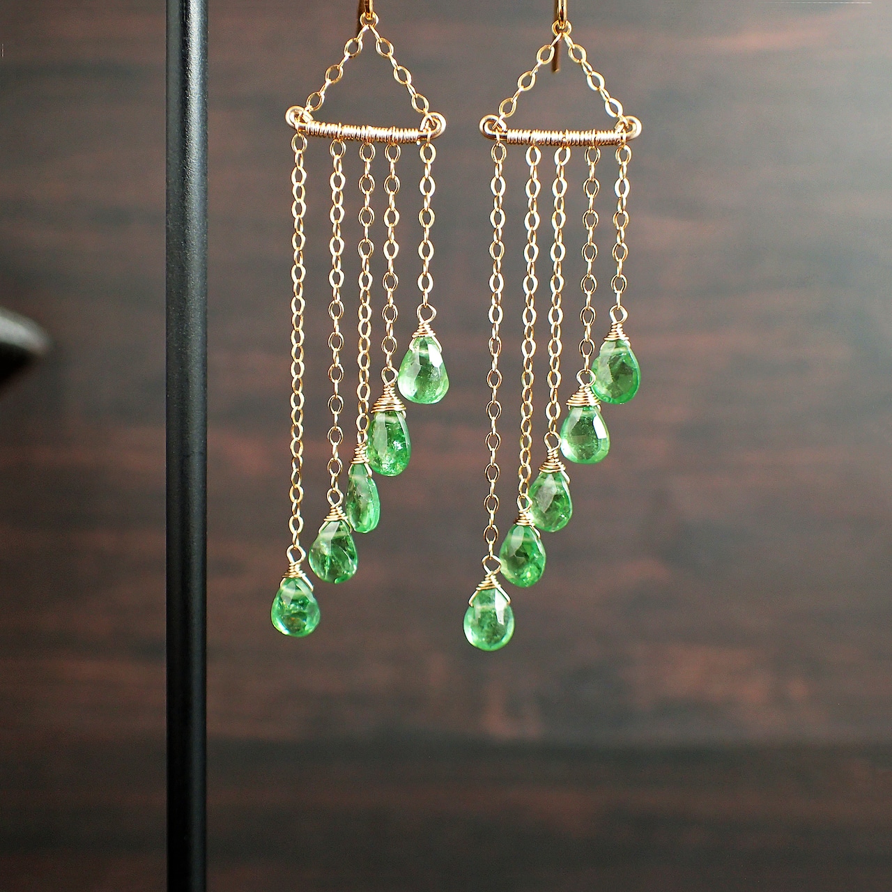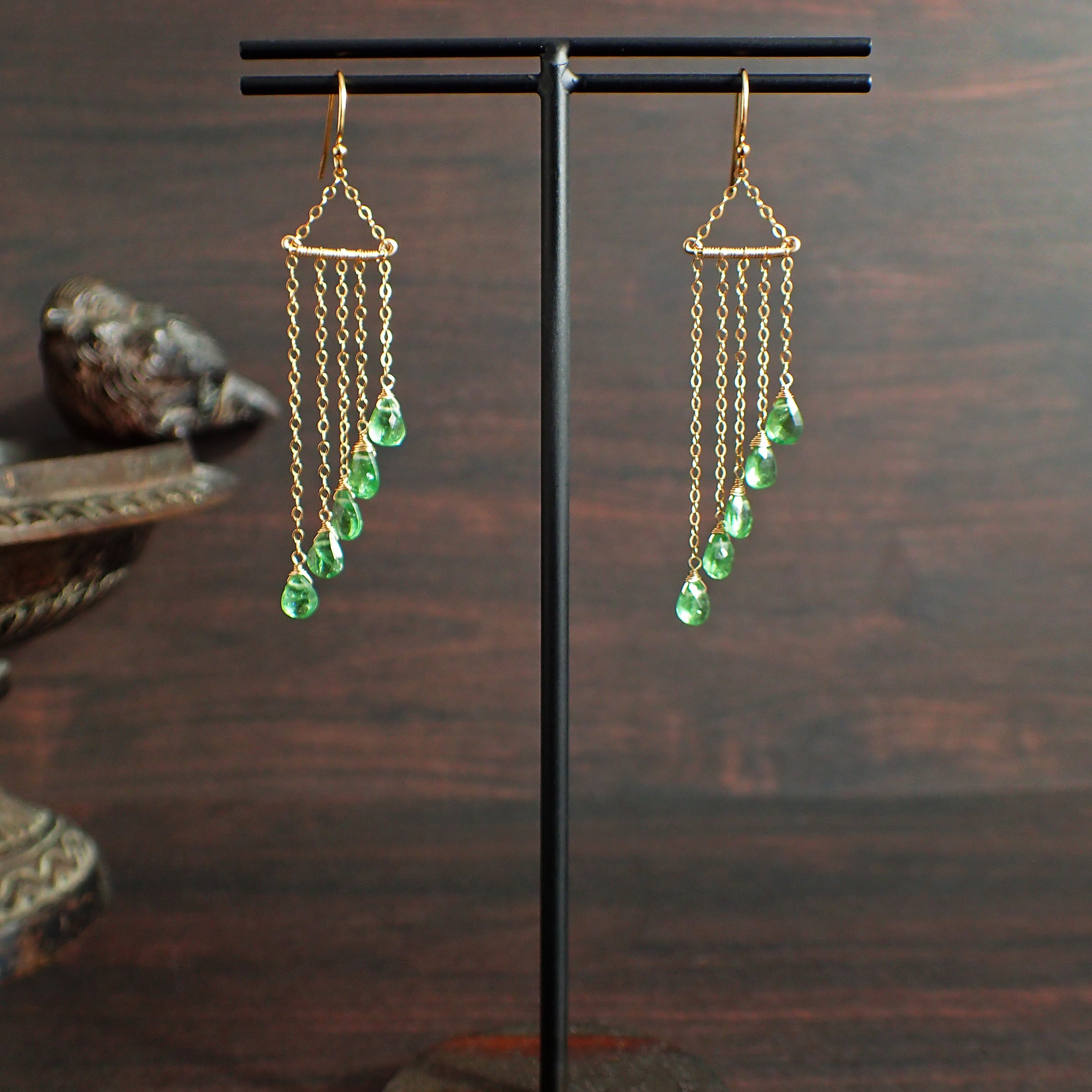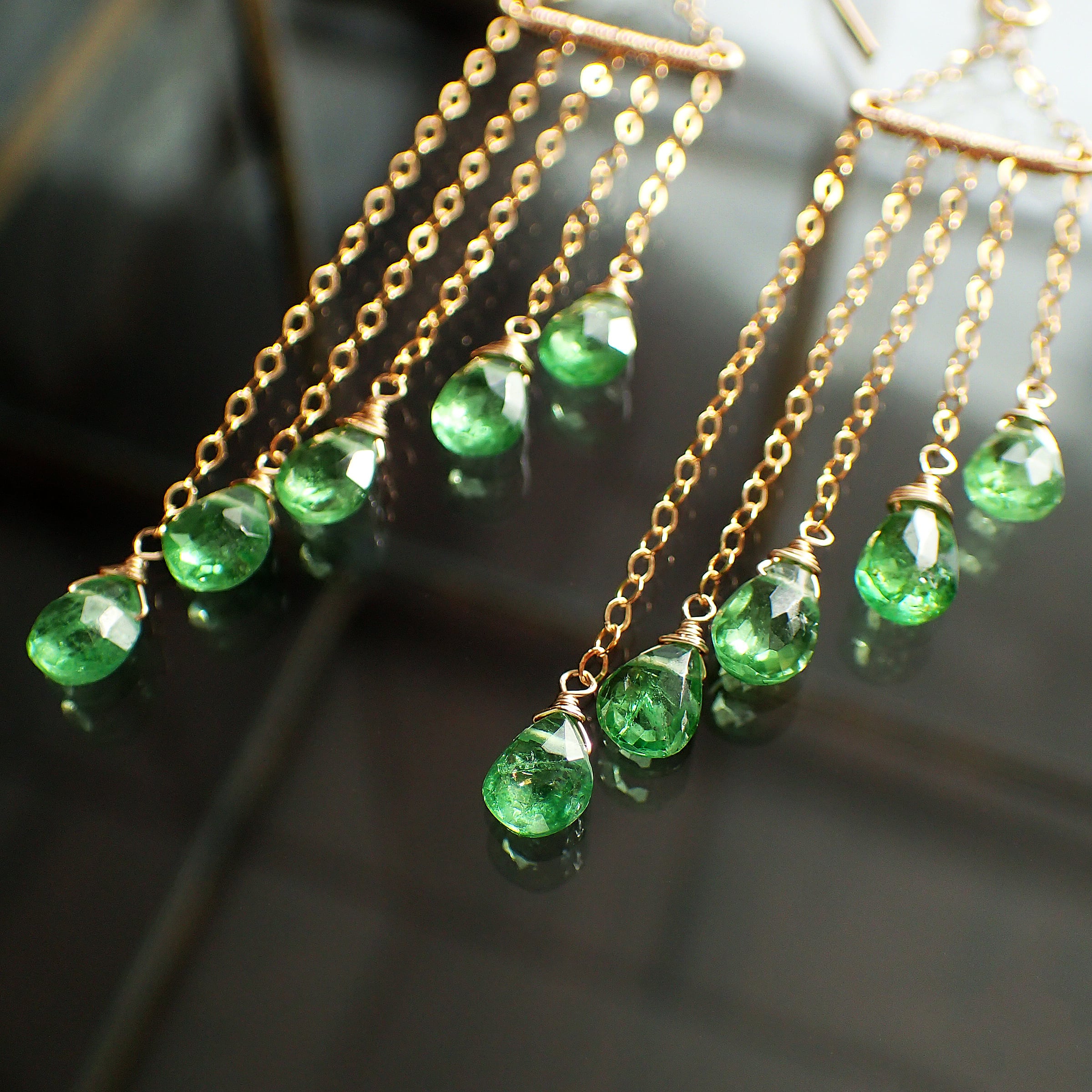このグリーンガーネットのシャンデリアピアスは、瑞々しいグリーンガーネットの魅力が際立つ美しいアクセサリーです。