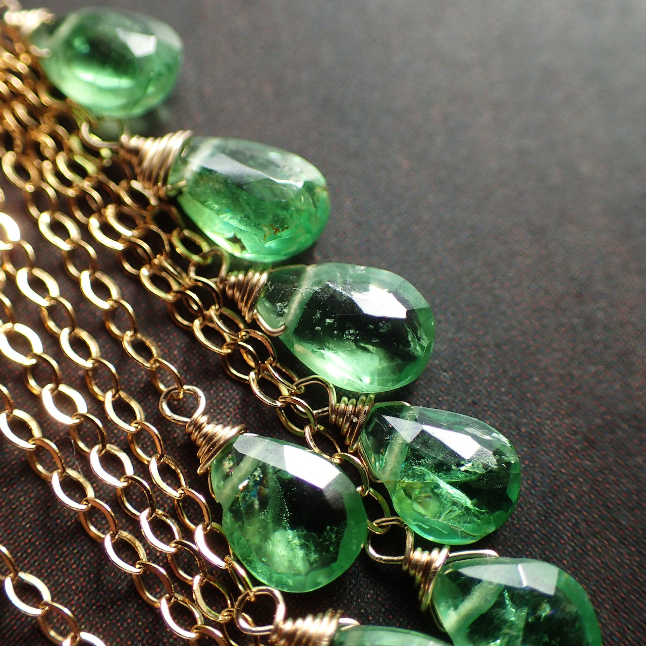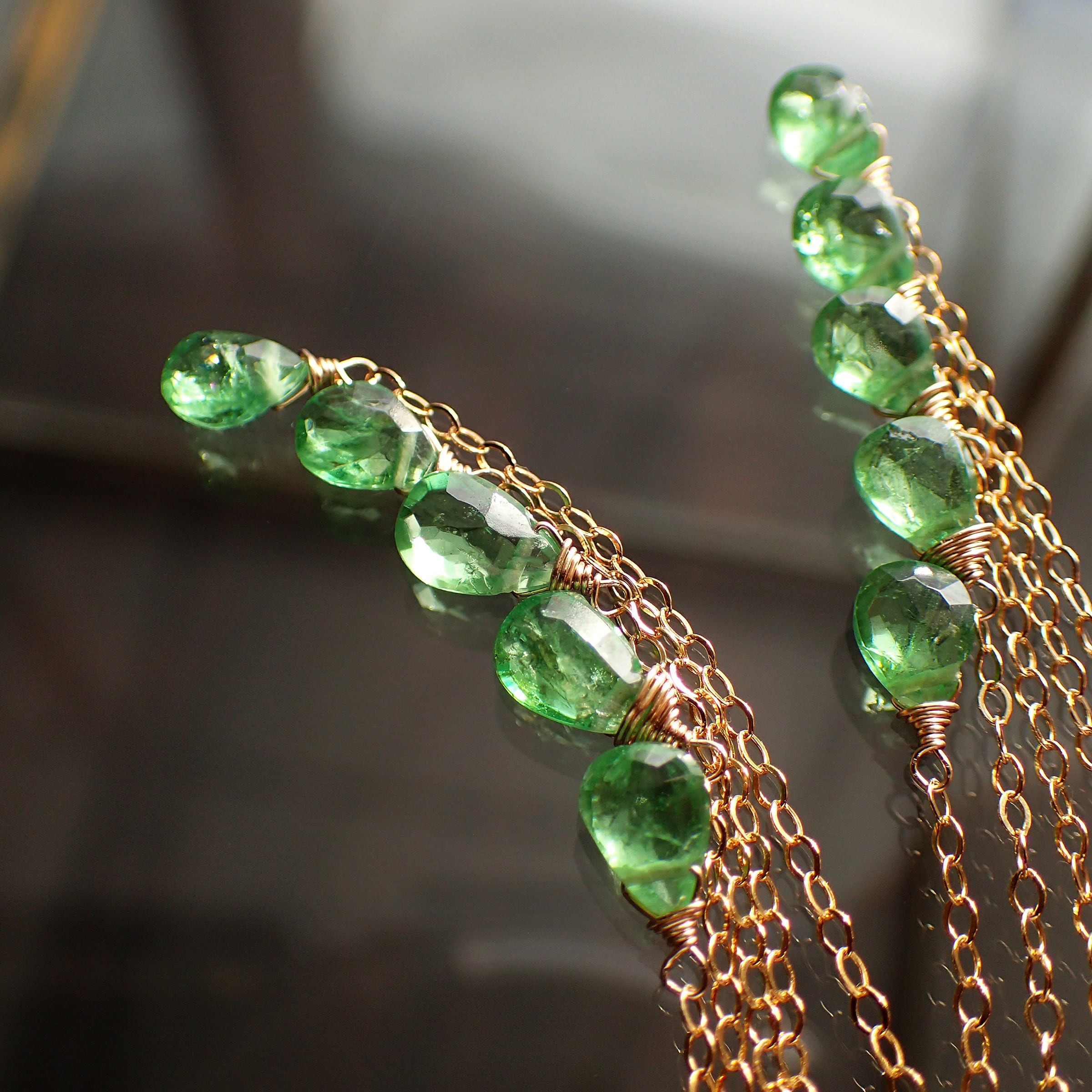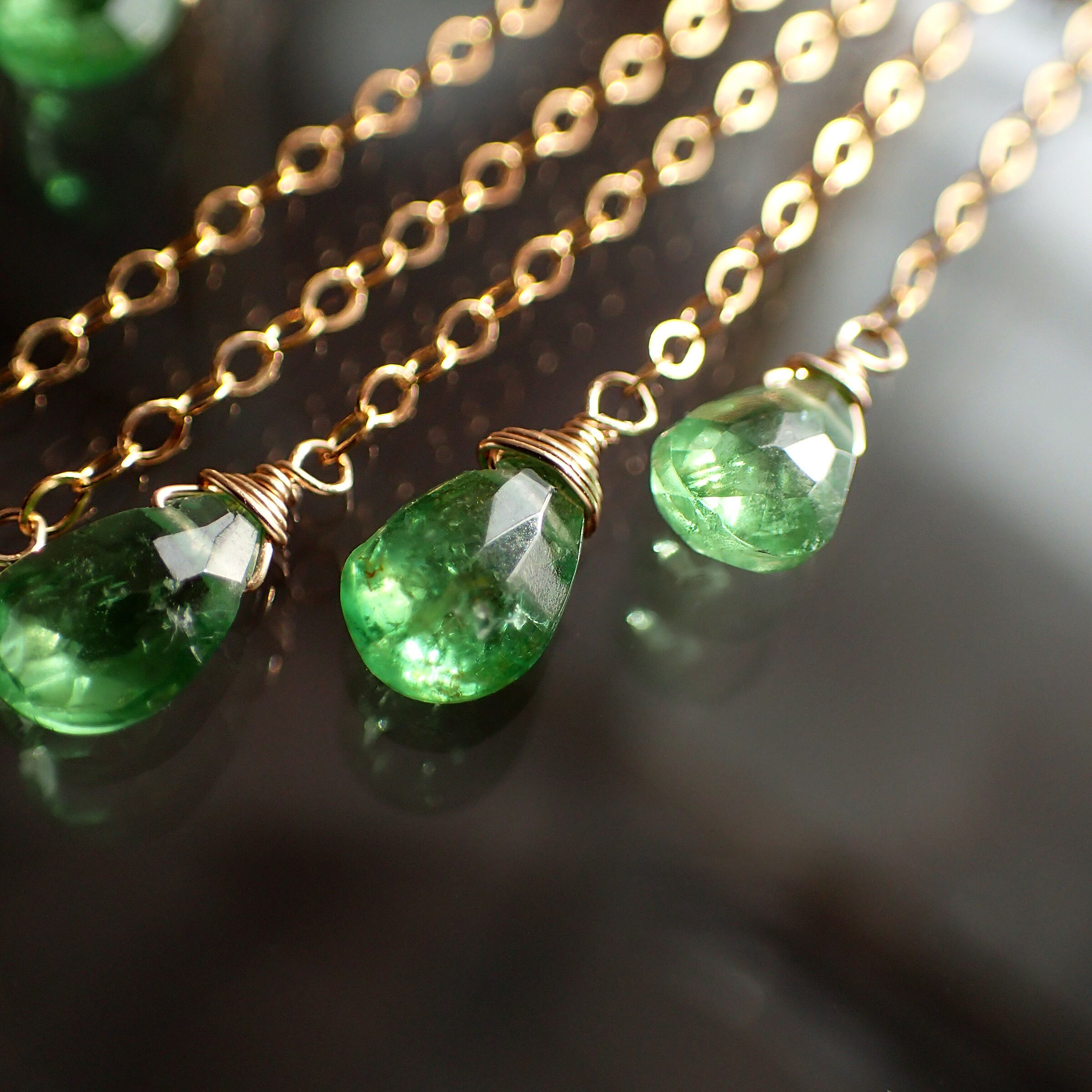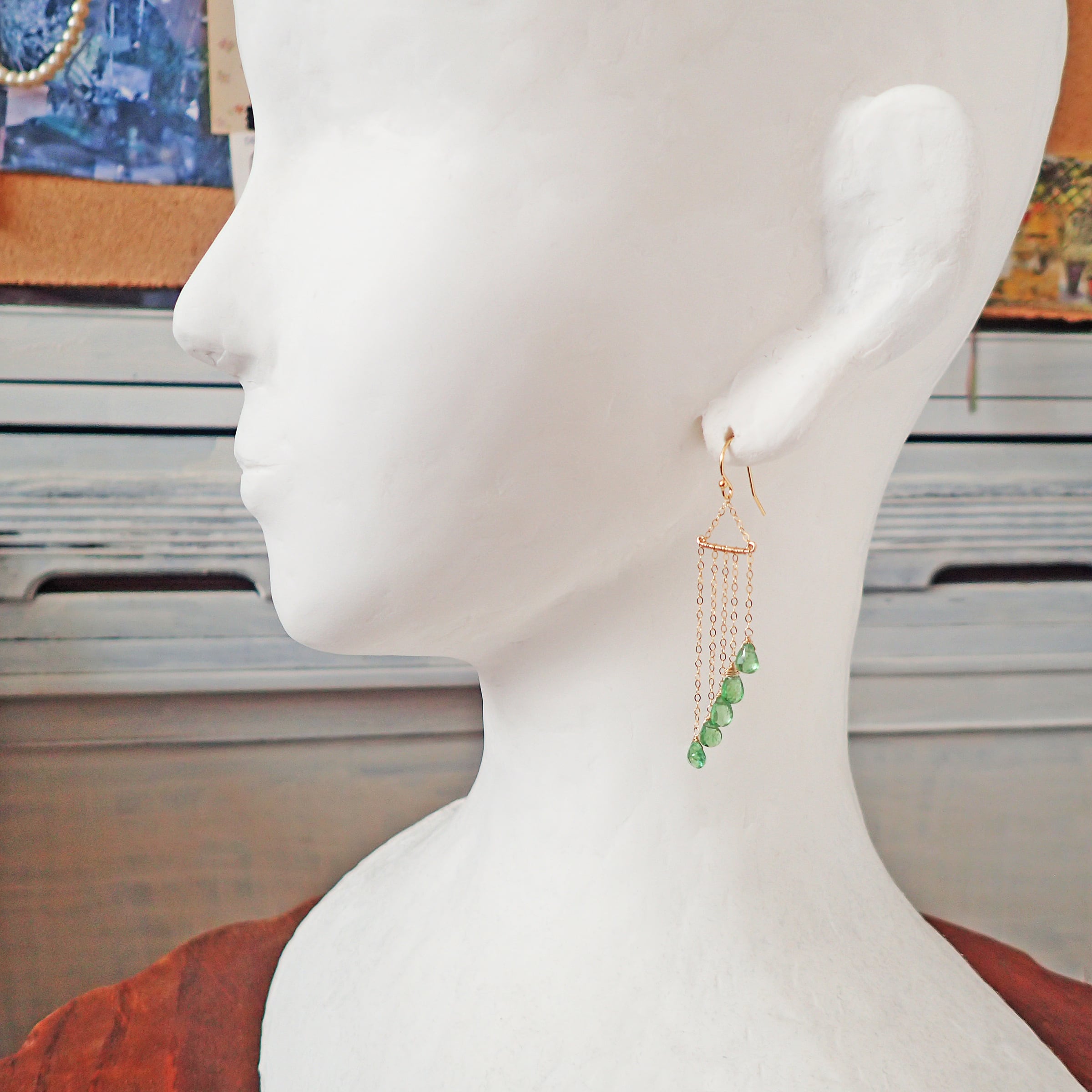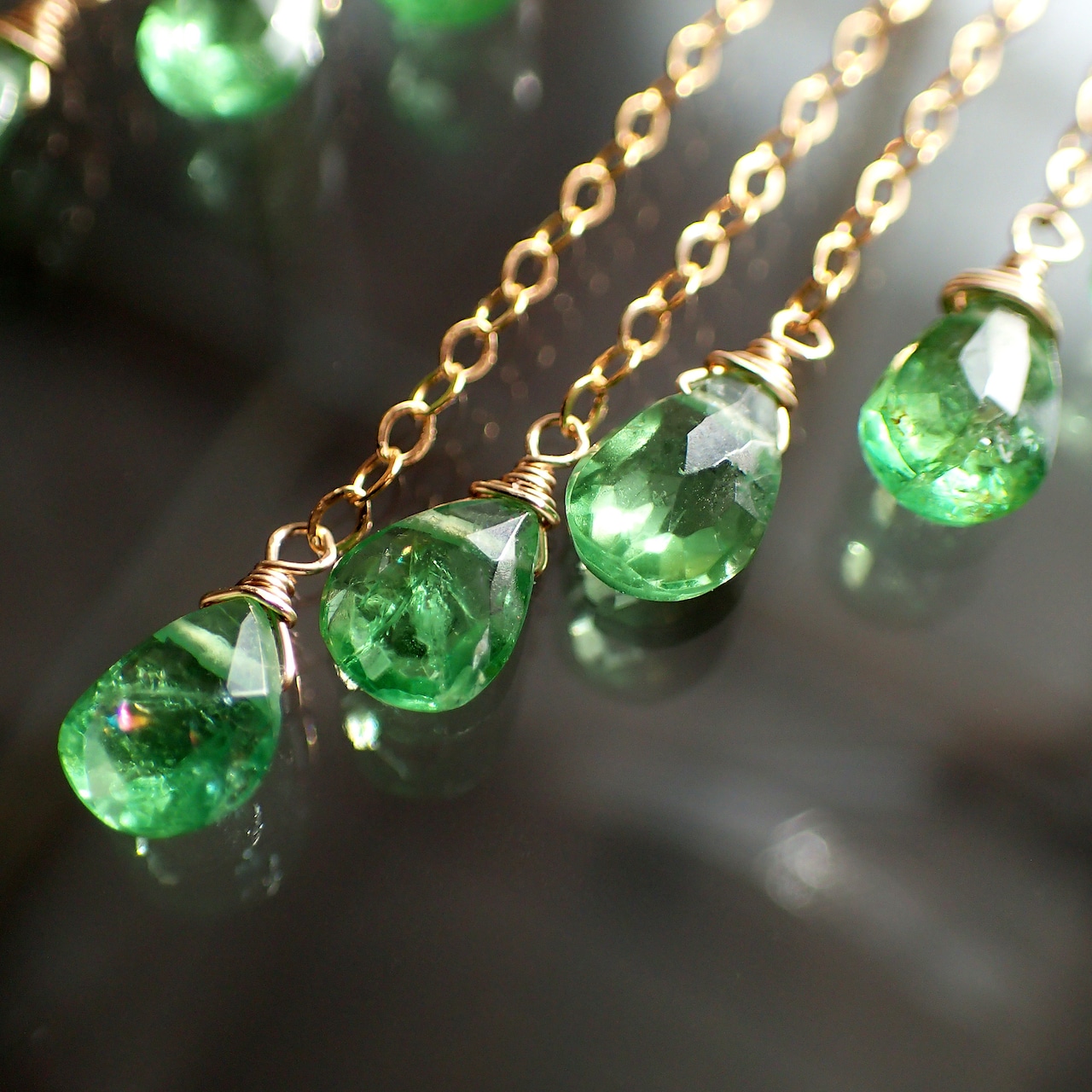 このグリーンガーネットのシャンデリアピアスは、瑞々しいグリーンガーネットの魅力が際立つ美しいアクセサリーです。