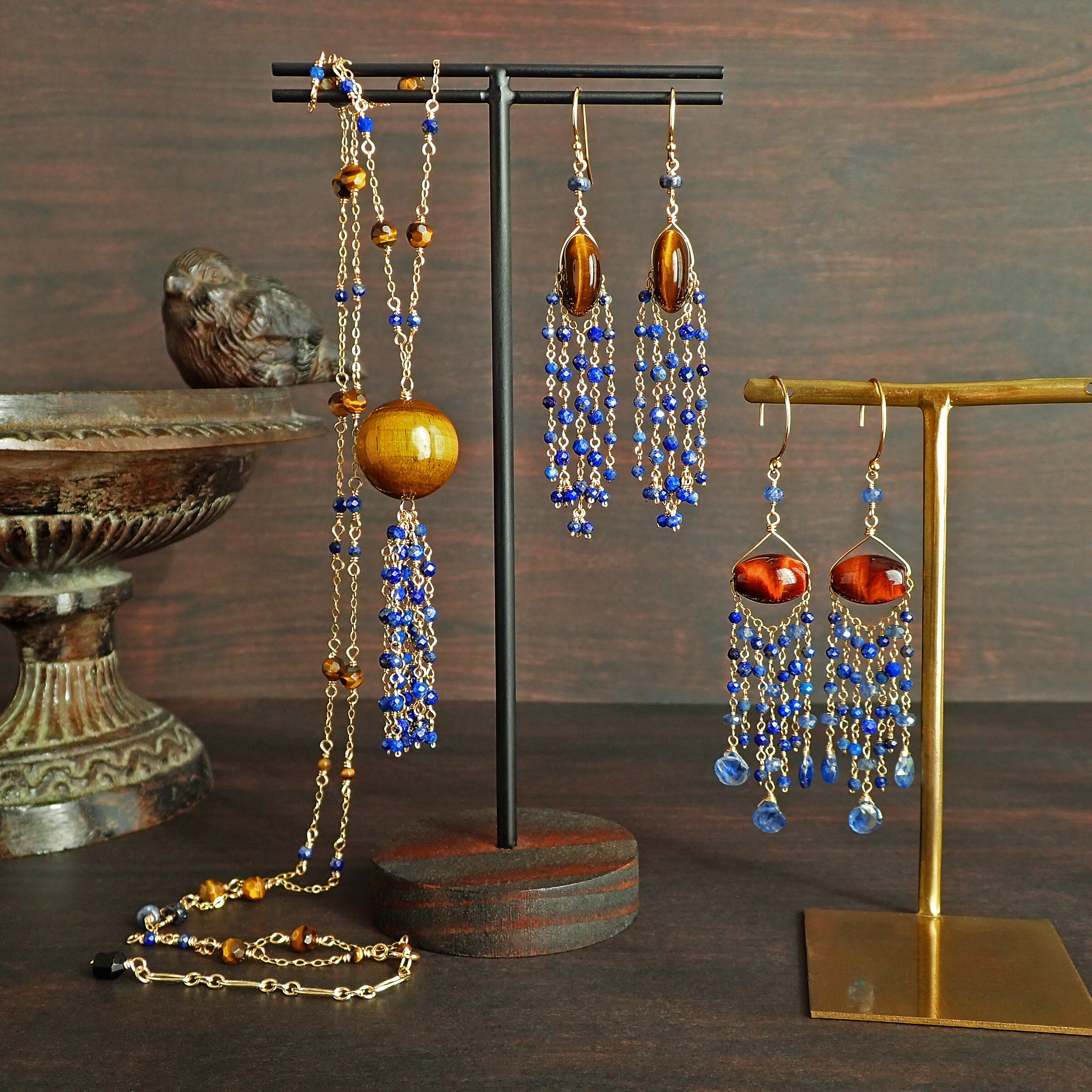 このロングシャンデリアピアスは、エレガンスを感じさせるレッドタイガーアイ、深いブルーが星月夜を思わせる魅力的なラピスラズリ、そしてサファイアとカヤナイトの美しさが調和した、贅沢で個性的なデザインが特長です。