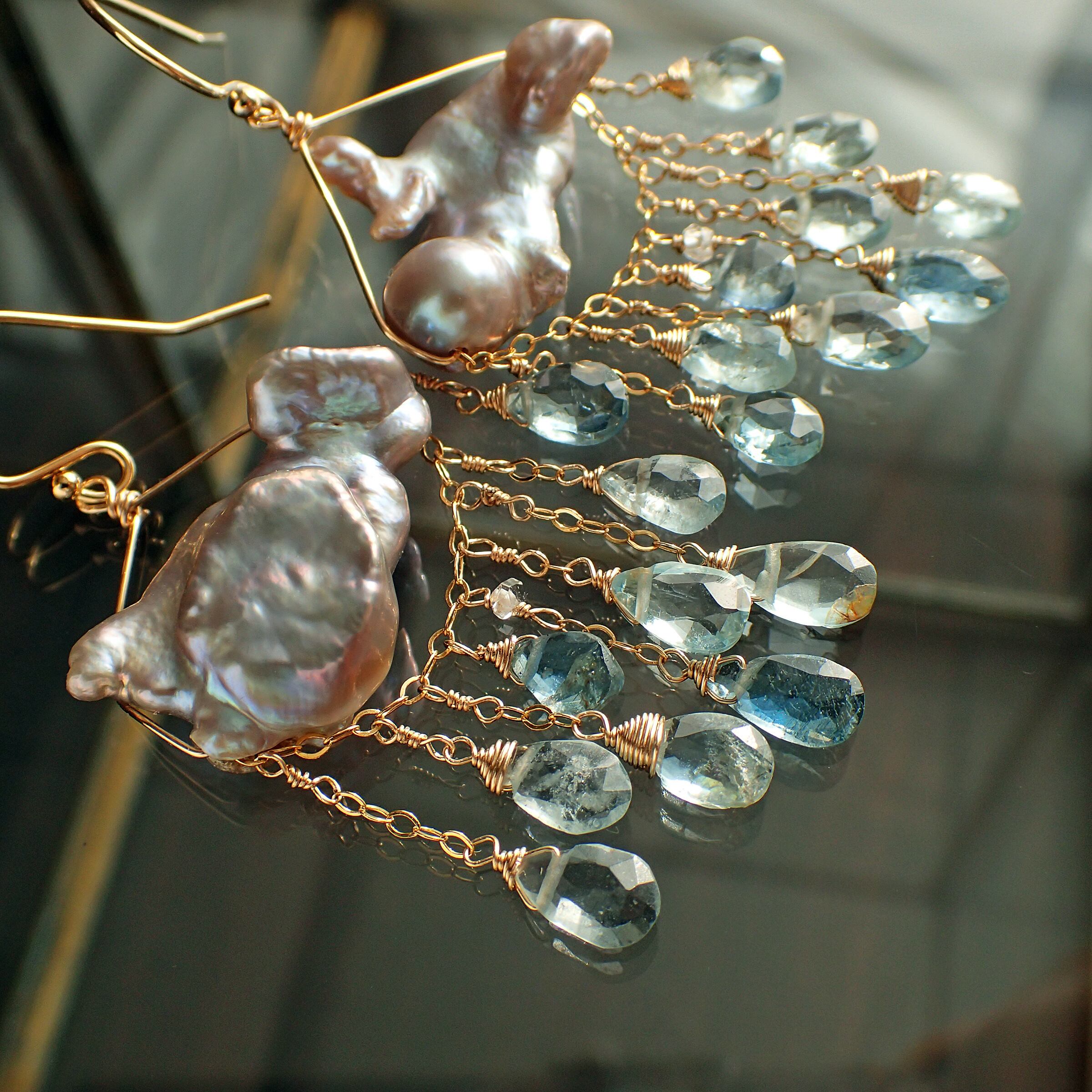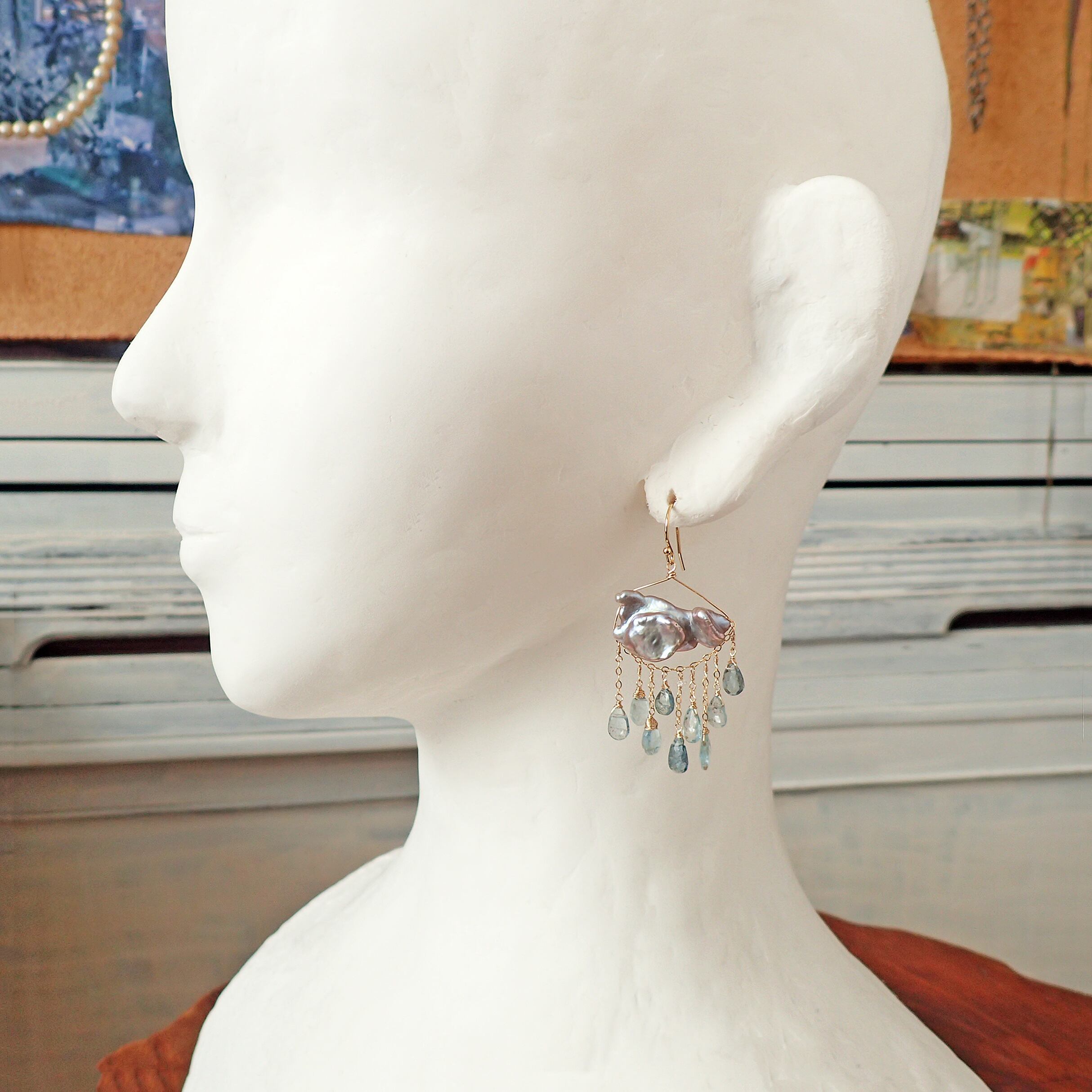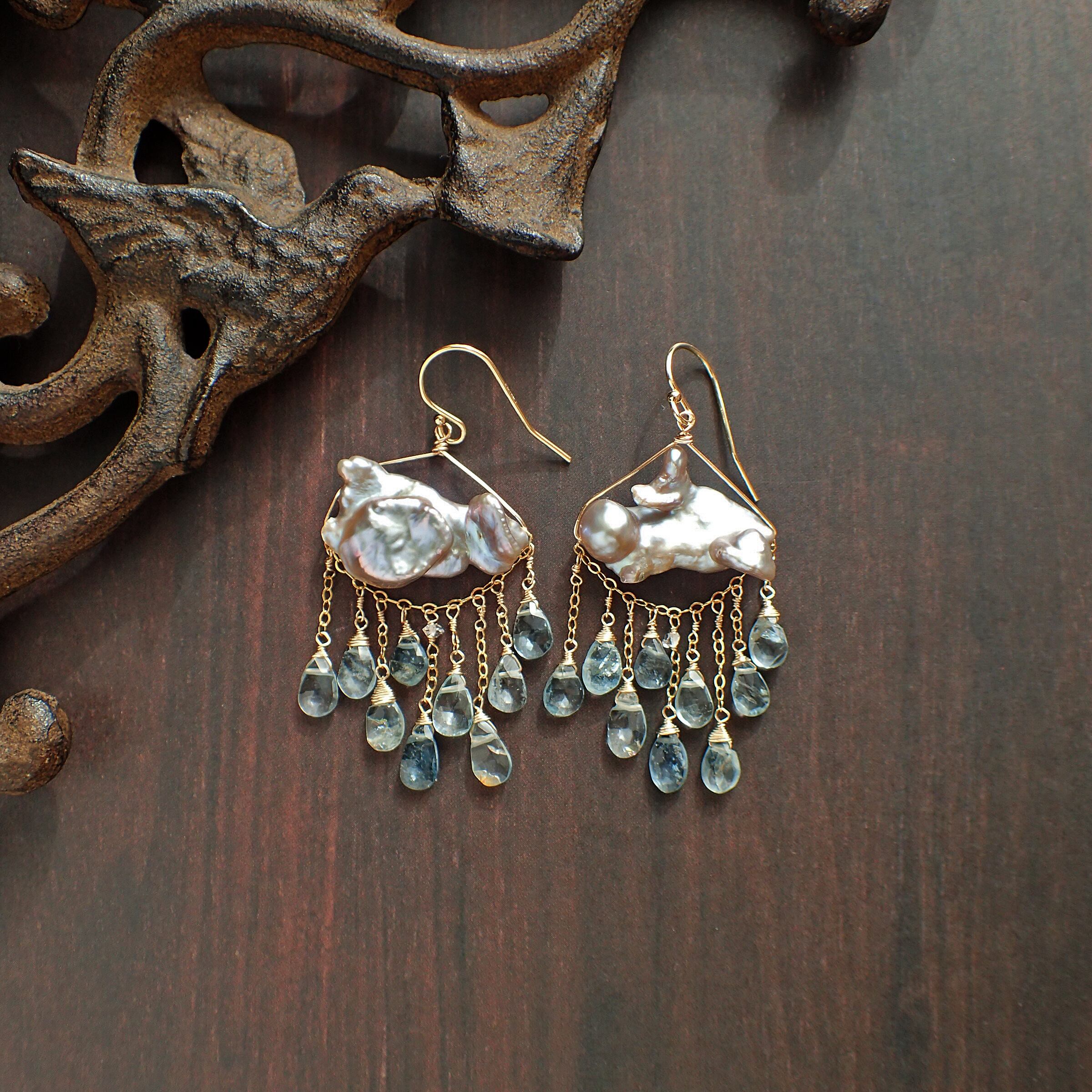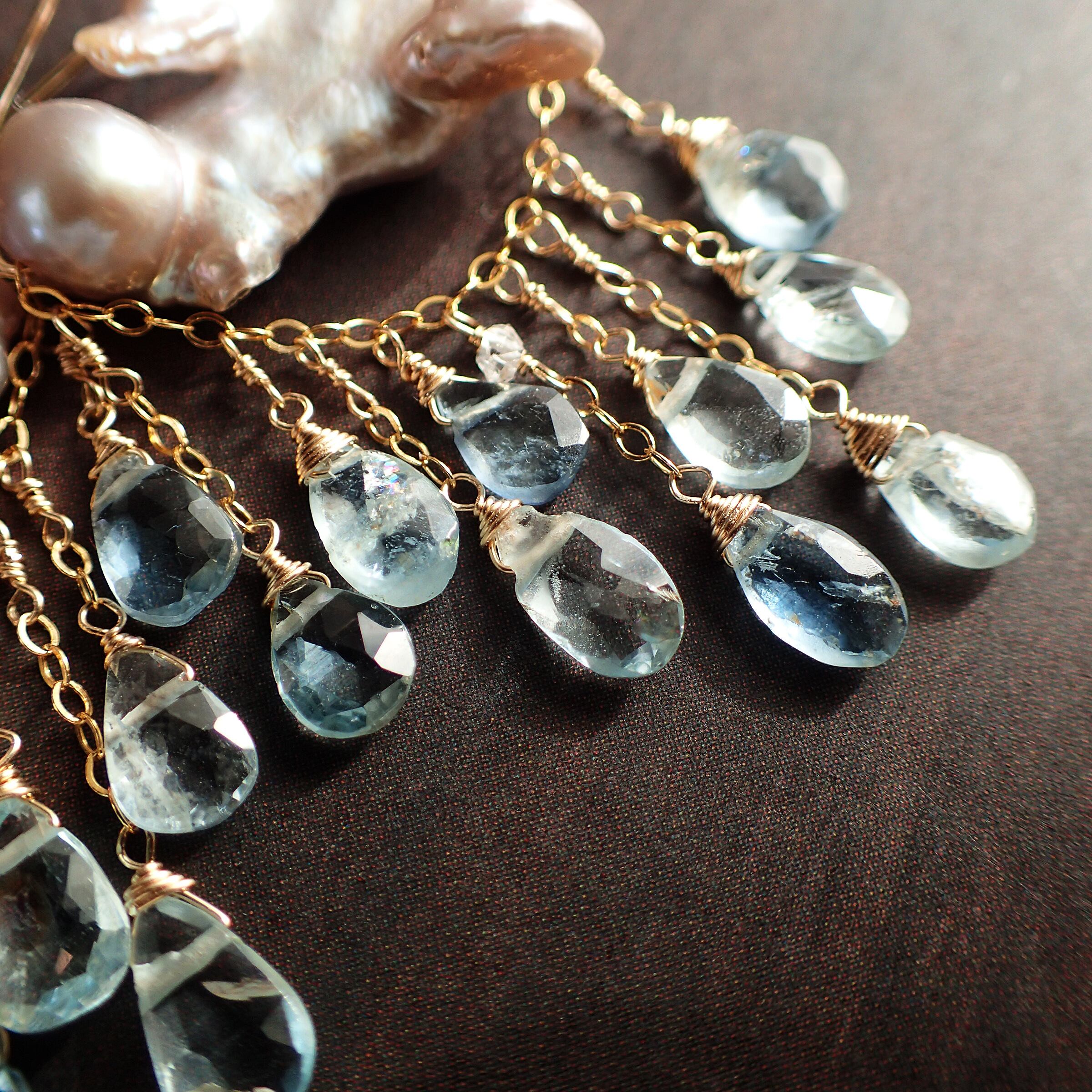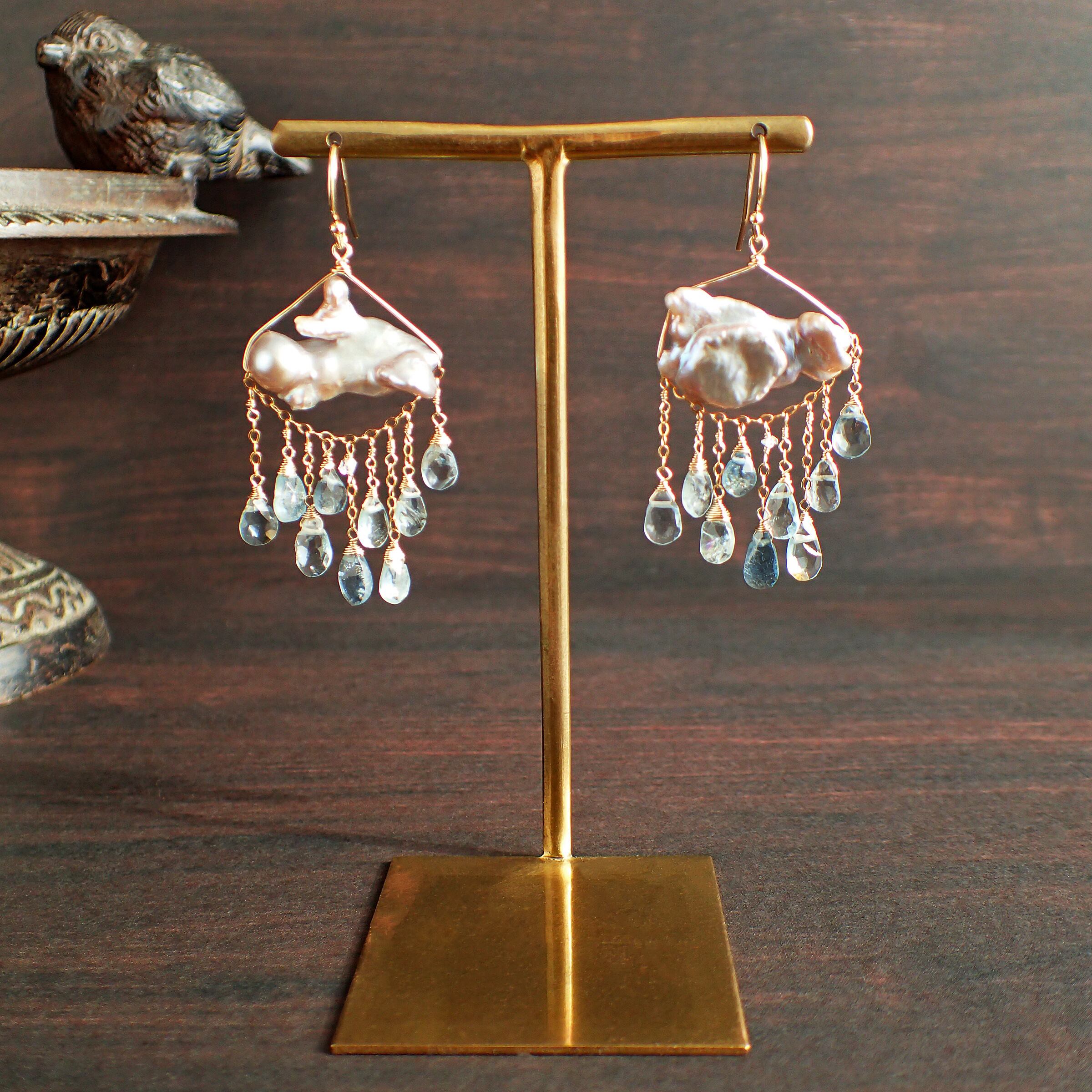 このピアスは、約5㎝の エレガントなデザインに淡水パールとアクアマリンを使用し、まるで春の雷鳴のような力強さと美しさが特長です。