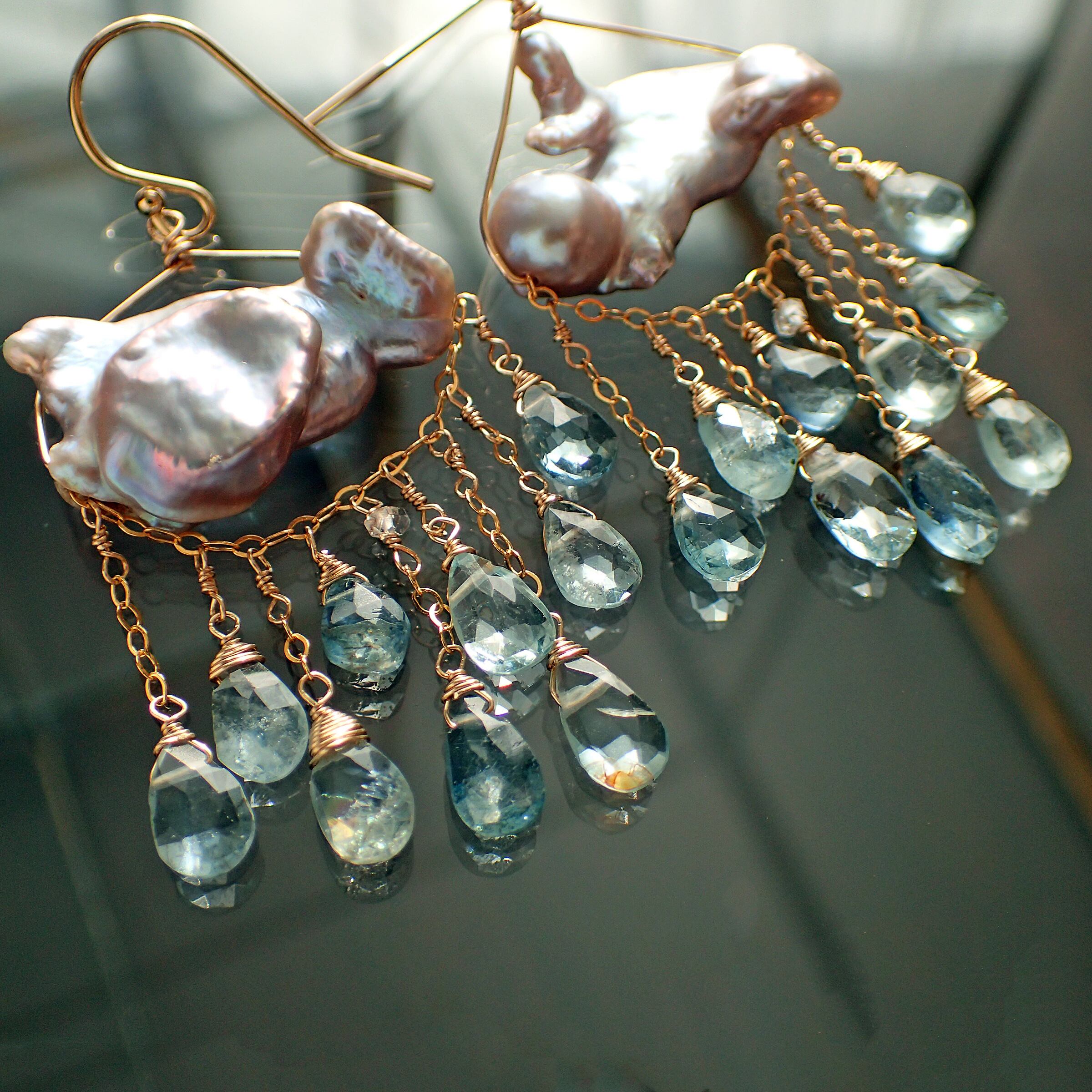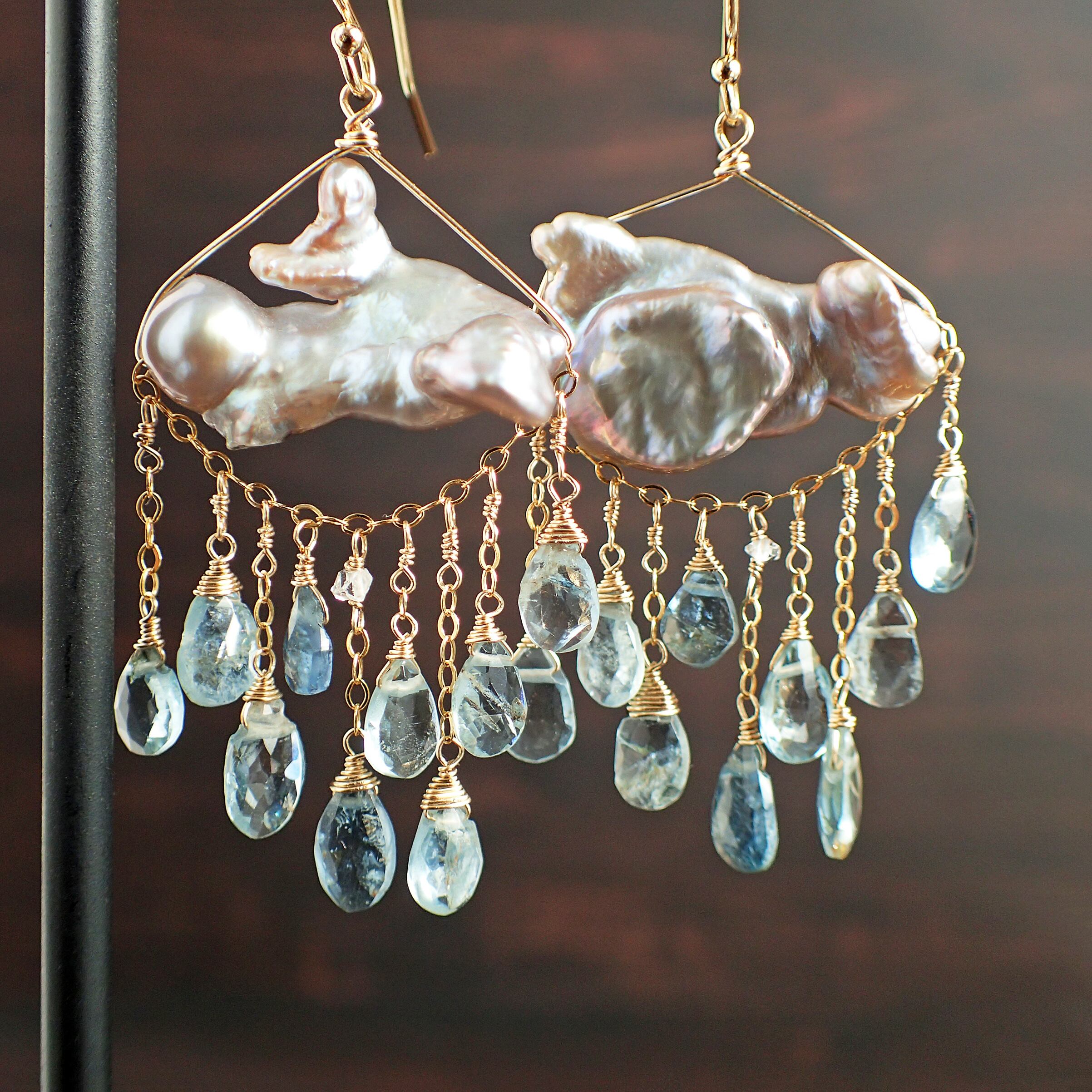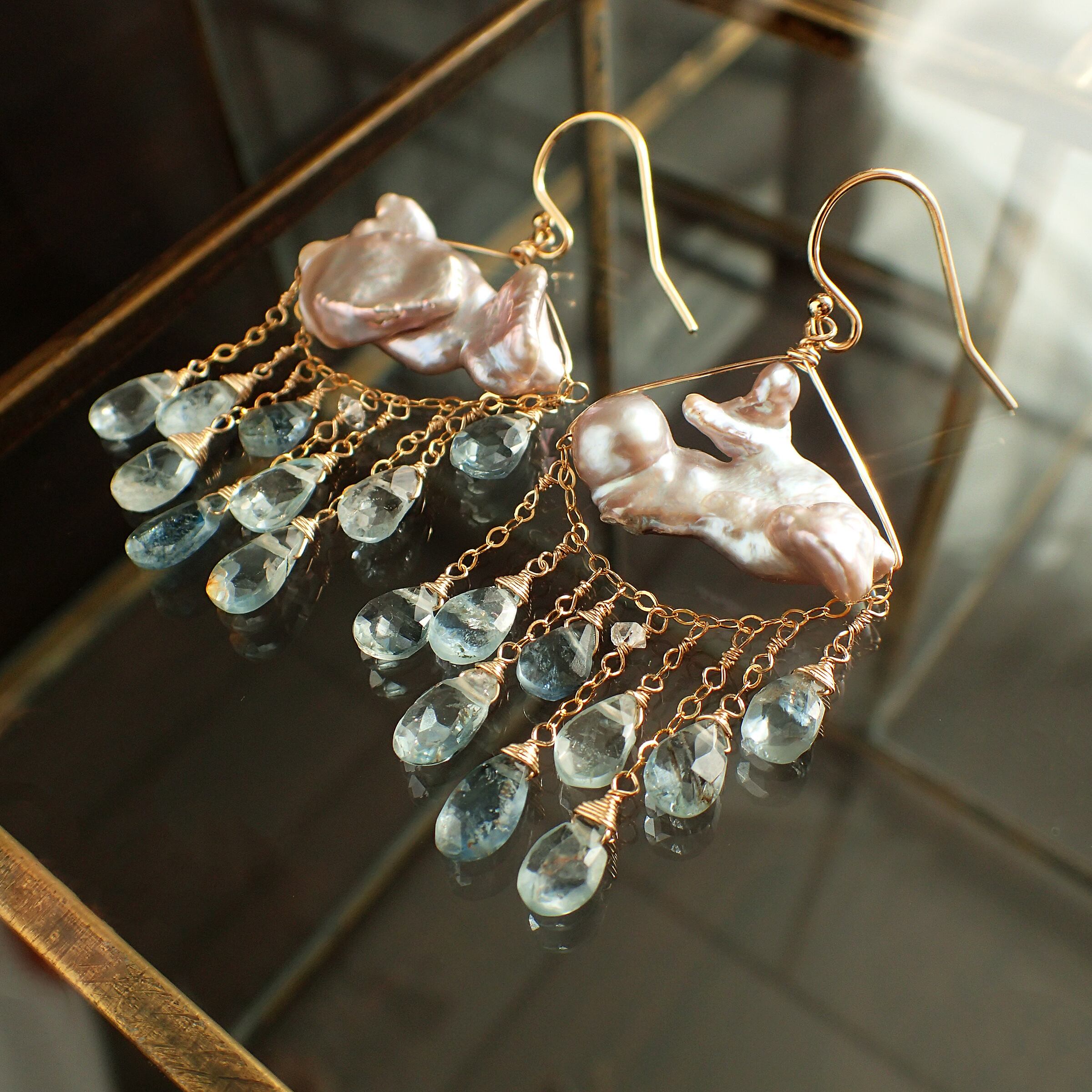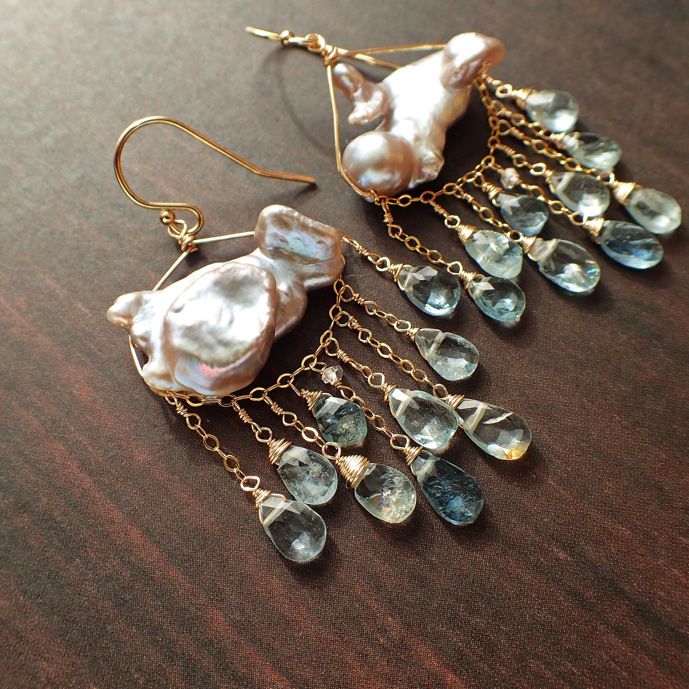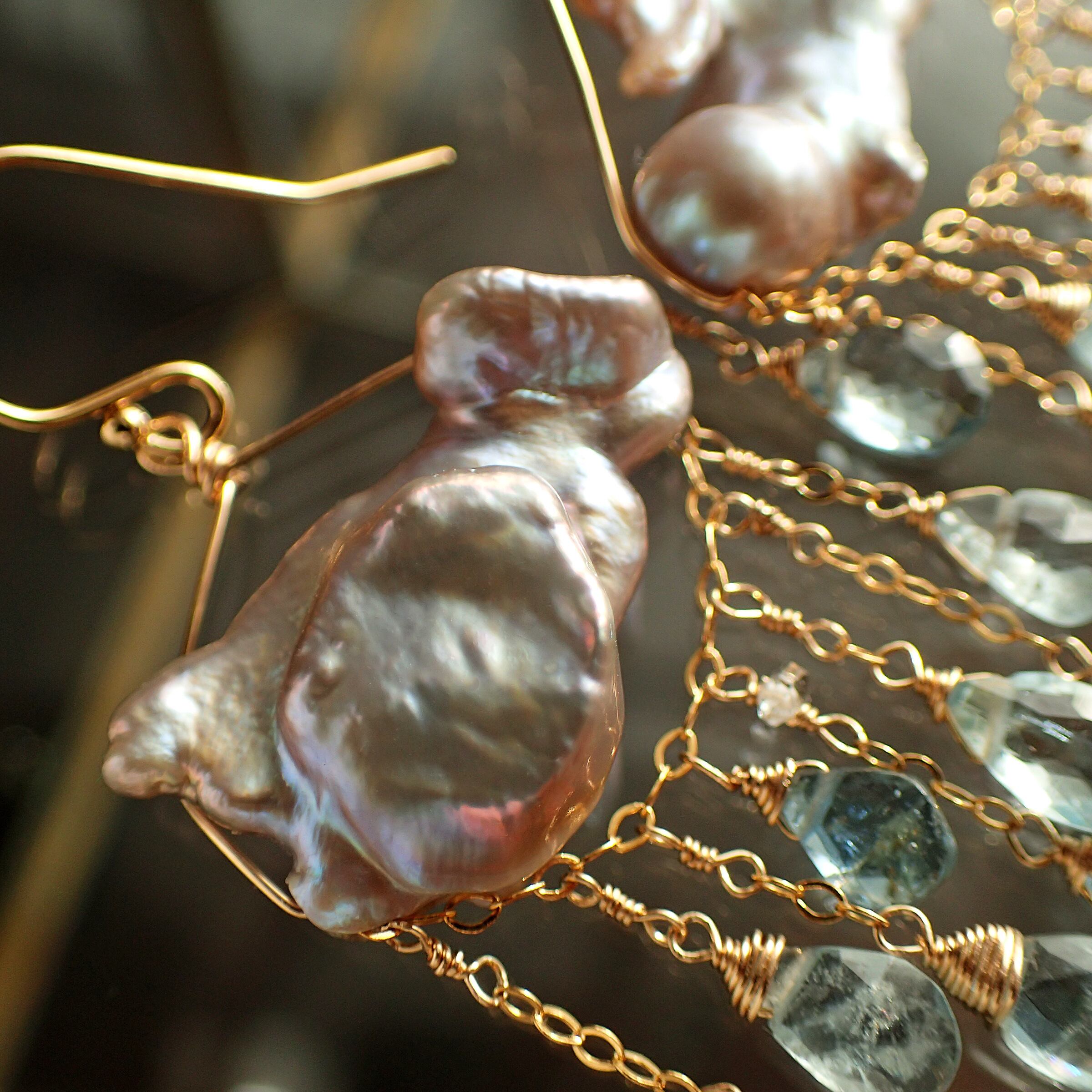 このピアスは、約5㎝の エレガントなデザインに淡水パールとアクアマリンを使用し、まるで春の雷鳴のような力強さと美しさが特長です。