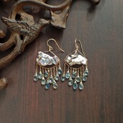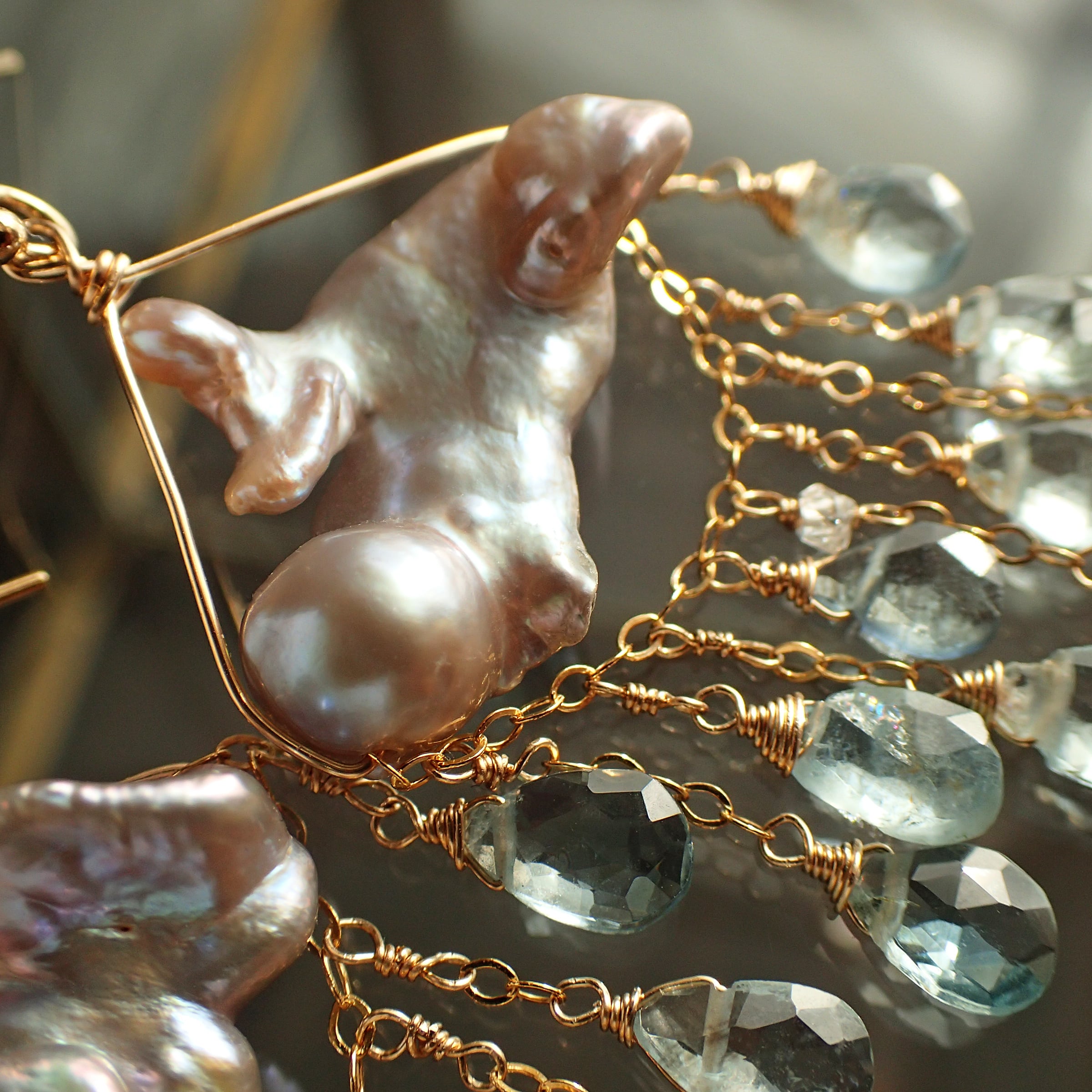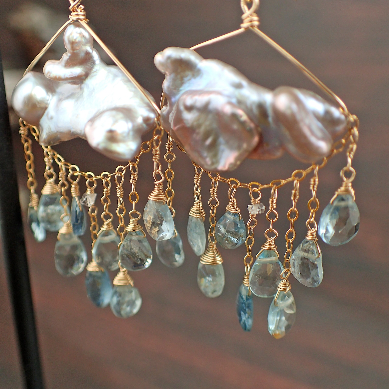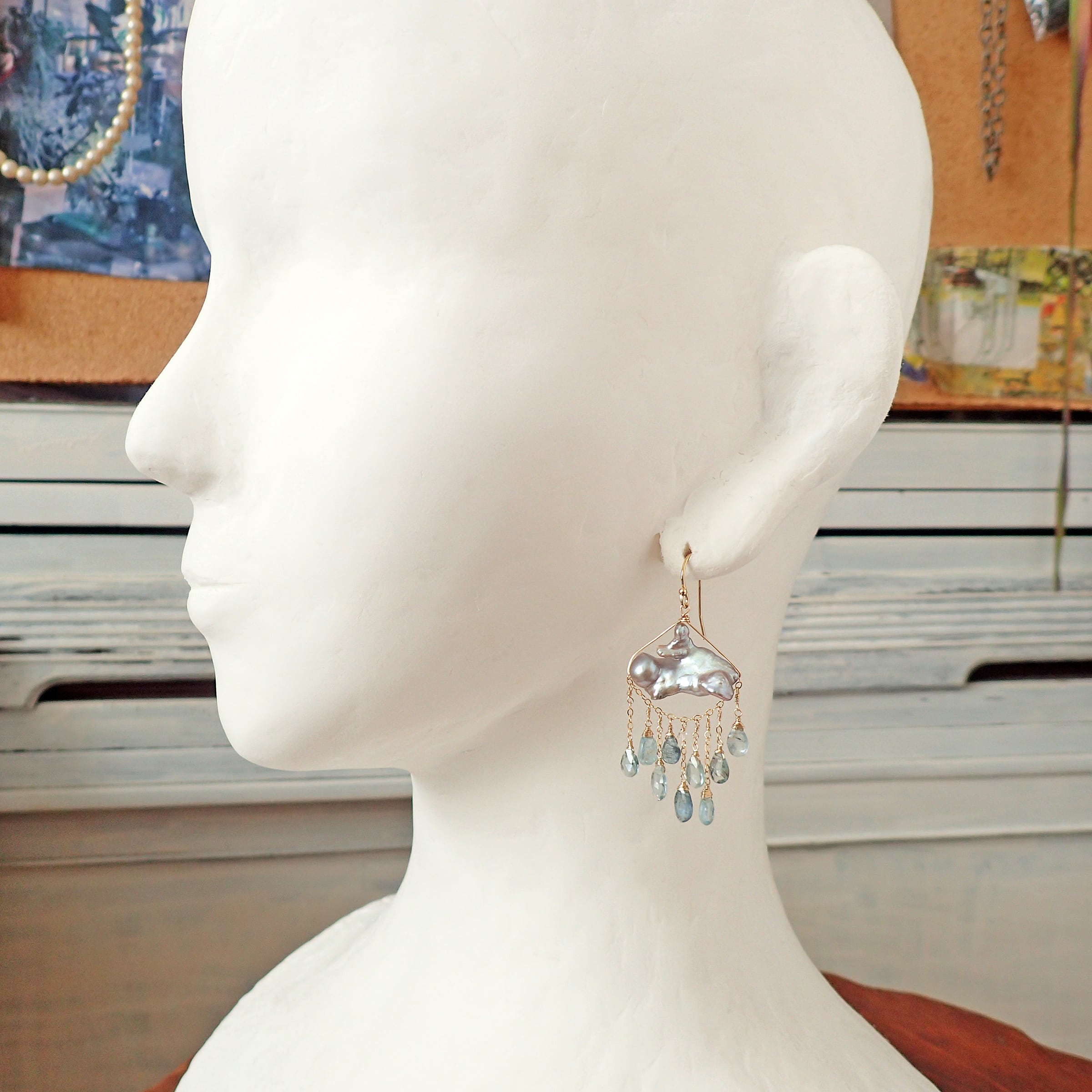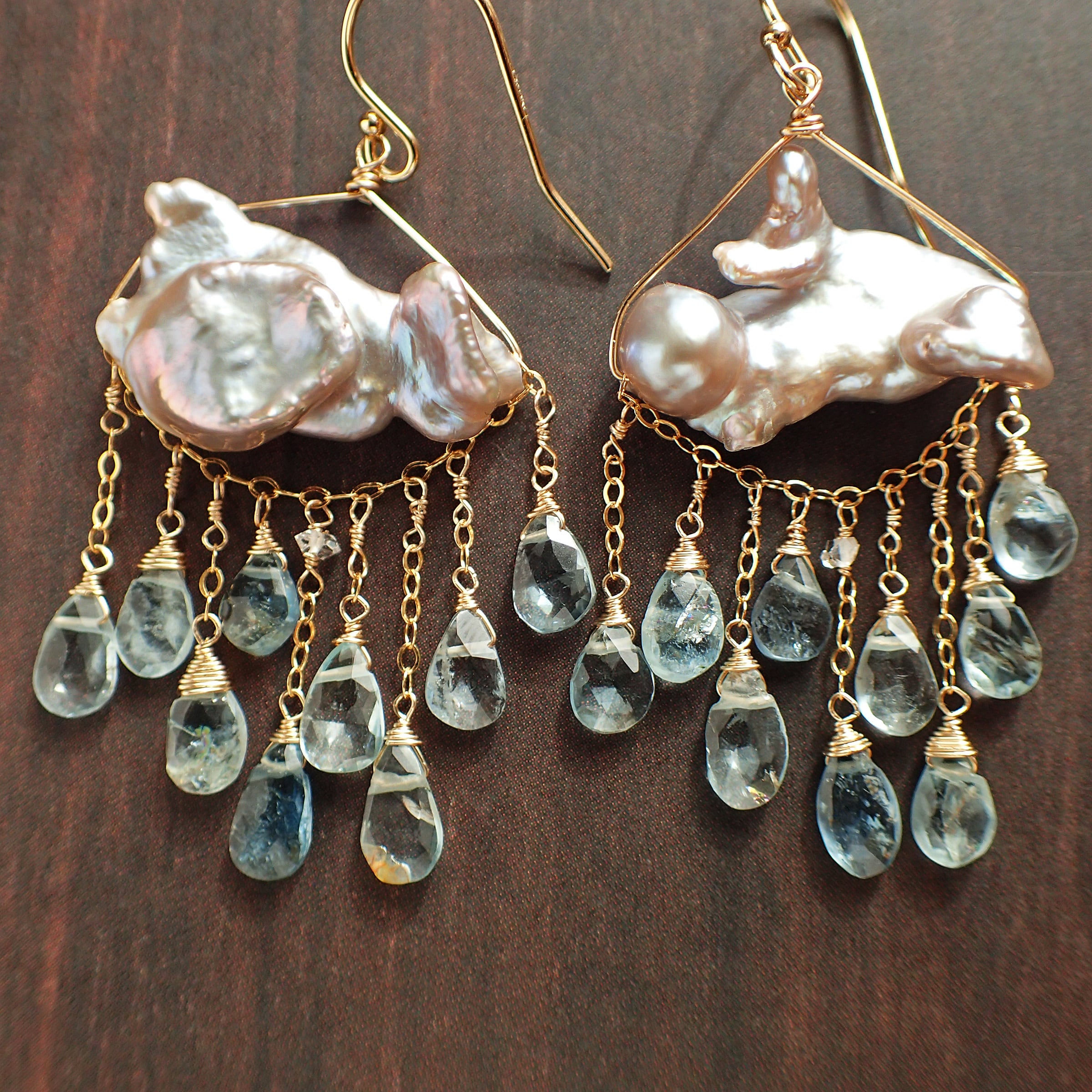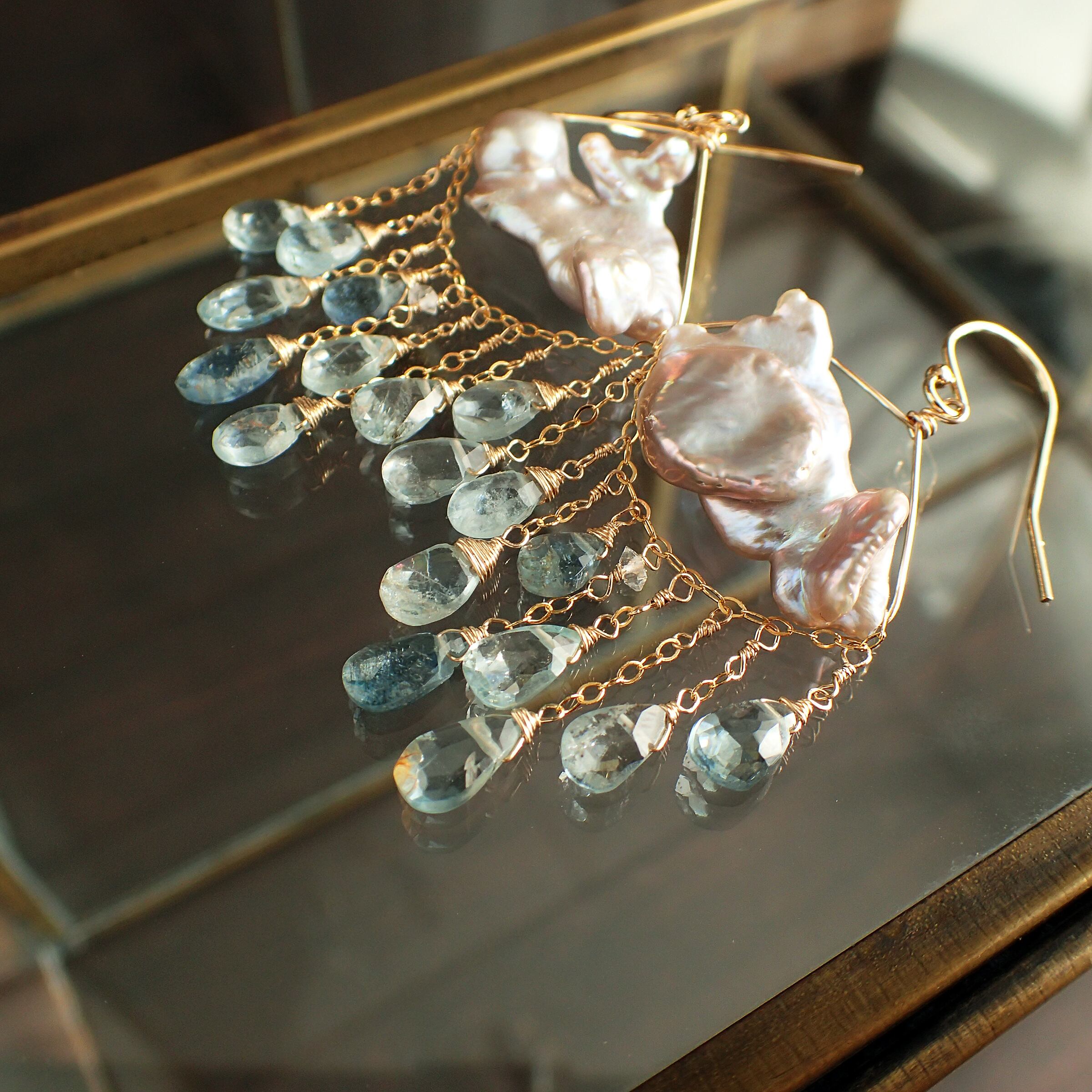 このピアスは、約5㎝の エレガントなデザインに淡水パールとアクアマリンを使用し、まるで春の雷鳴のような力強さと美しさが特長です。