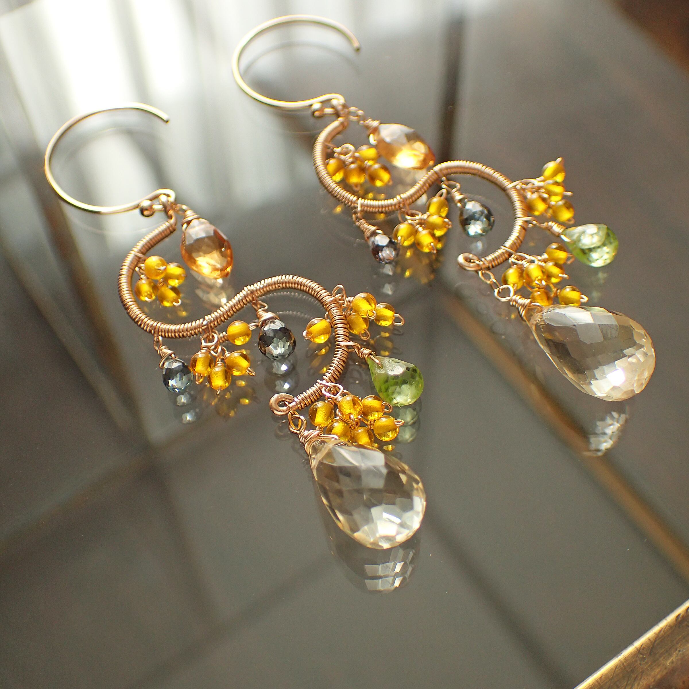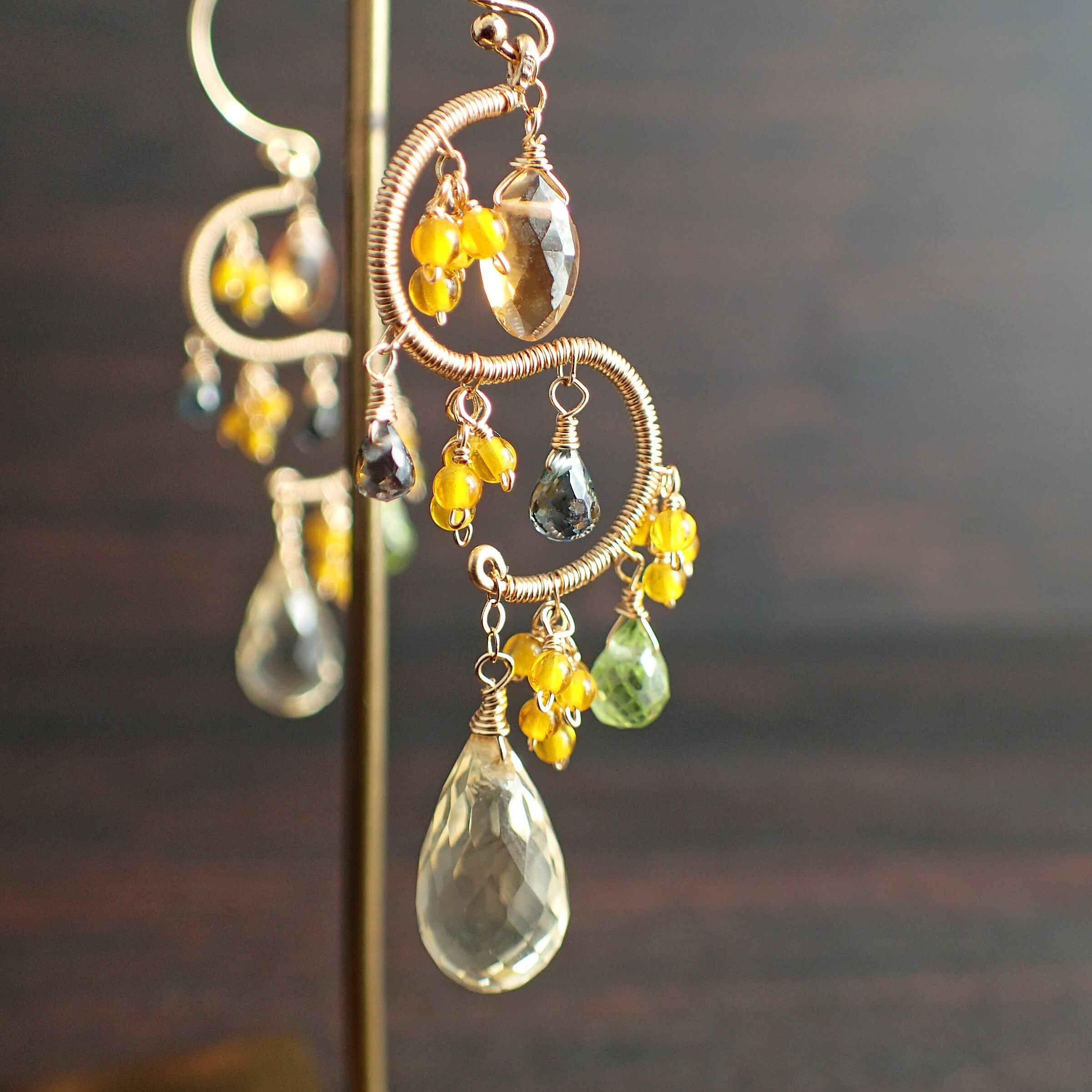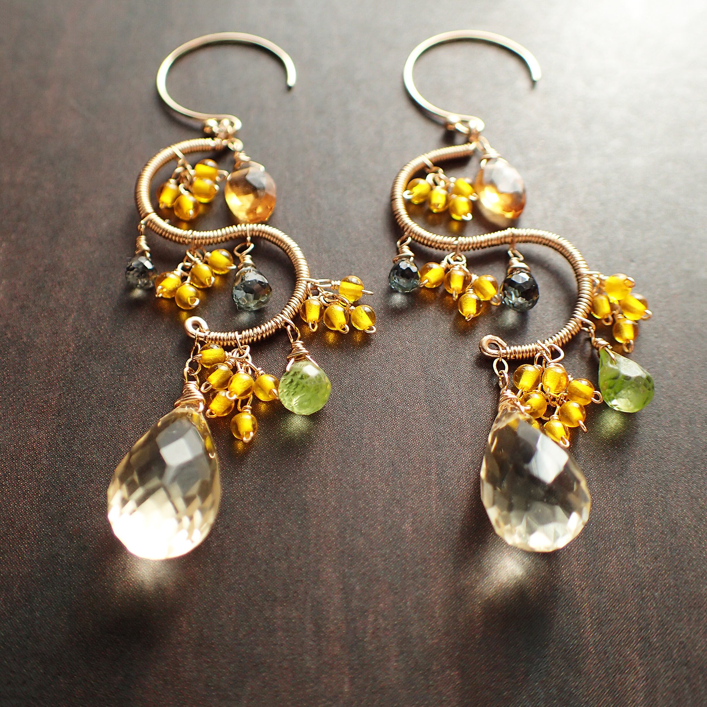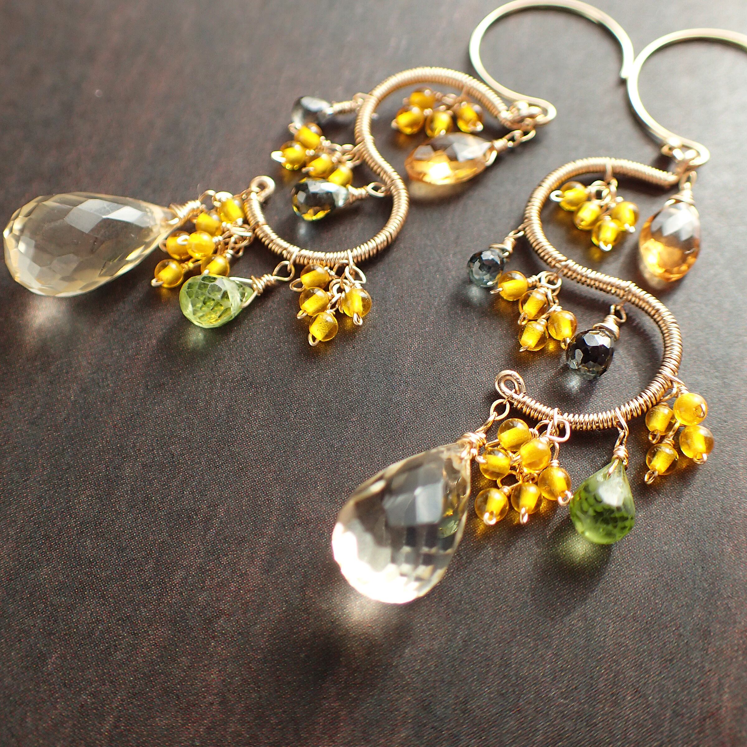 この美しいシャンデリアピアスは、約5.6㎝のエレガントなデザインで、シトリン、ペリドット、グリーンサファイアを使用した特別なアクセサリーです。