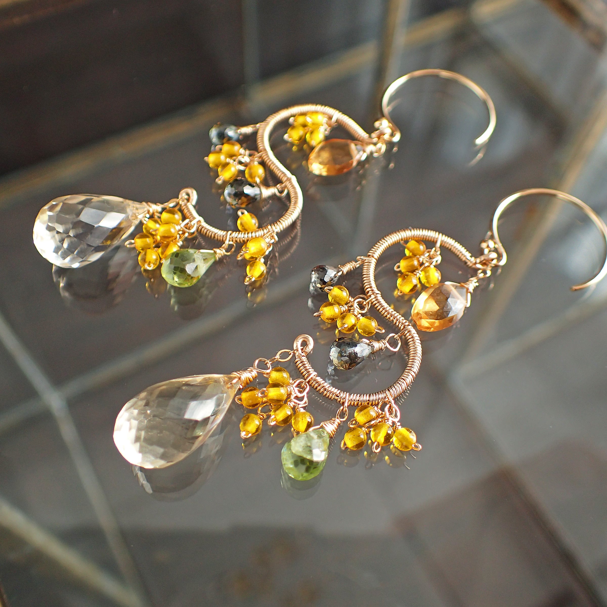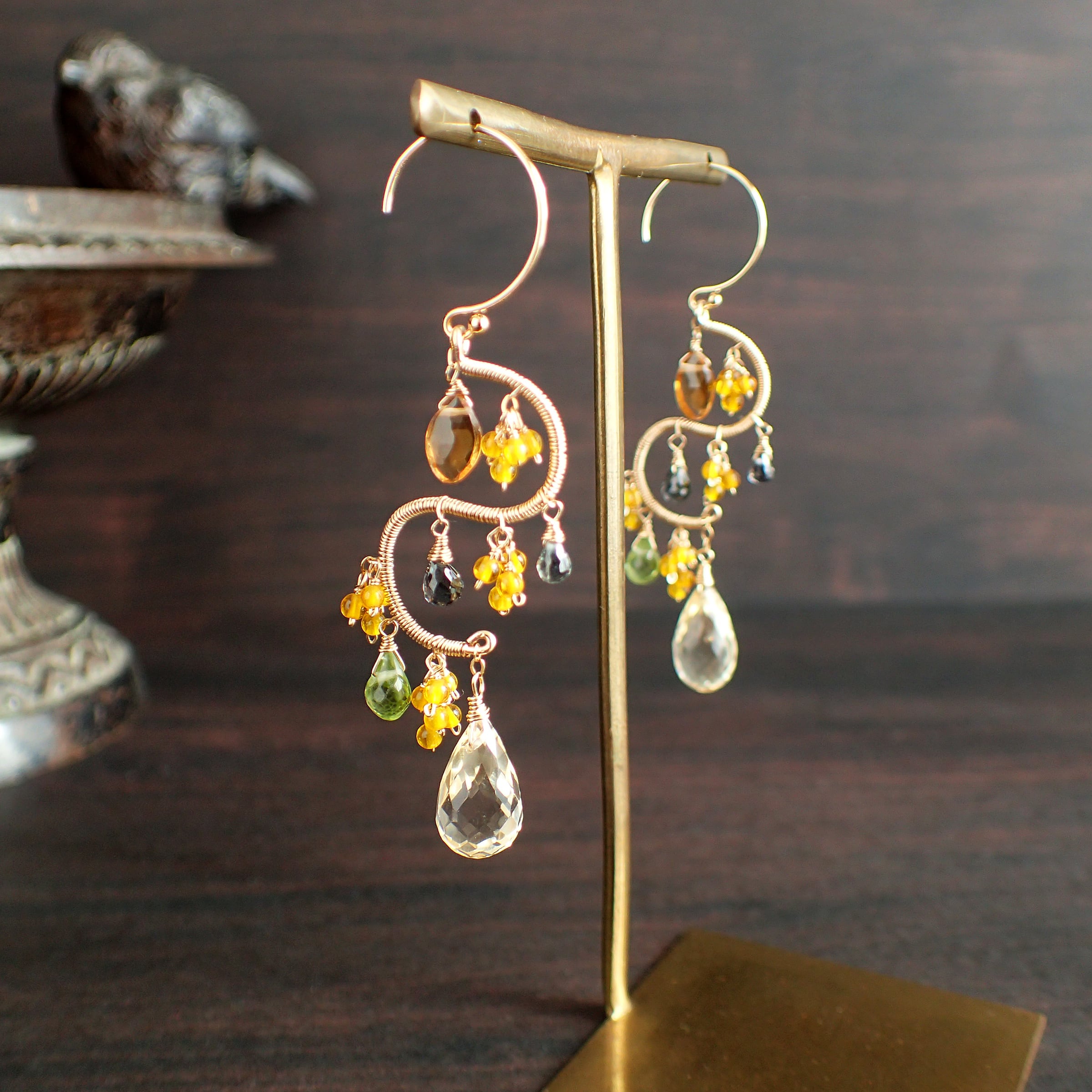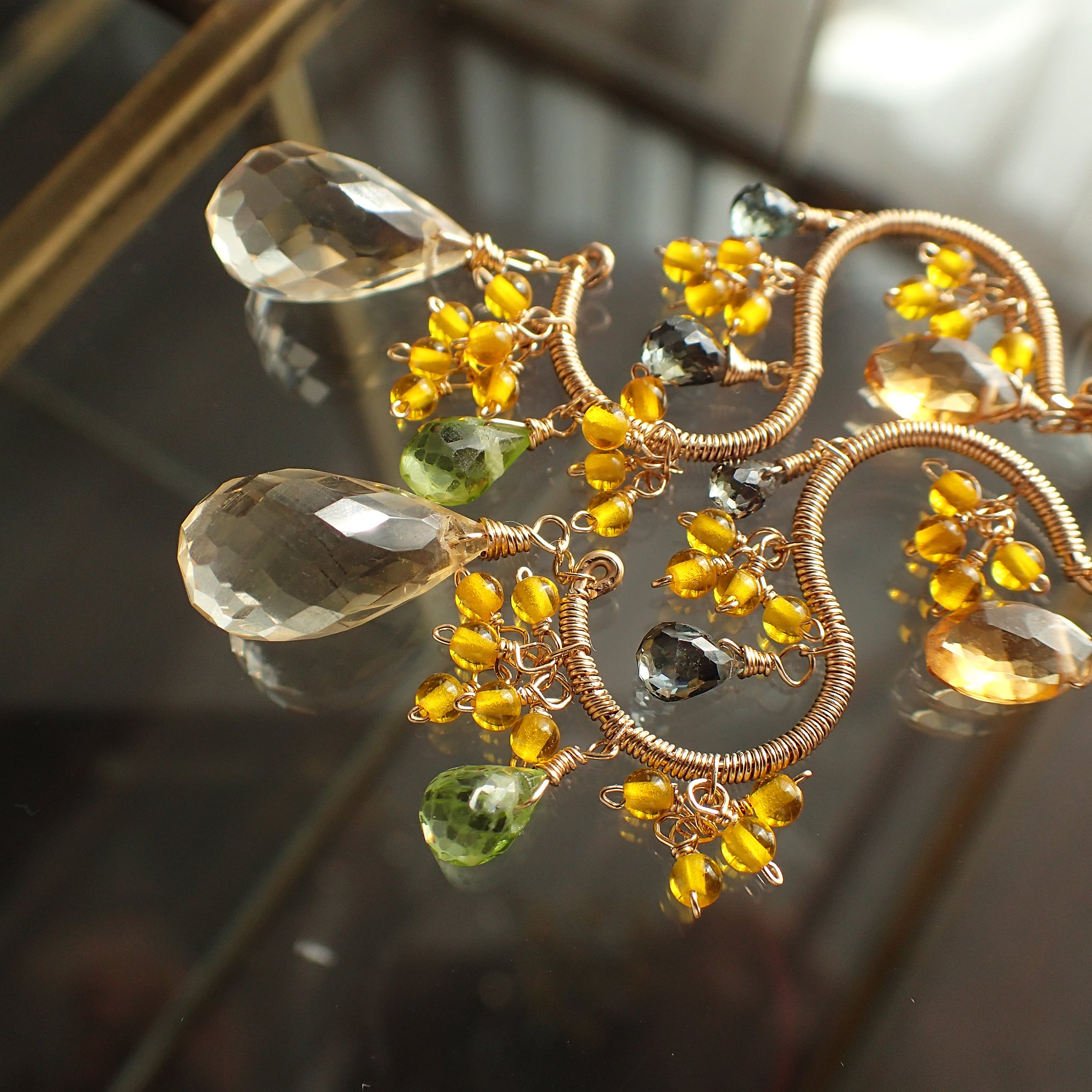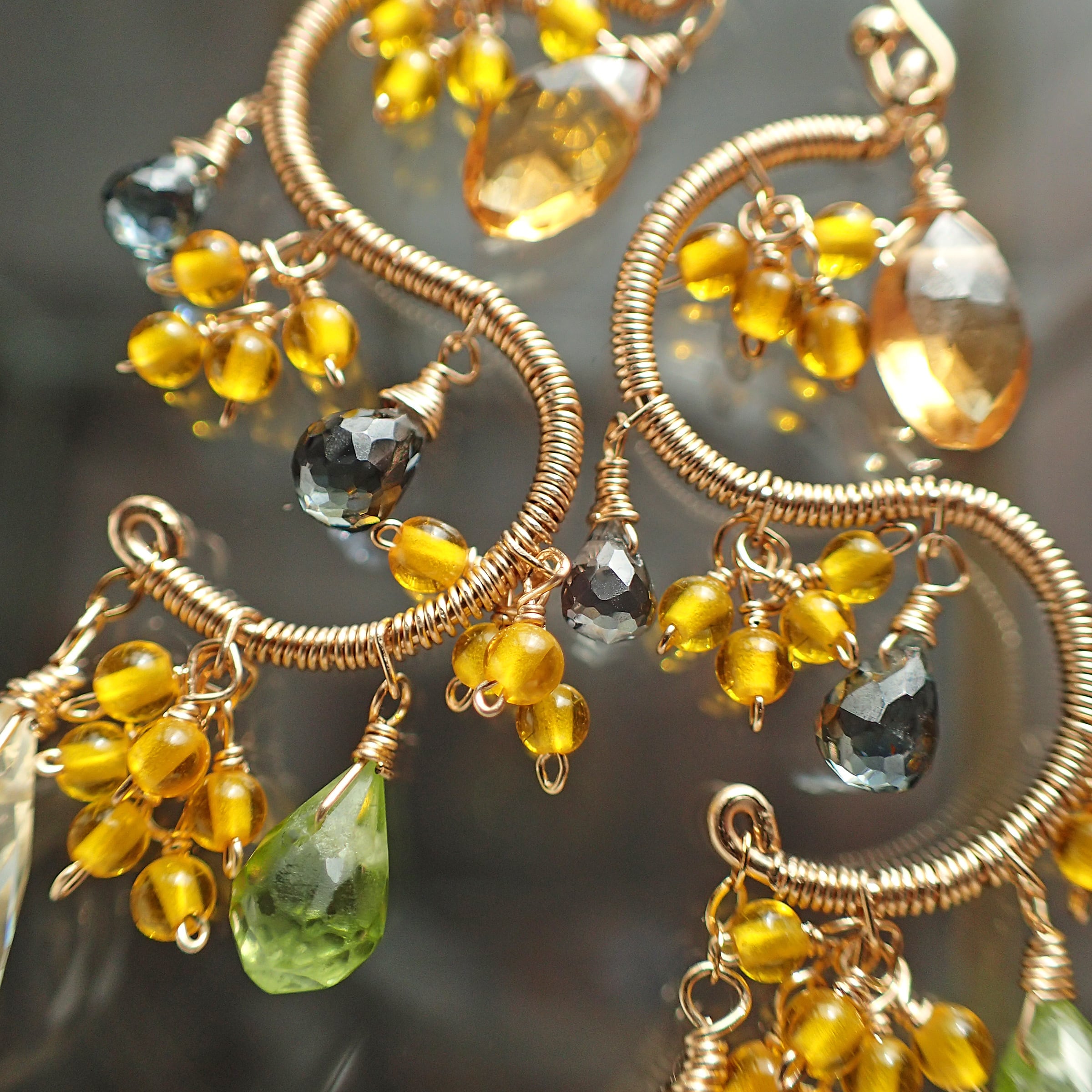 この美しいシャンデリアピアスは、約5.6㎝のエレガントなデザインで、シトリン、ペリドット、グリーンサファイアを使用した特別なアクセサリーです。