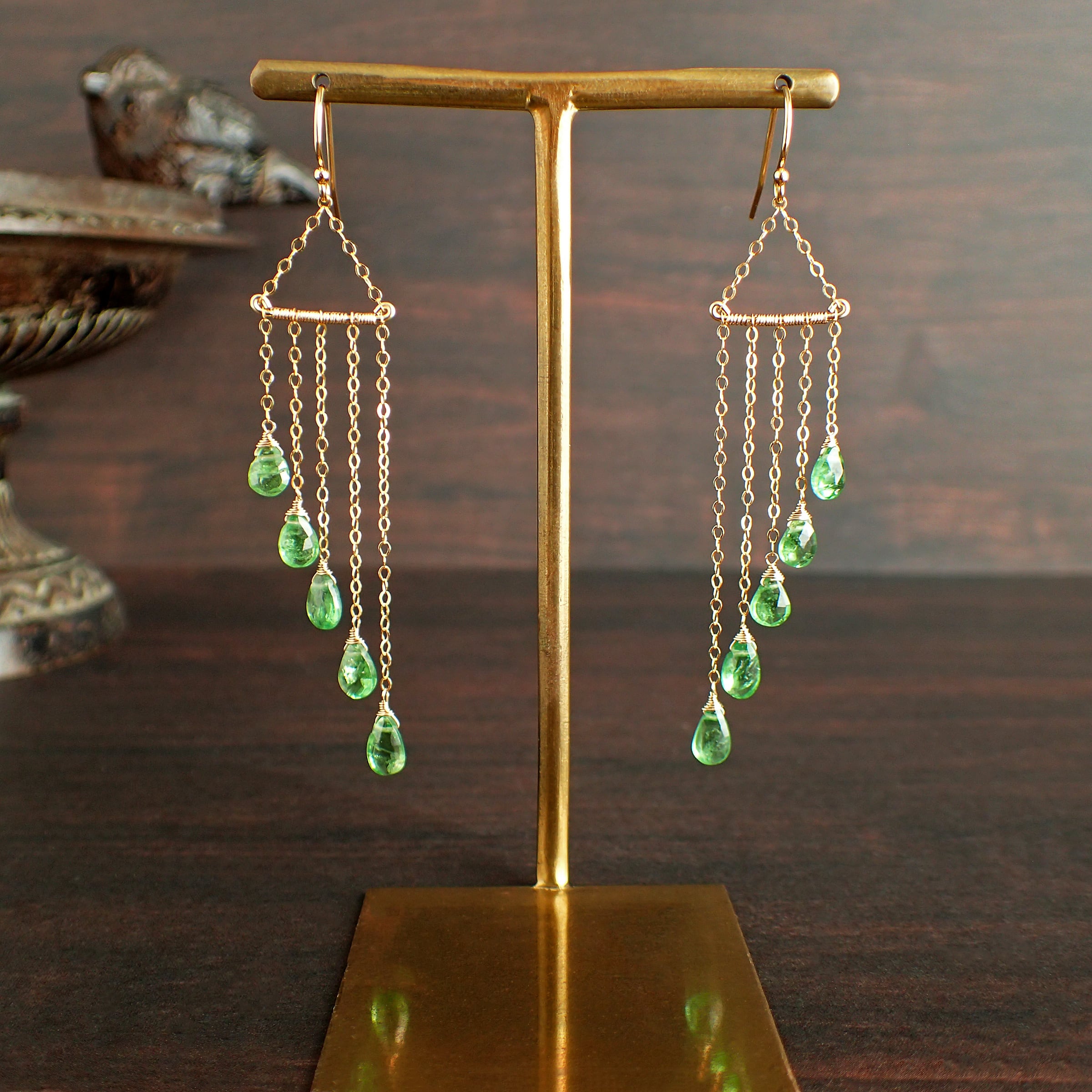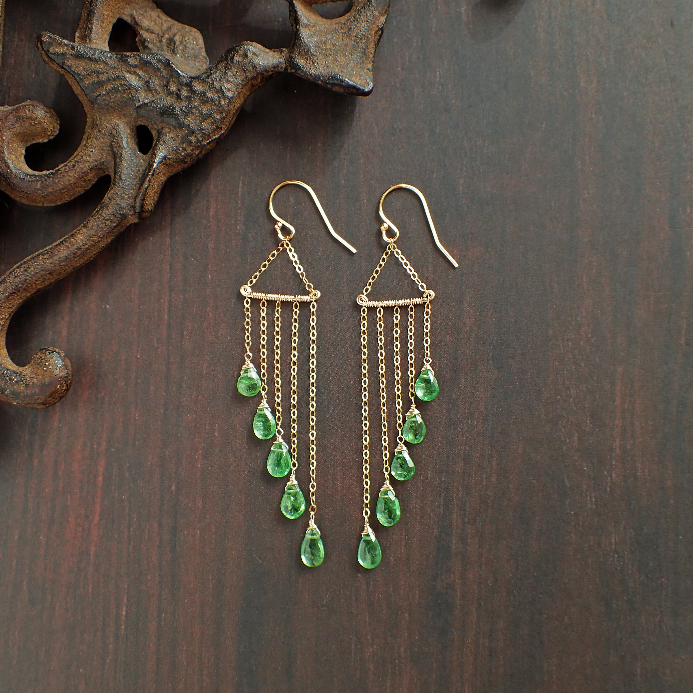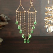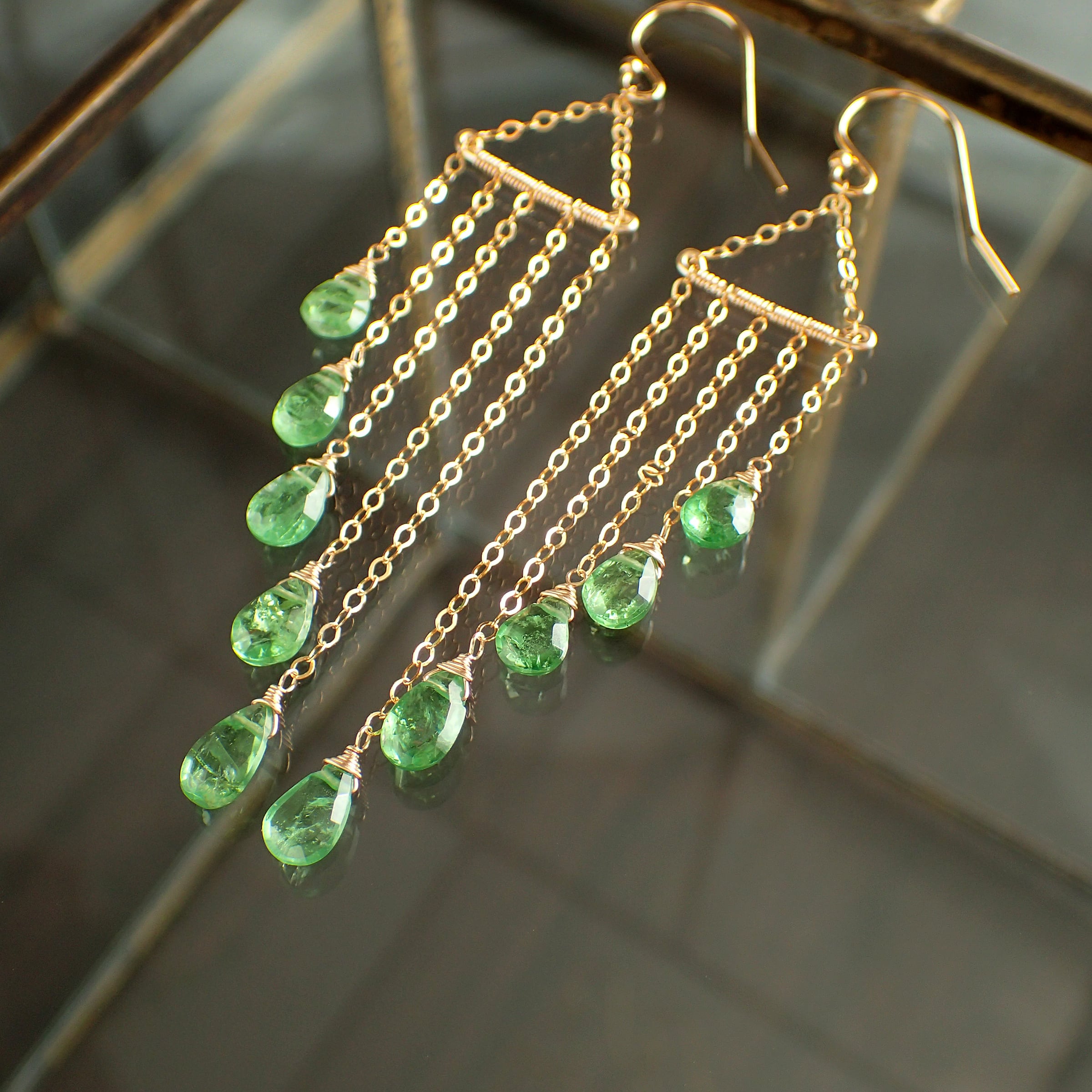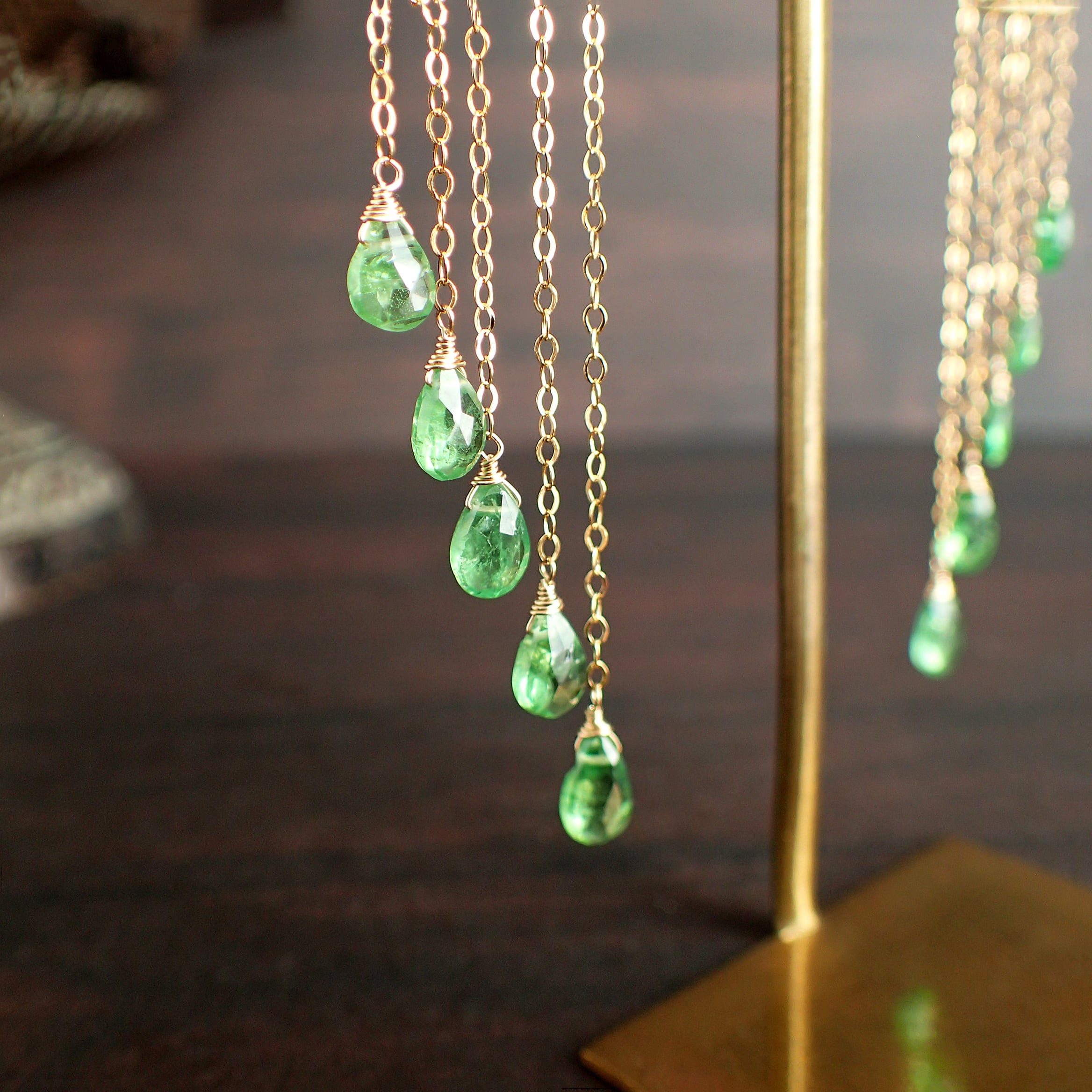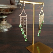 このグリーンガーネットのシャンデリアピアスは、瑞々しいグリーンガーネットの魅力が際立つ美しいアクセサリーです。
